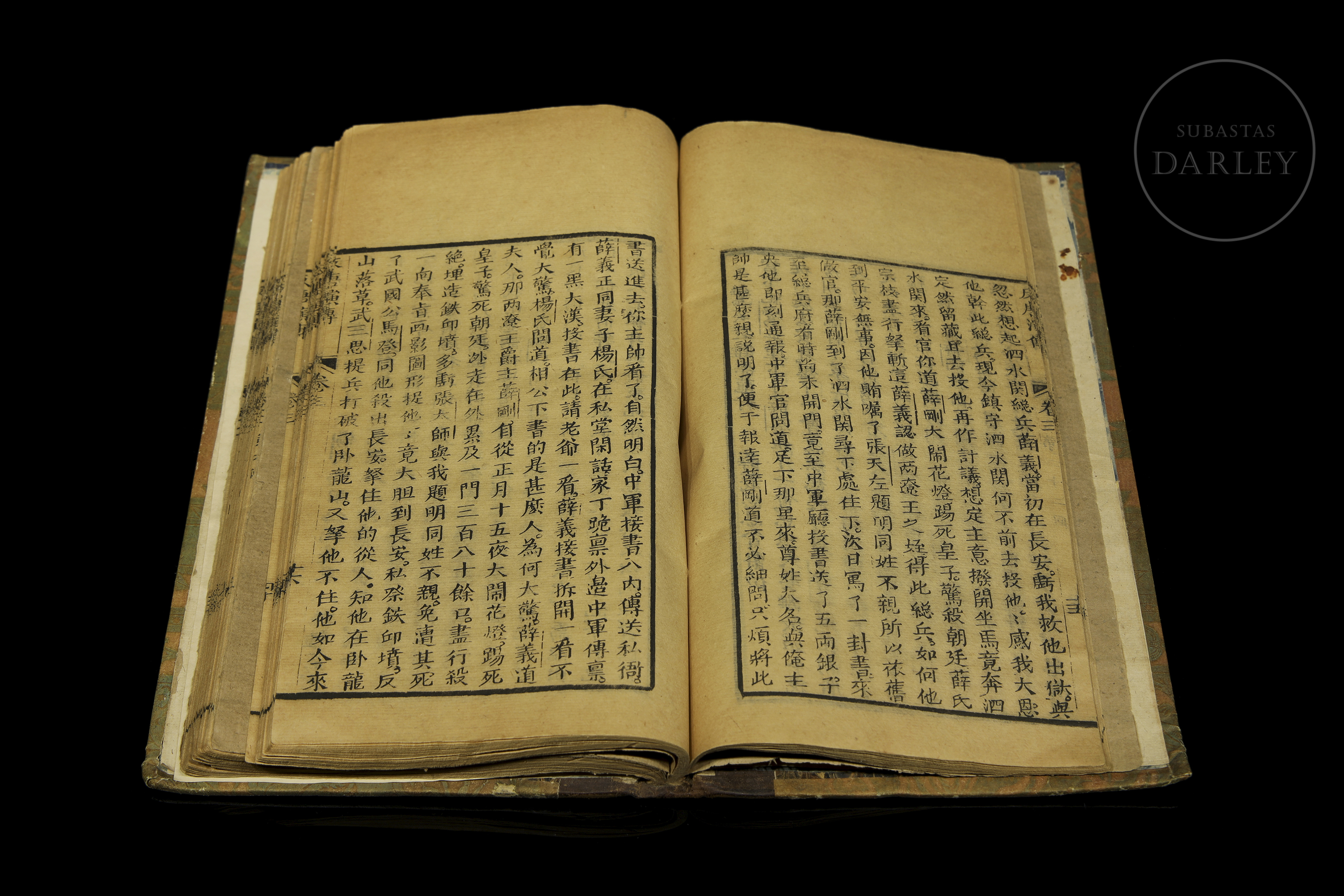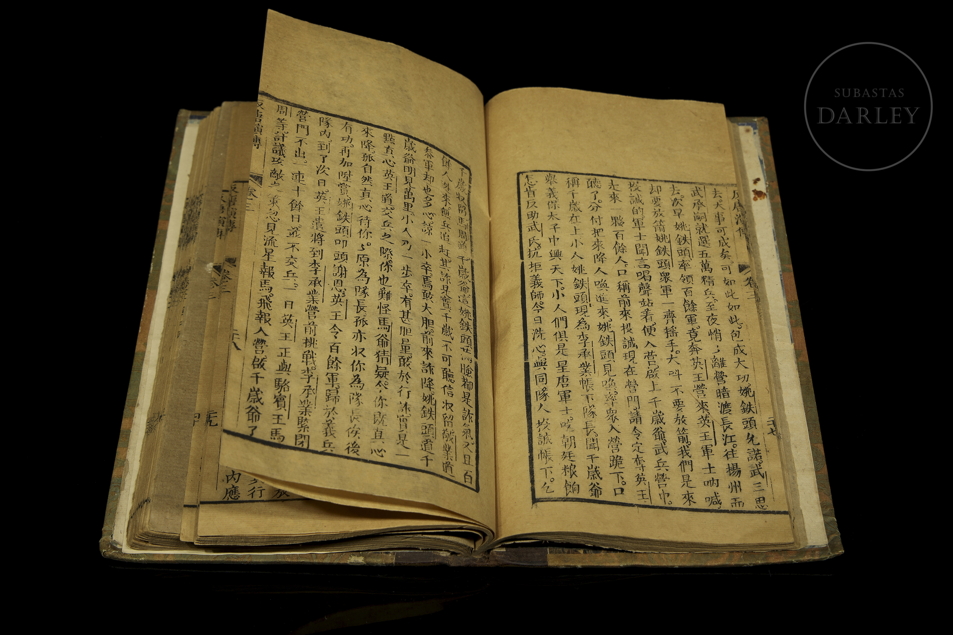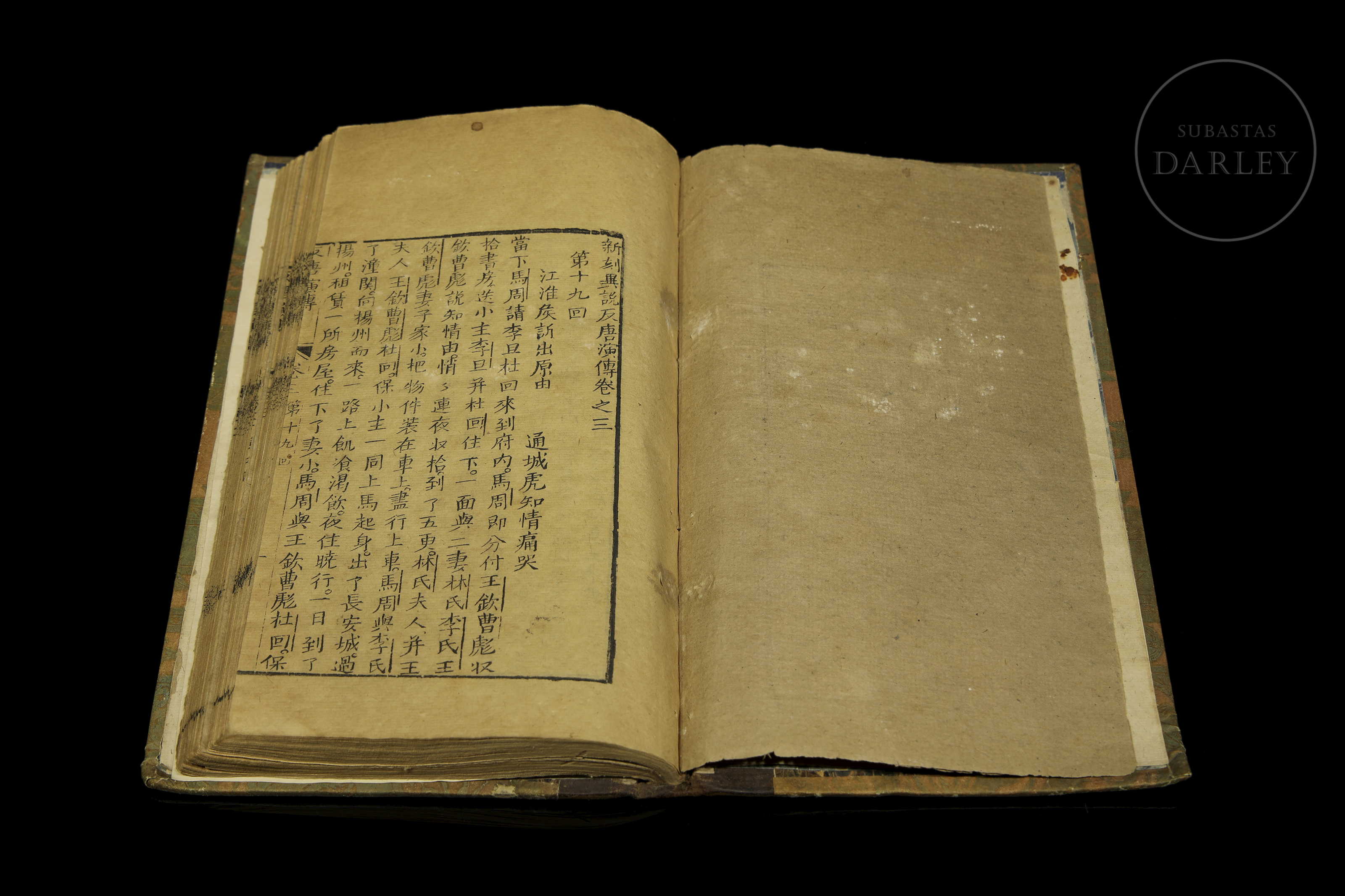 Encuadernado en media piel con lomo de cuero marrón decorado con filetes y florones dorados, y planos revestidos en papel jaspeado con motivos geométricos y vegetales en tonos verdes y anaranjados. El interior contiene texto estampado en caracteres chinos mediante xilografía tradicional sobre papel fino. En buen estado de conservación.