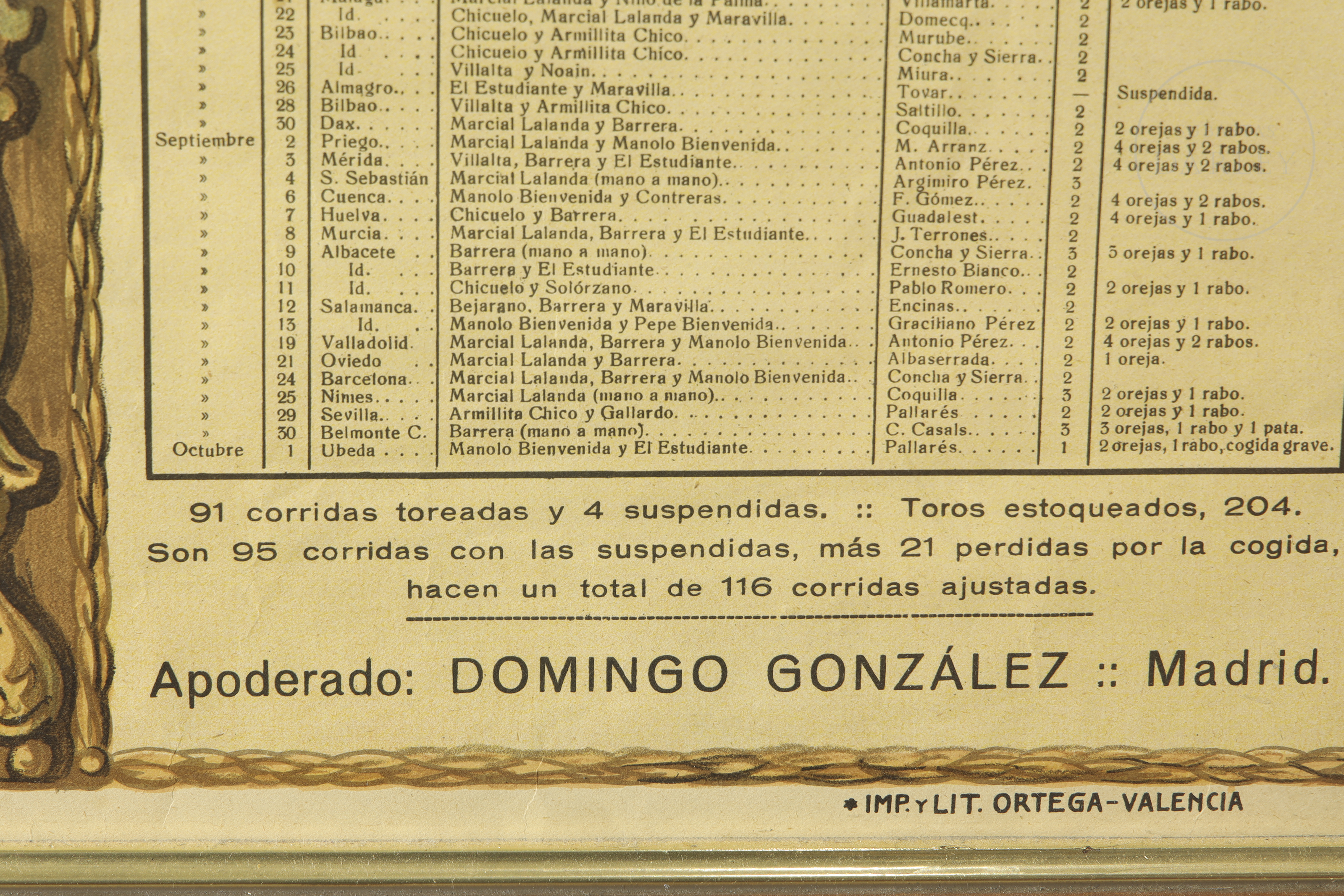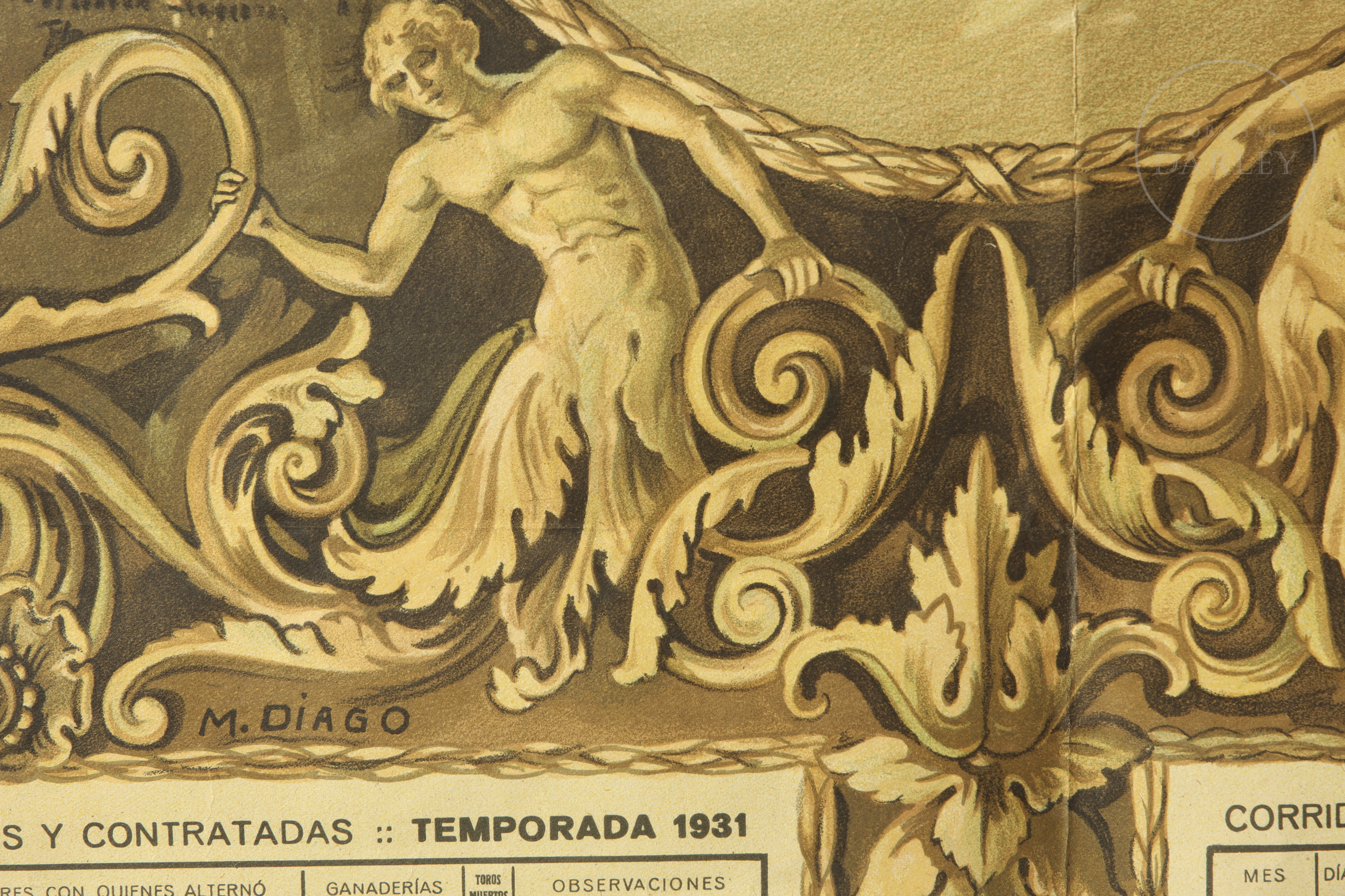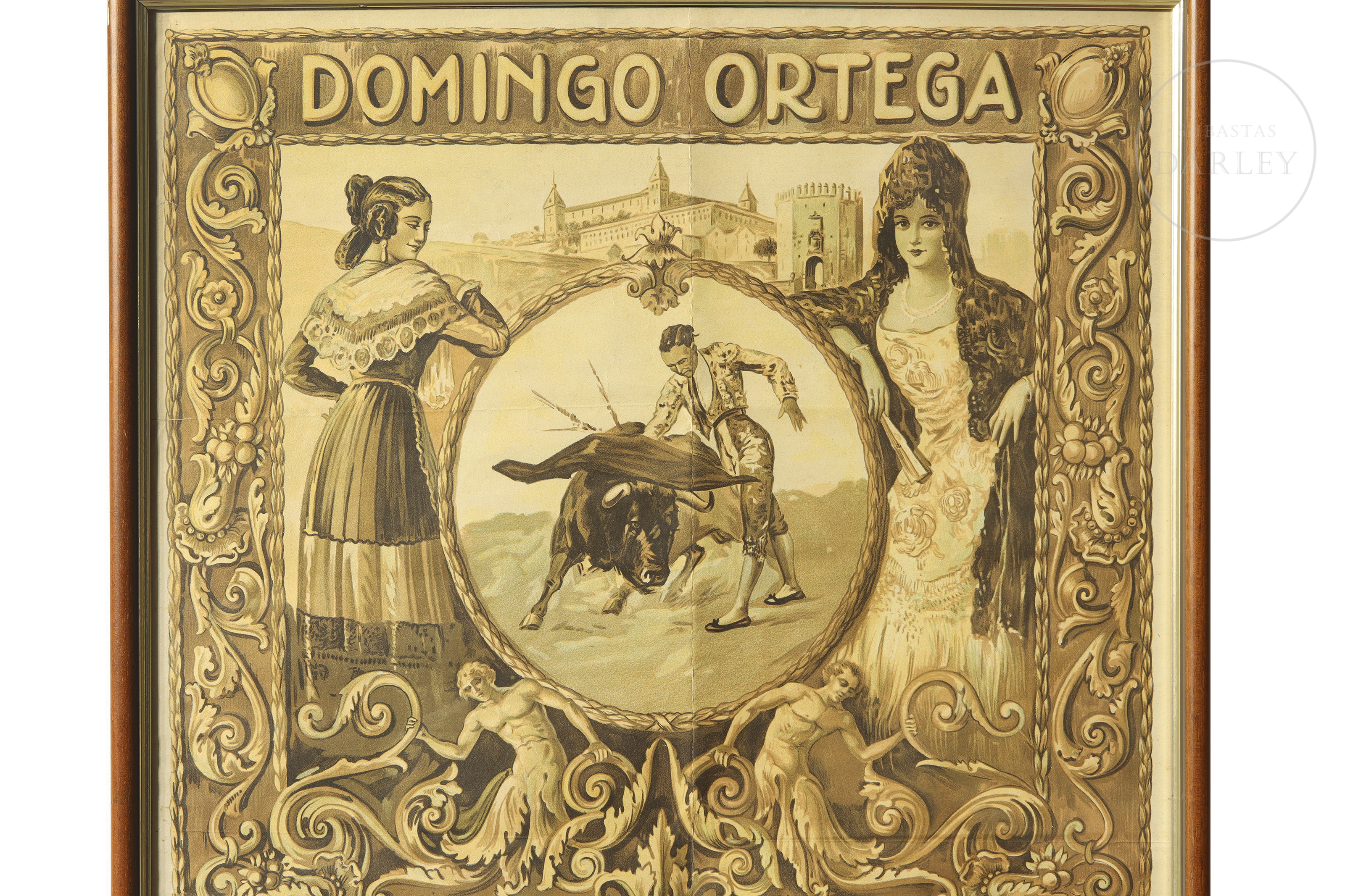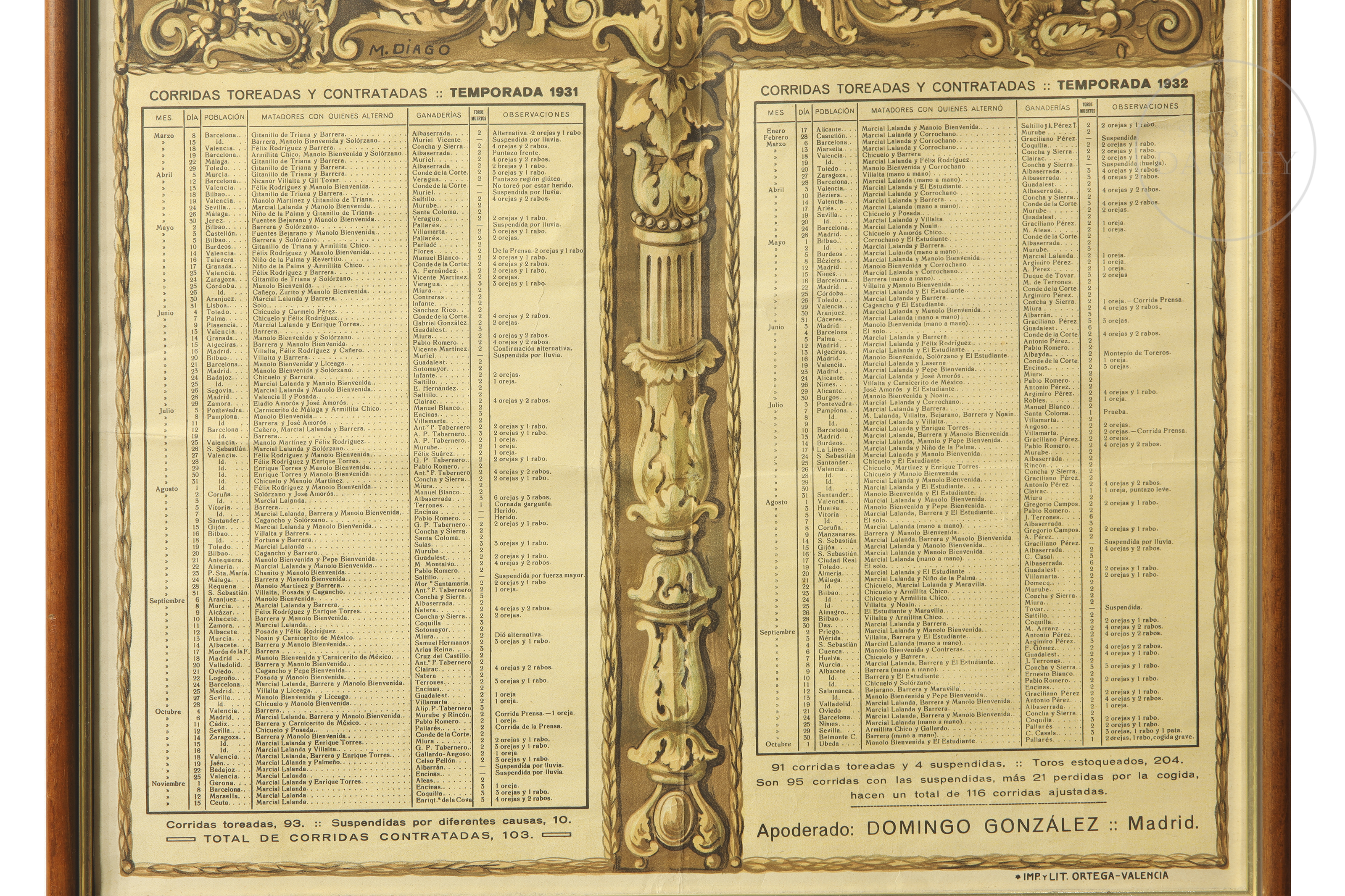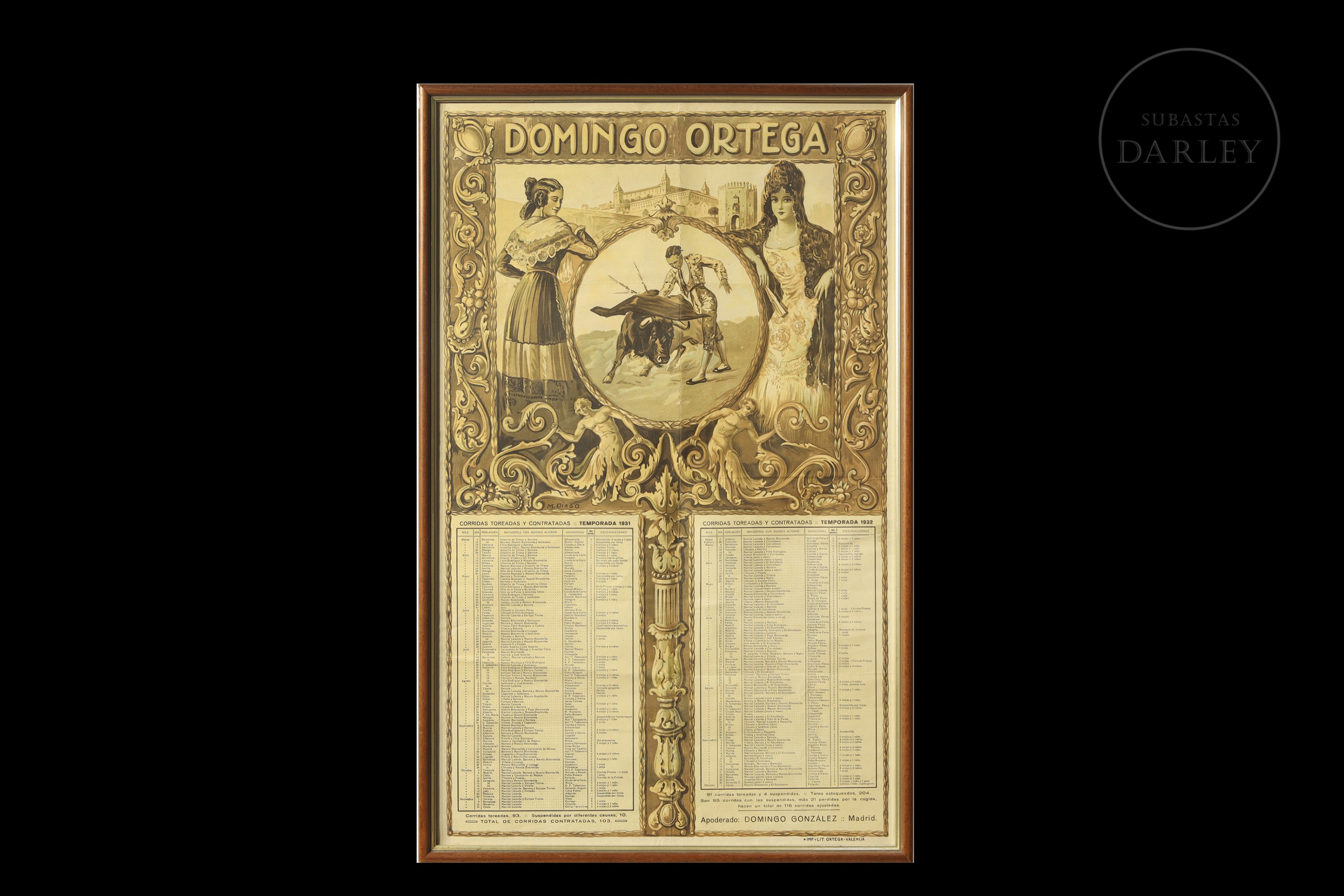 Impresión sobre papel. Cartel publicitario de carácter histórico que conmemora las temporadas de 1931 y 1932 del diestro Domingo Ortega. Firmado "M. DIAGO" en la zona central izquierda de la orla. Incluye listados detallados de las corridas entre 1931 y 1932.
