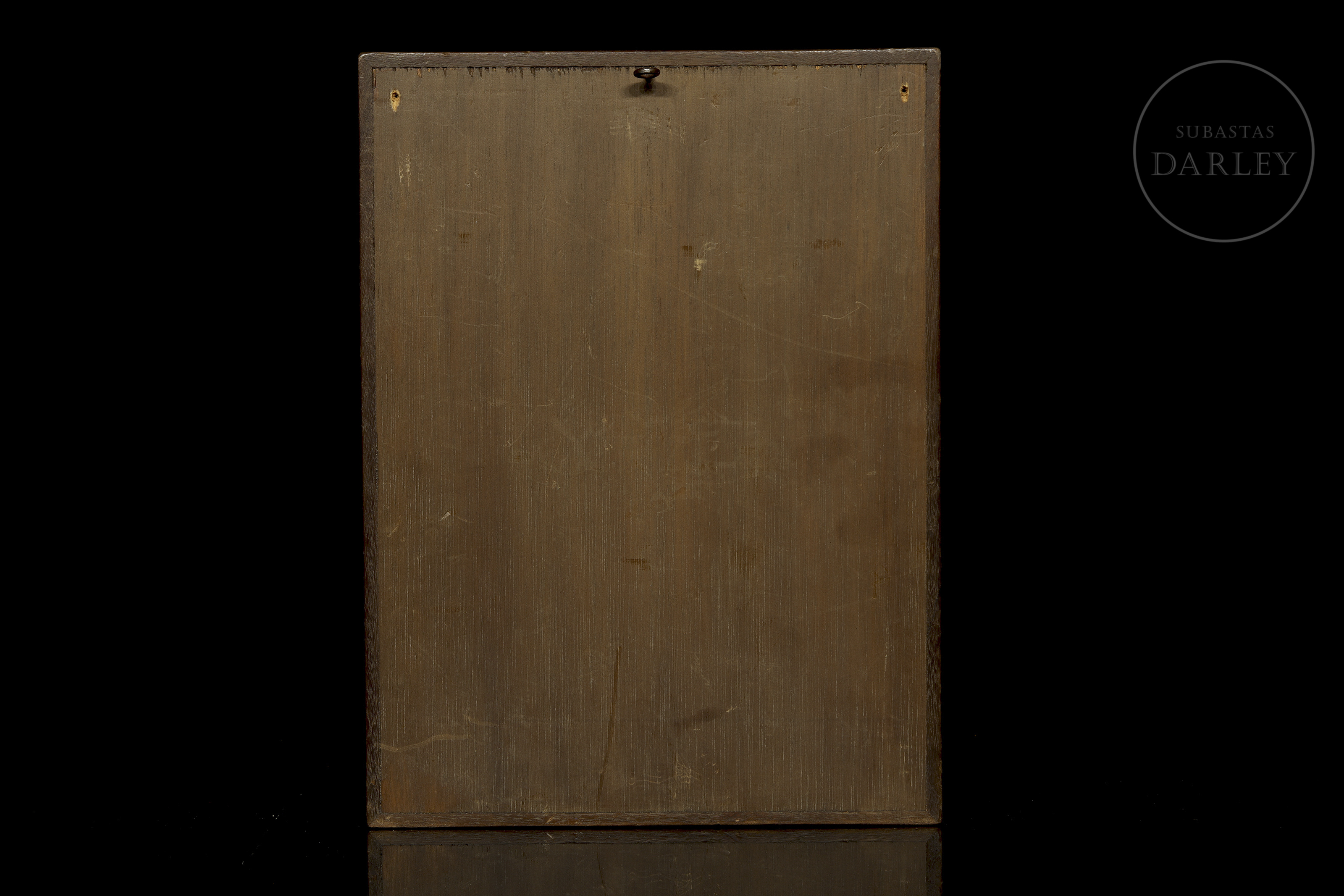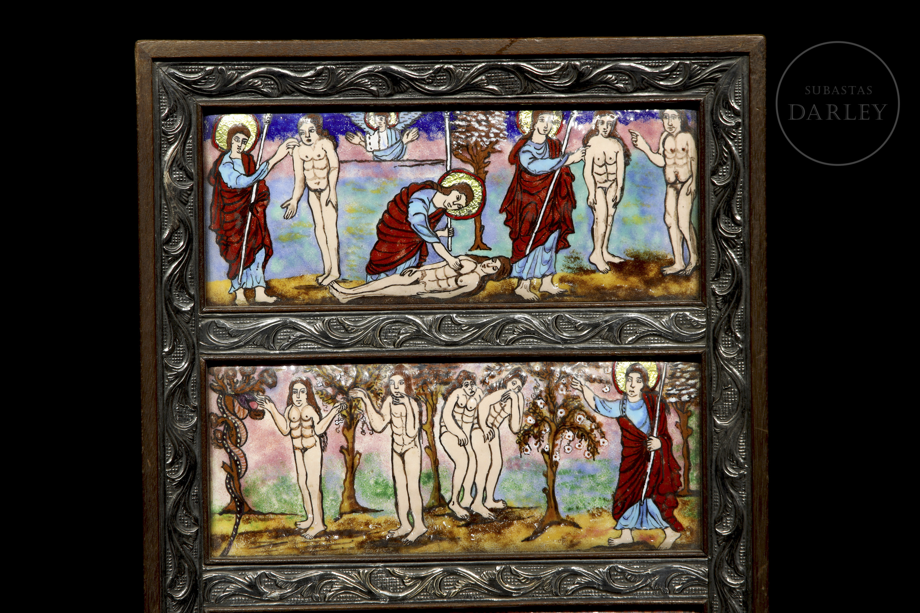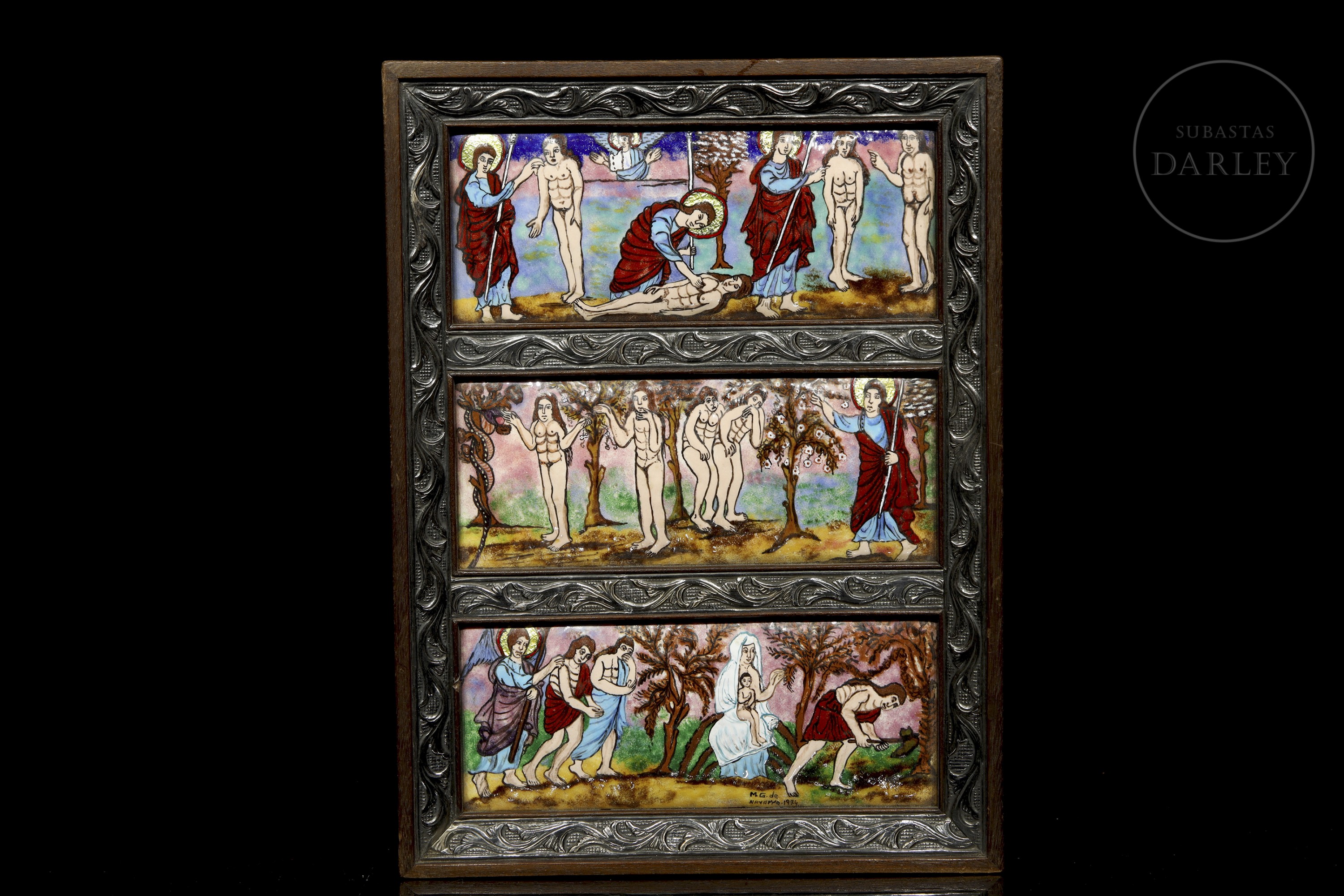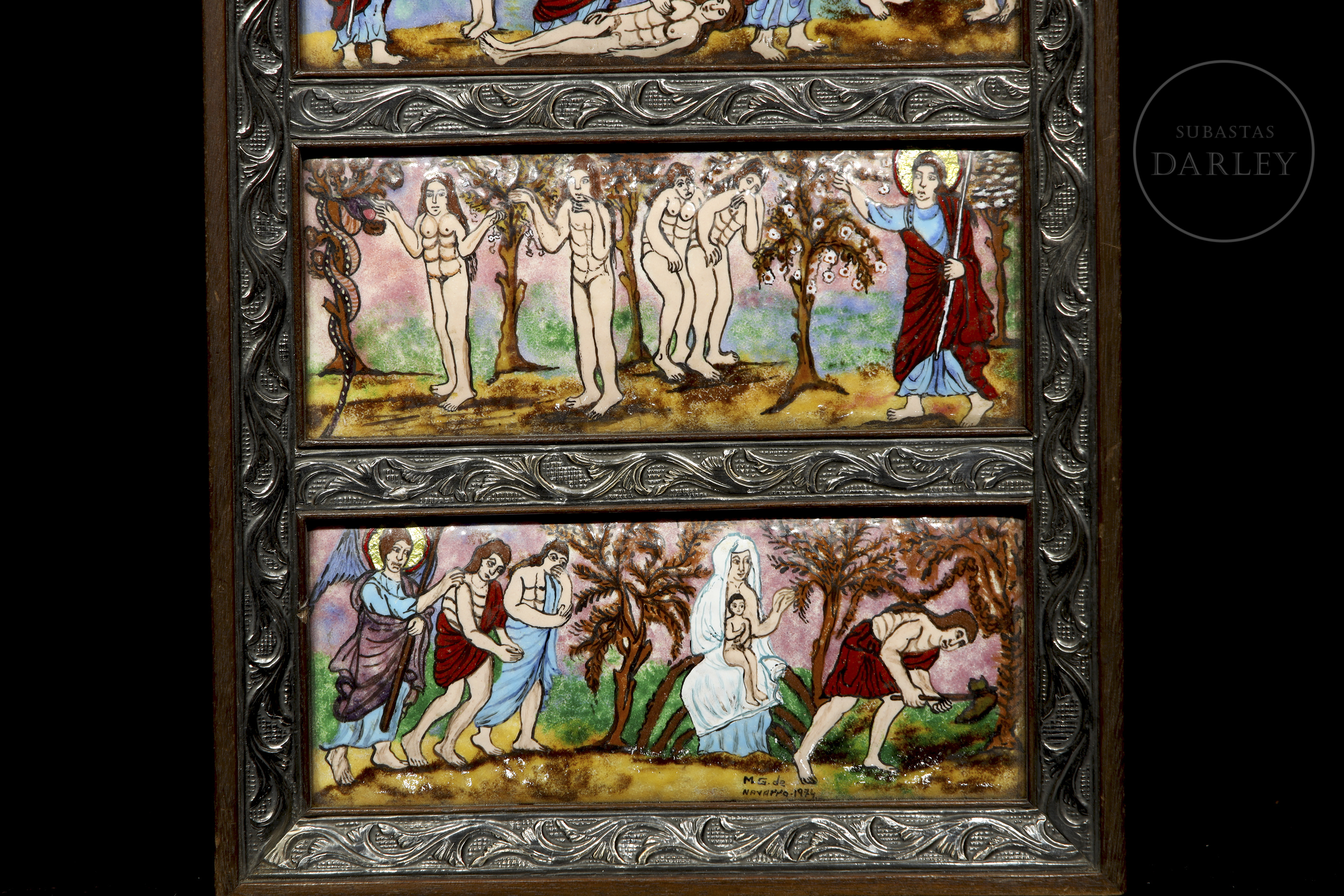 Tríptico vertical compuesto por tres placas de cerámica esmaltada que narran episodios del Antiguo Testamento. El conjunto está enmarcado en madera noble y decorado con planchas de plata repujada con motivos vegetales. Firmado "M.G. de NAVARRO" y fechado "1974" en la placa inferior.