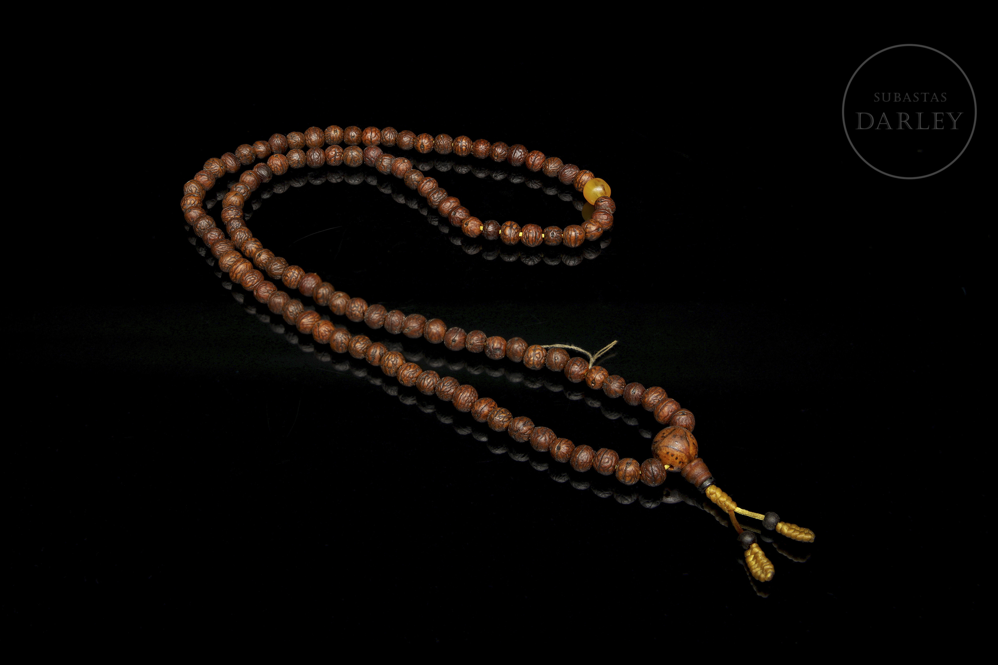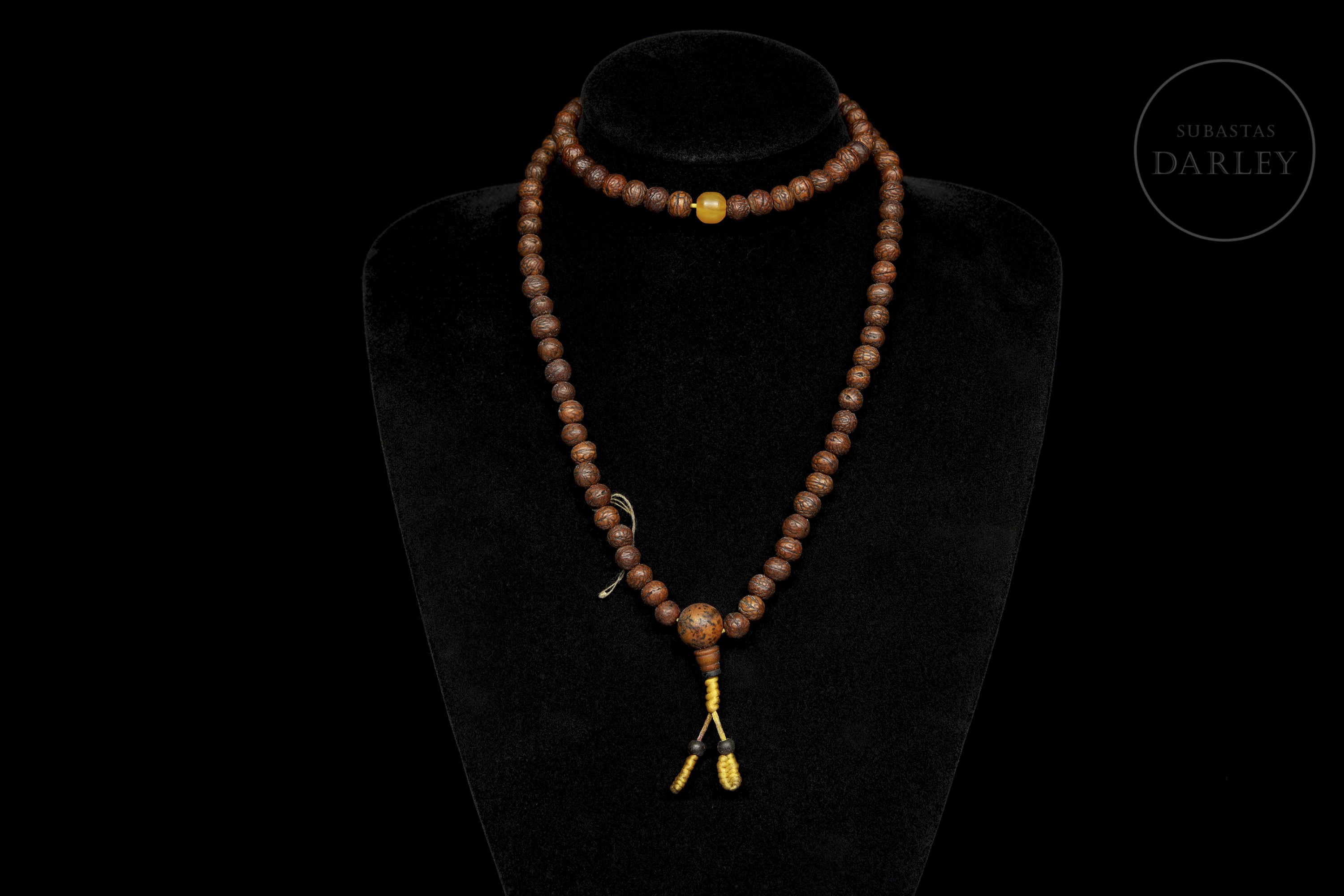 Collar ritual compuesto por ciento ocho cuentas de semillas de Bodhi, acompañadas de tres cuentas decorativas en materiales diversos, incluyendo una en tonalidad ámbar. Presenta cuentas esféricas talladas de superficie rugosa. Estas piezas, utilizadas para la recitación de mantras, son características de la tradición budista tibetana.