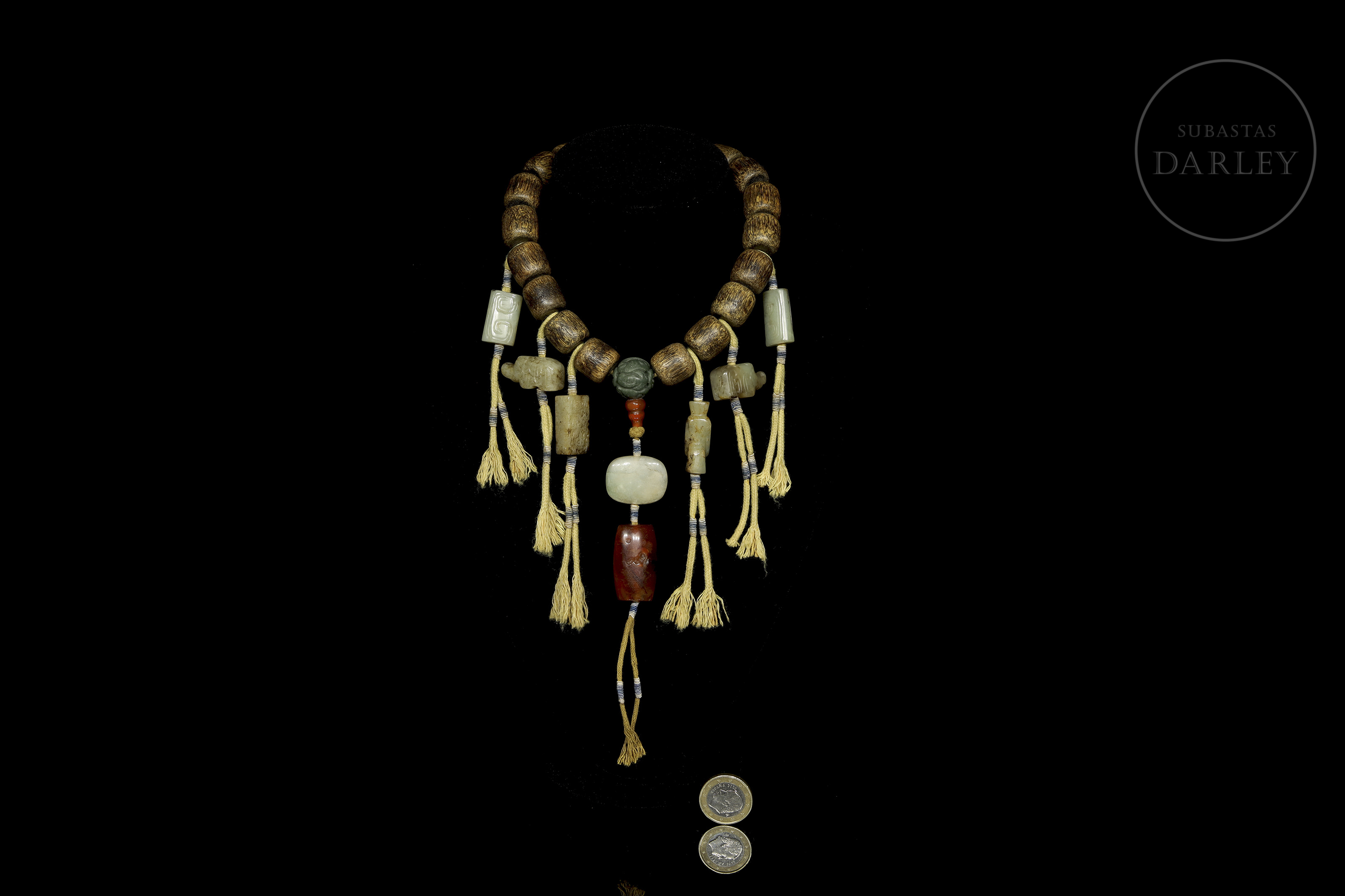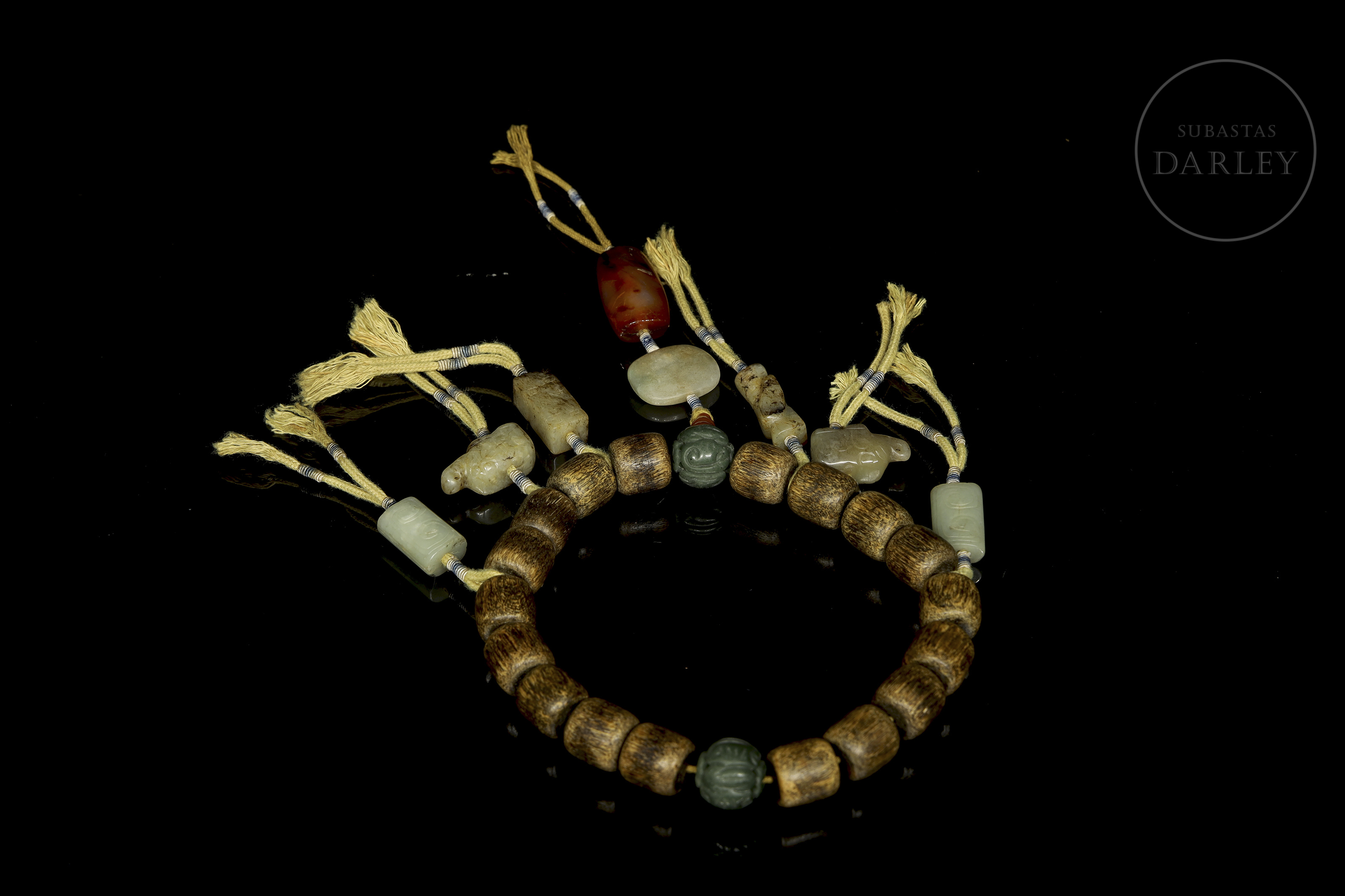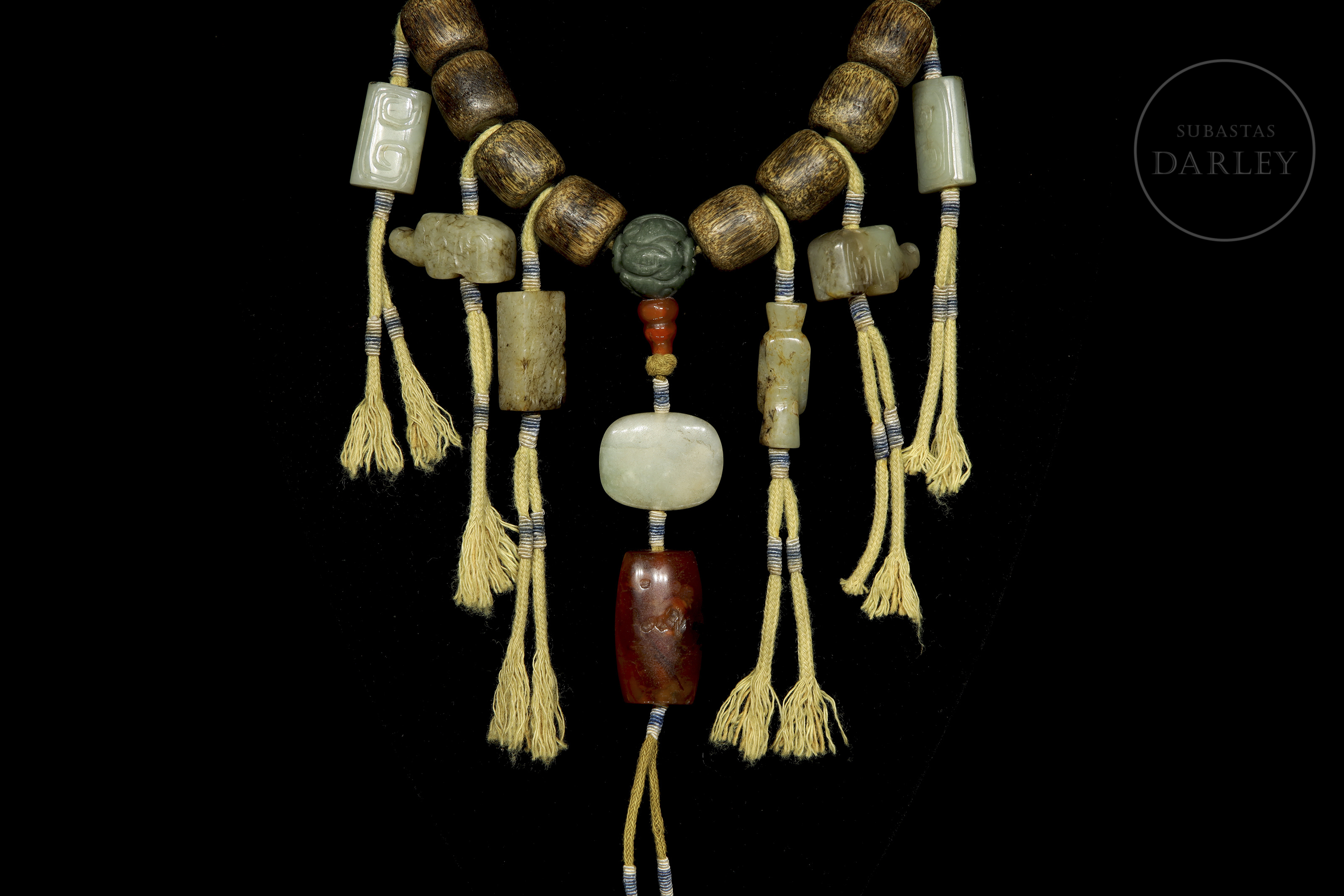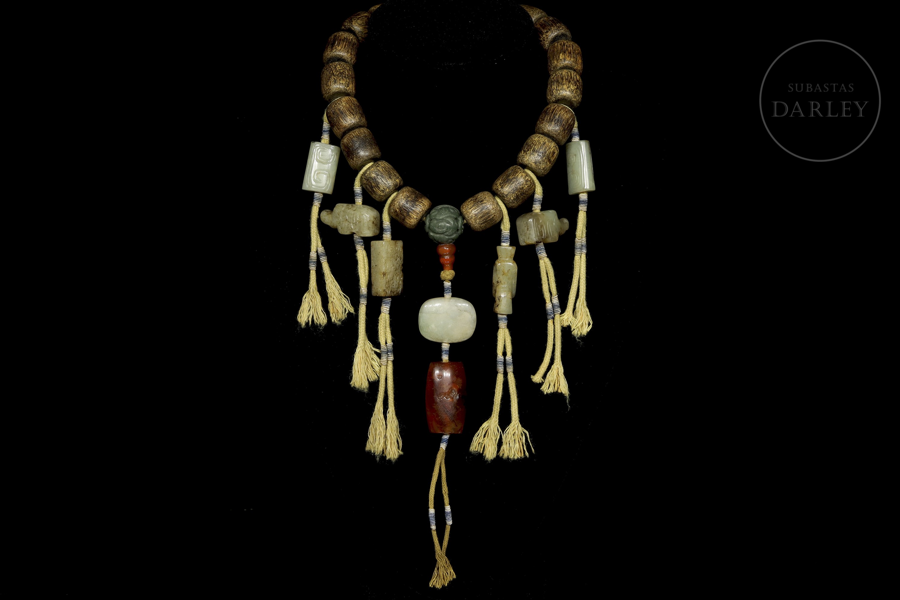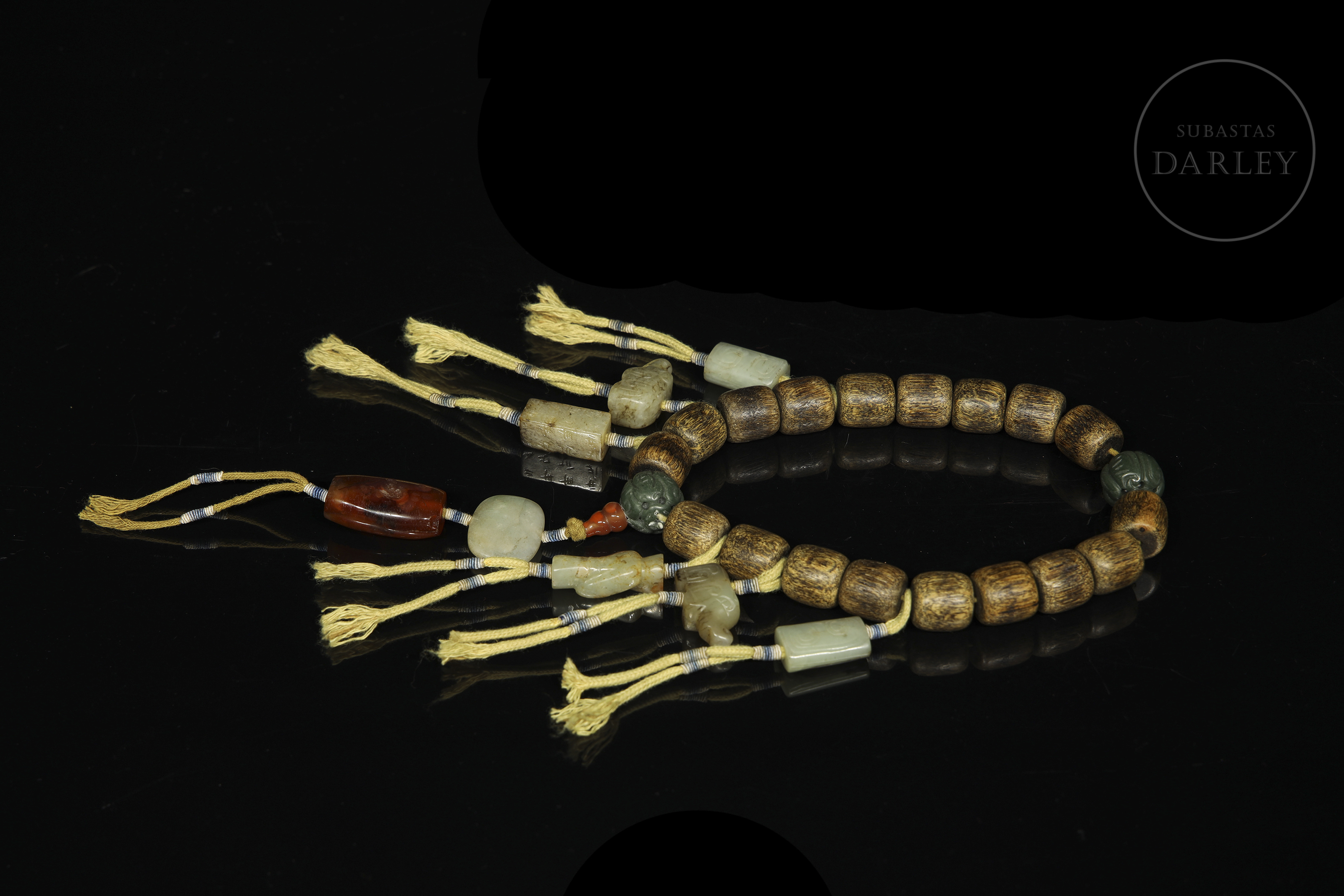 Compuesto por dieciocho cuentas de madera de Chenxiamu (沉香木). Se encuentra ornamentado con diversos elementos de jade de diferentes tonalidades incluyendo una cuenta central con motivos florales, cuentas cilíndricas y dijes en forma de animales míticos. Del eje central pende una sección vertical con una cuenta roja, una pieza de jade blanco de formato ovalado y un remate de ágata de gran tamaño. Dinastía Qing (1644–1912)