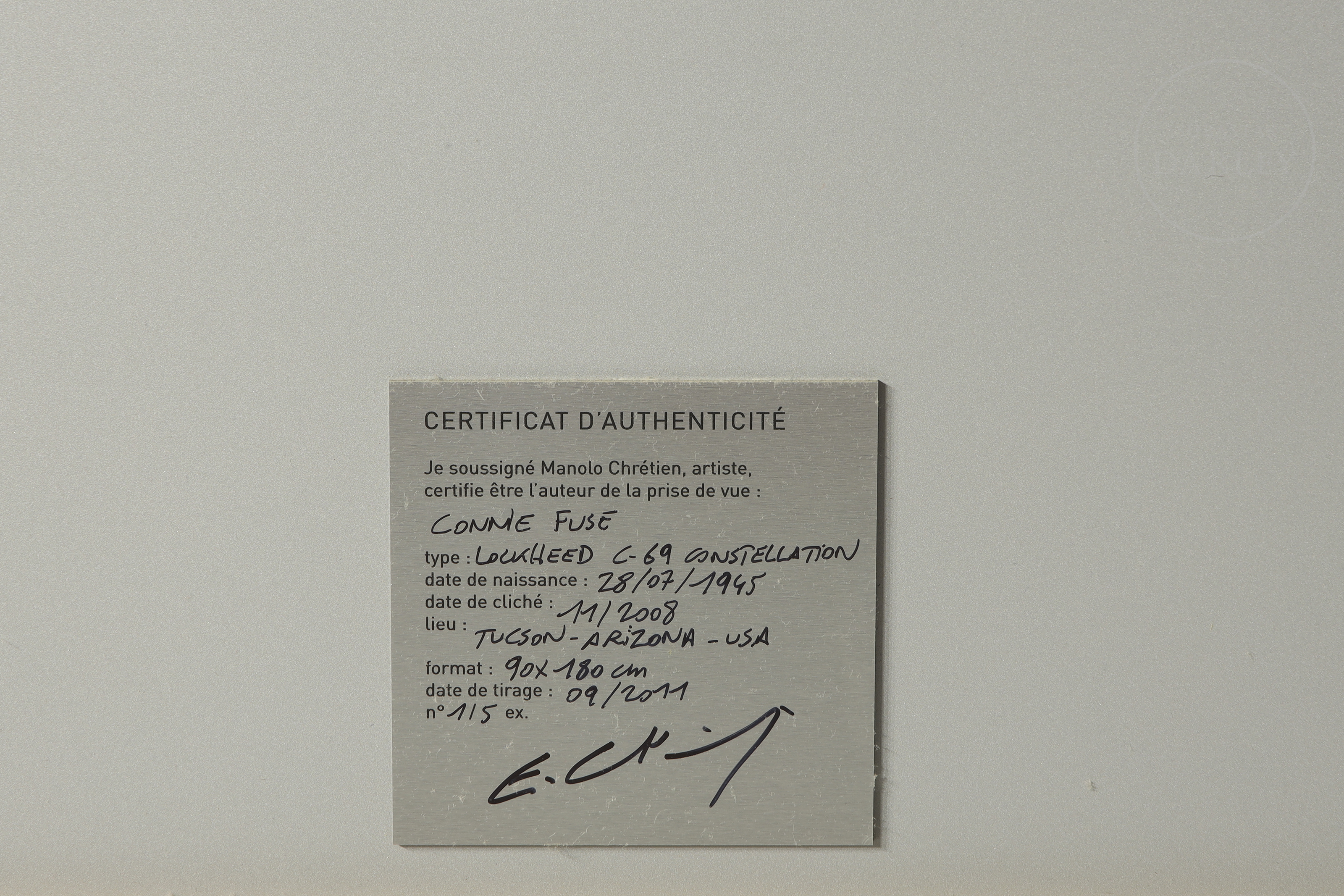 Impresión sobre plancha de aluminio realizada mediante la técnica de sublimación de tinta. La obra creada a partir de una fotografía realizada en el 2008 a un "Lockheed C-69 Constellation". Plancha numerada como ejemplar 1/5.