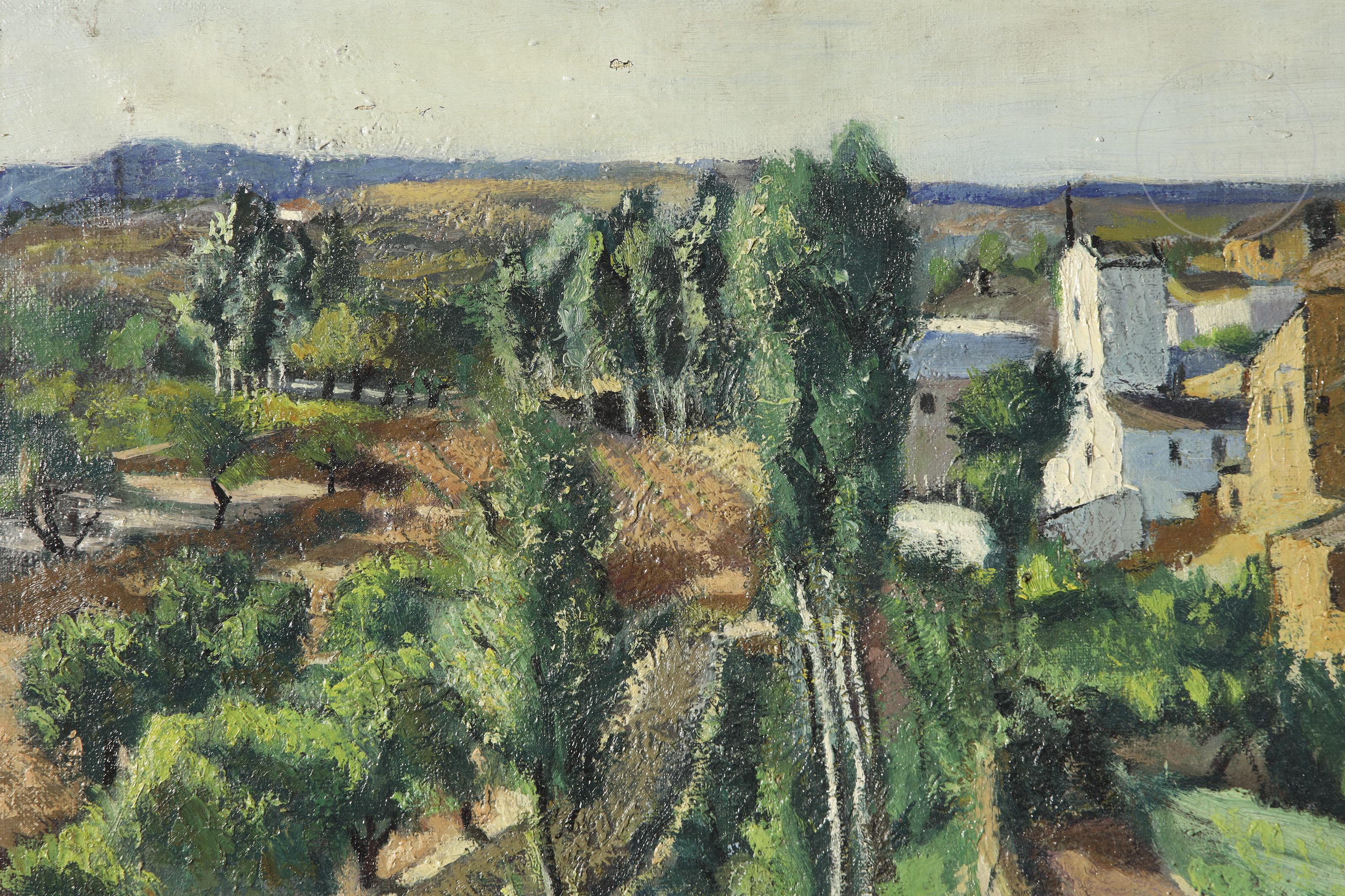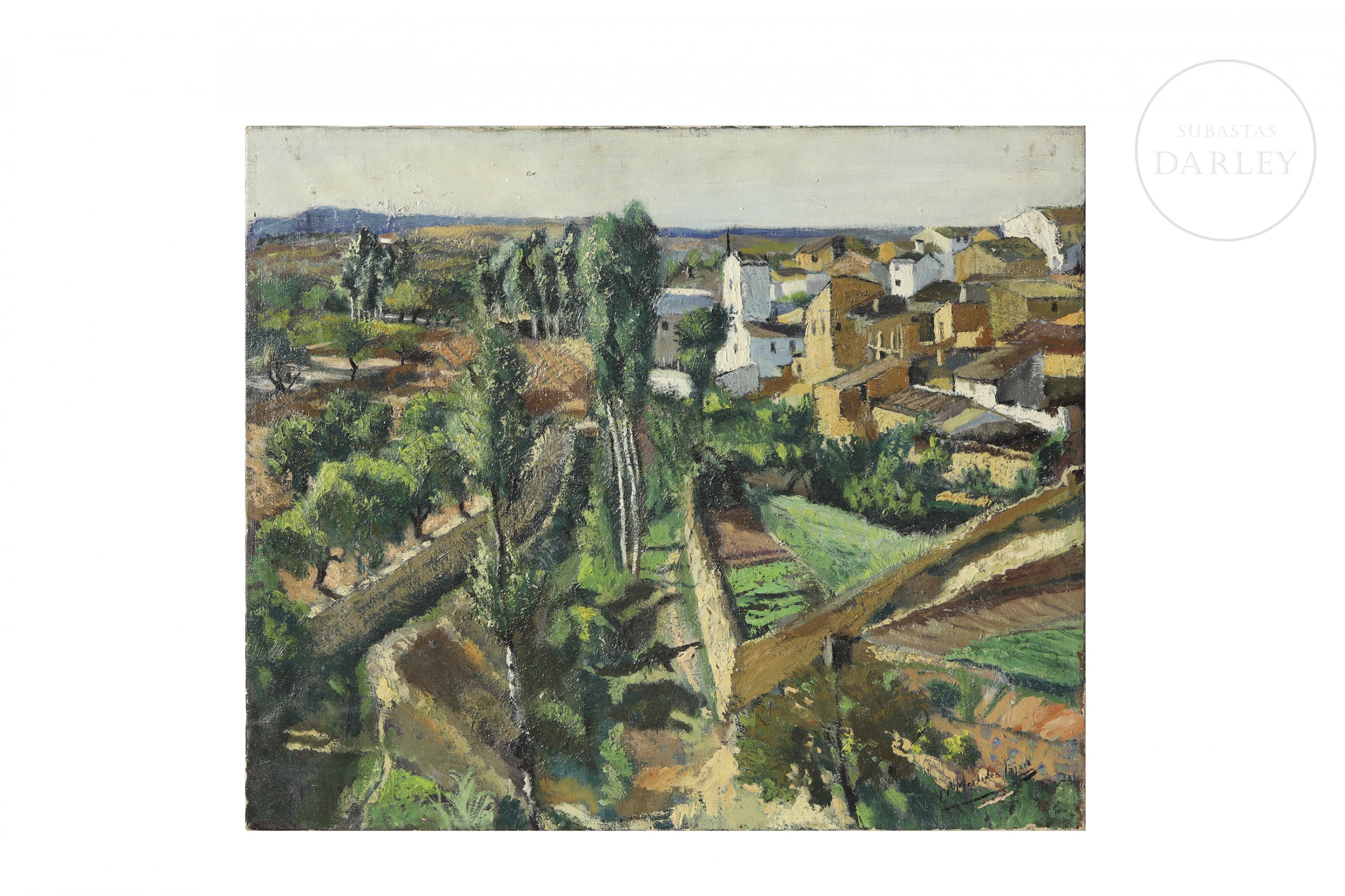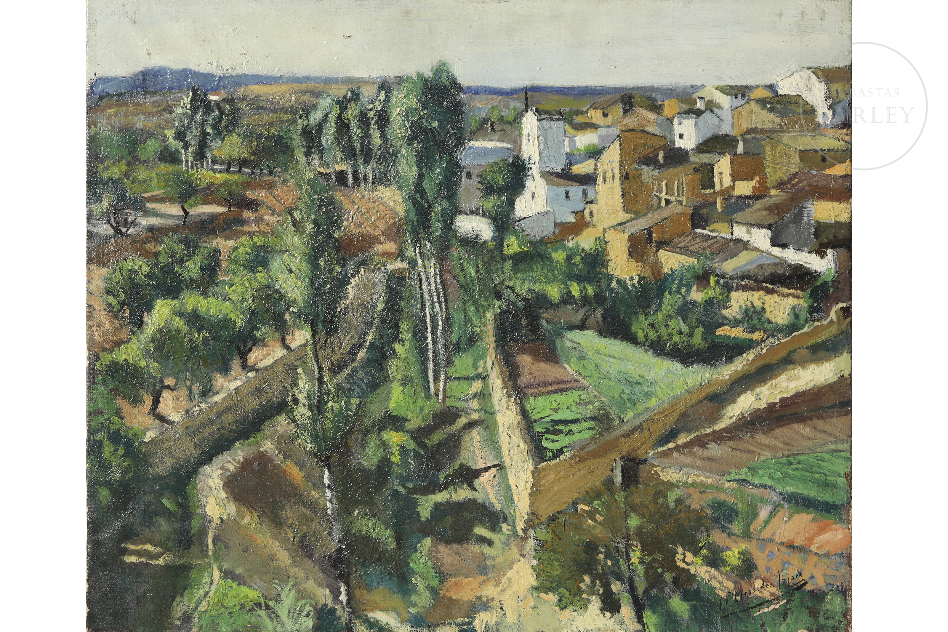 Óleo sobre lienzo. Paisaje urbano y rural que captura una vista elevada de un núcleo poblacional integrado en un entorno agrícola. La obra destaca por una pincelada suelta y vibrante. Firmado "Mª Mercedes Lajara" en la esquina inferior derecha.