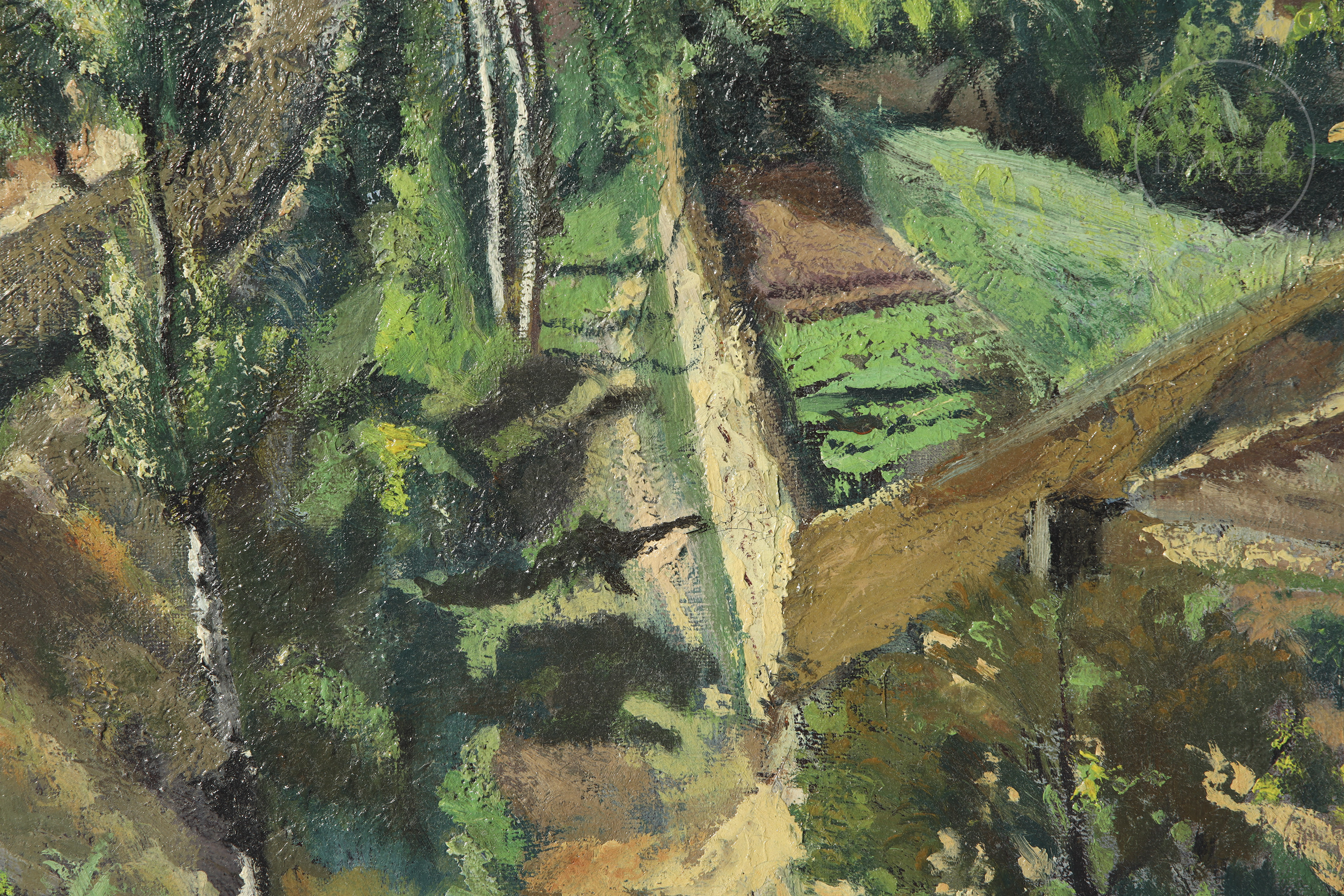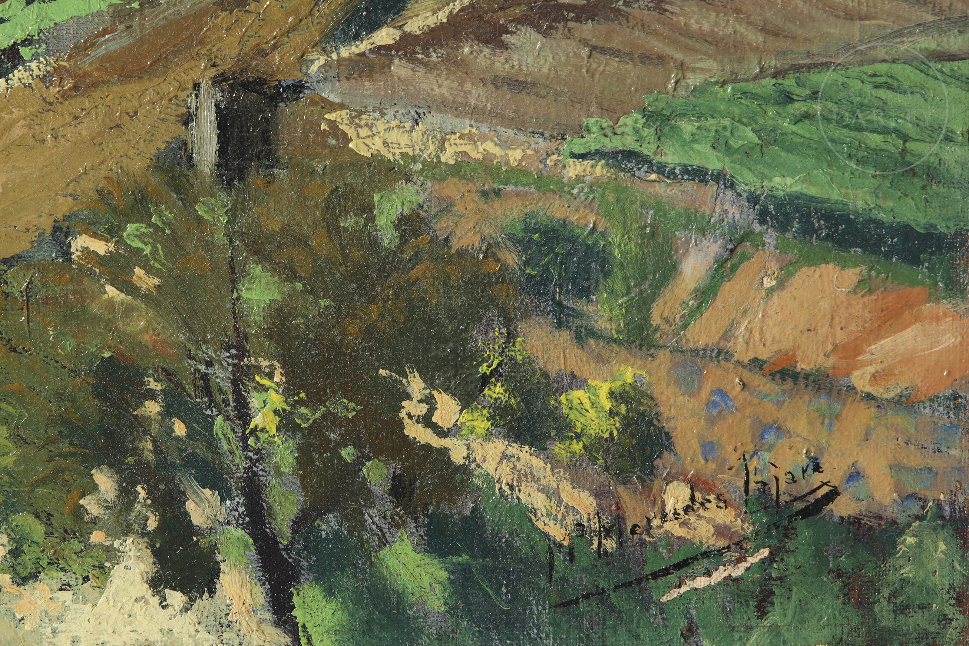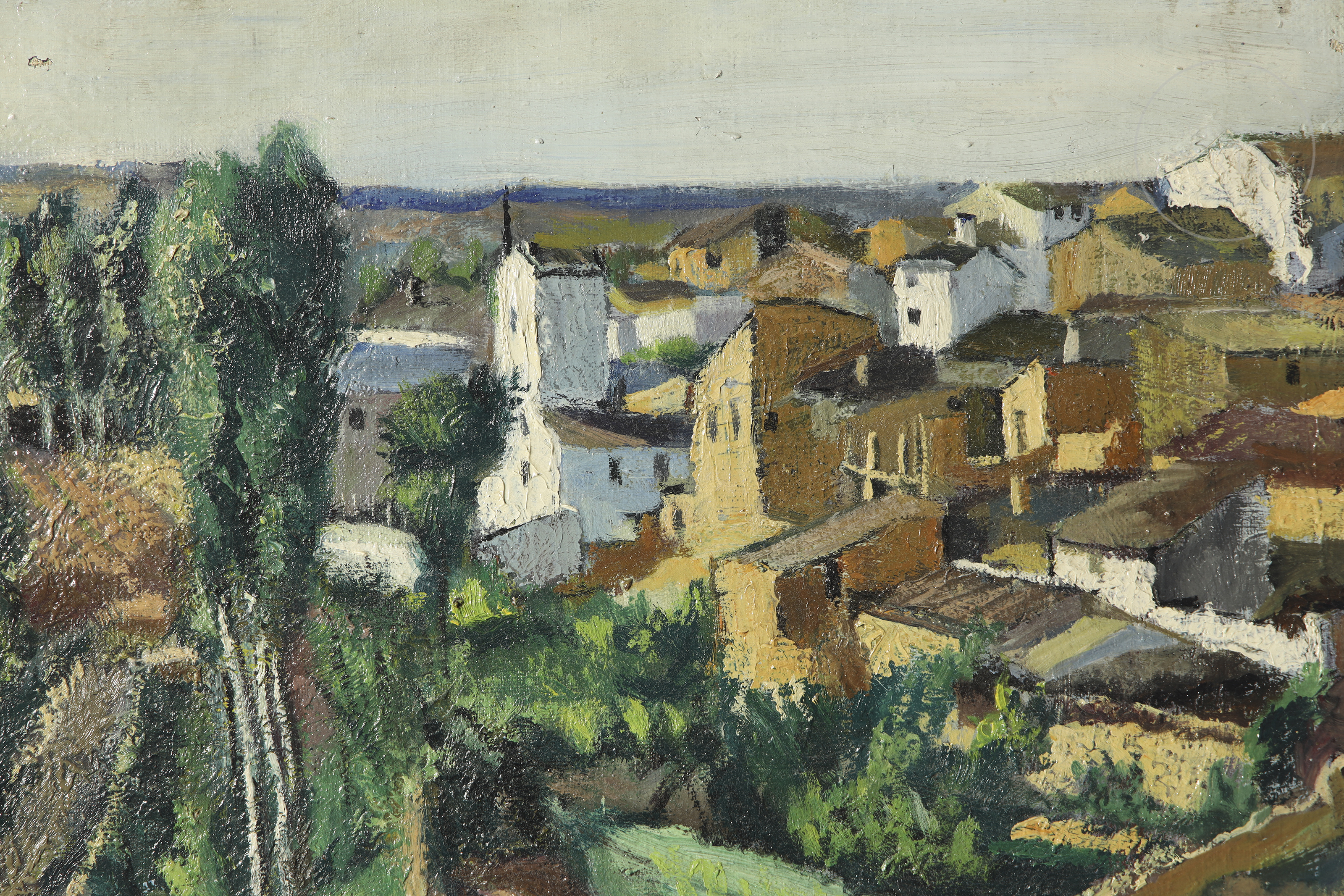 Óleo sobre lienzo. Paisaje urbano y rural que captura una vista elevada de un núcleo poblacional integrado en un entorno agrícola. La obra destaca por una pincelada suelta y vibrante. Firmado "Mª Mercedes Lajara" en la esquina inferior derecha.