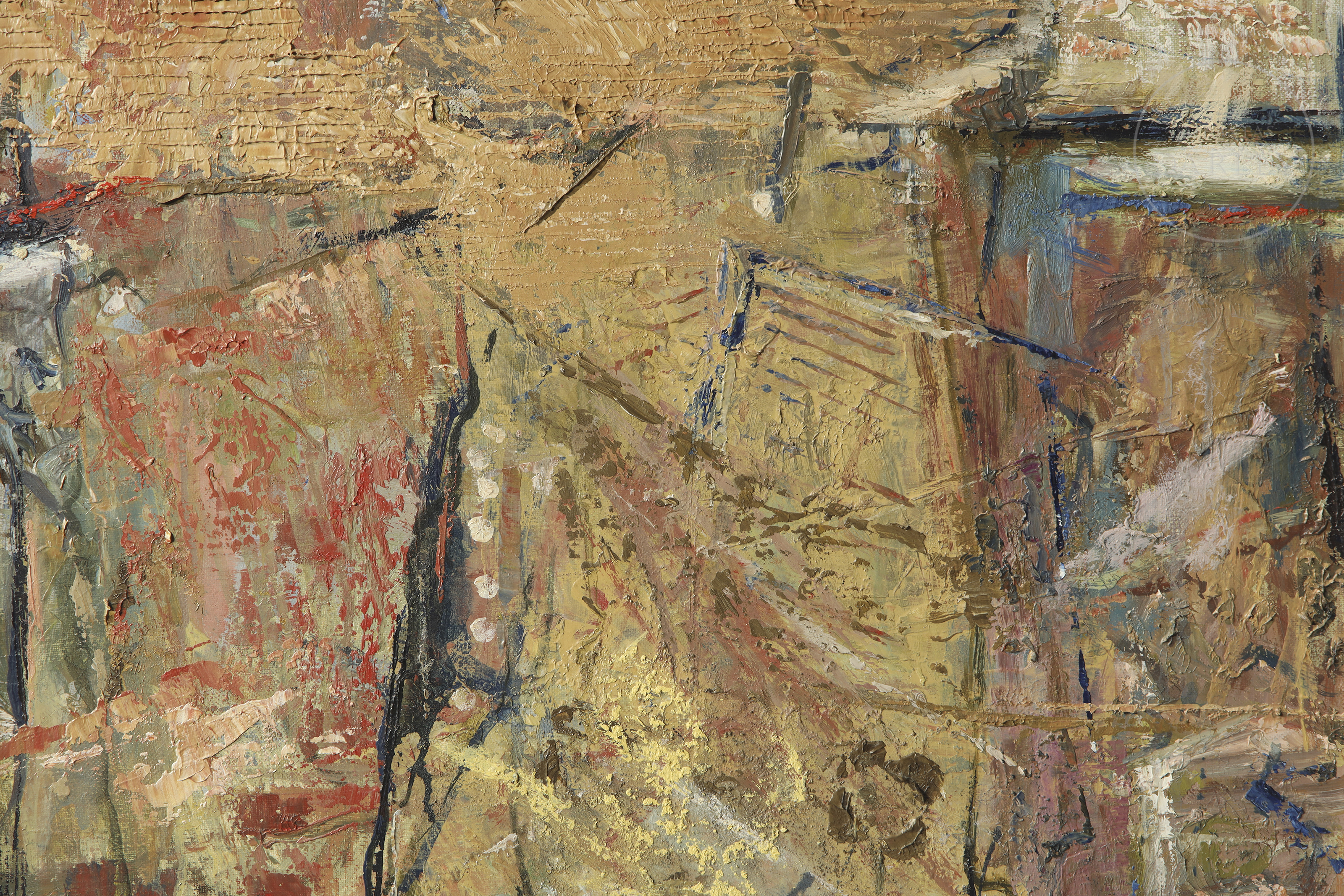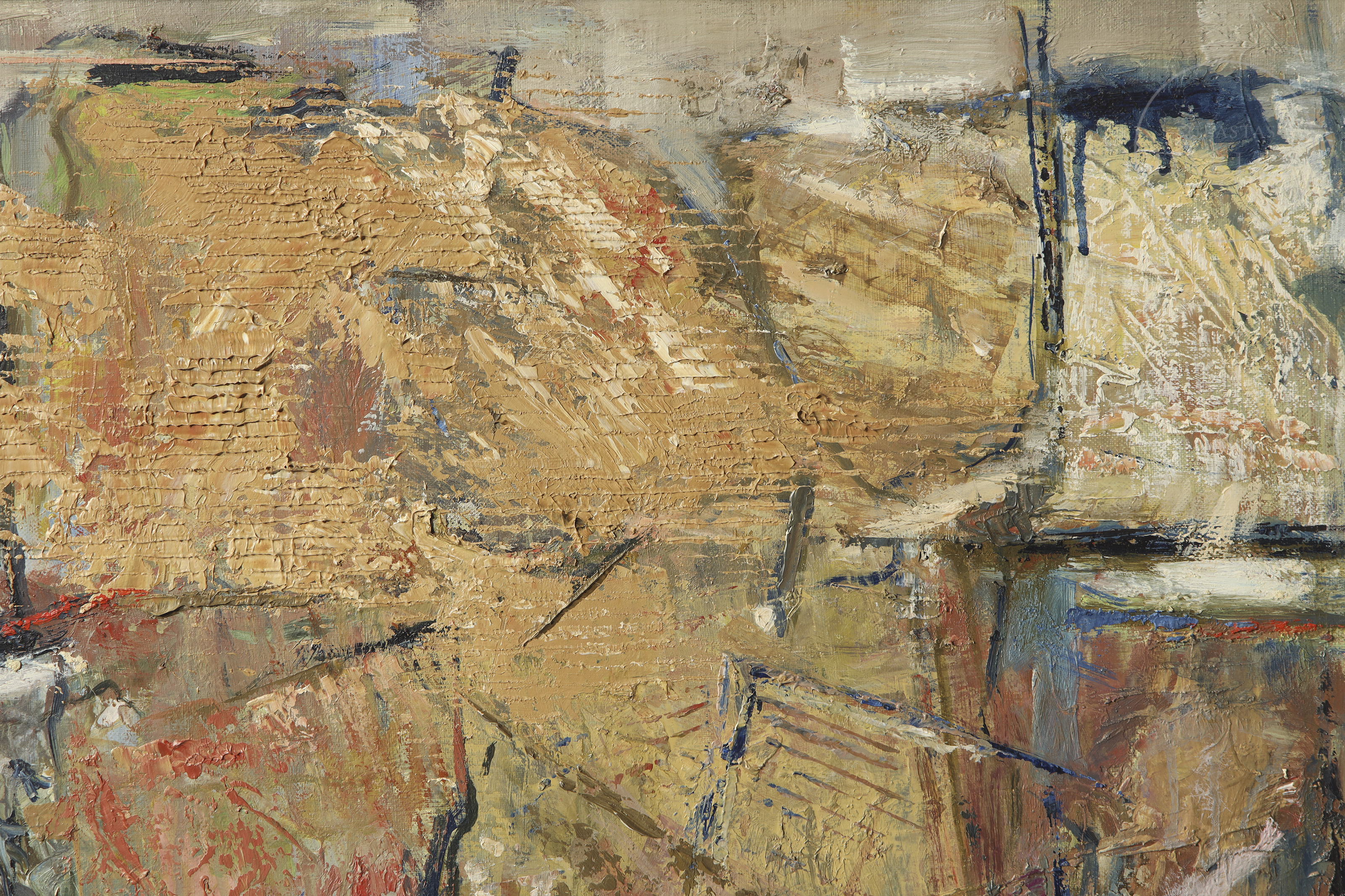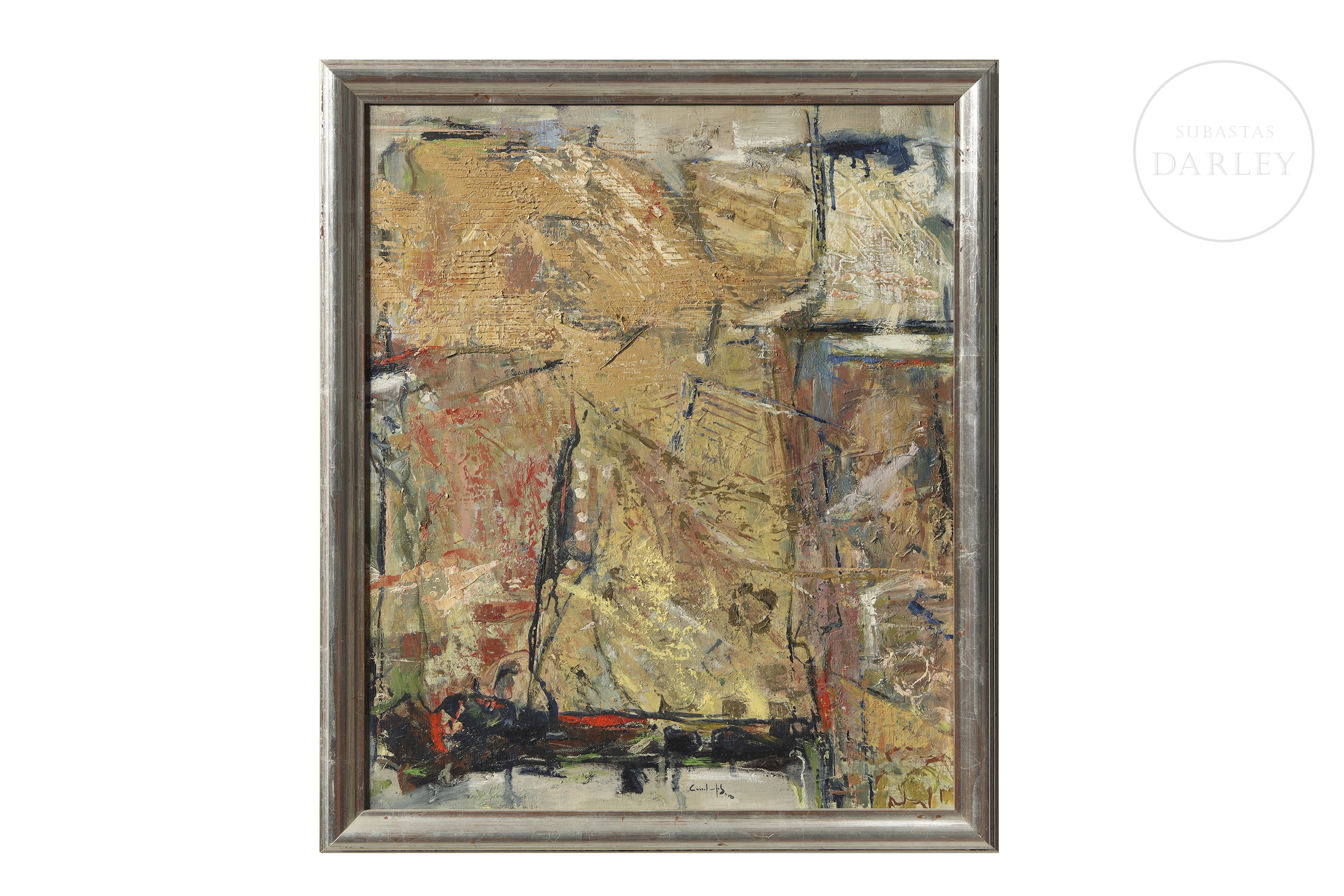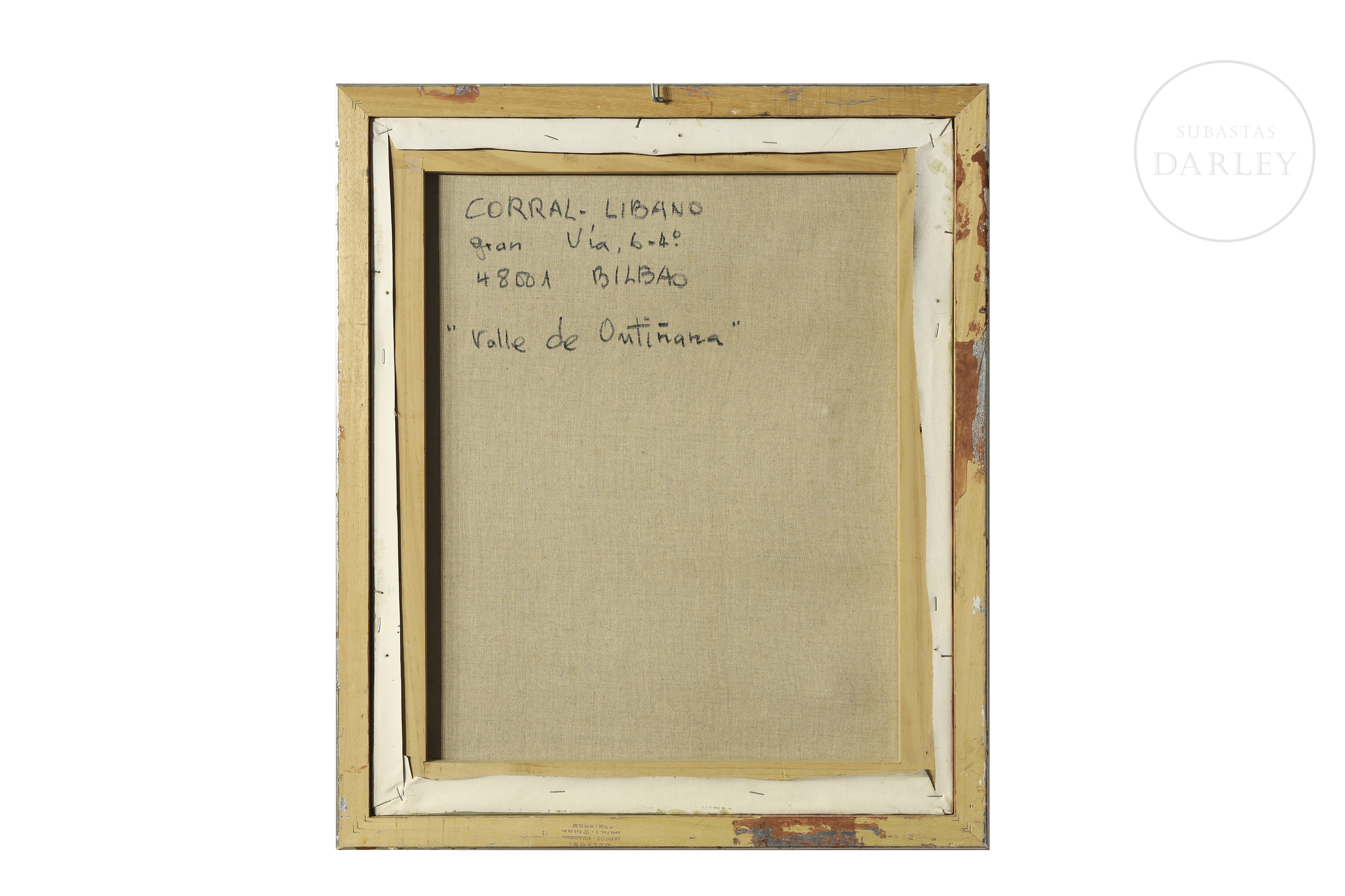 Óleo sobre lienzo. Composición de paisaje con una fuerte tendencia a la abstracción lírica. Descompone la vista del Valle de Ontiñana en bloques de color y manchas matéricas. Firmado "Corral y Libano" en el margen inferior.