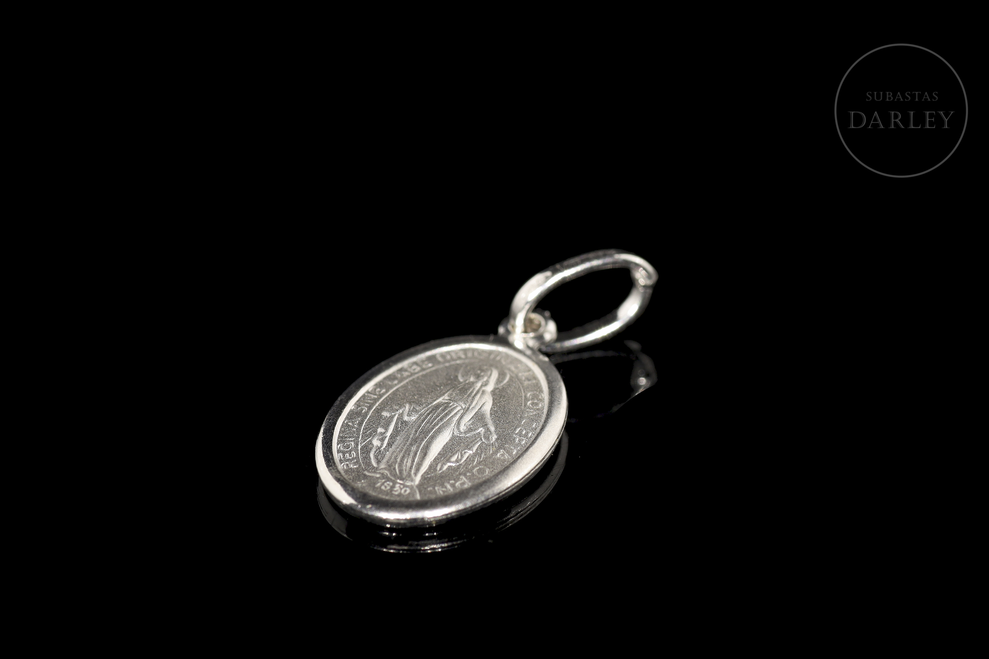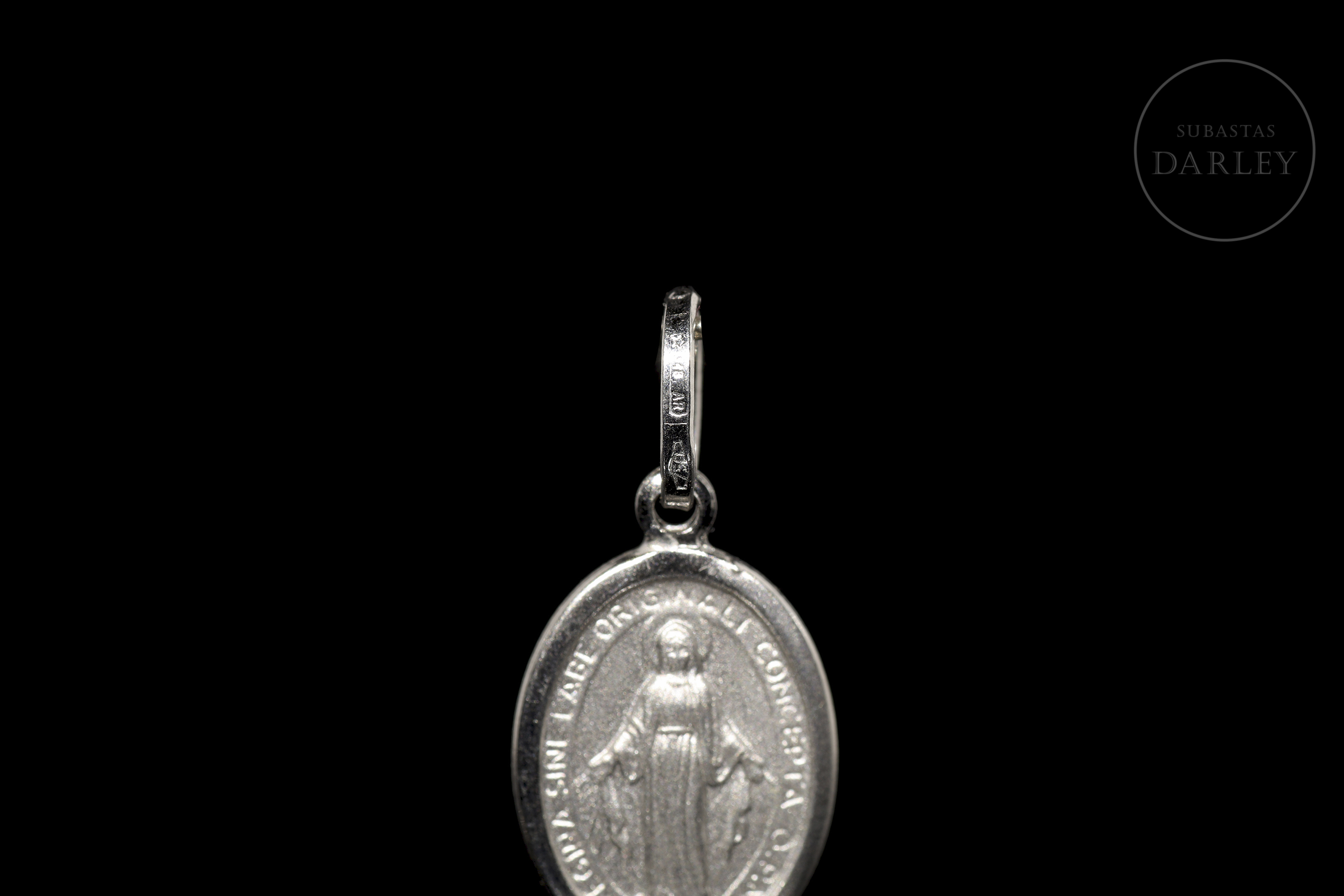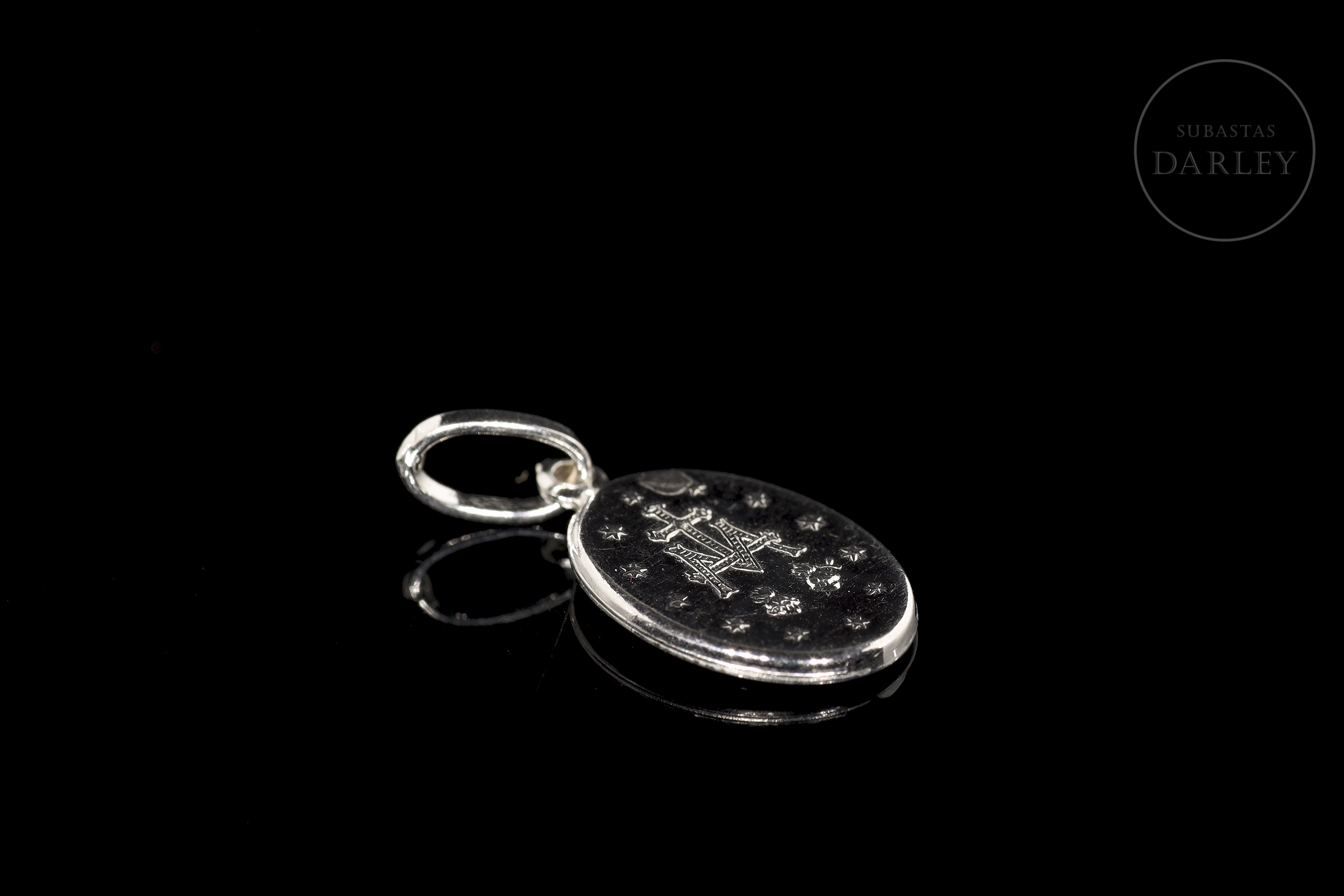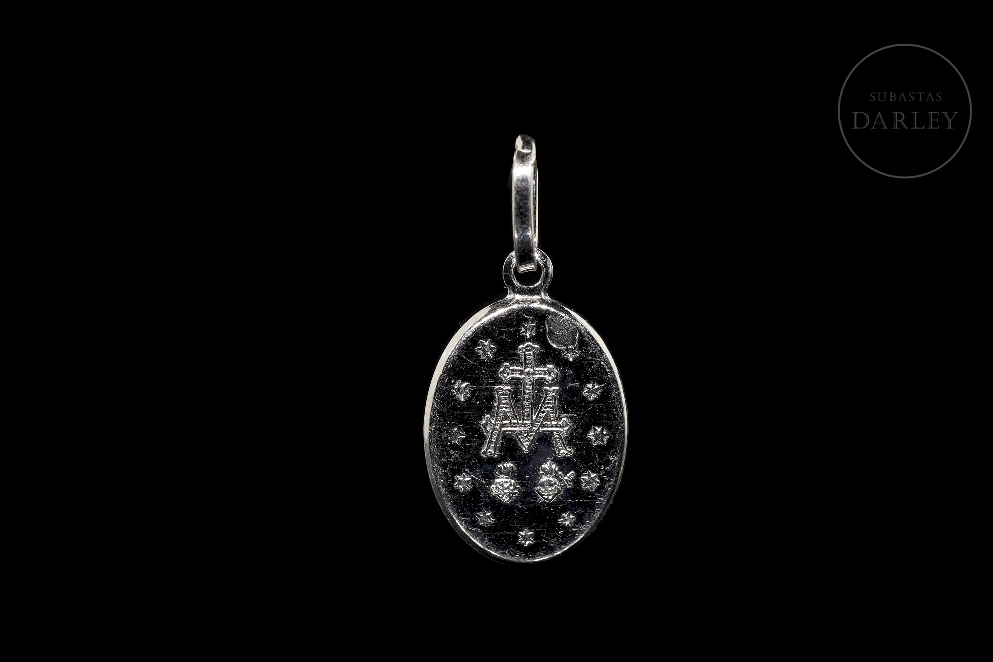 Colgante de oro de 18k, de forma ovalada con un engaste simple y un asa superior. Está decorada con un relieve en ambas caras que representa en el anverso a la Virgen de la Medalla Milagrosa con inscripción perimetral y en el reverso, el monograma de la M con la cruz y doce estrellas.