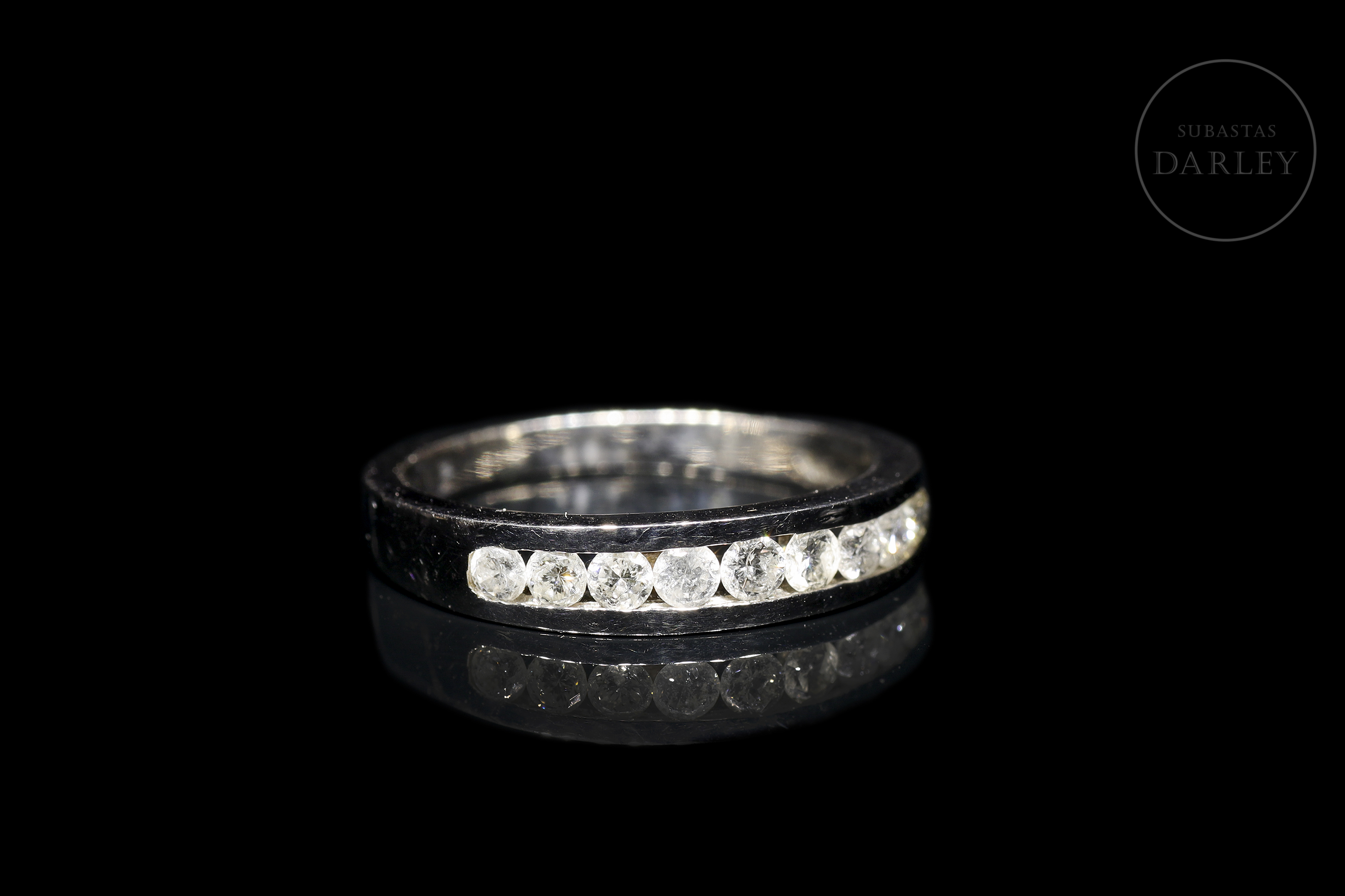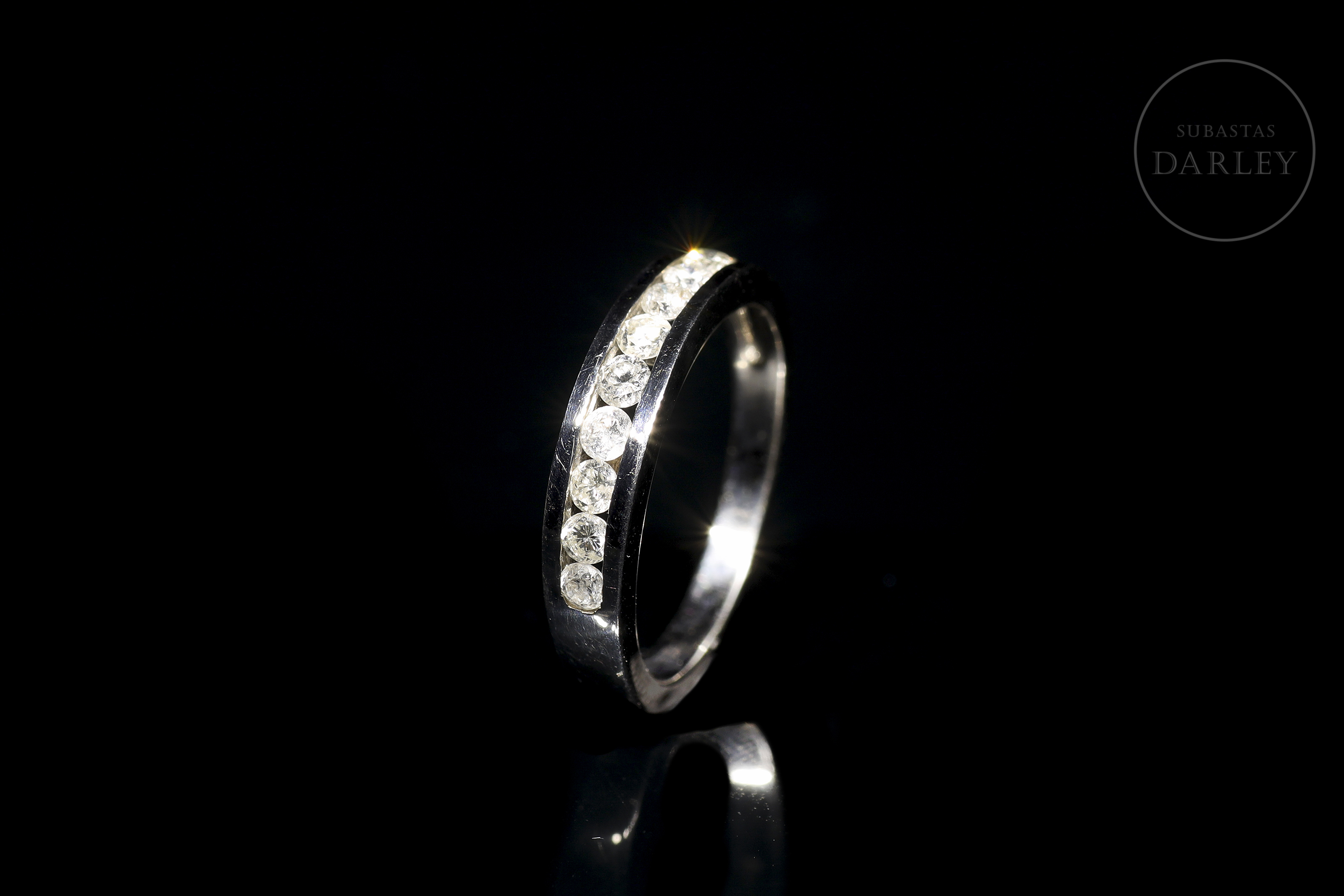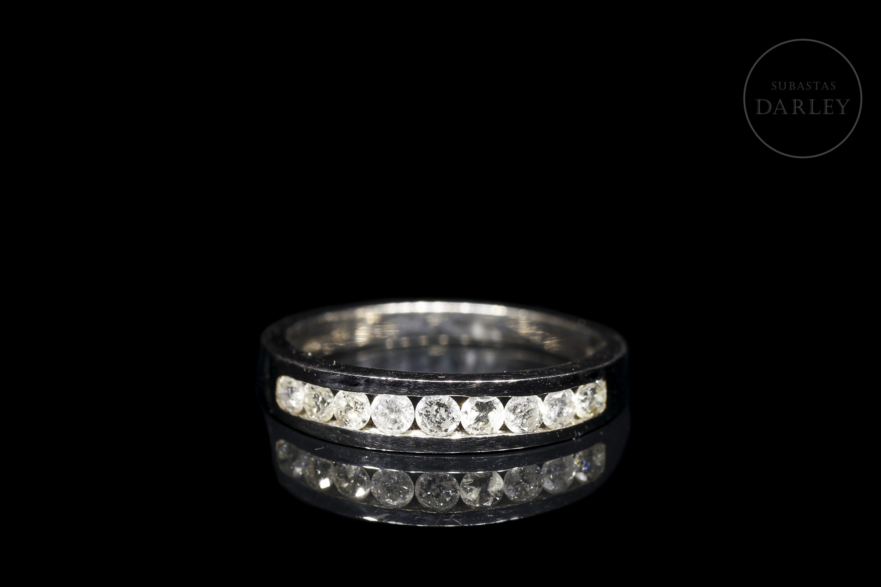 Modelo clásico de media alianza de oro blanco de 18 kt, con frontis en carril con 9 diamantes, de talla brillante, engarzados. Los diamantes tienen un peso total de 0.60ct, color H/I y calidad SI.