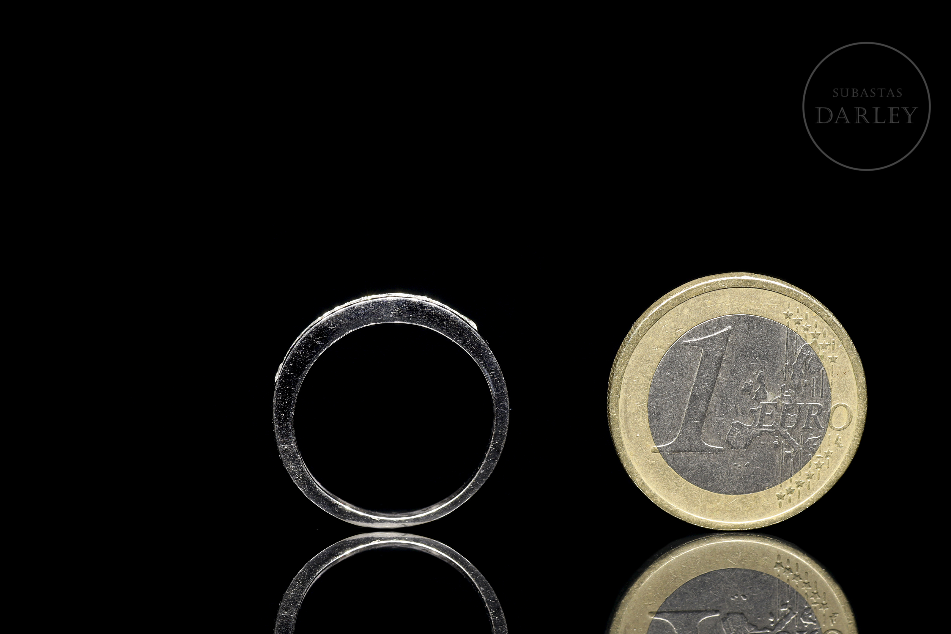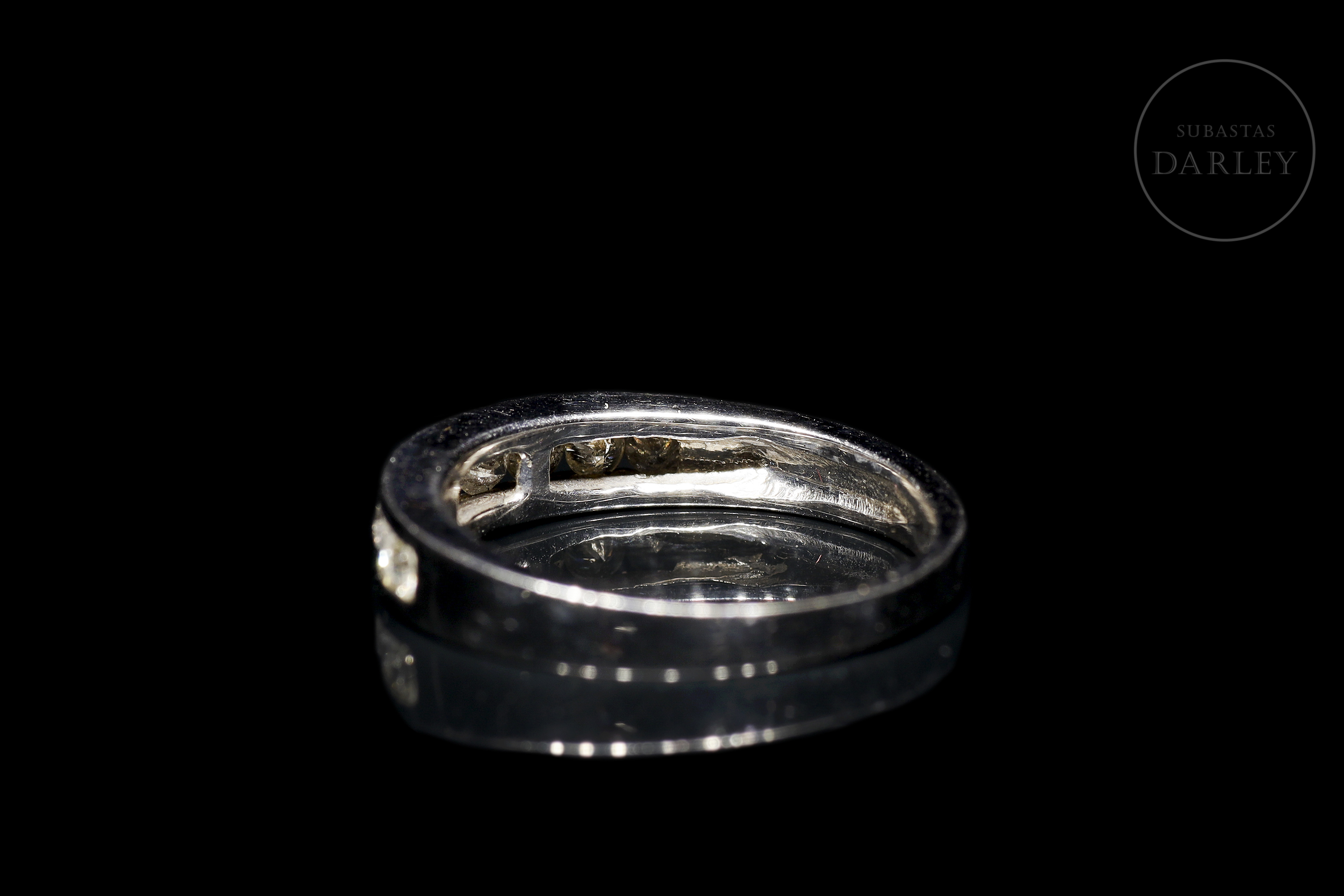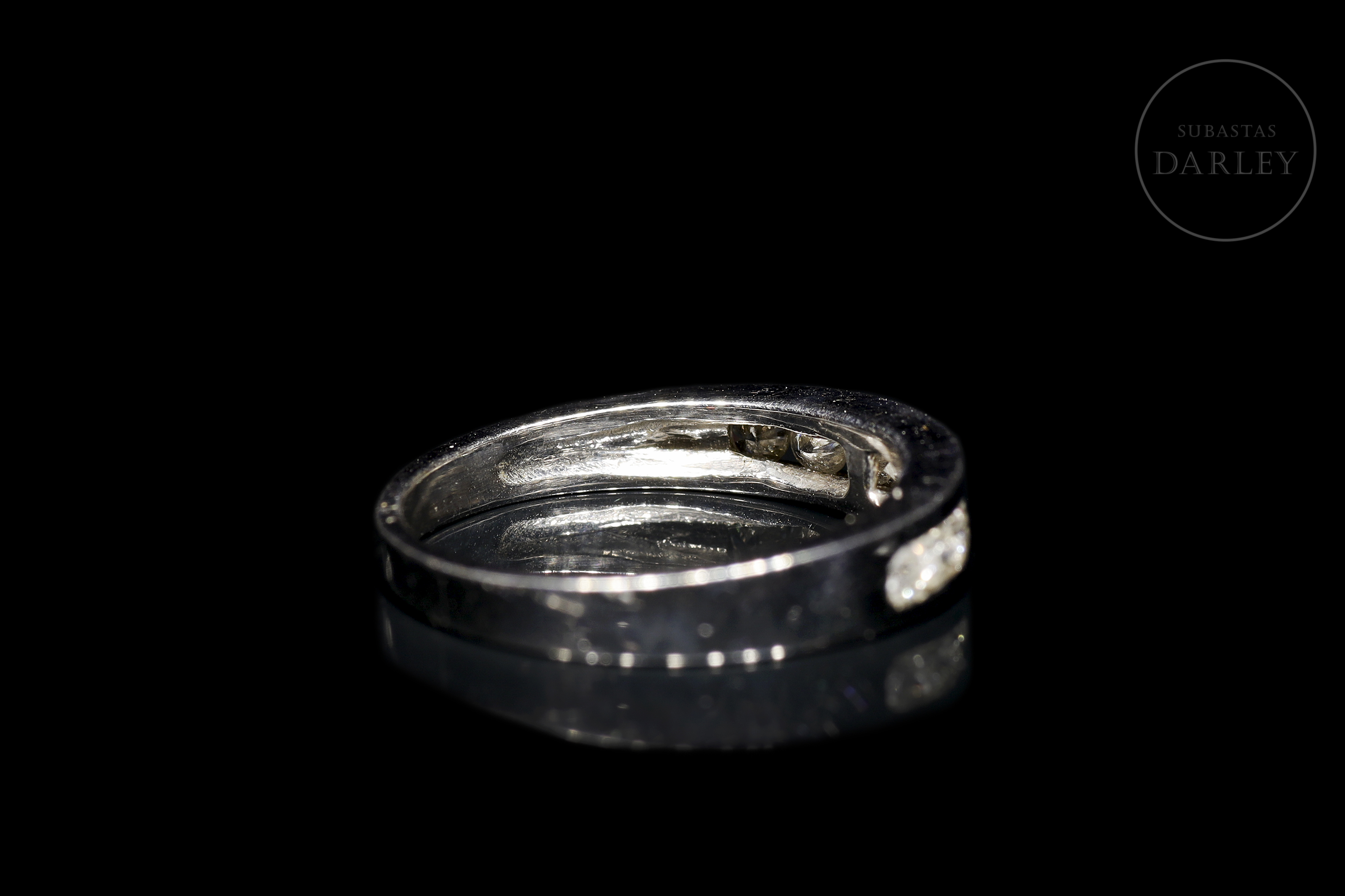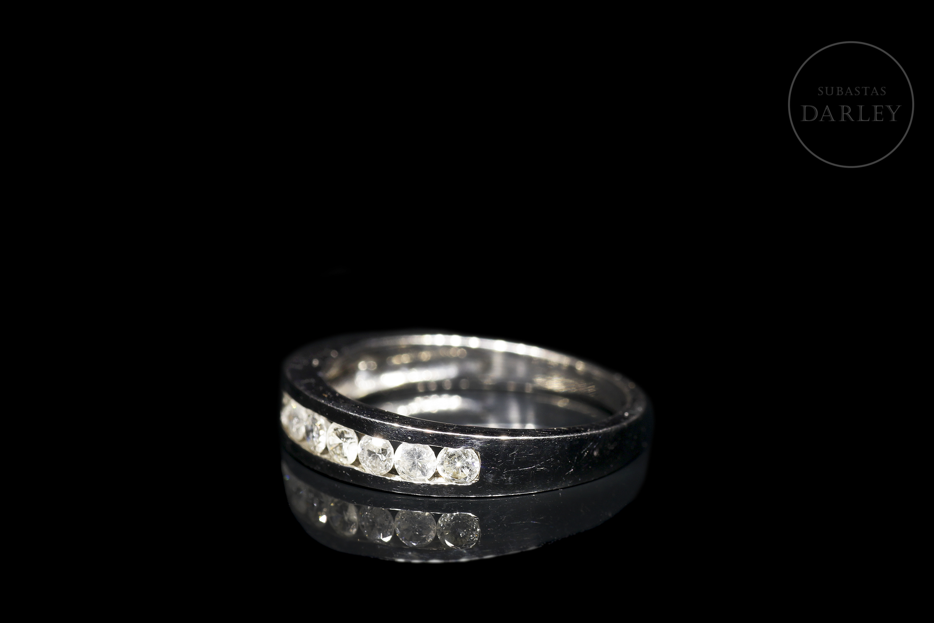 Modelo clásico de media alianza de oro blanco de 18 kt, con frontis en carril con 9 diamantes, de talla brillante, engarzados. Los diamantes tienen un peso total de 0.60ct, color H/I y calidad SI.