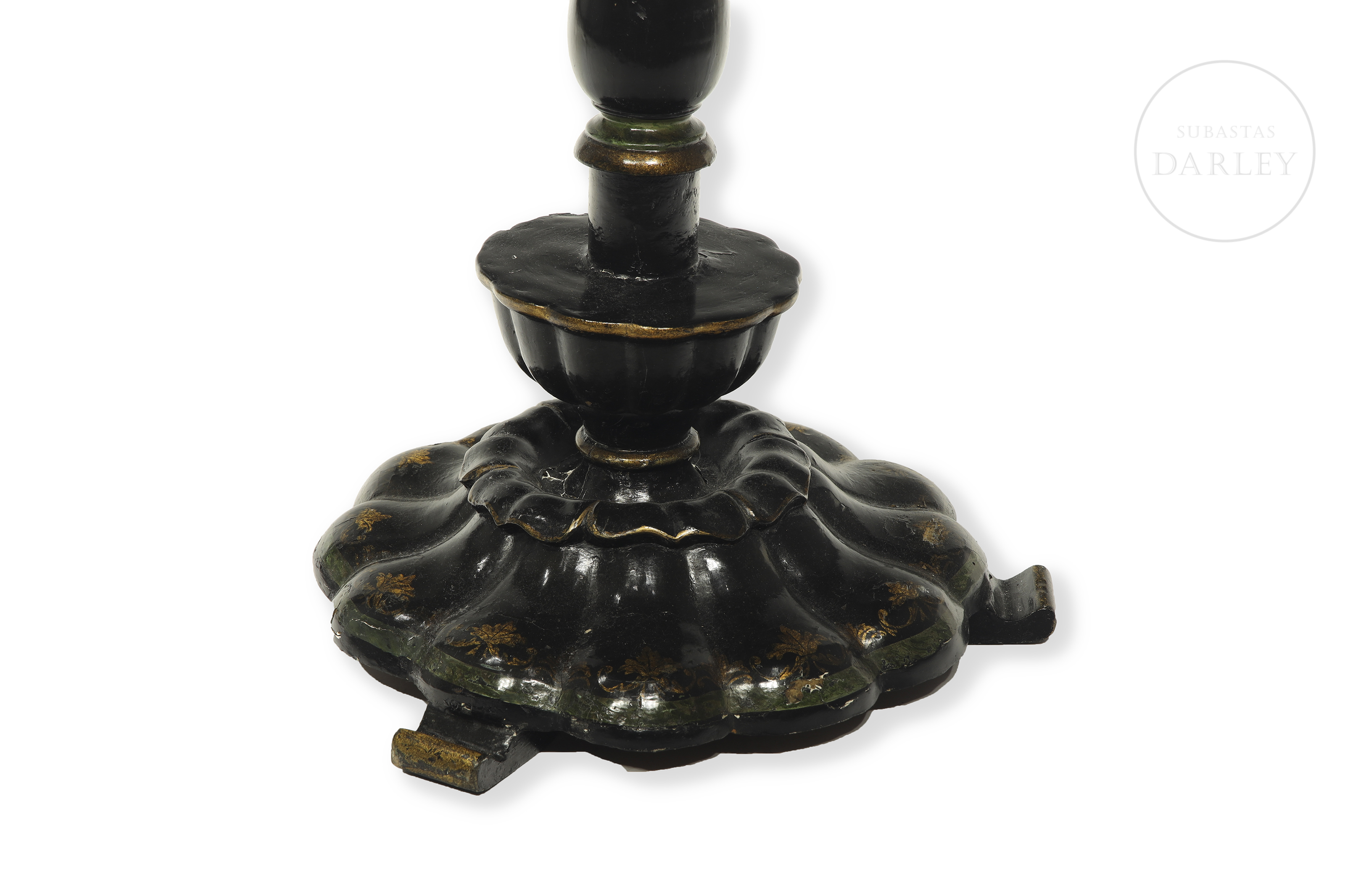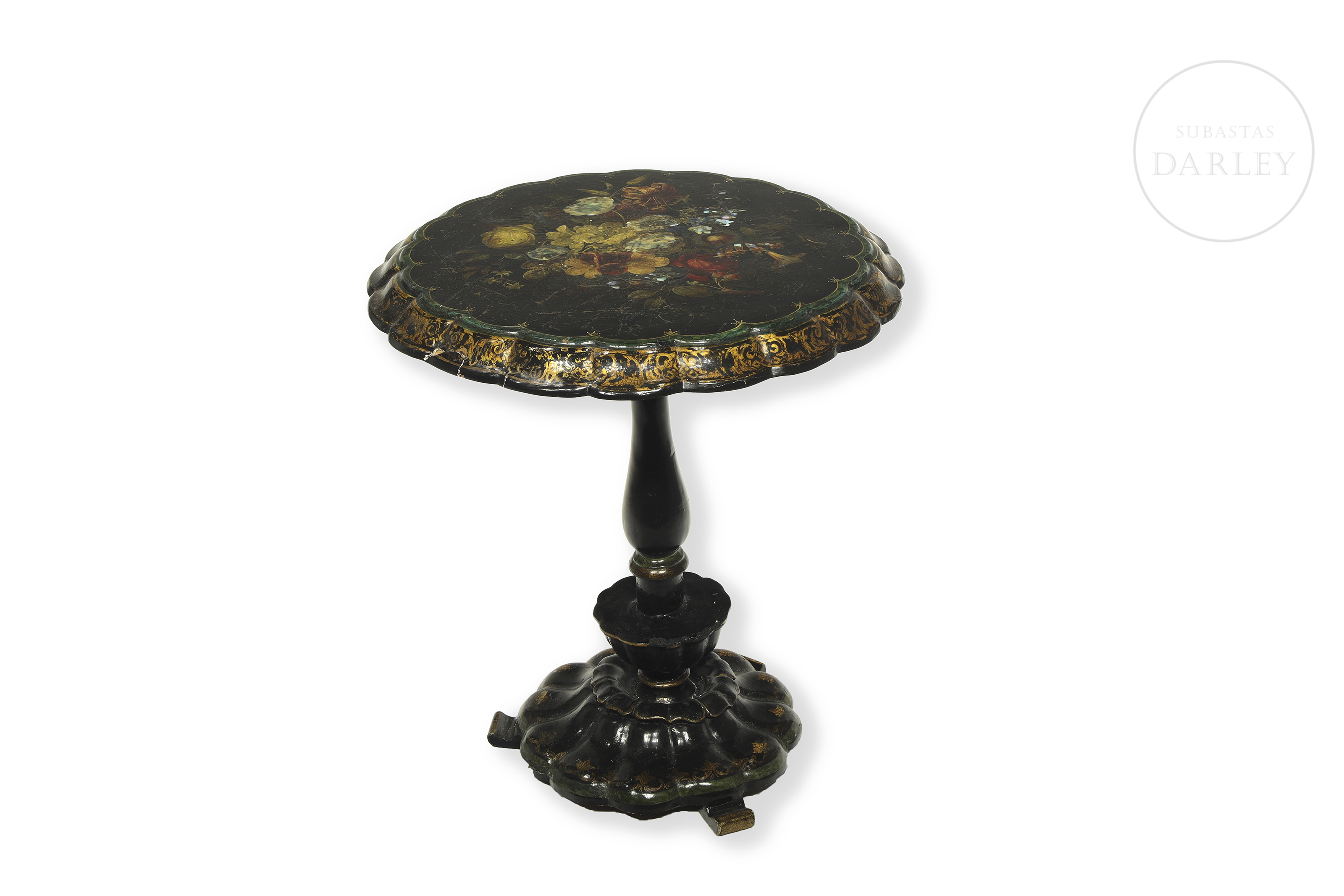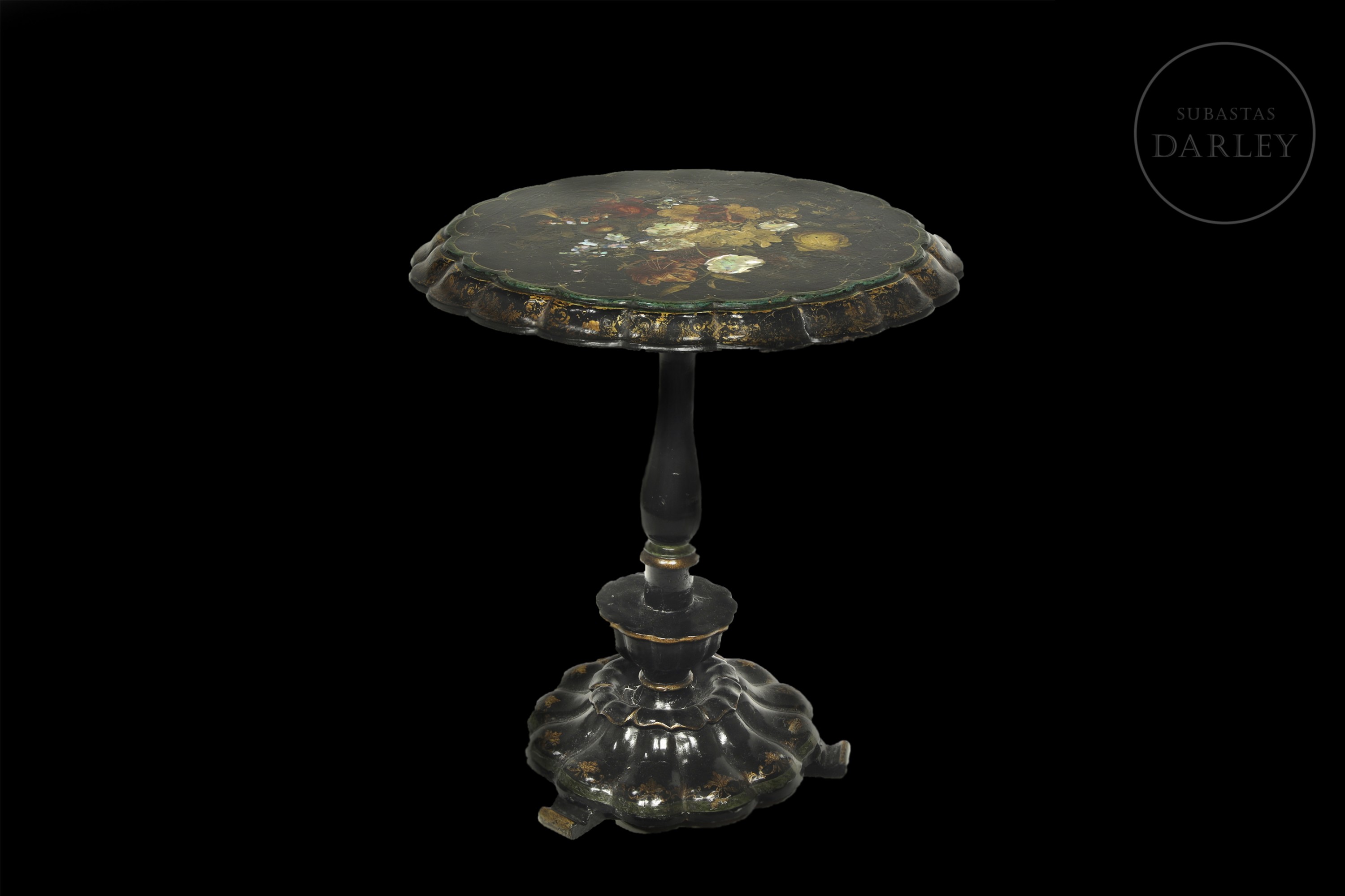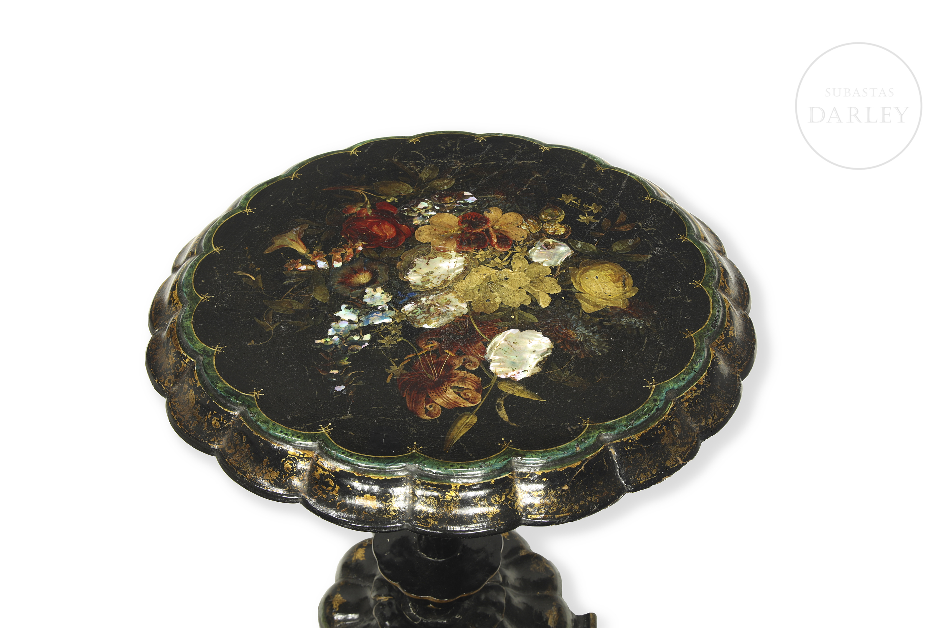 Mesa victoriana de papel maché (también conocida como mesa velador) con pedestal inclinable de madera y papel maché lacado en negro motivos foliados dorados en los bordes, flores pintadas e incrustaciones de nácar. Con ligeros desperfectos.