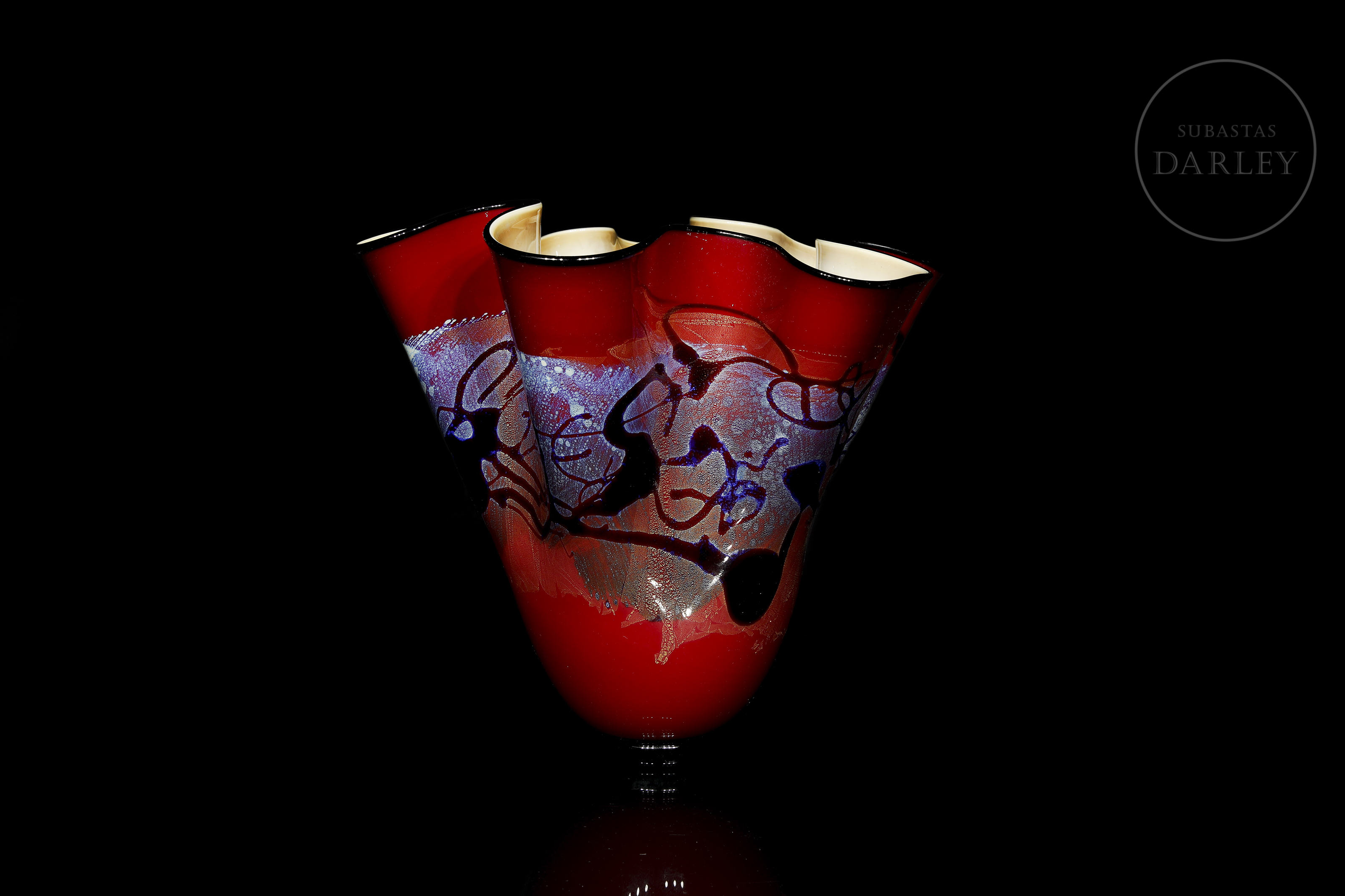 Centro decorativo con motivos abstractos siguiendo la serie "Red Satin Series". Ejemplo perfecto de la calidad de las piezas del taller de vidrio Nourot, destacado por la utilización del vidrio rojo, predominante en el exterior de la pieza y contrastando con el interior en tonos ocres. Presenta las inscripciones "Nourat Fv 59 98 Michael Nourat" en su base. Sin desperfectos ni daños visibles.
