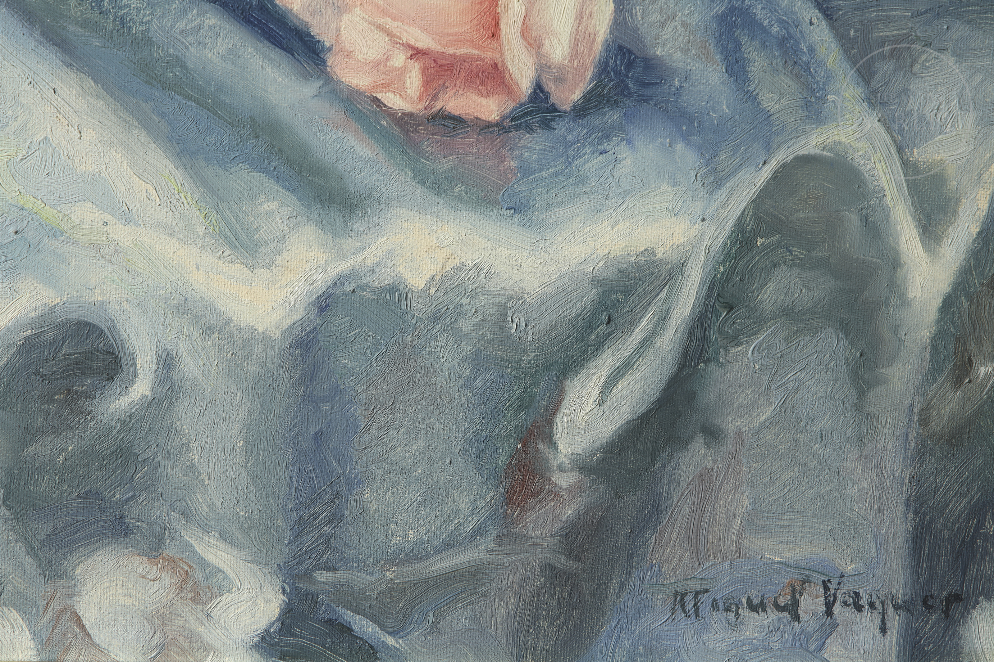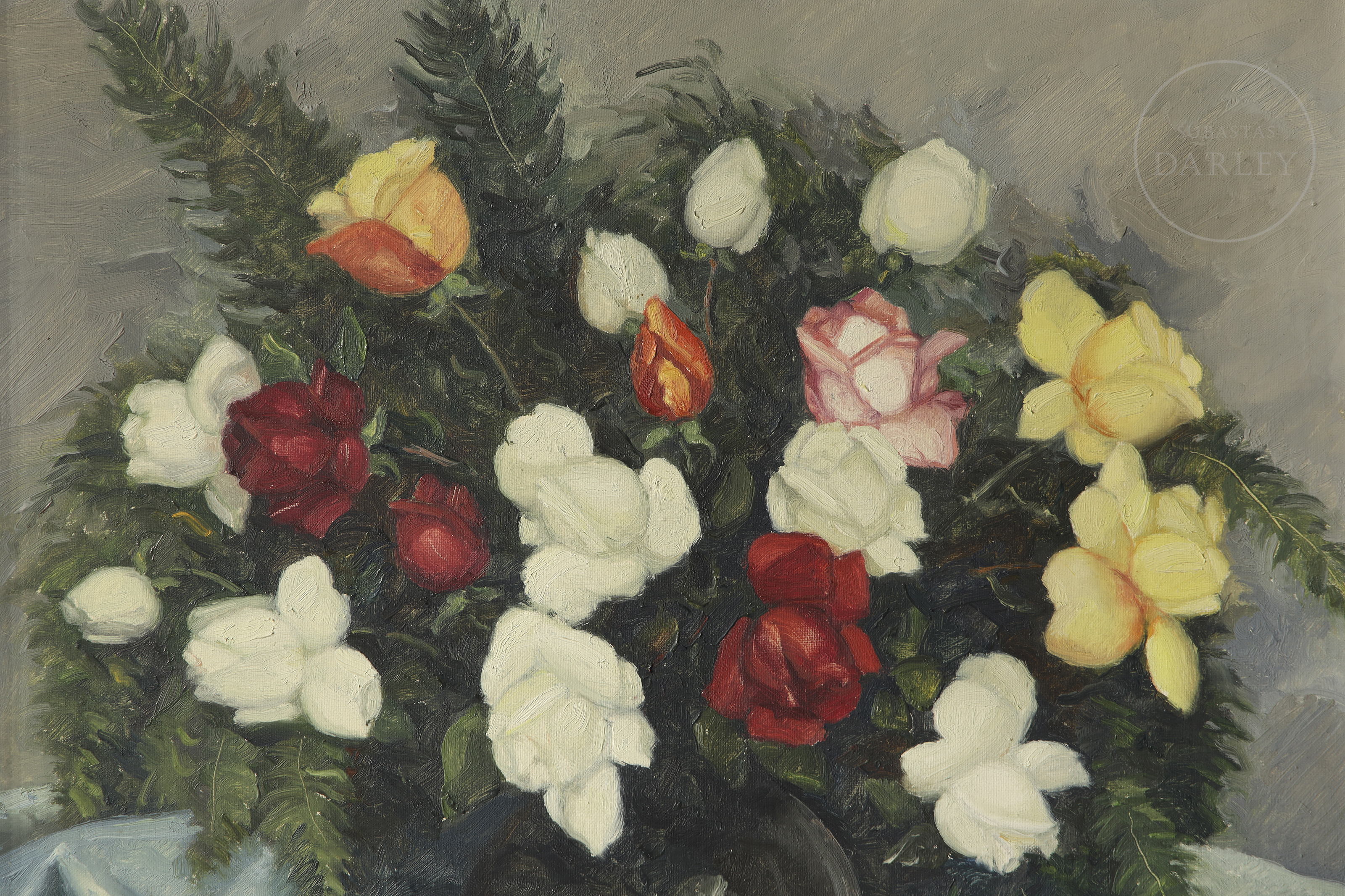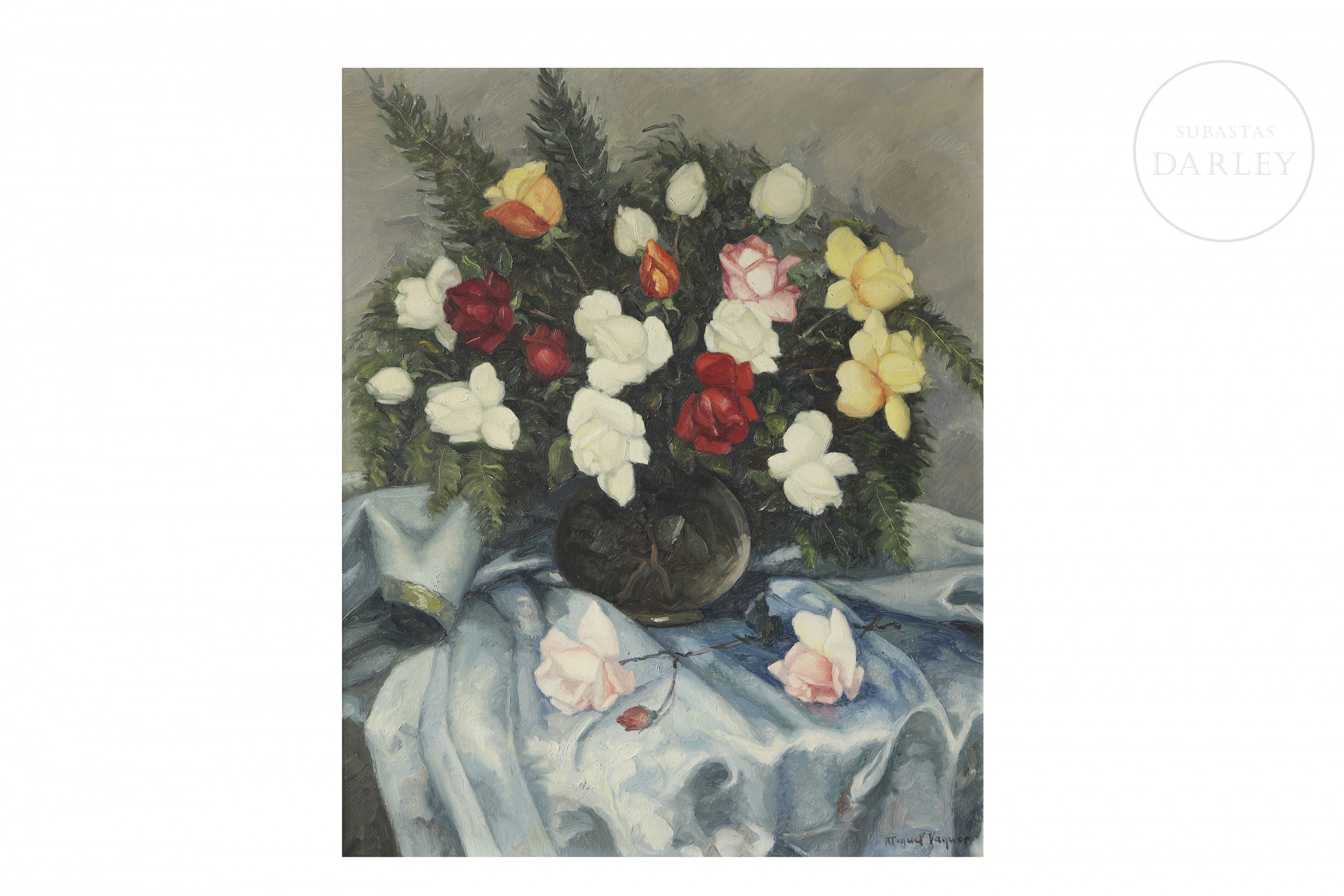 Óleo sobre lienzo. Naturaleza muerta que representa un variado ramo de rosas blancas, rojas y amarillas en un jarrón de cristal. Firmado "Miquel Vaquer" en la esquina inferior derecha.