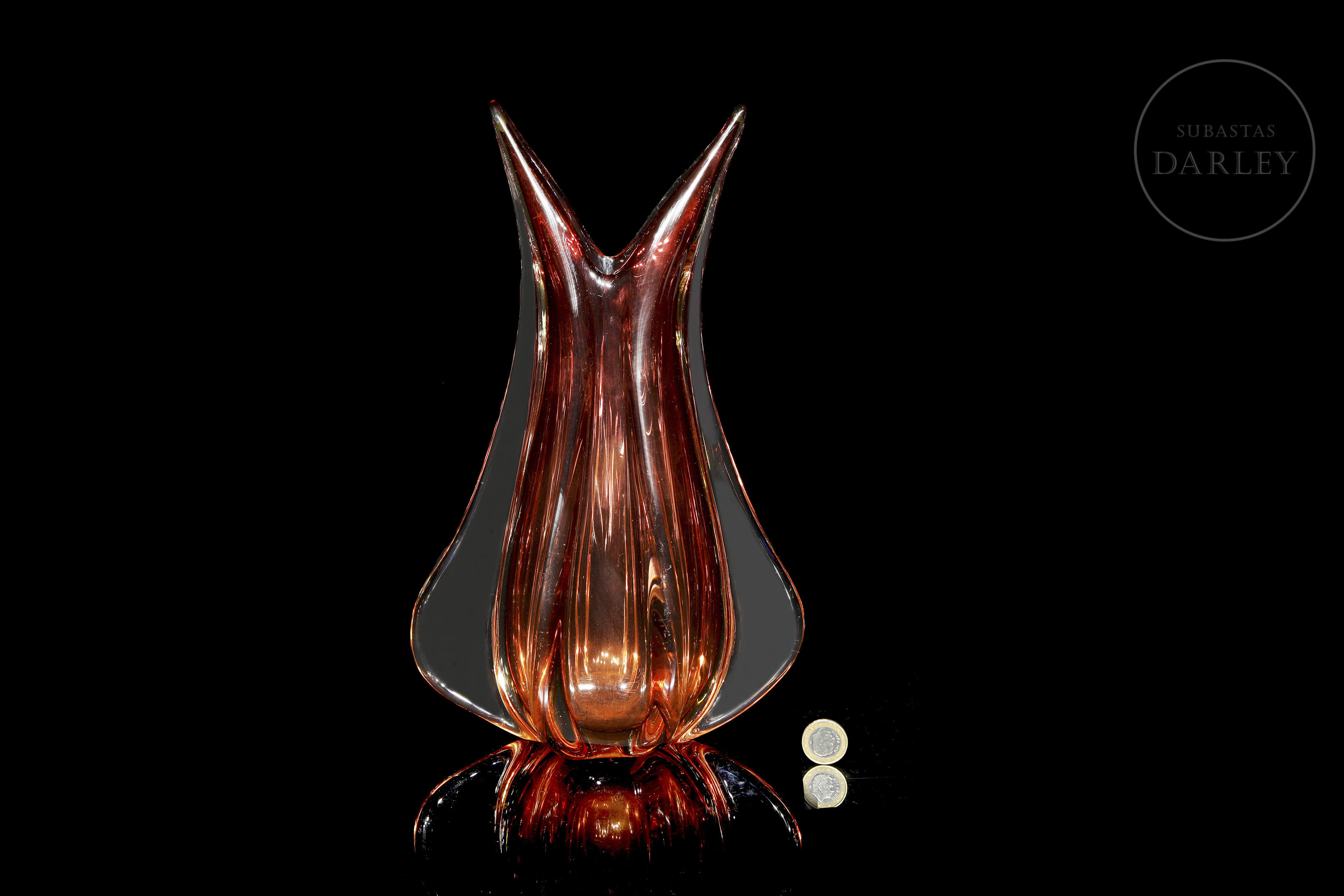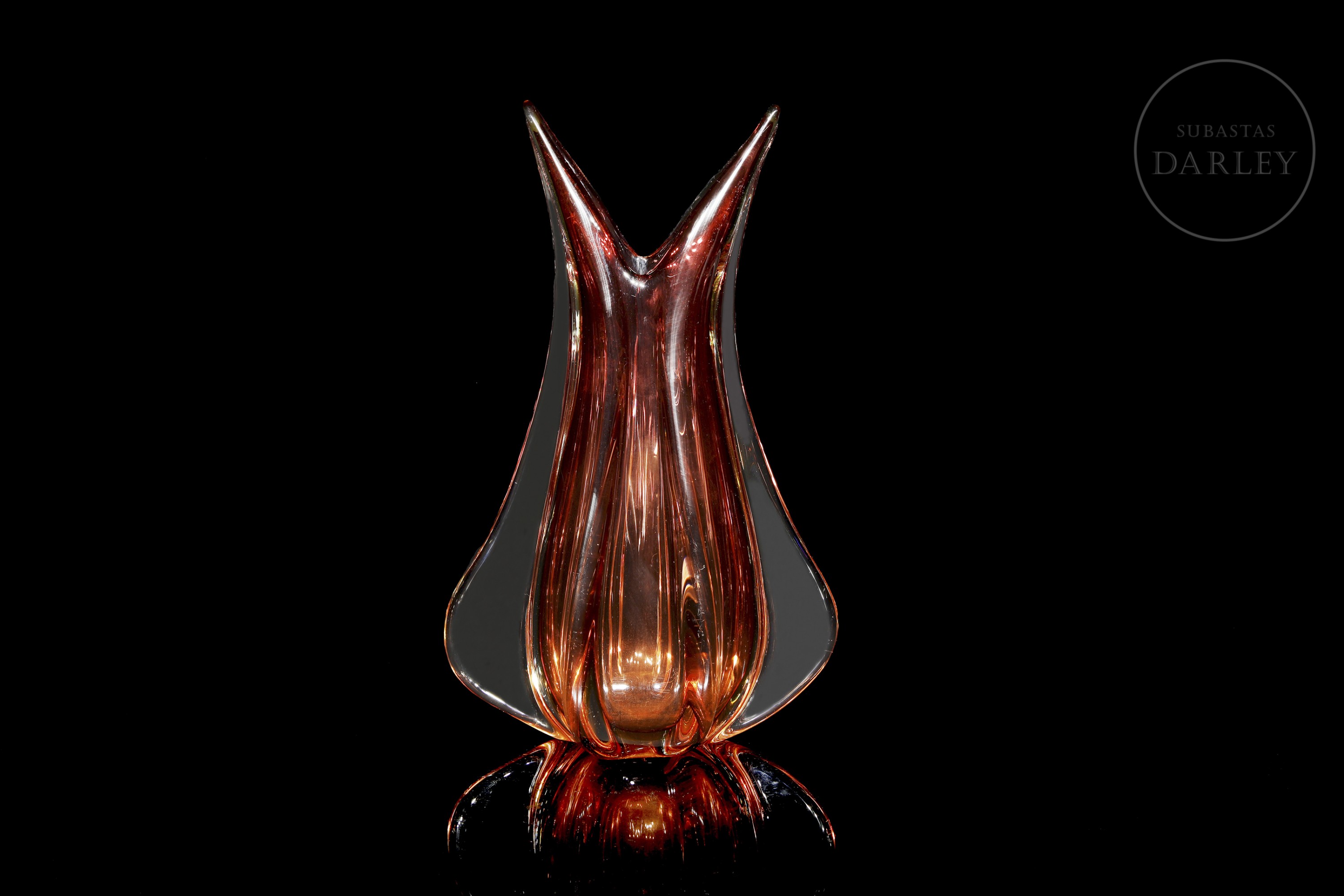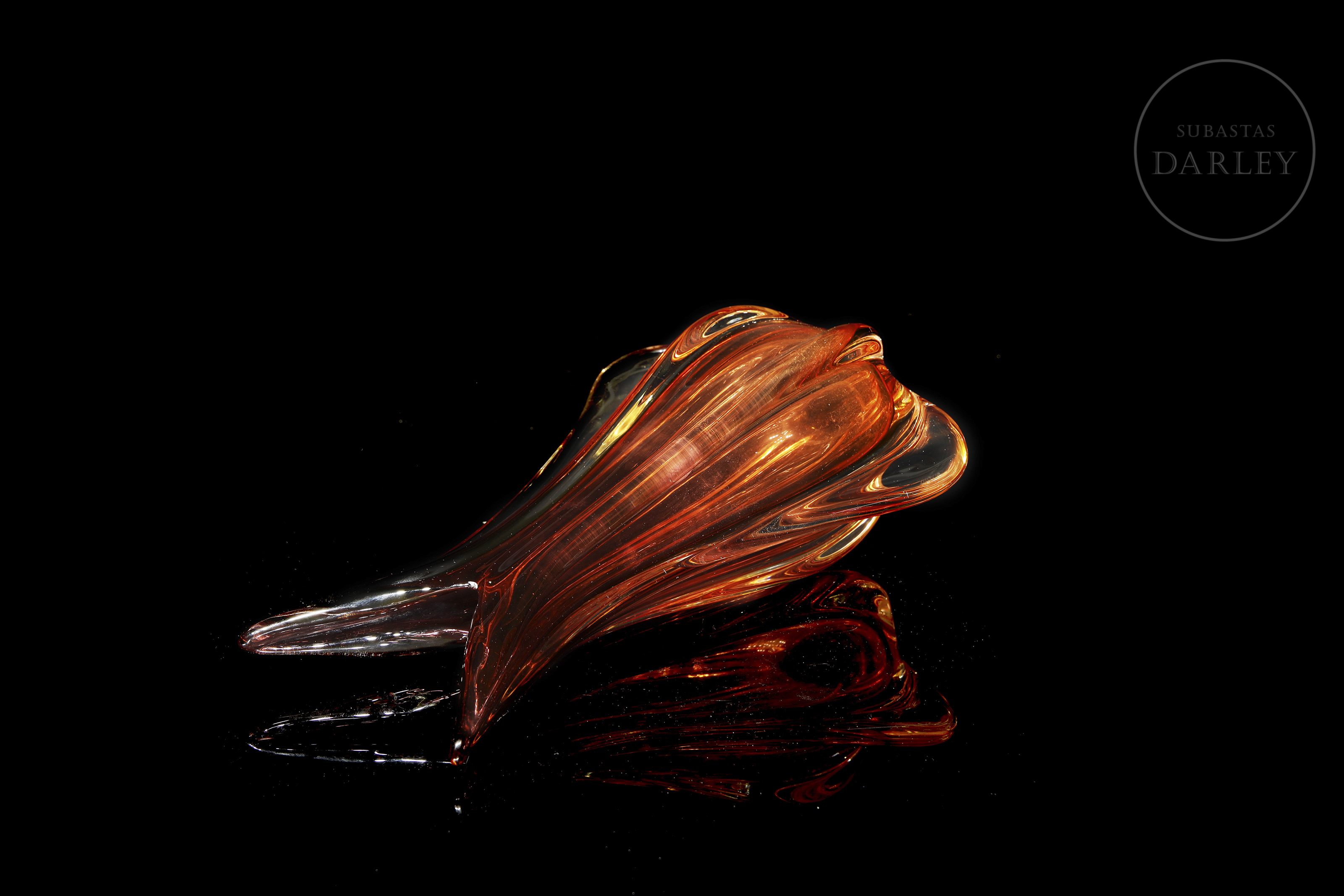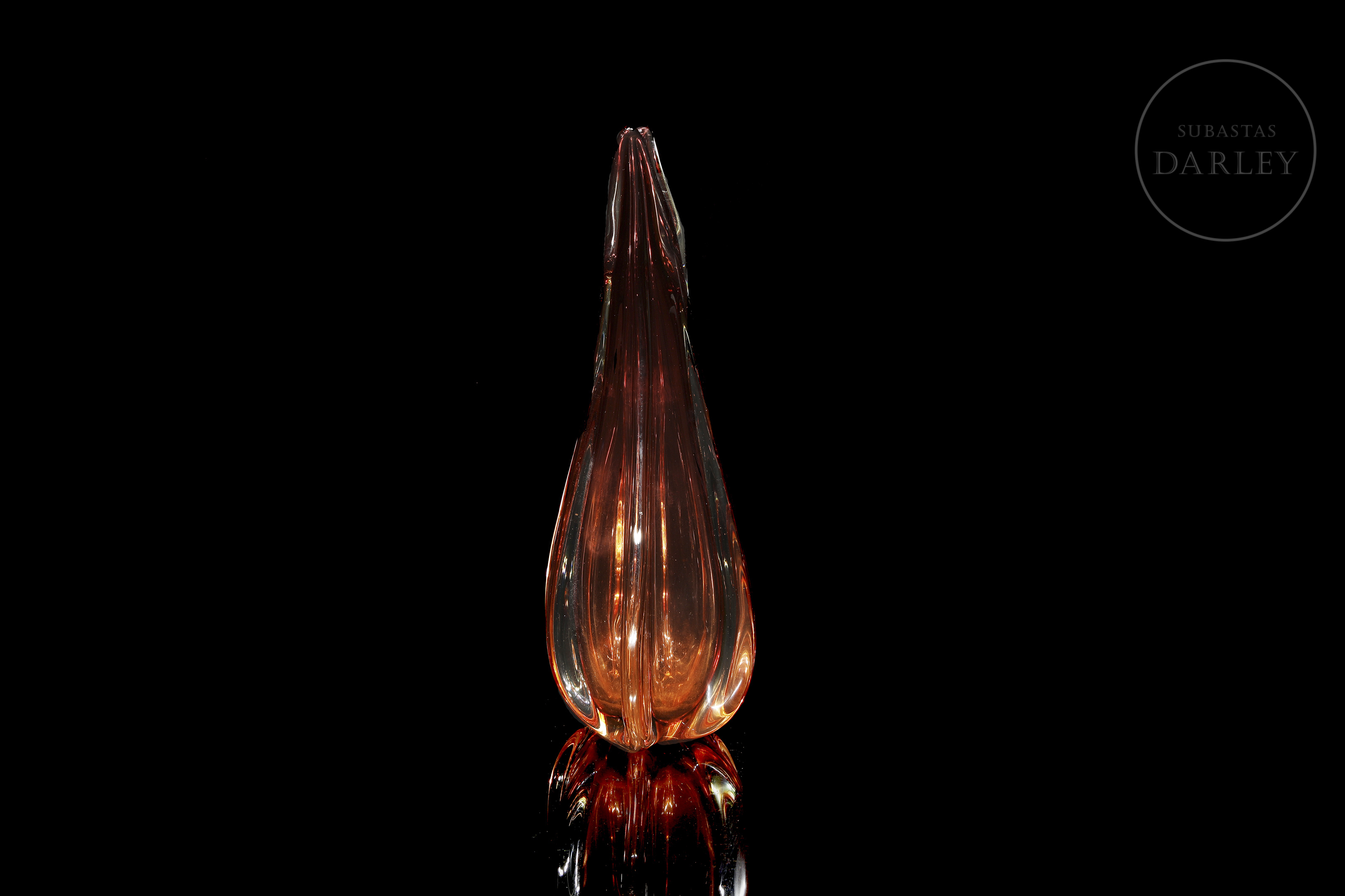 Pieza decorativa en tono rojizo vibrante logrado mediante vidrio soplado. Siguiendo modelos de Flavio Poli. Sin marcas ni desperfectos visibles.