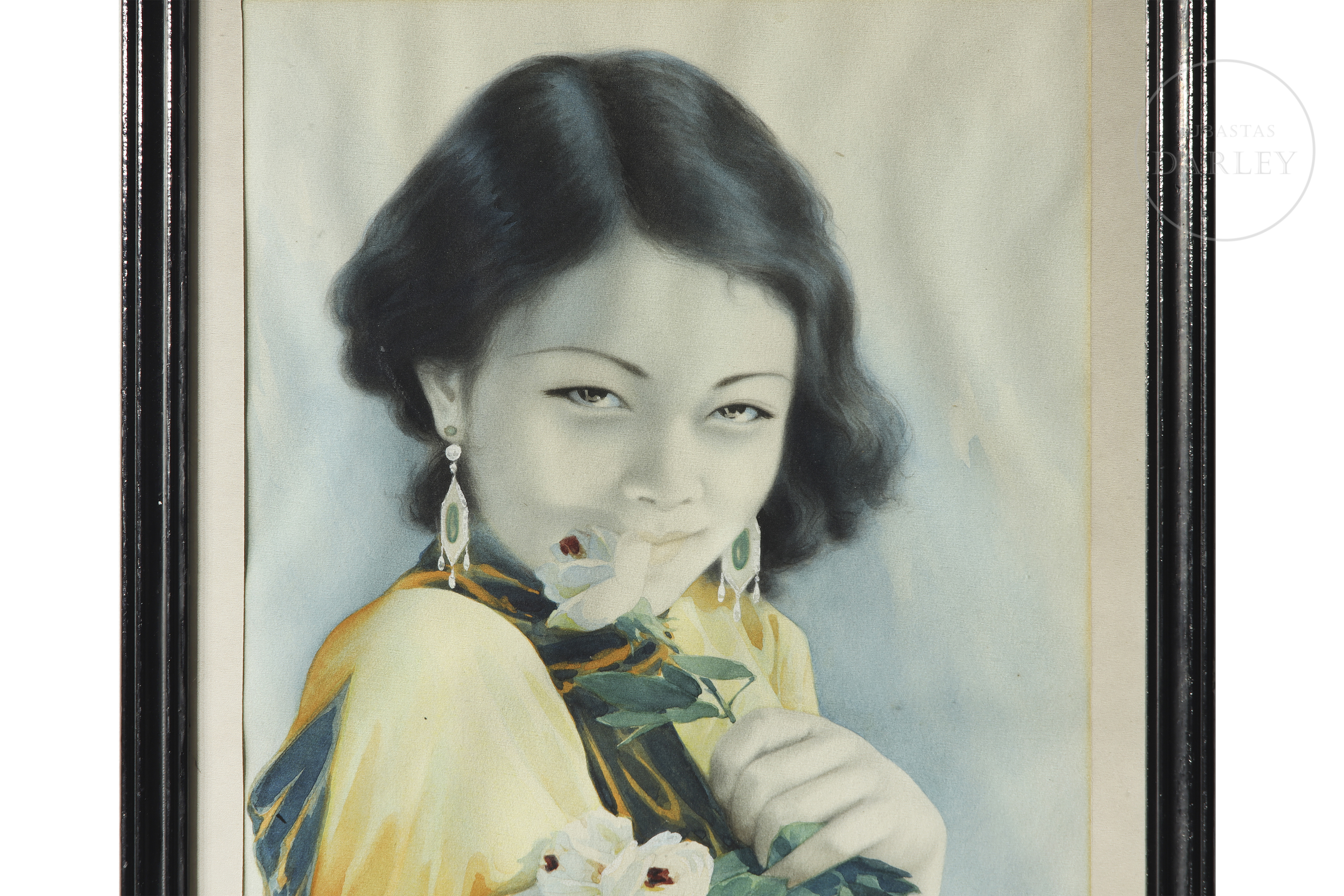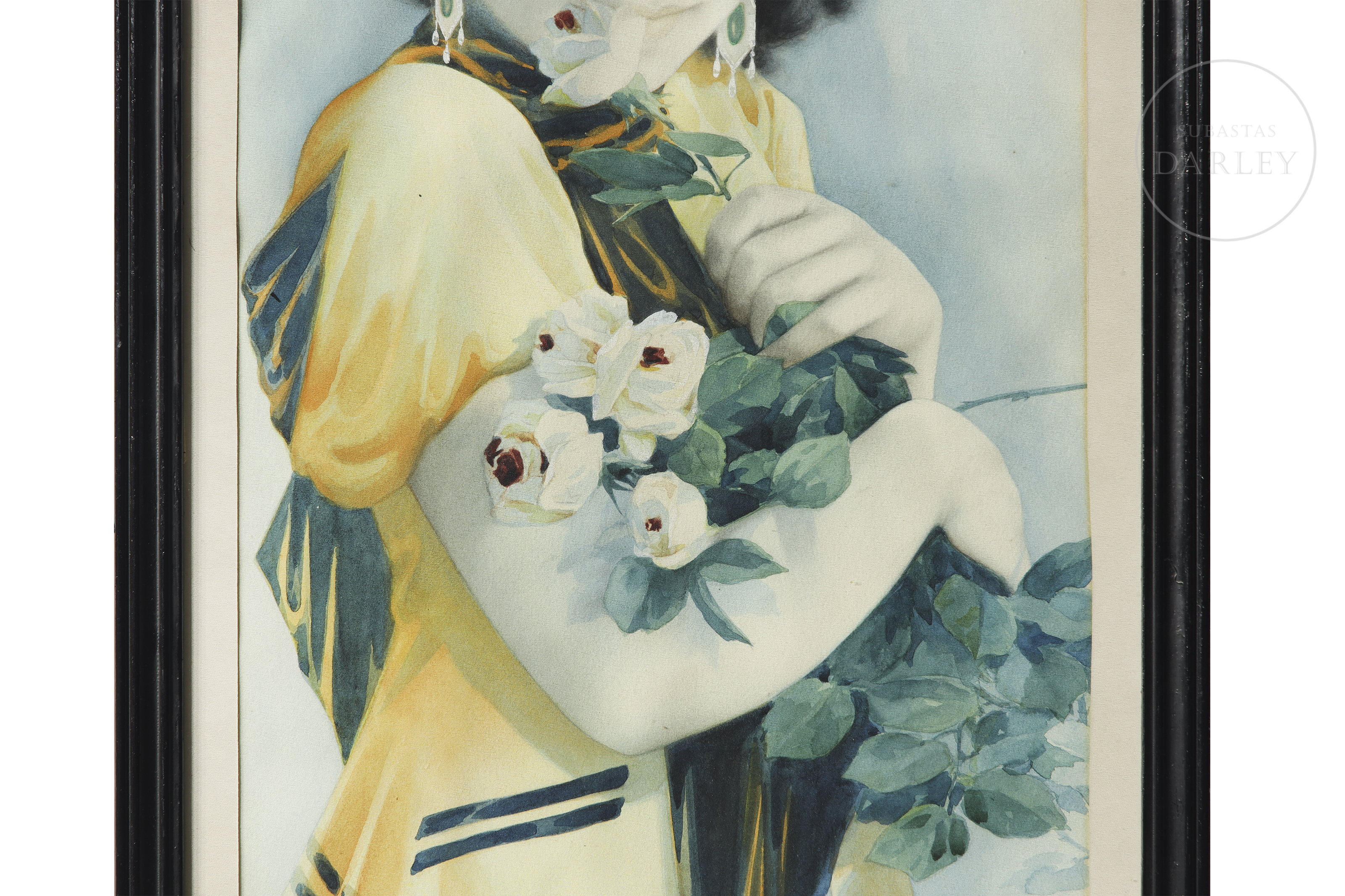 Acuarela y pigmentos sobre papel. Presenta el retrato de una mujer joven de medio cuerpo, en una pose de gran delicadeza mientras sostiene un ramo de flores blancas contra su pecho. Luce un peinado ondulado de época y pendientes estilo Art Déco, subrayando el cosmopolitismo de la clase media-alta de mediados del s.XX. Ha sido recortado por ambos lados para eliminar las referencias al tabaco. Firmado y sellado en la esquina inferior derecha.