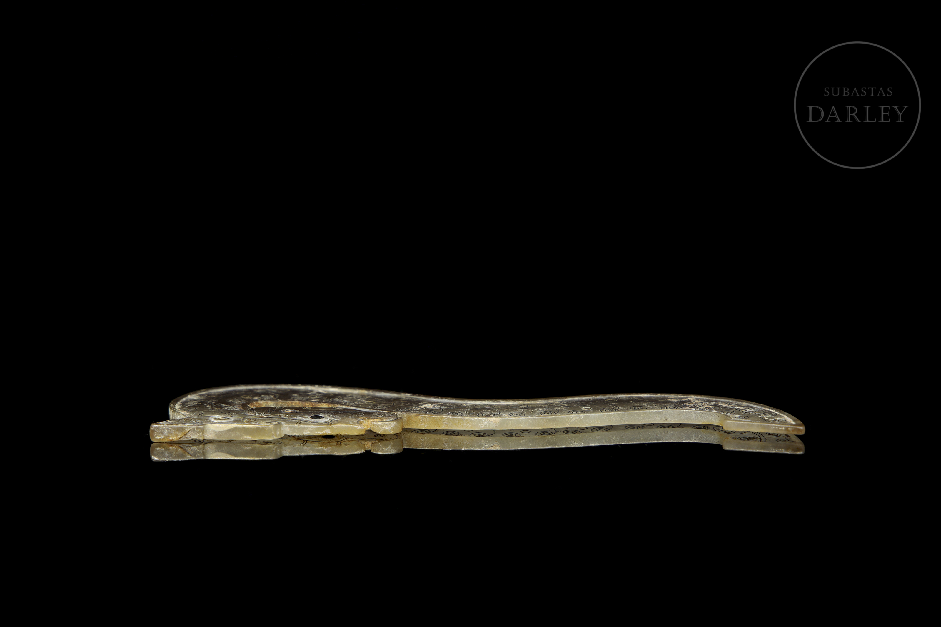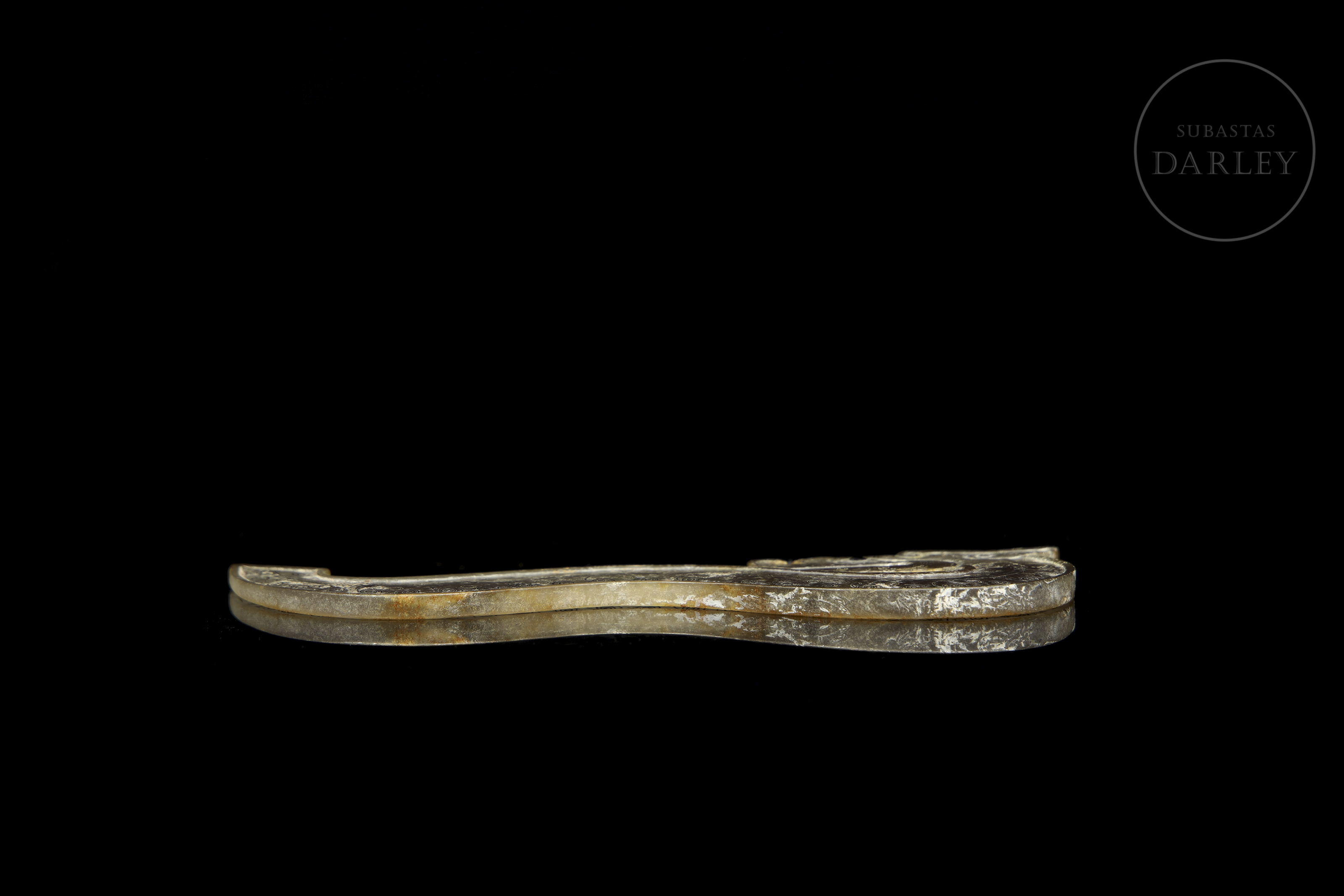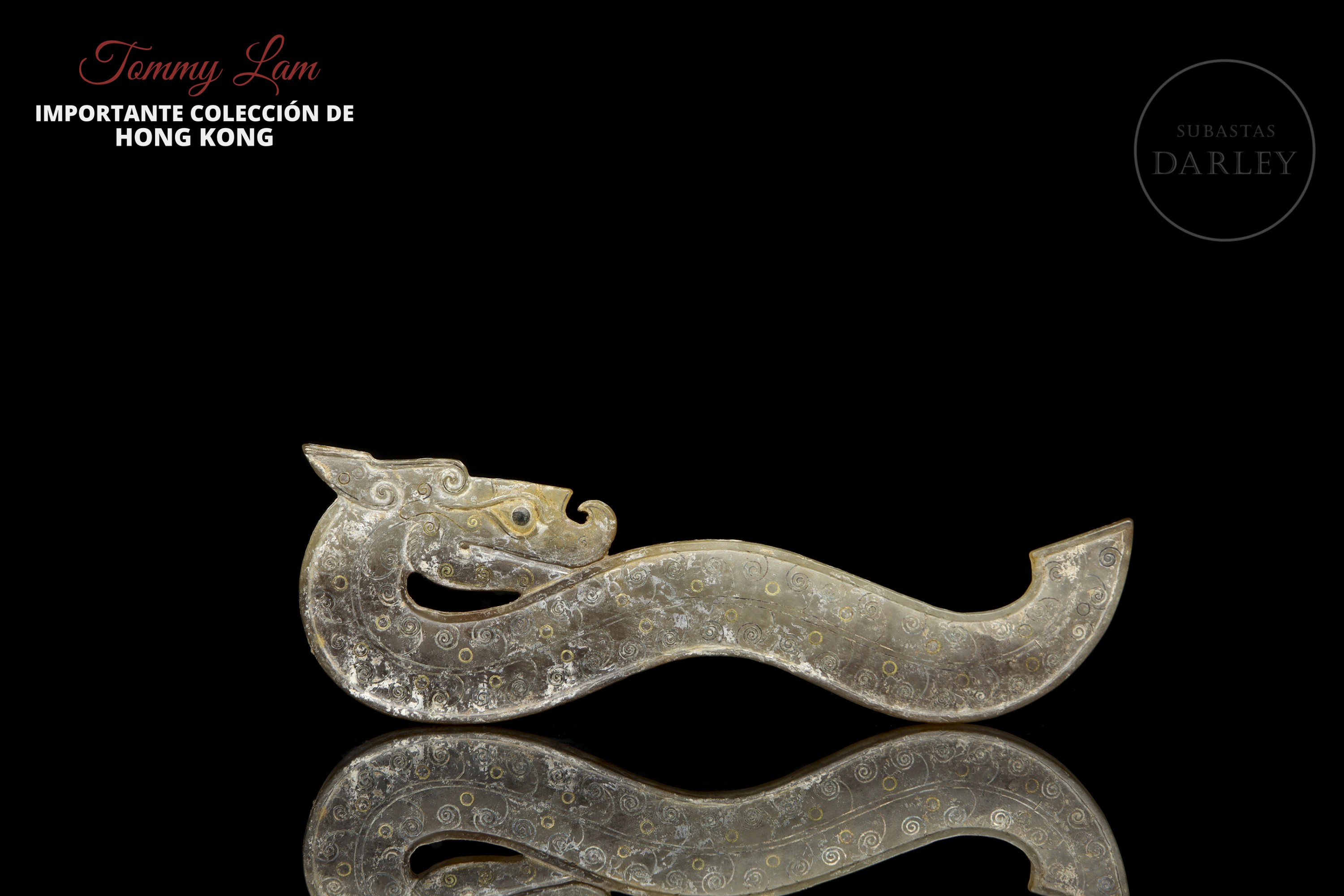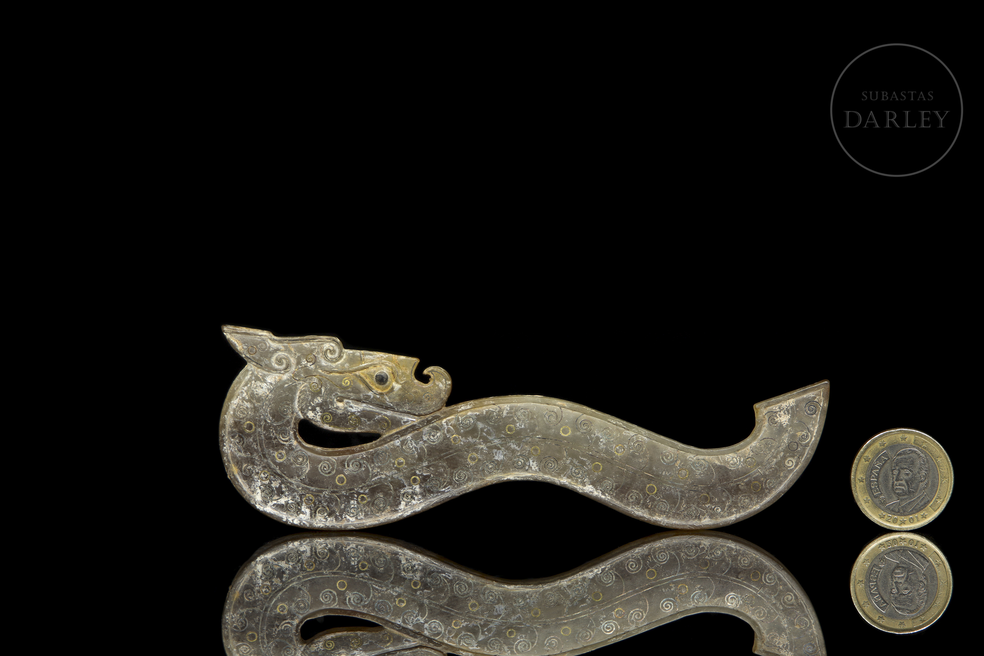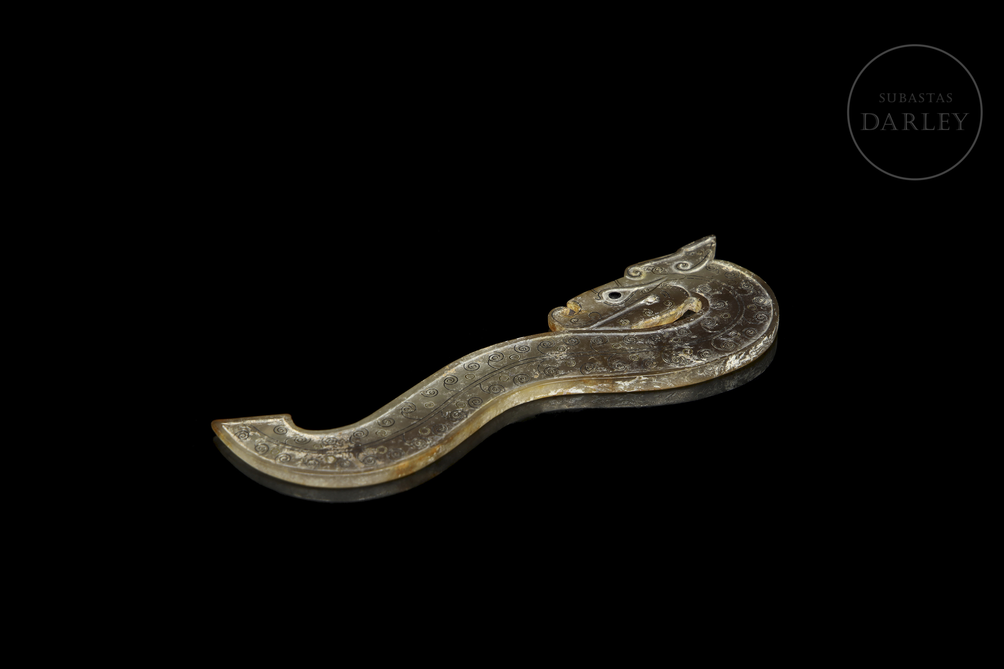 Jade de tono grisáceo con áreas de alteración mineral blanquecina. La pieza presenta un diseño plano de perfil sinuoso que representa un dragón de rasgos simplificados y estilo arcaico. Destaca la profusa decoración de pequeñas espirales realizadas en oro y plata engastada. La superficie muestra una extensa pátina testigo de su antigüedad. Periodo Reinos Combatientes (475–221 a.C.) o posterior.