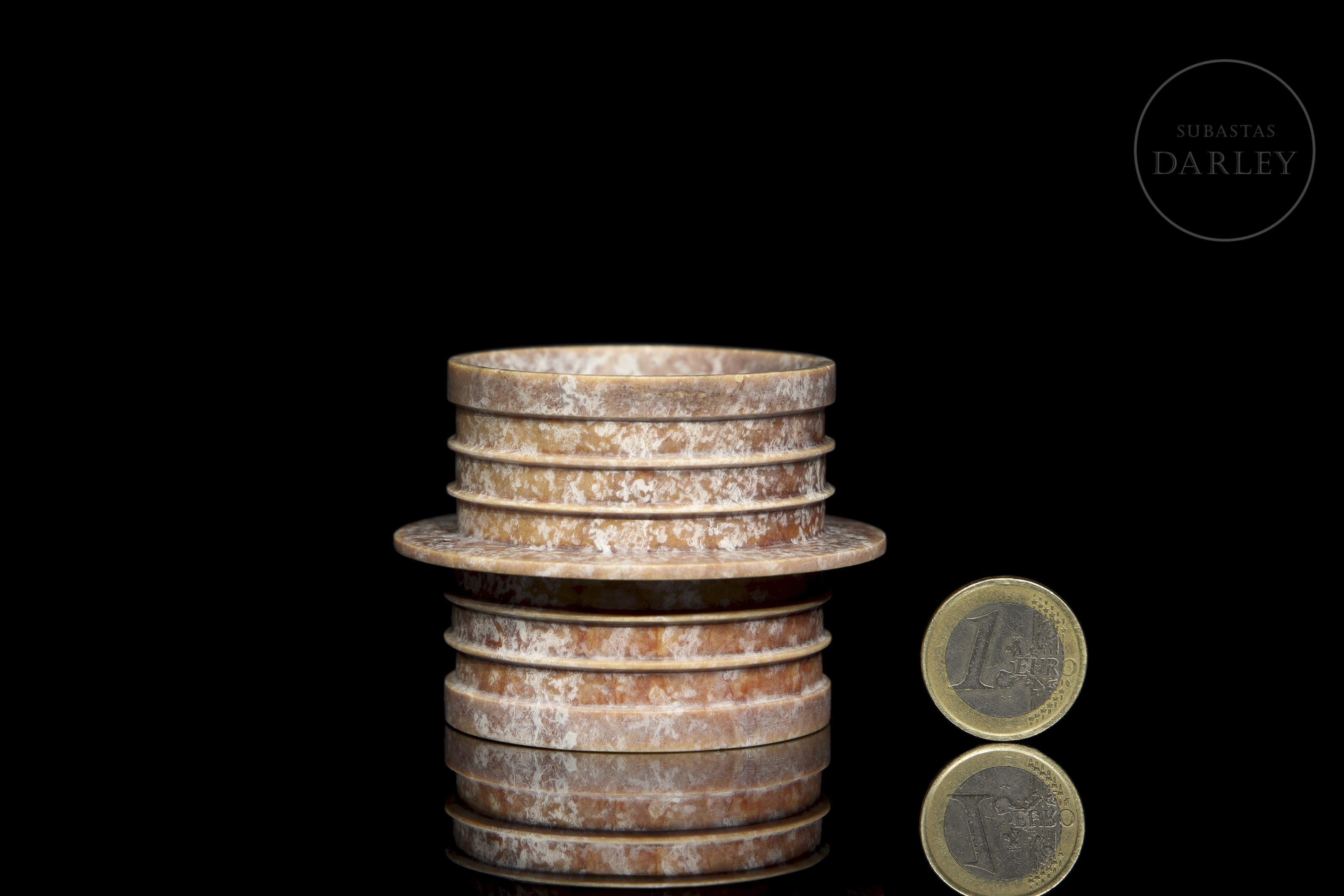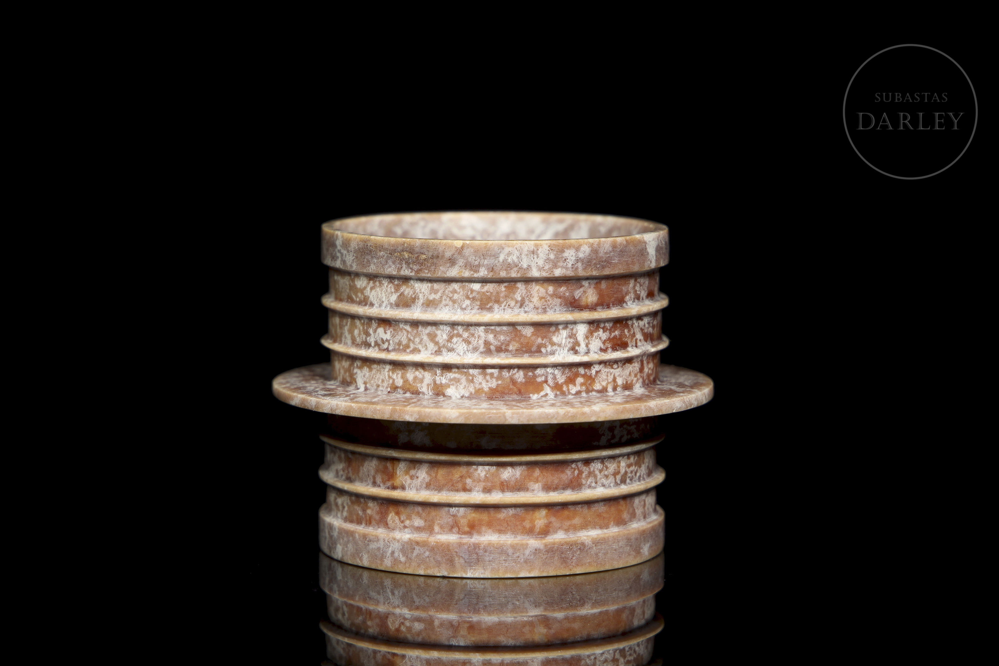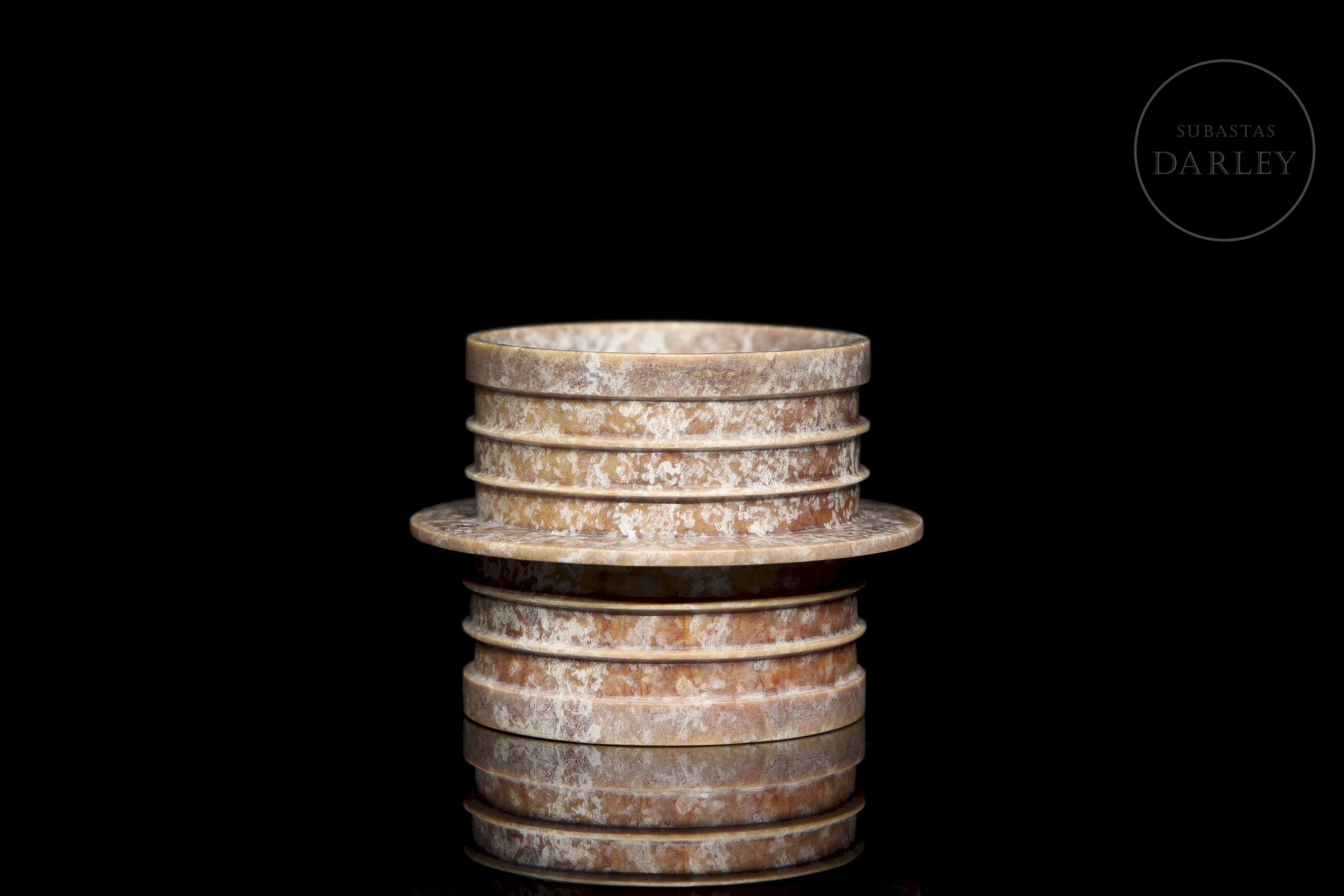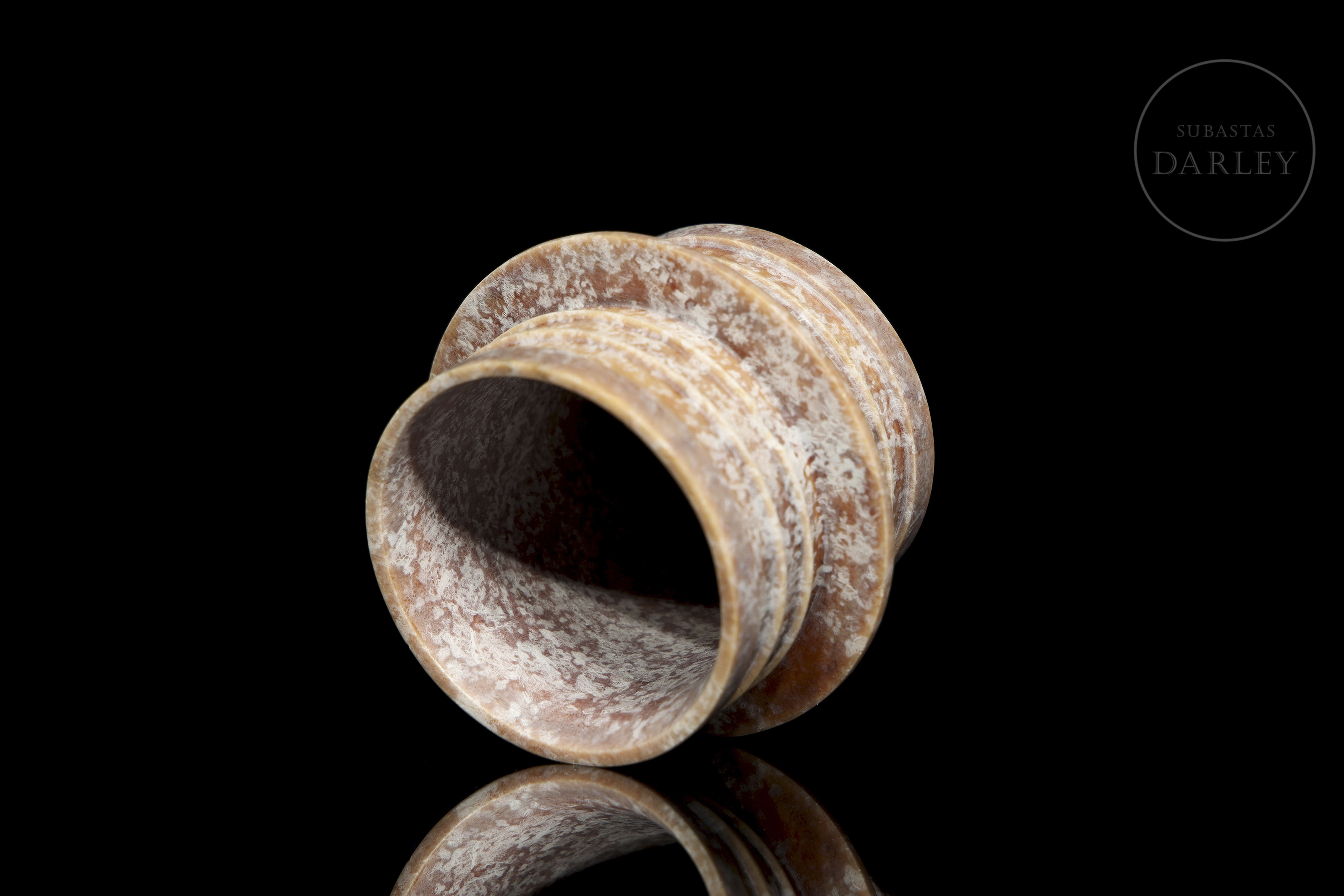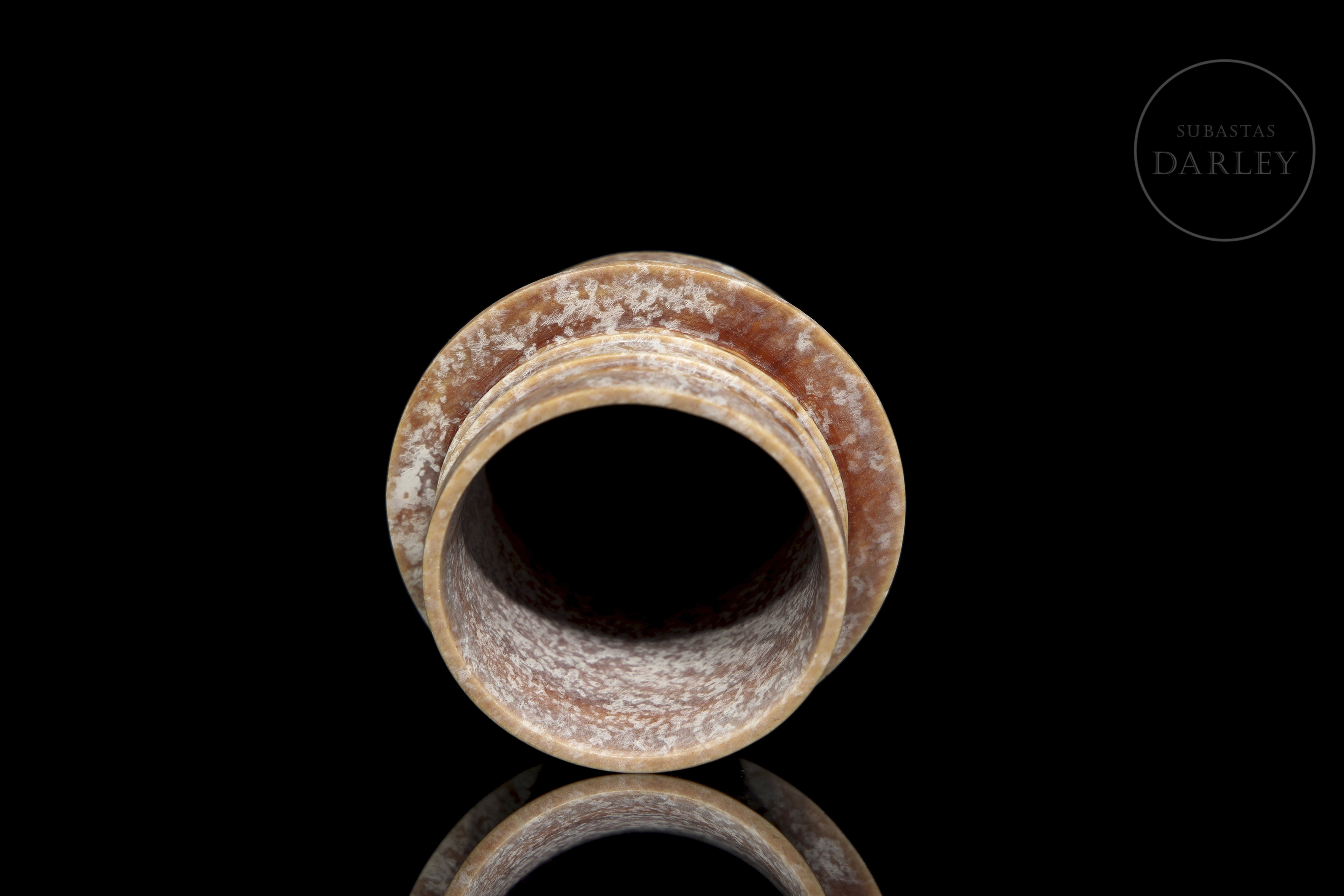 Jade tallado de tonalidad ocre rojiza con una profusa pátina de color blanquecino. La pieza presenta un formato cilíndrico escalonado, compuesto por un cuerpo central ensanchado en forma de disco o ala, flanqueado por registros horizontales paralelos tallados. Posee una perforación central de gran diámetro que atraviesa toda la pieza. Muestra pátina por antigüedad. Cultura Liangzhu (aprox. 3300–2300 a.C.) o posterior.