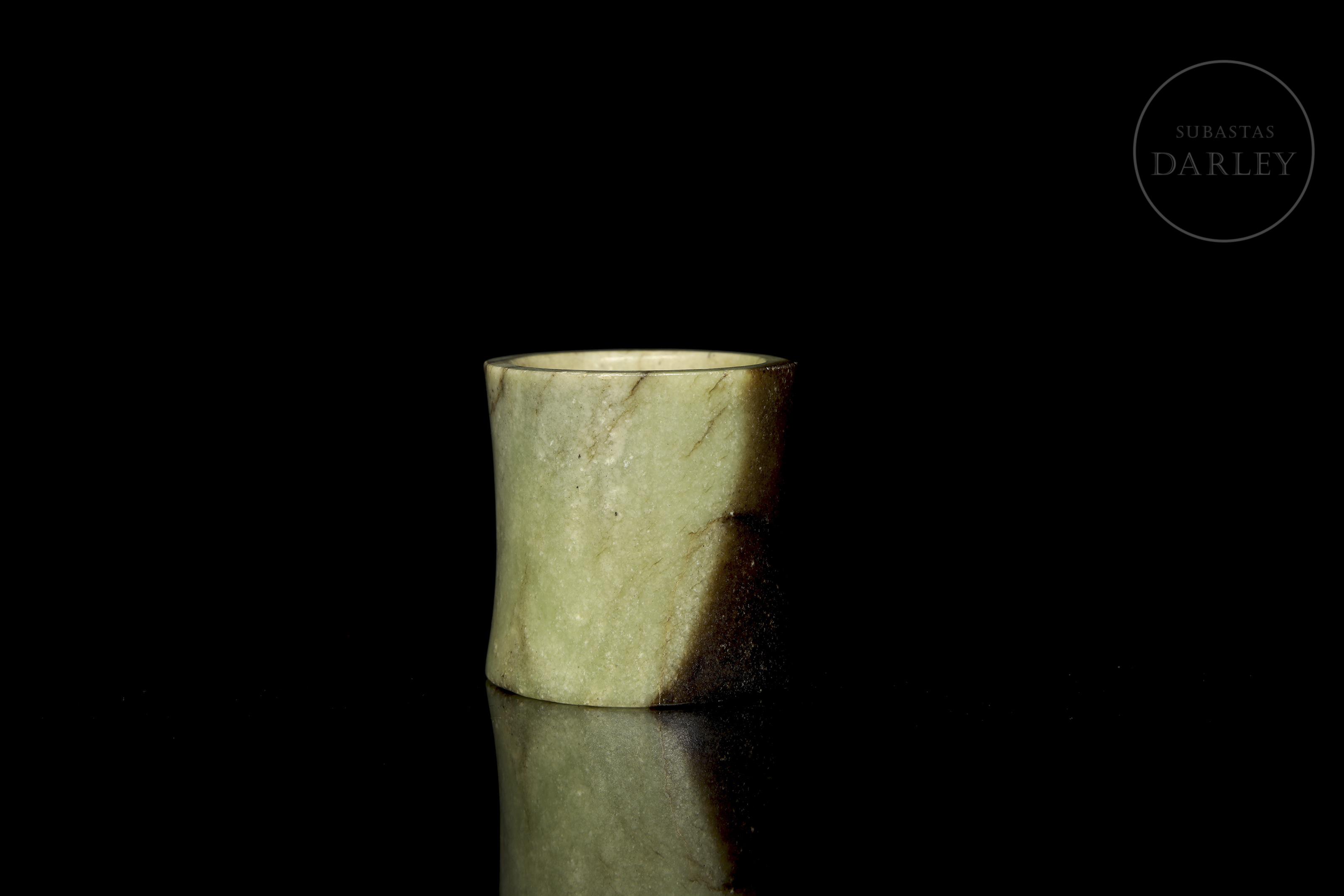 Realizado en jade de tonalidad verde pálido con áreas en marrón oscuro y ocre. La pieza presenta un formato cilíndrico de perfil ligeramente cóncavo, con una perforación central. Destaca por la sobriedad de su diseño, que prioriza la calidad del material. Cultura Qijia (aprox. 2200–1600 a.C.) o posterior.