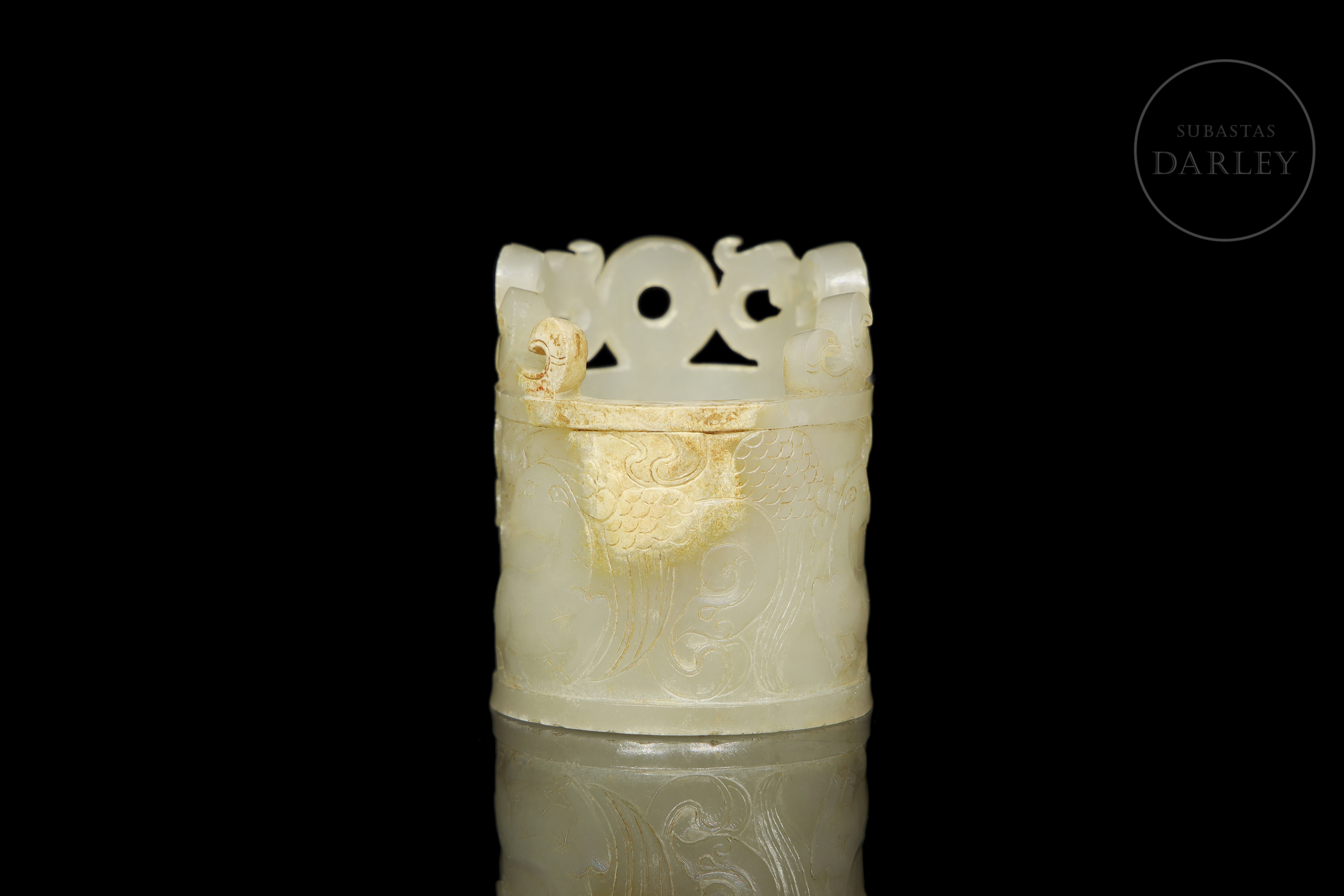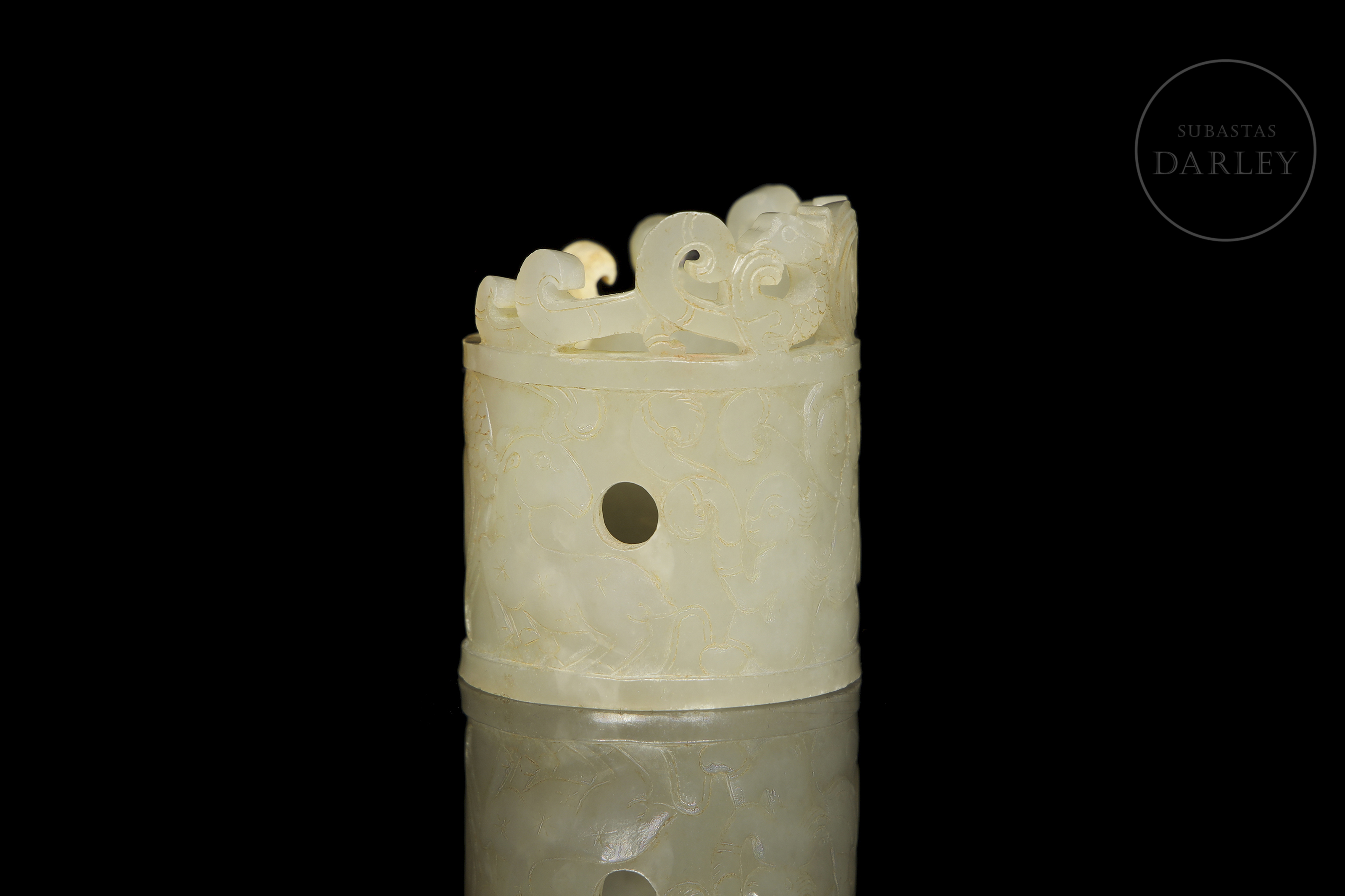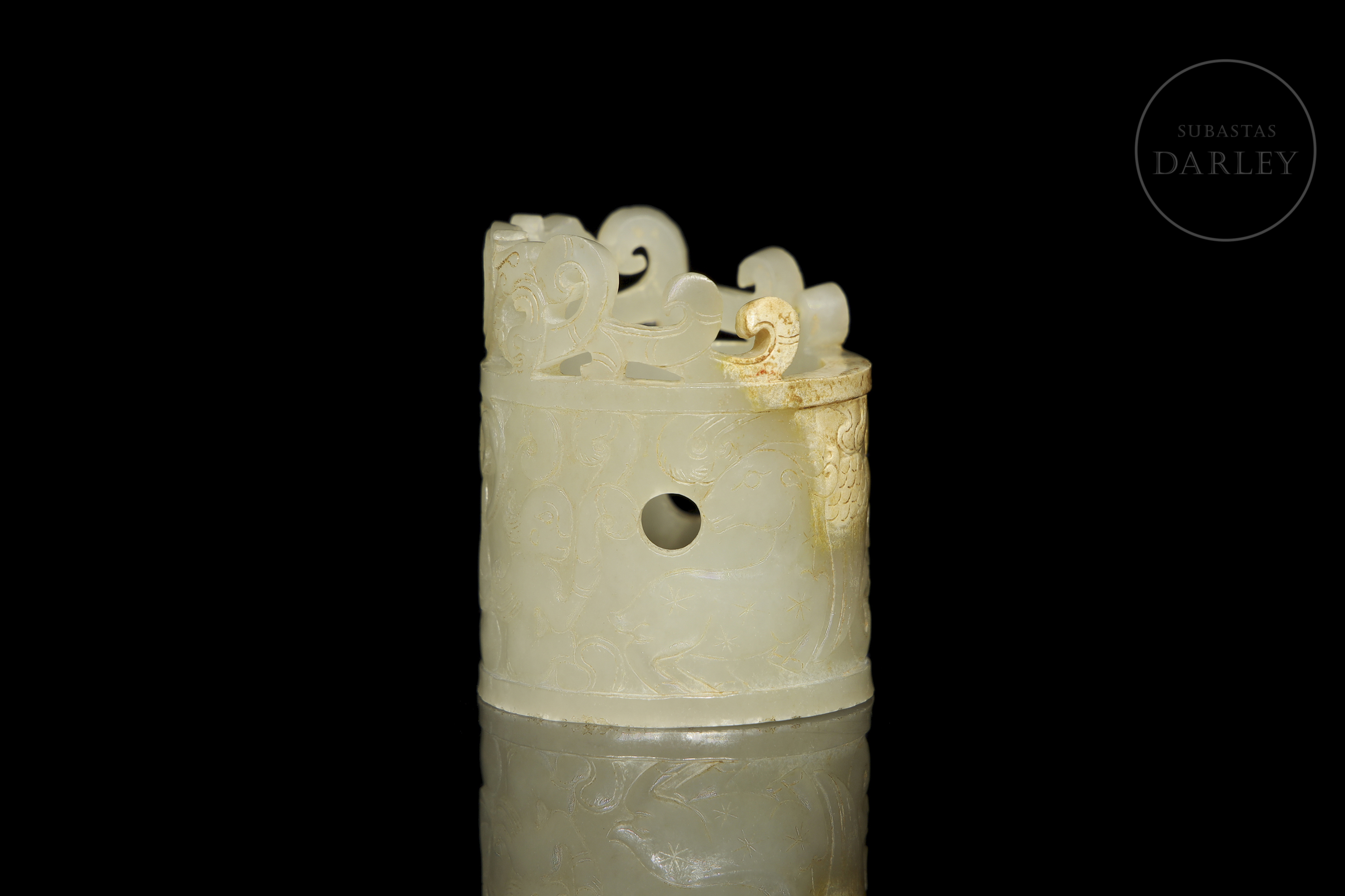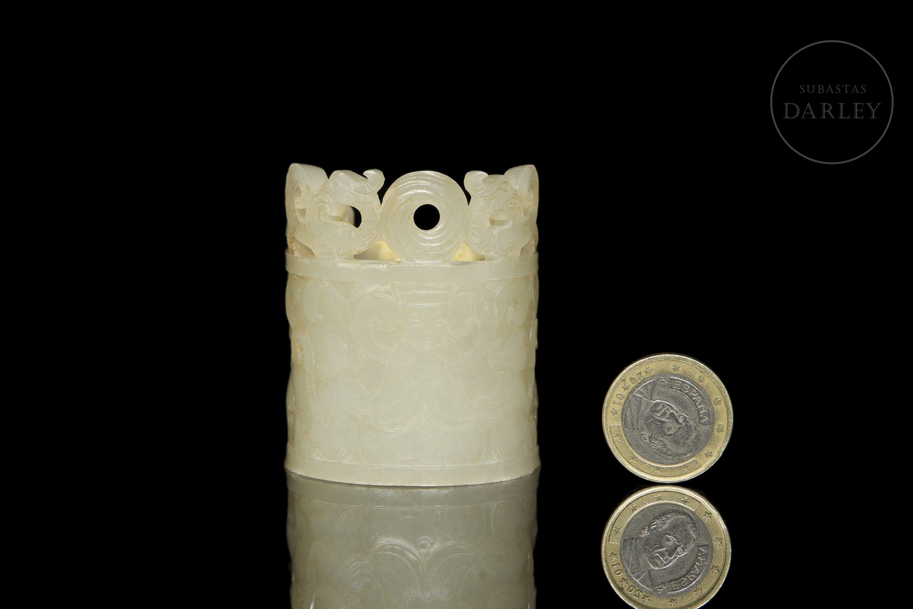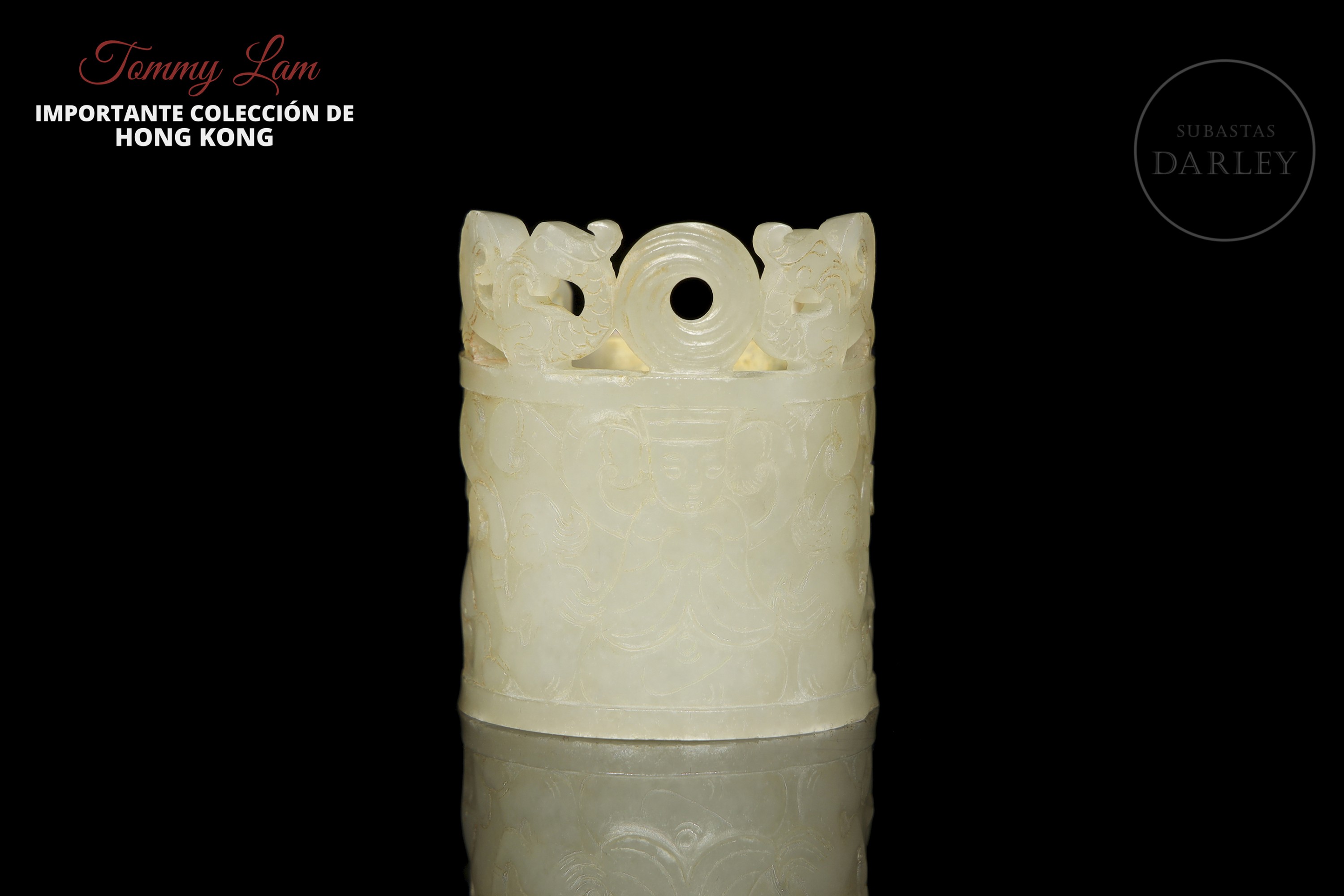 Jade de tonalidad blanca con una sutil pátina de color ocre. La pieza presenta un formato cilíndrico, diseñado para ser insertado en un tocado. Destaca por su profusa decoración en bajorrelieve: el cuerpo central está cubierto por deidades rodeadas de animales mitológicos entrelazados en un diseño de volutas. El borde superior exhibe una cresta con elementos calados de bestias. Dinastía Han Occidental (206 a.C. – 9 d.C.) o posterior.