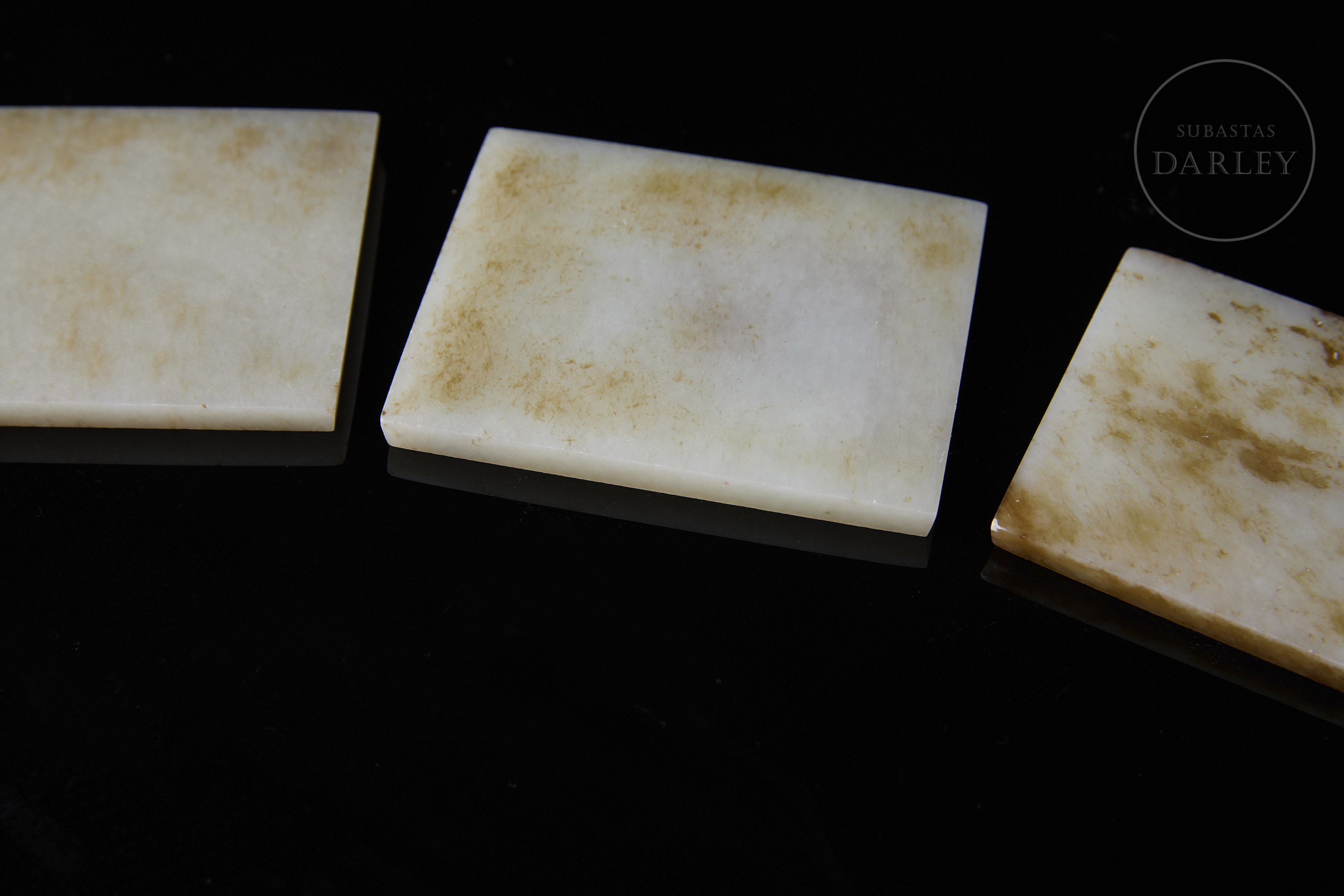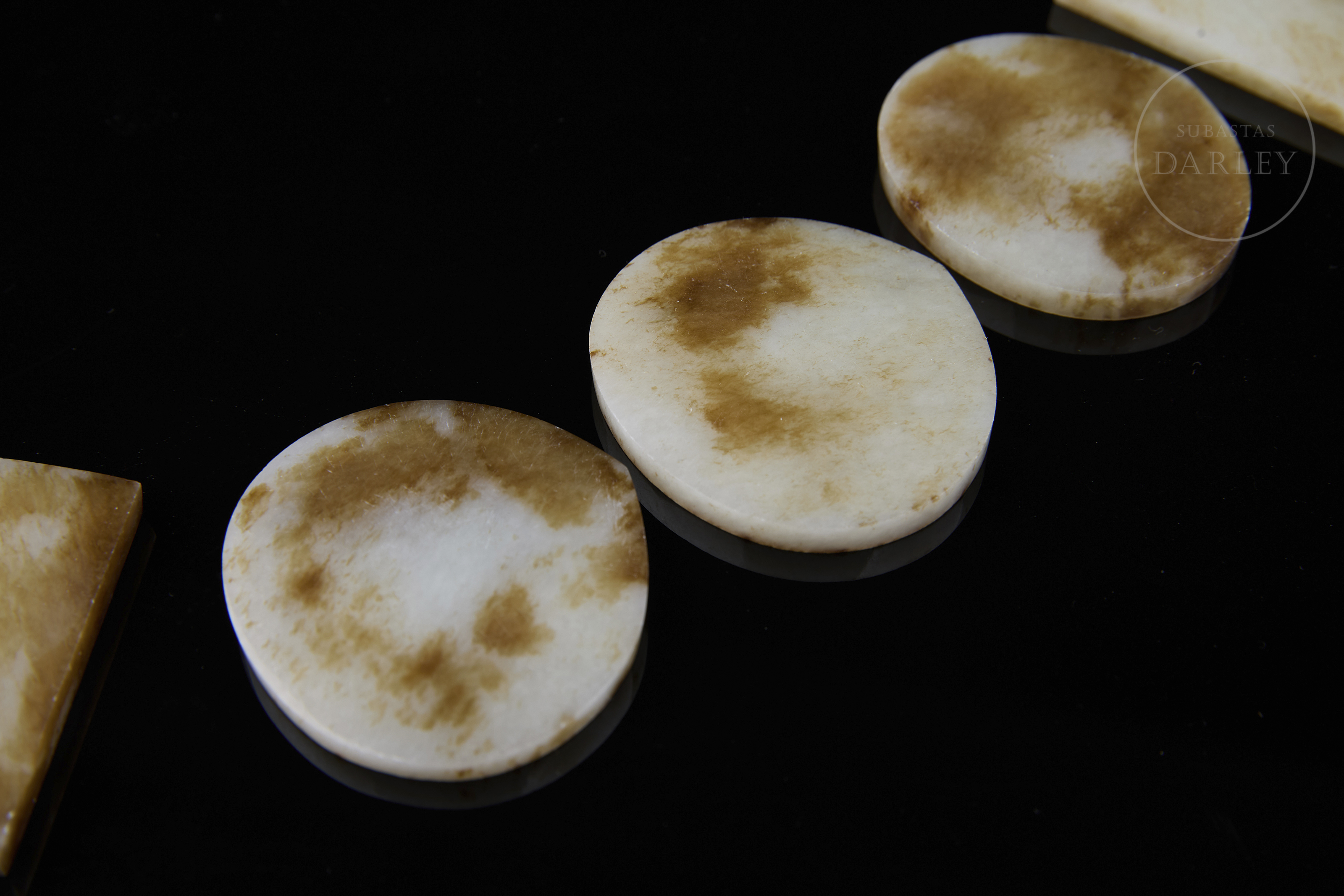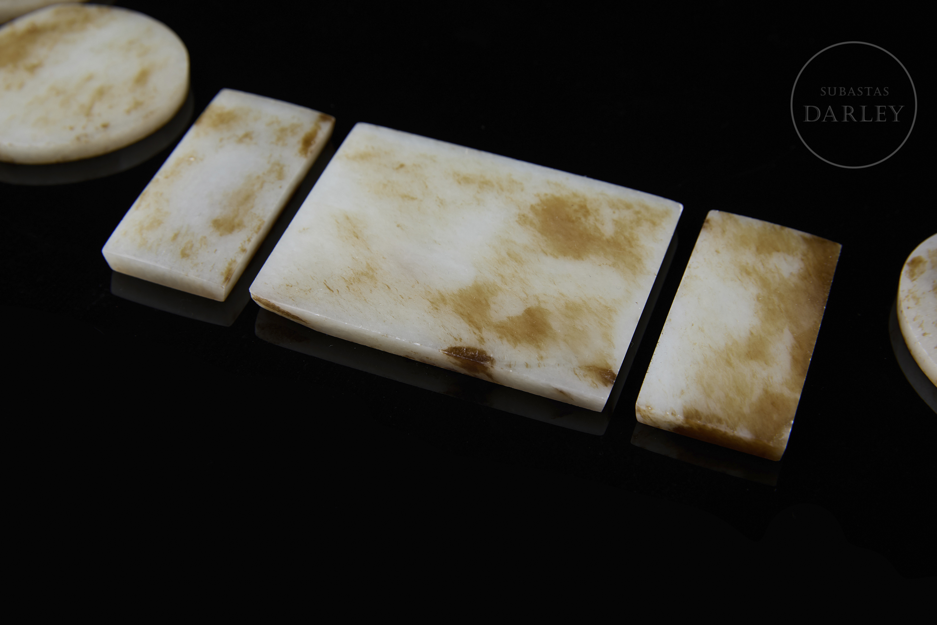 Conjunto de 20 placas de jade tallado de color blanco cremoso con marcadas vetas e inclusiones de color marrón rojizo y ocre. Se trata de finos adornos para cinturón de diversas formas modulares (rectangulares, cuadradas y circulares/ovaladas), todas lisas, sin decoración tallada, resaltando el color natural de la piedra. Presentan múltiples perforaciones en los bordes y las esquinas para su sujeción. Dinastía Ming (1368-1644).