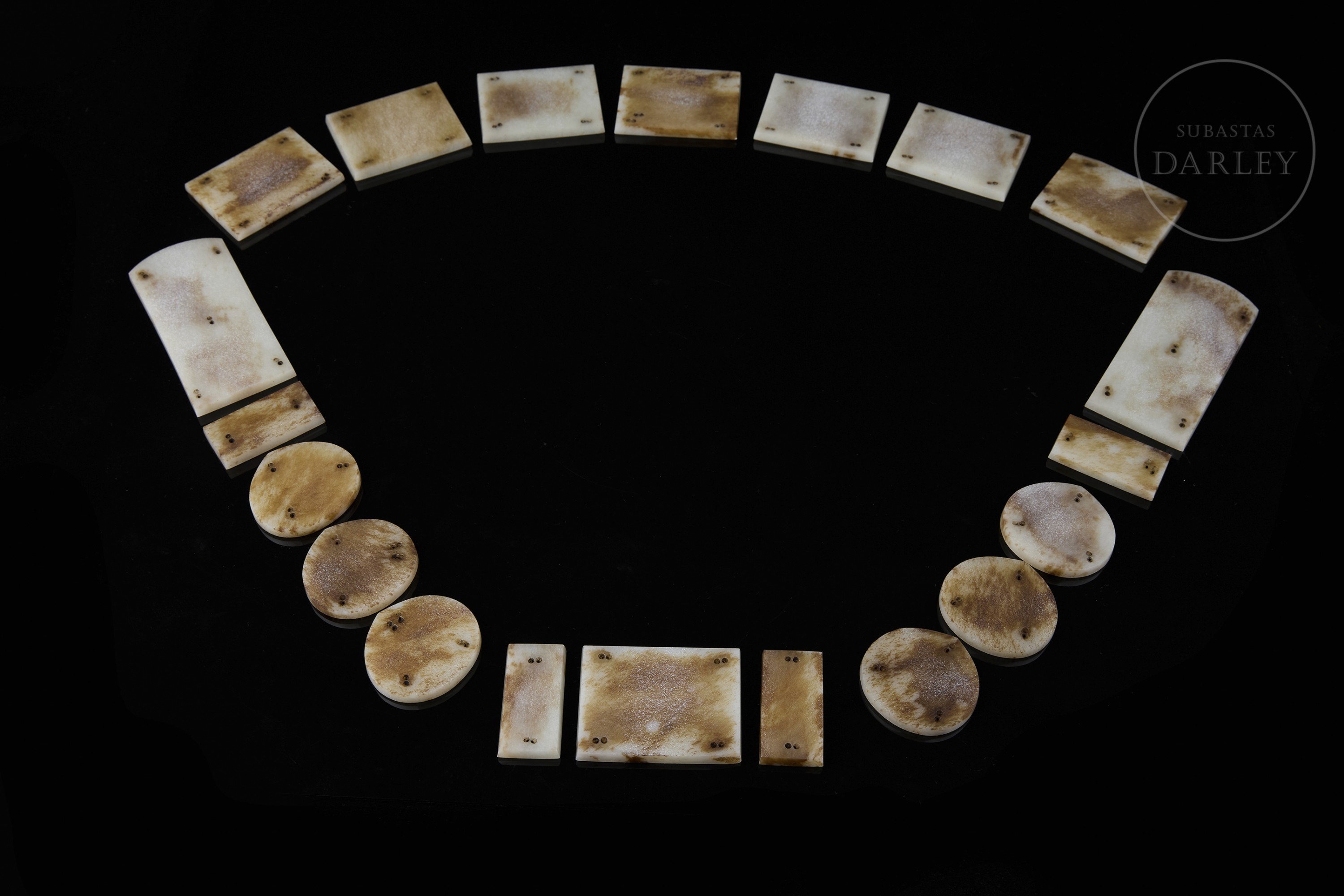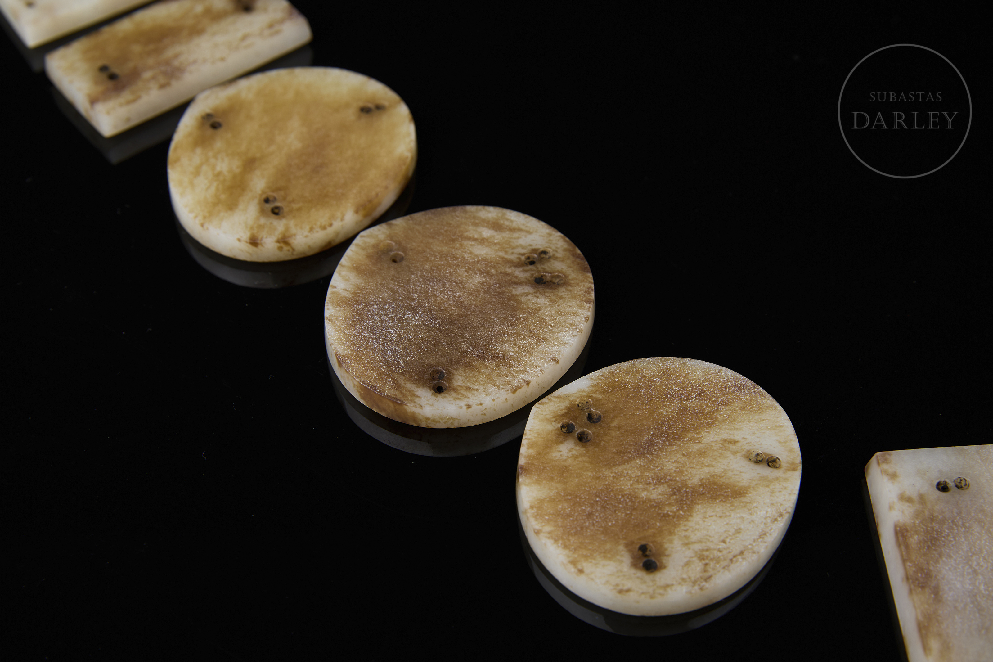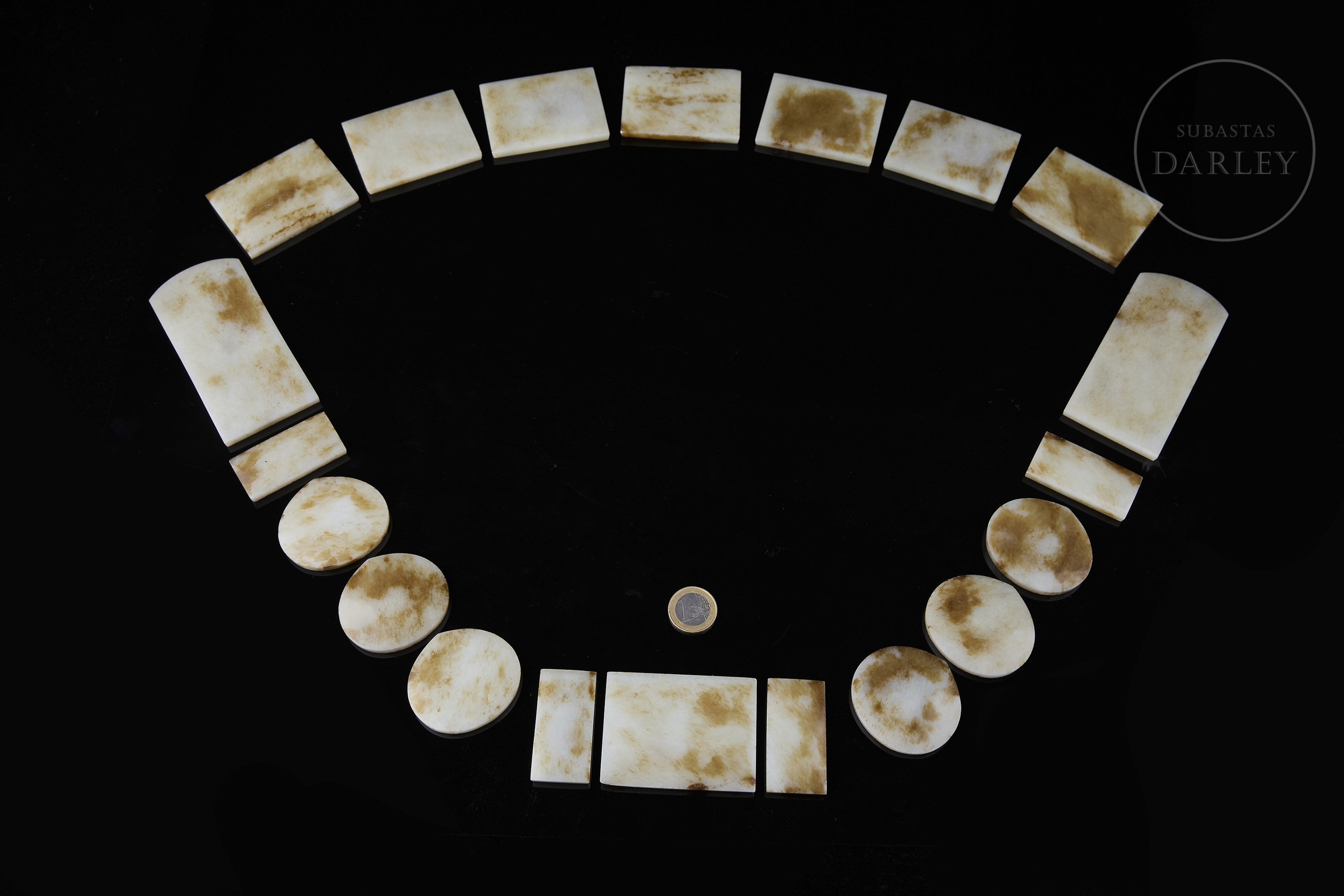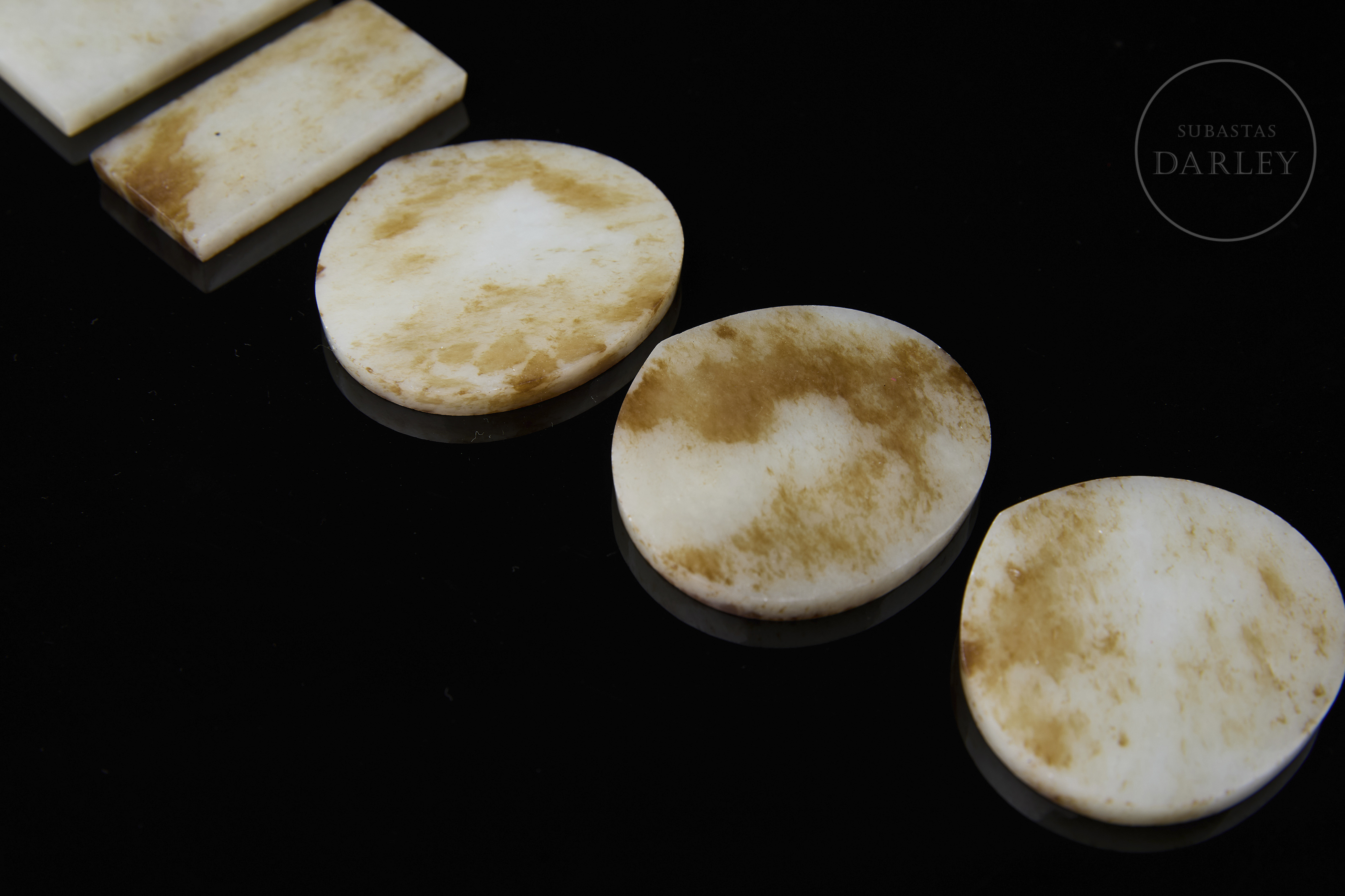 Conjunto de 20 placas de jade tallado de color blanco cremoso con marcadas vetas e inclusiones de color marrón rojizo y ocre. Se trata de finos adornos para cinturón de diversas formas modulares (rectangulares, cuadradas y circulares/ovaladas), todas lisas, sin decoración tallada, resaltando el color natural de la piedra. Presentan múltiples perforaciones en los bordes y las esquinas para su sujeción. Dinastía Ming (1368-1644).