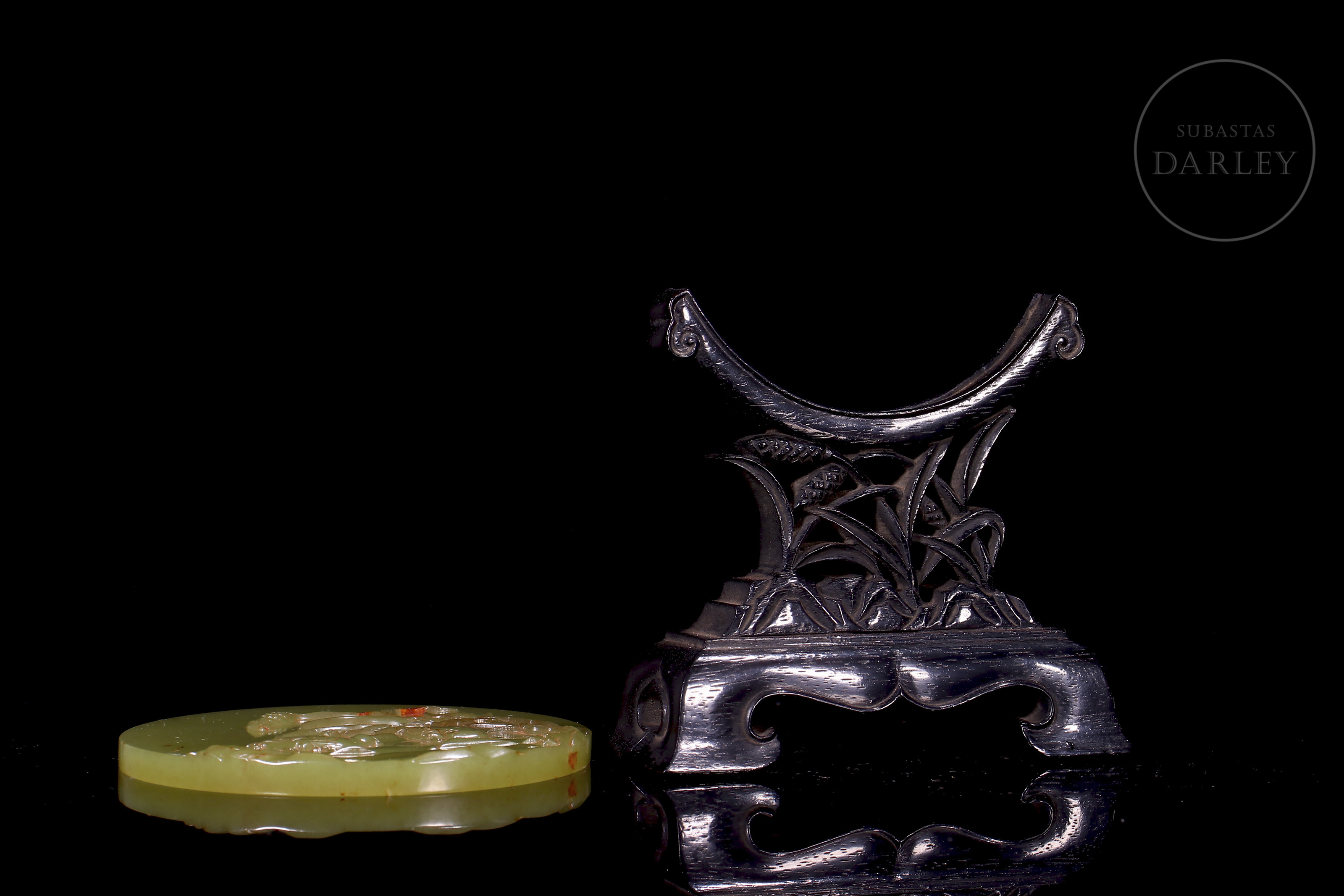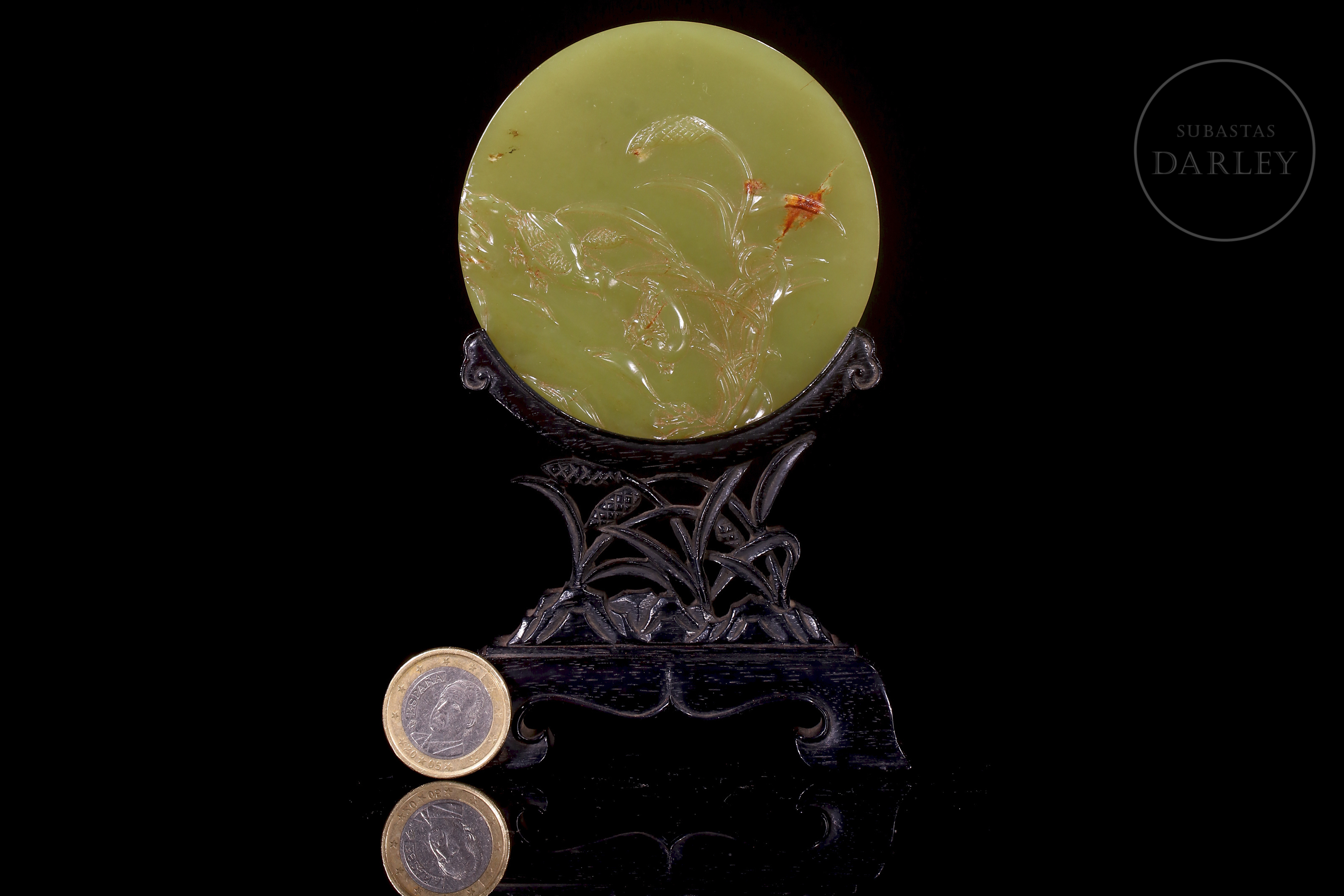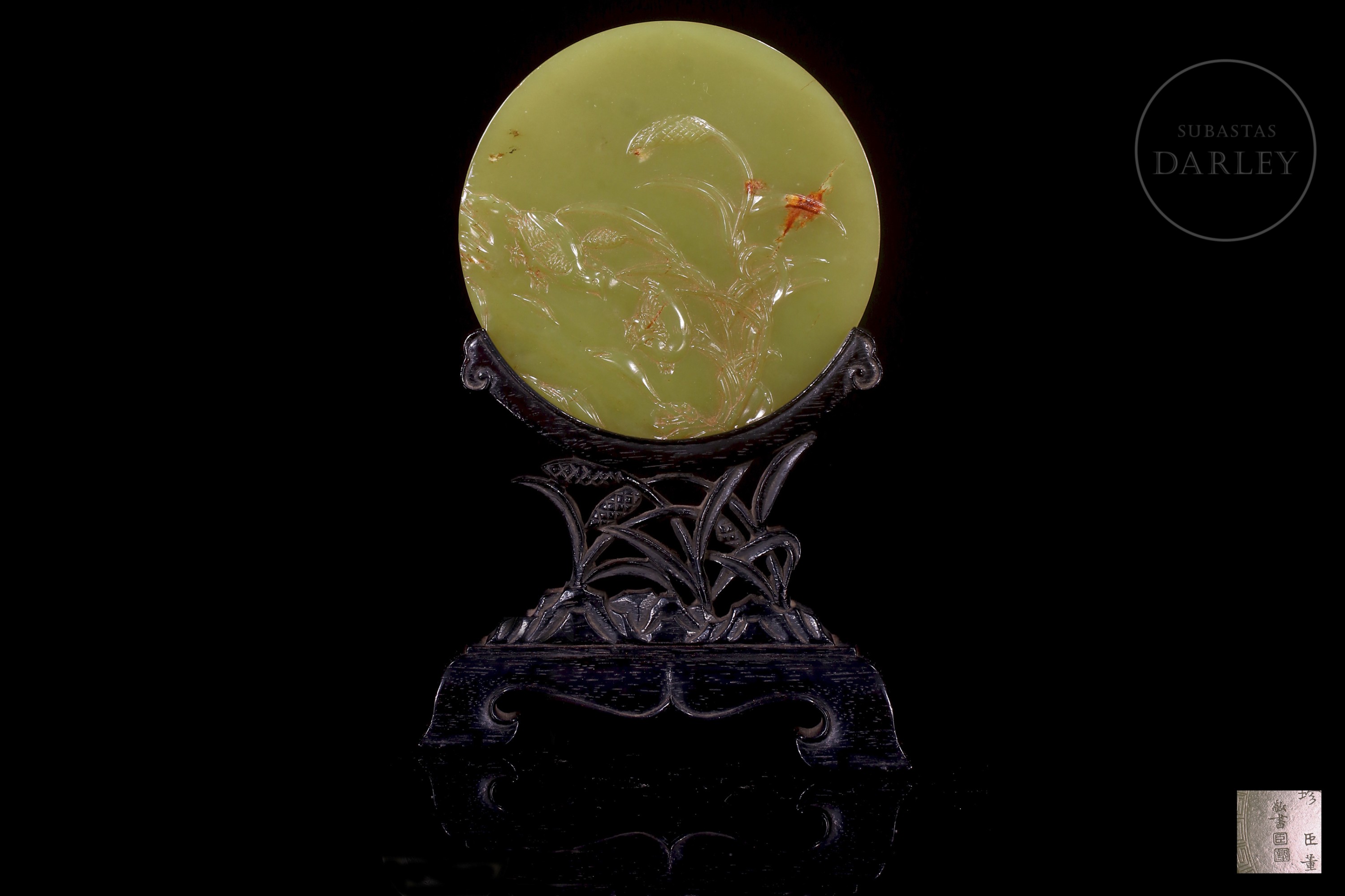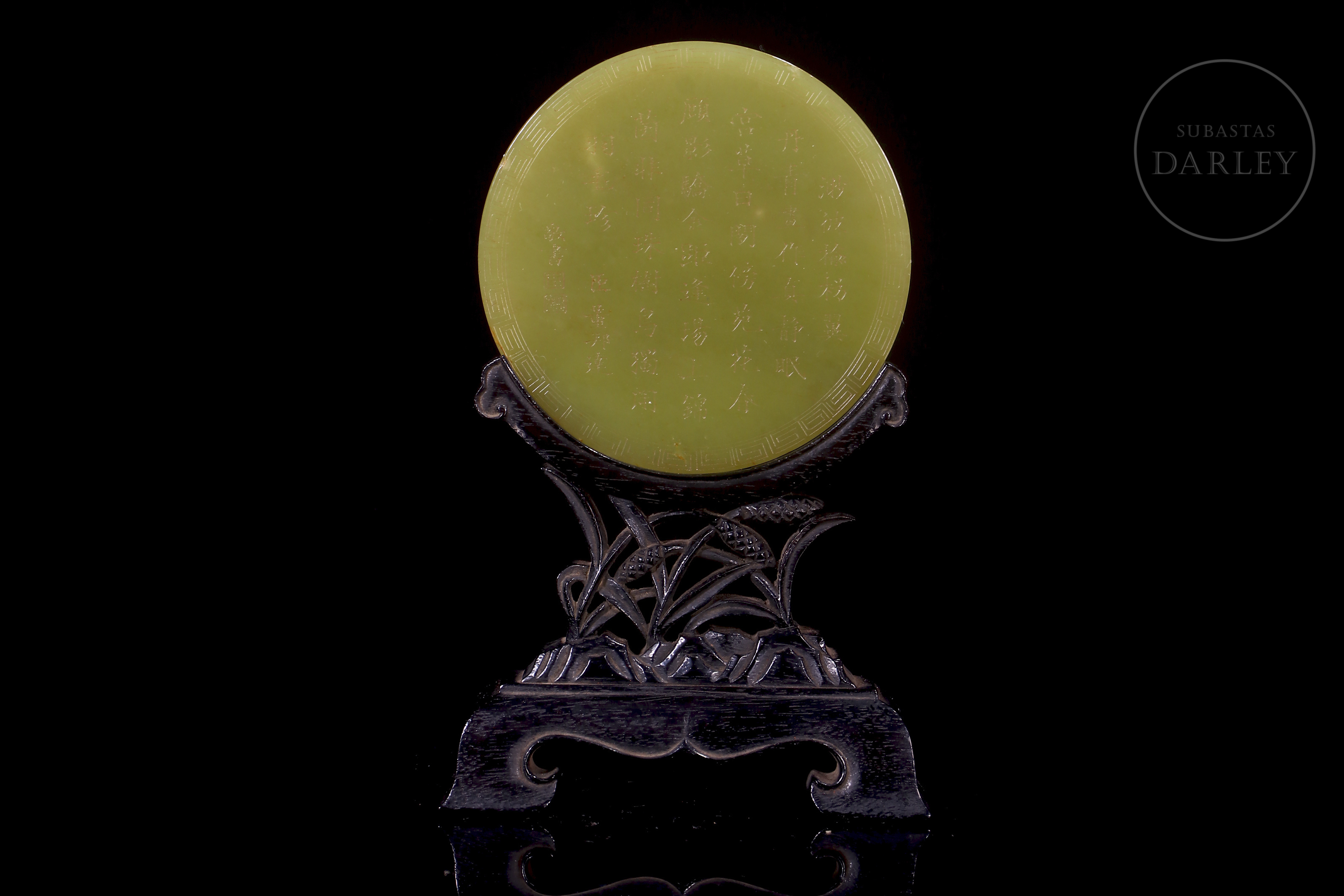 Panel circular realizado en jade amarillo de Hetian, con delicadas vetas rojizas naturales. En el anverso se aprecia una escena en relieve de gran detalle, con dos aves en un entorno vegetal de hojas y flores. En el reverso se encuentra un poema caligráfico inscrito, dispuesto en columnas verticales y enmarcado por una cenefa de greca continua. La pieza se dispone sobre soporte de madera finamente tallada con motivos vegetales entrelazados.