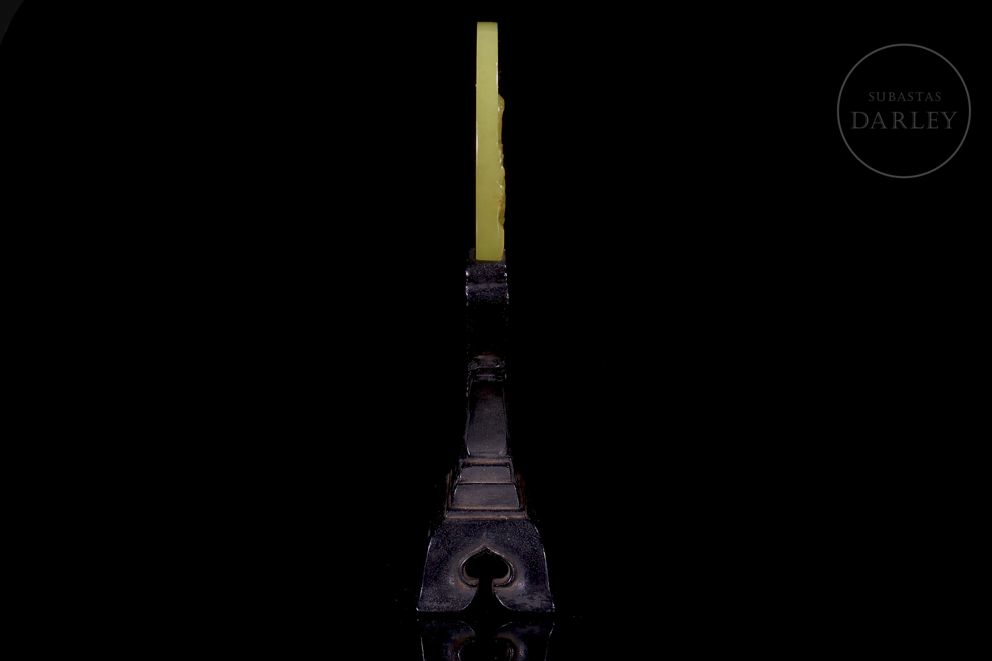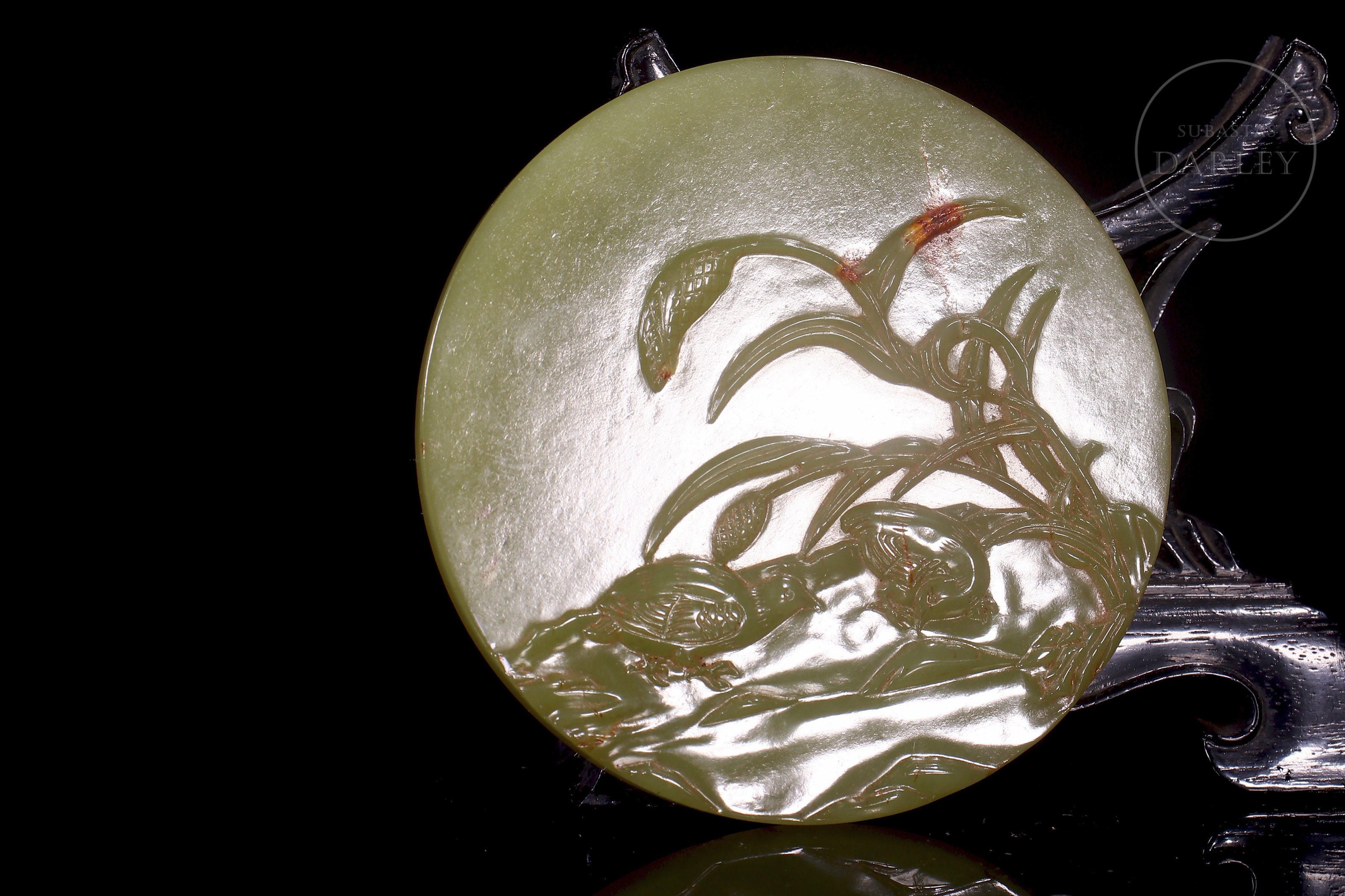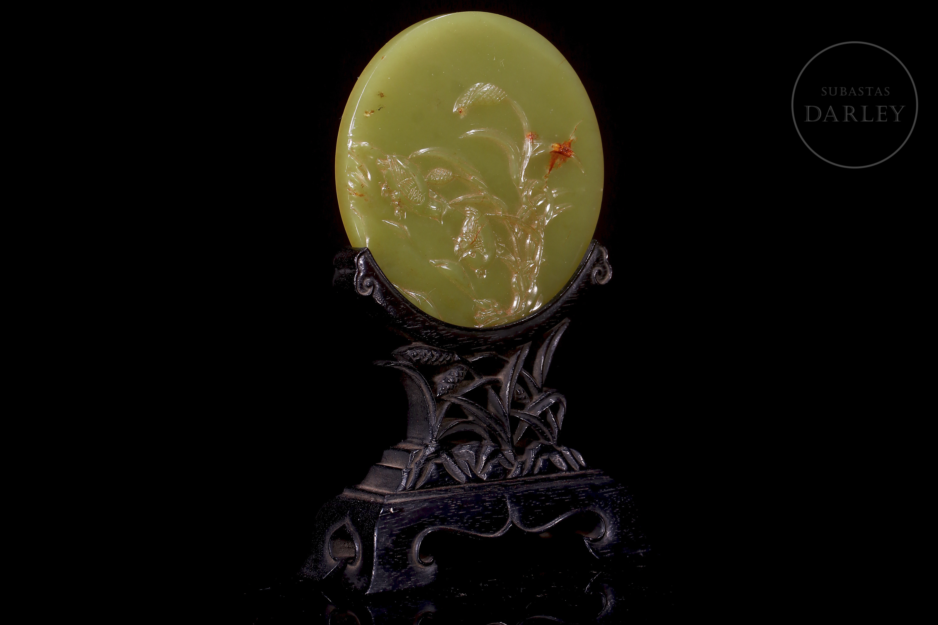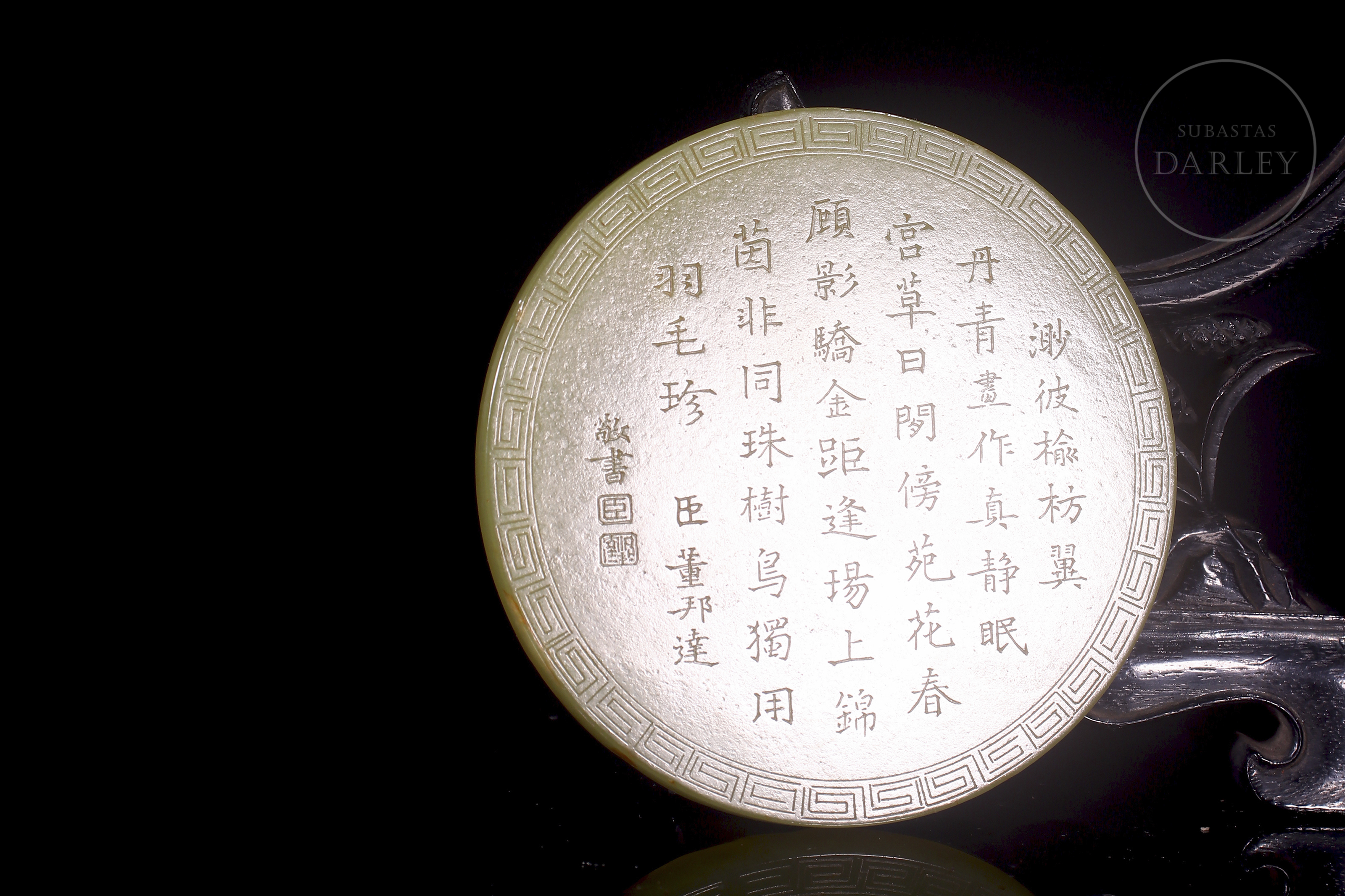 Panel circular realizado en jade amarillo de Hetian, con delicadas vetas rojizas naturales. En el anverso se aprecia una escena en relieve de gran detalle, con dos aves en un entorno vegetal de hojas y flores. En el reverso se encuentra un poema caligráfico inscrito, dispuesto en columnas verticales y enmarcado por una cenefa de greca continua. La pieza se dispone sobre soporte de madera finamente tallada con motivos vegetales entrelazados.