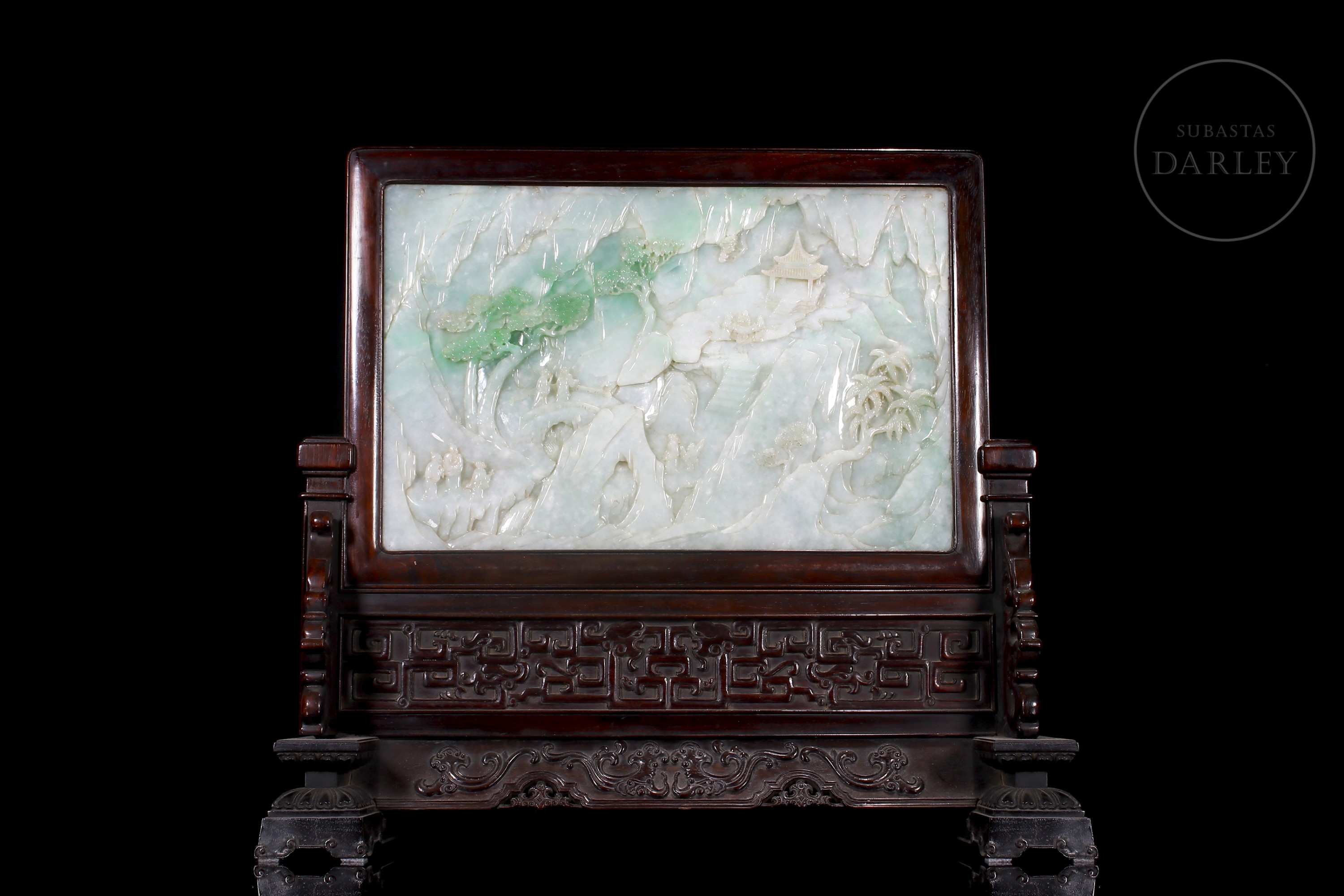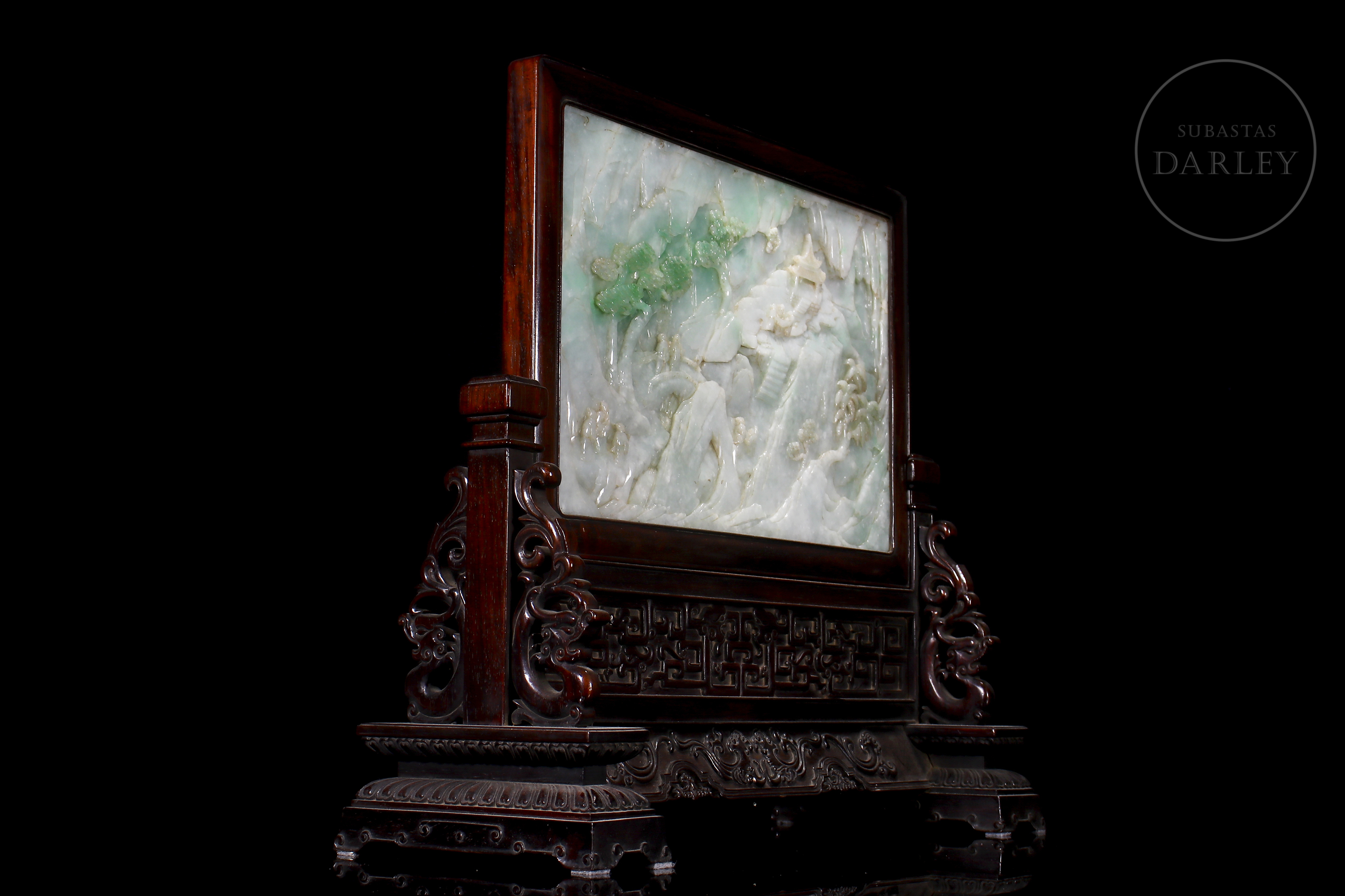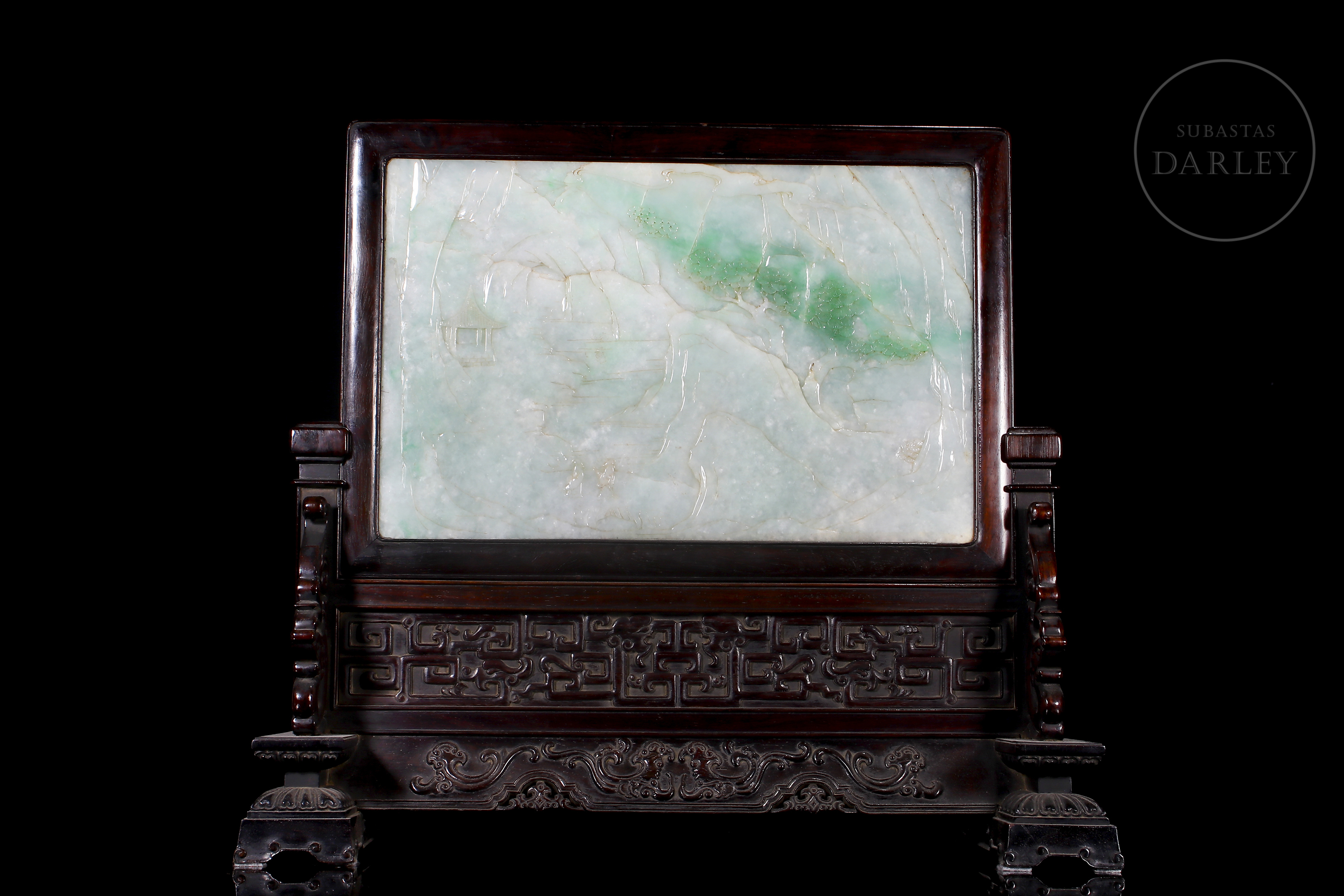 Gran placa de jadeíta de una tonalidad verde pálido con vibrantes manchas de color esmeralda y zonas lavanda. La pieza presenta un formato de pantalla de escritorio o pingfeng, donde la placa de jadeíta se inserta en un marco de madera oscura finamente tallada. La superficie de la gema se muestra adornada con una profusa talla en relieve que representa un paisaje de montaña, con pagodas ocultas entre pinos centenarios, puentes que cruzan ríos sinuosos y figuras de sabios que recorren los senderos rocosos. Dinastía Qing (1644–1911).