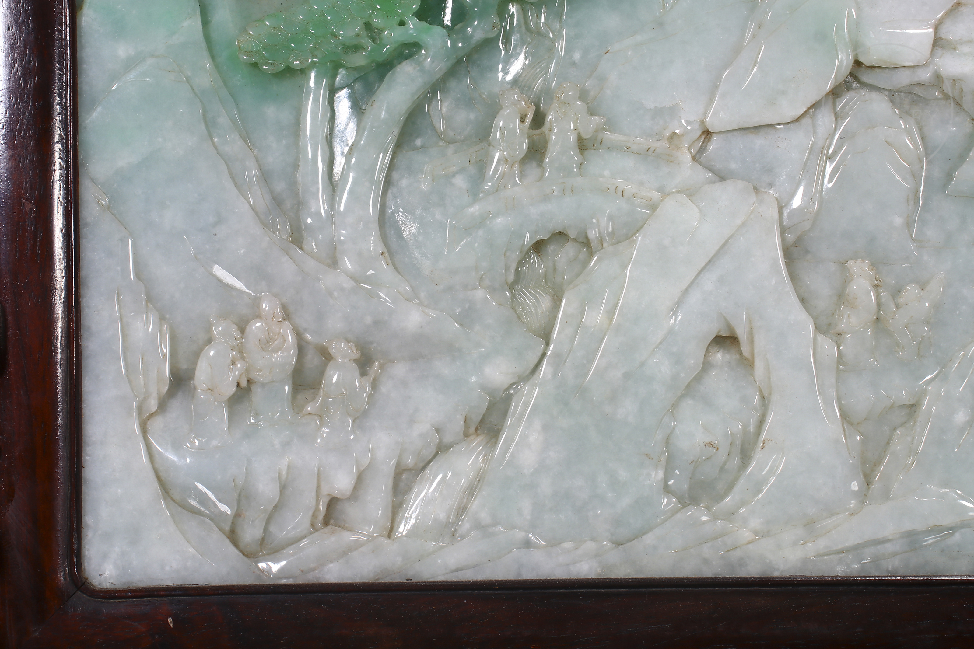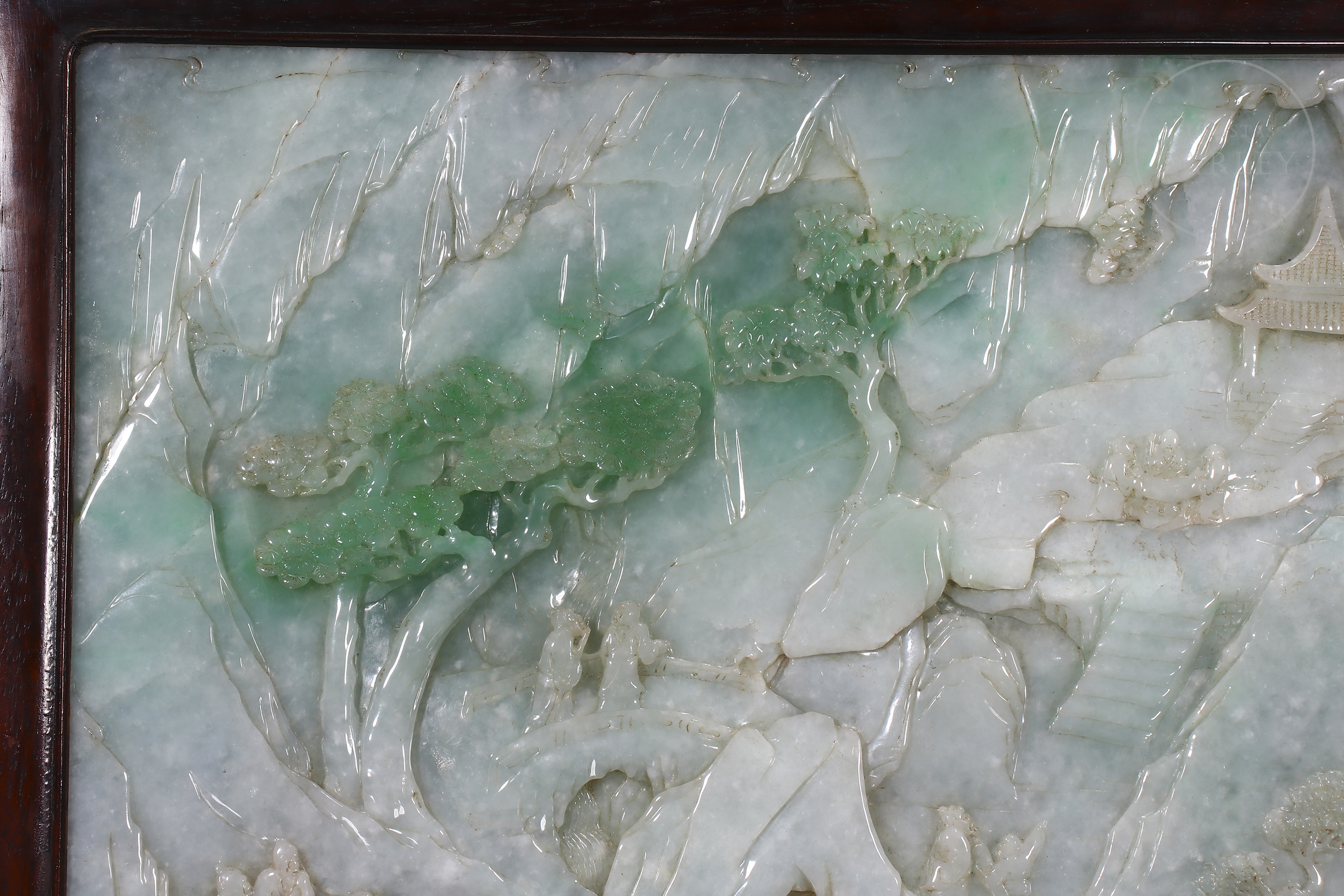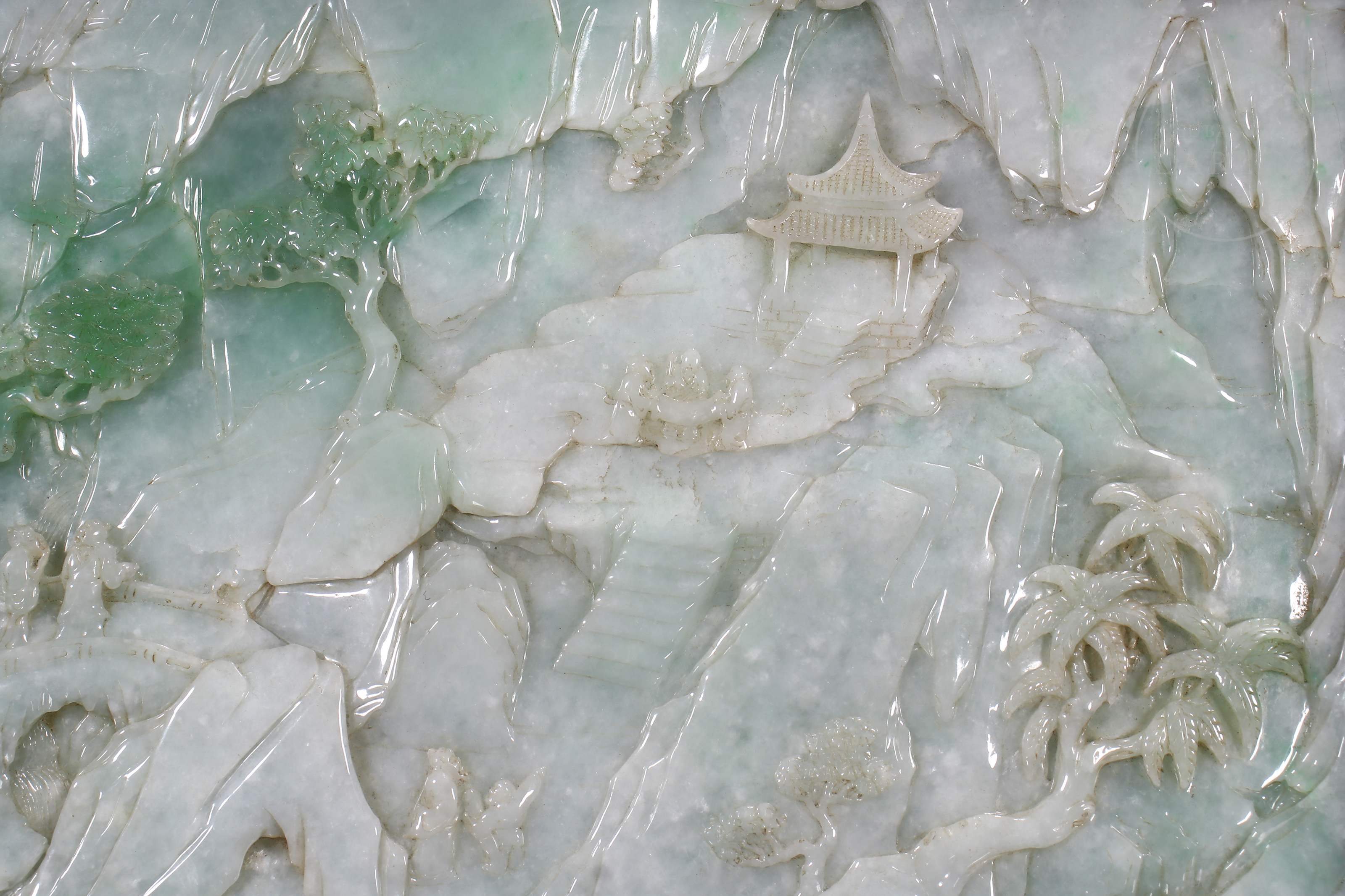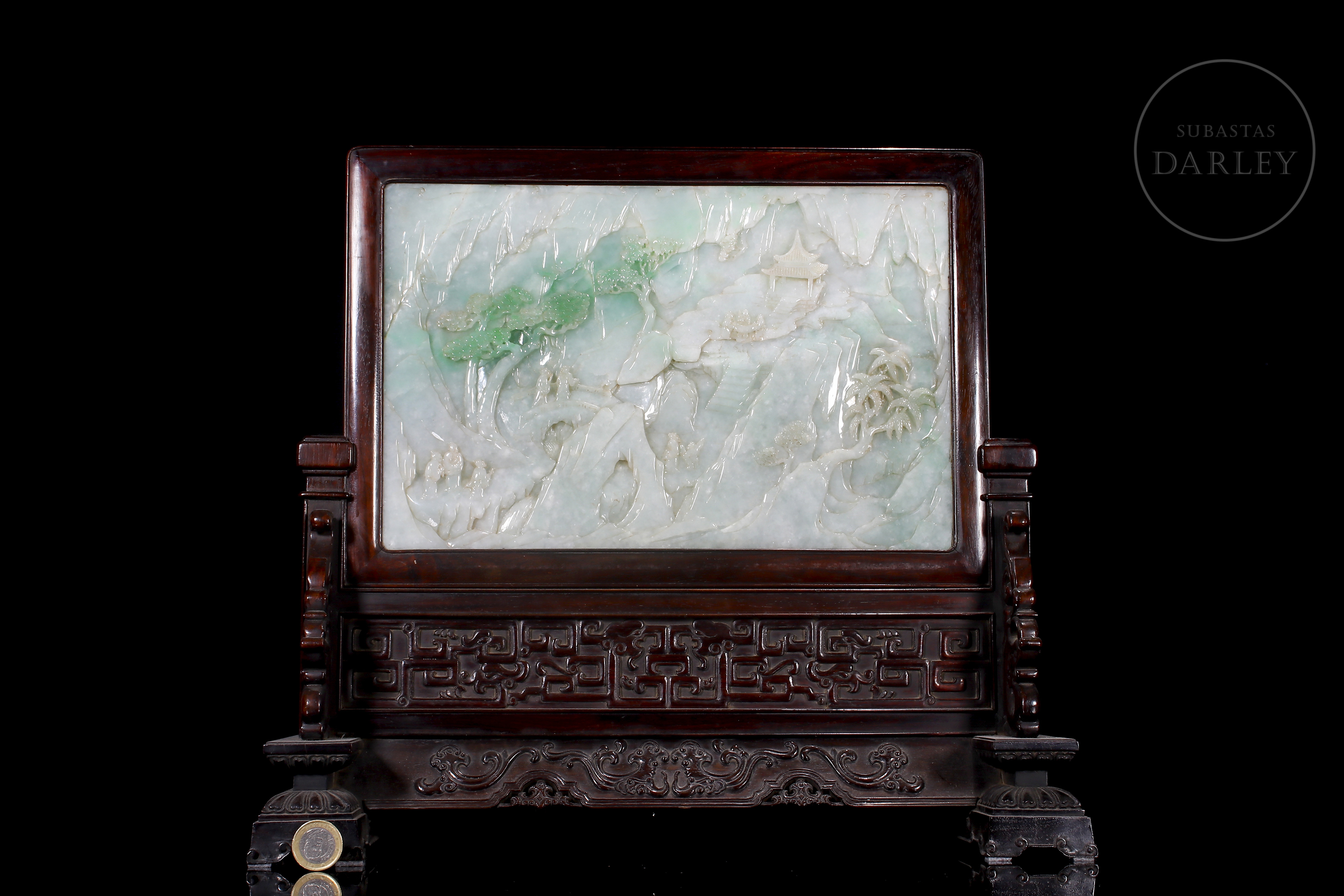 Gran placa de jadeíta de una tonalidad verde pálido con vibrantes manchas de color esmeralda y zonas lavanda. La pieza presenta un formato de pantalla de escritorio o pingfeng, donde la placa de jadeíta se inserta en un marco de madera oscura finamente tallada. La superficie de la gema se muestra adornada con una profusa talla en relieve que representa un paisaje de montaña, con pagodas ocultas entre pinos centenarios, puentes que cruzan ríos sinuosos y figuras de sabios que recorren los senderos rocosos. Dinastía Qing (1644–1911).