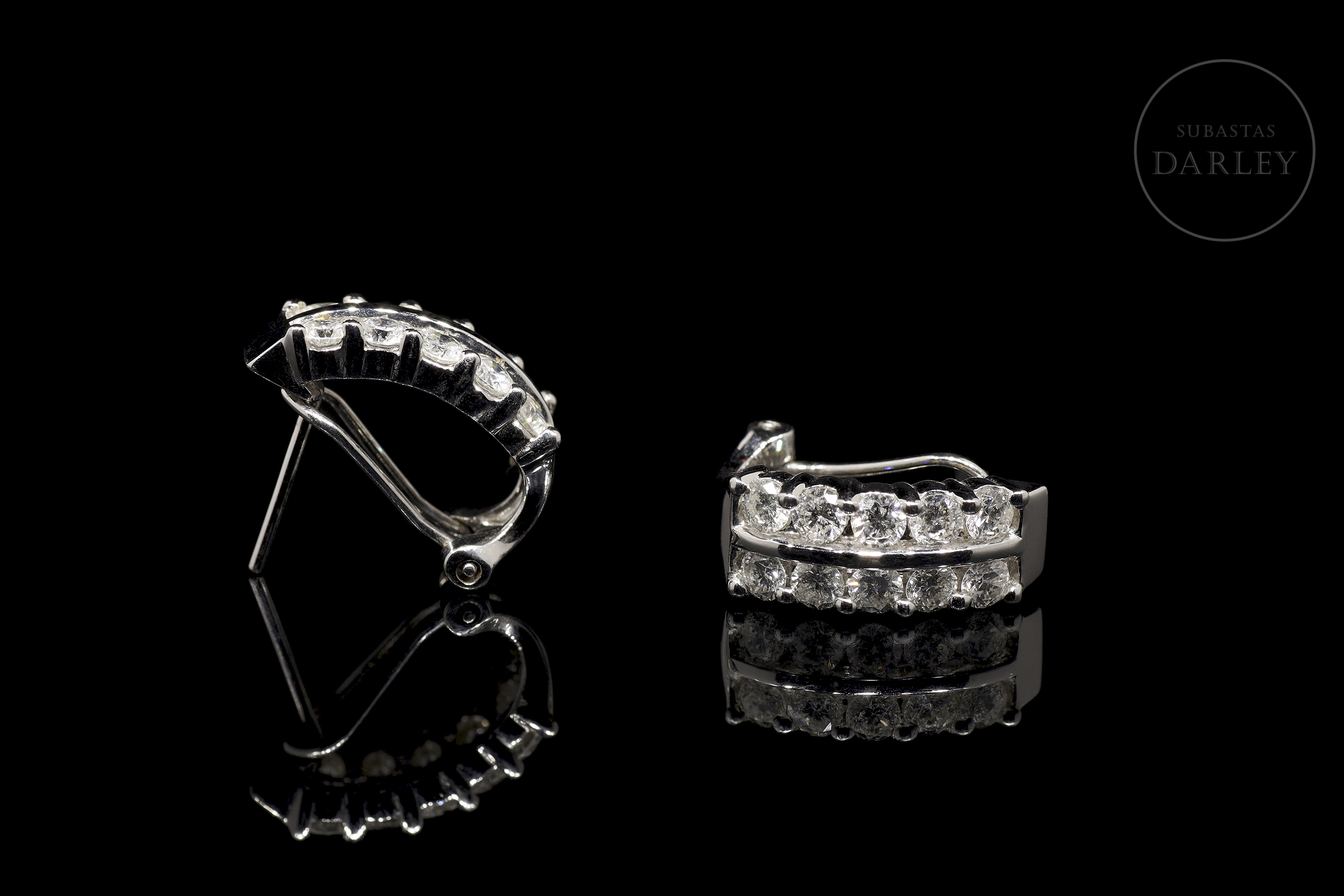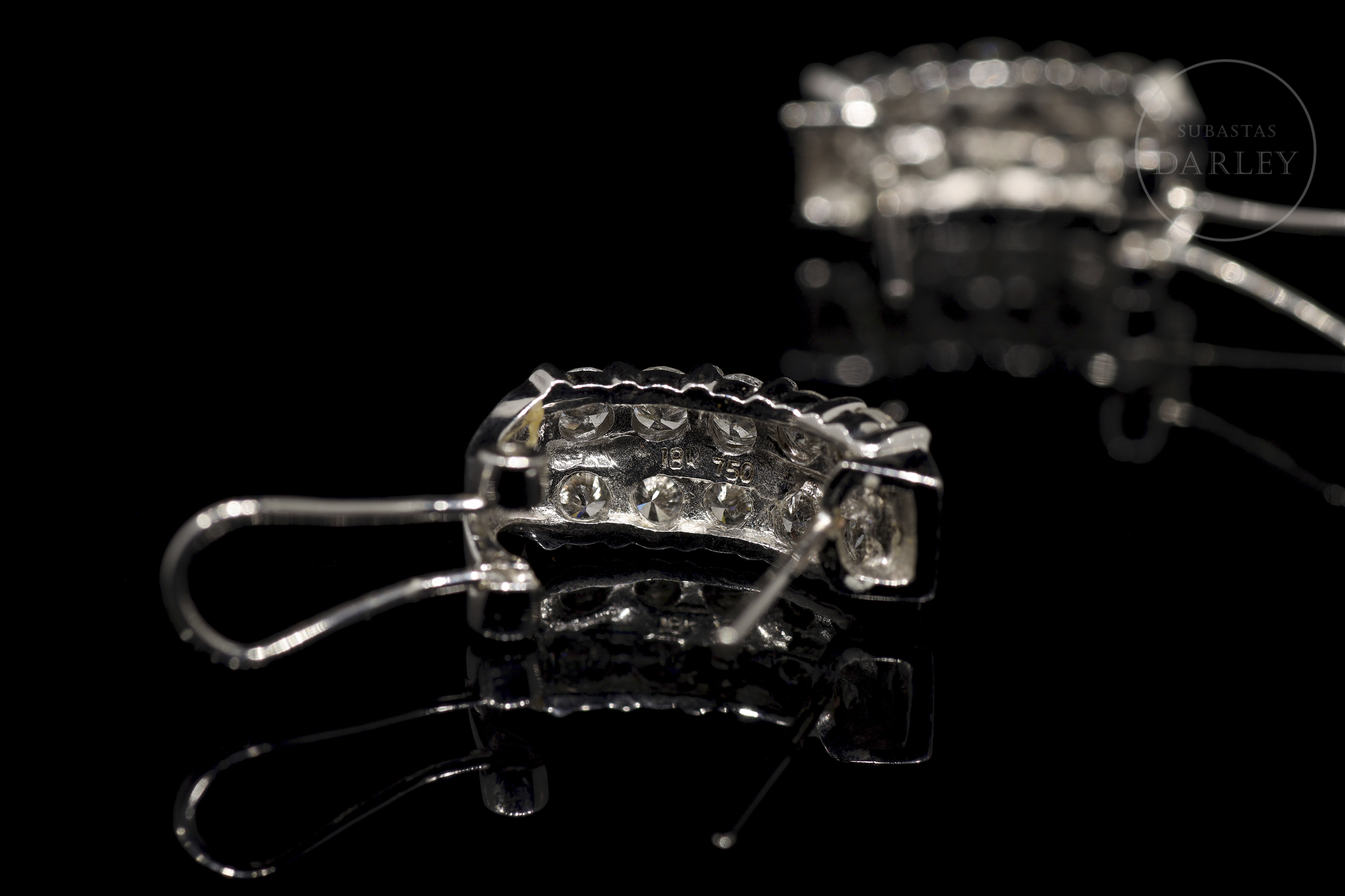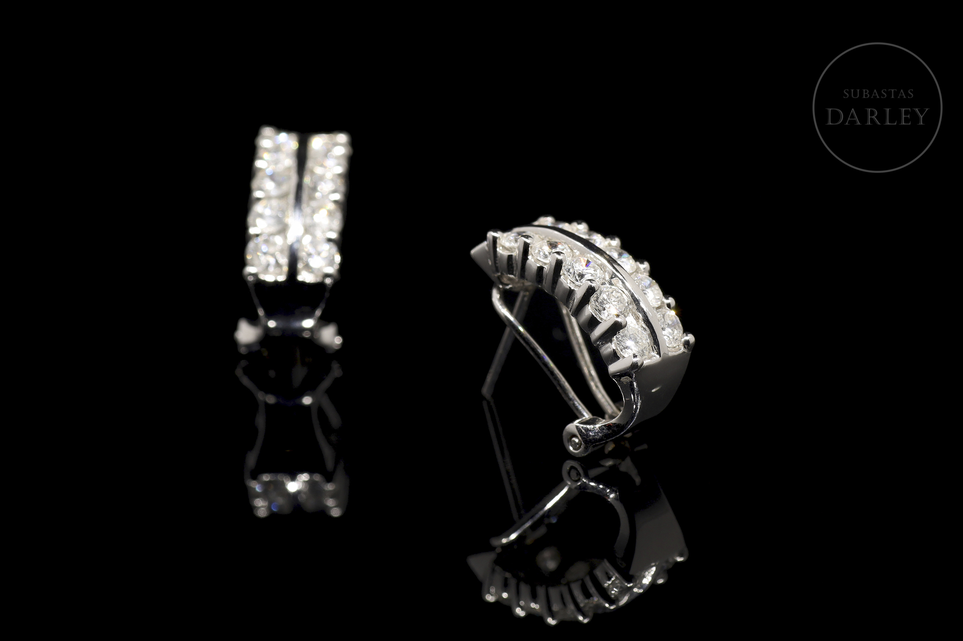 Pendientes de oro blanco de 18k con un frontis compuesto por dos líneas paralelas y verticales, adornadas por 5 diamantes cada una, engastados en garras, talla brillante, de calidad G/H y pureza SI, con un peso total de 1,82 ct. Cierre de pica Omega.