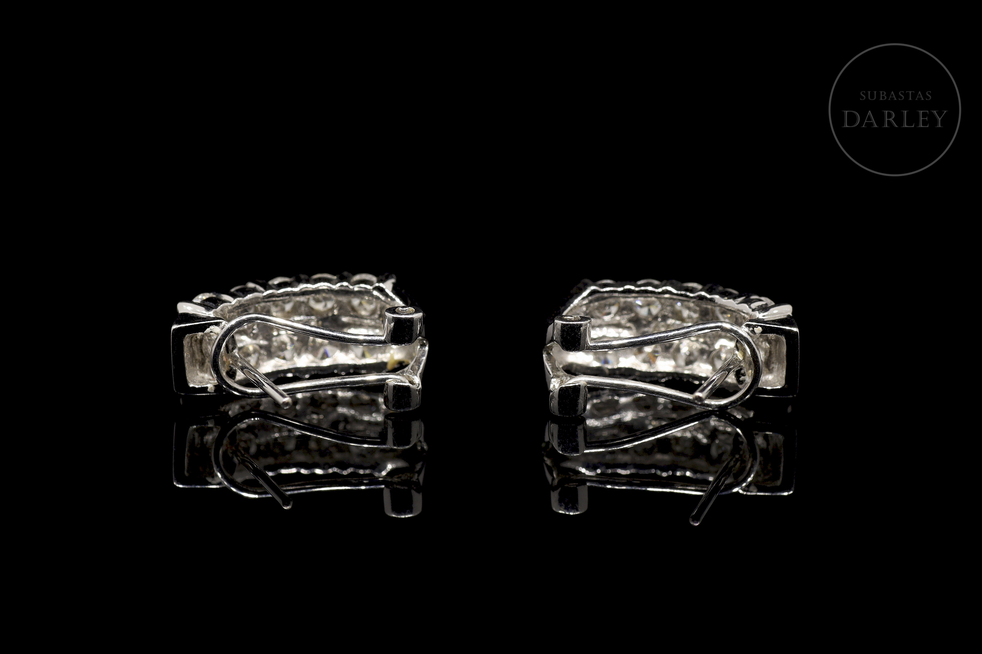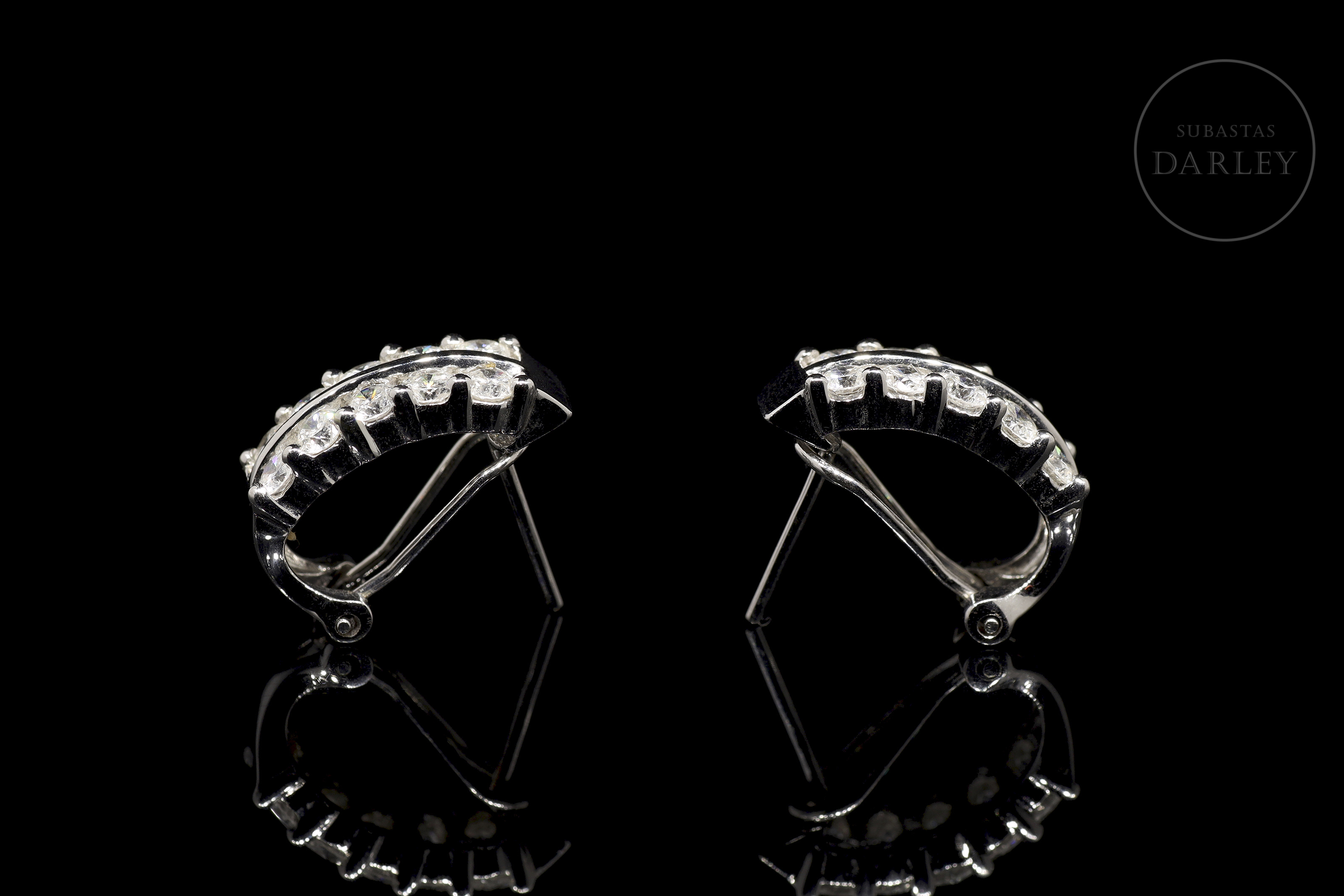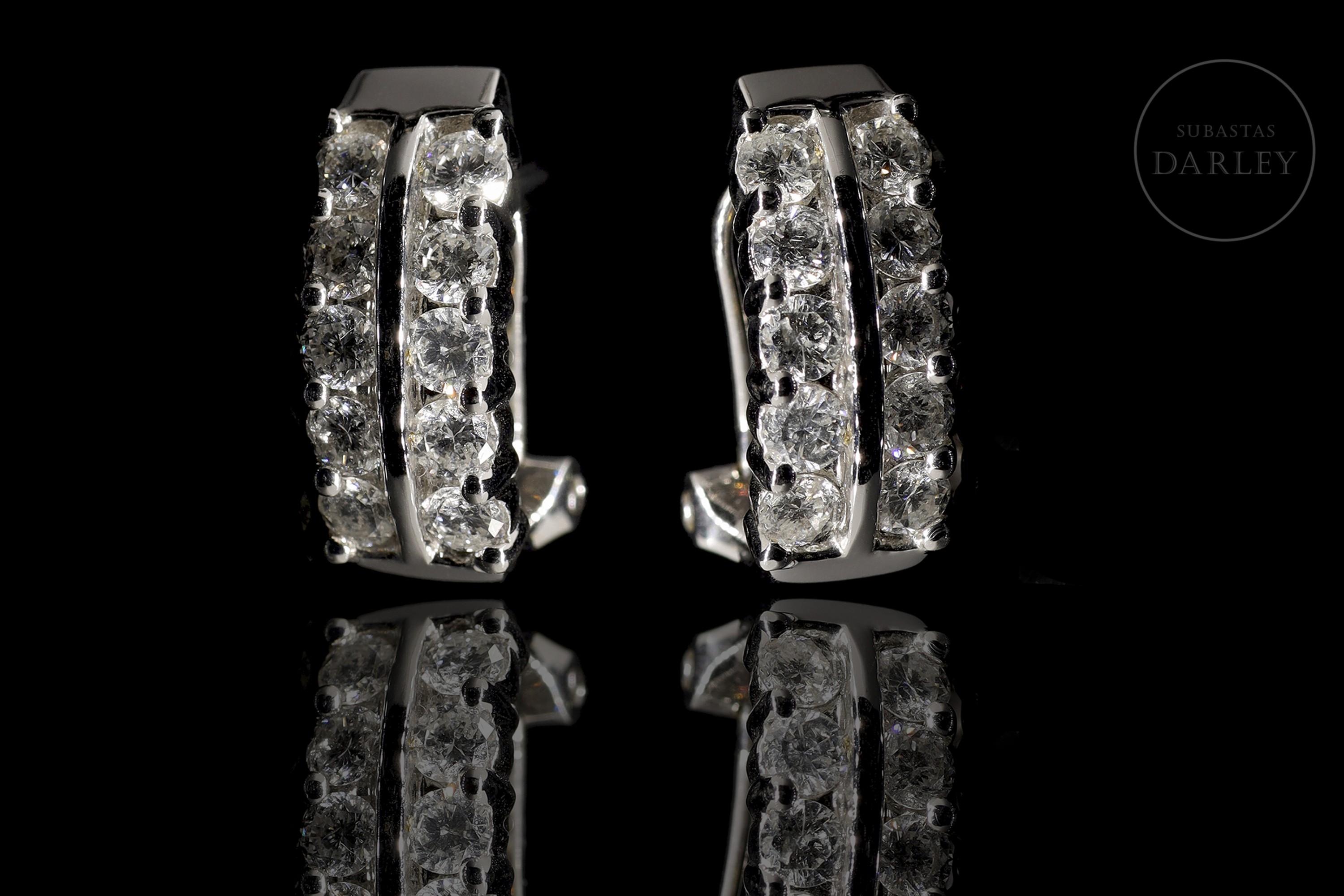 Pendientes de oro blanco de 18k con un frontis compuesto por dos líneas paralelas y verticales, adornadas por 5 diamantes cada una, engastados en garras, talla brillante, de calidad G/H y pureza SI, con un peso total de 1,82 ct. Cierre de pica Omega.