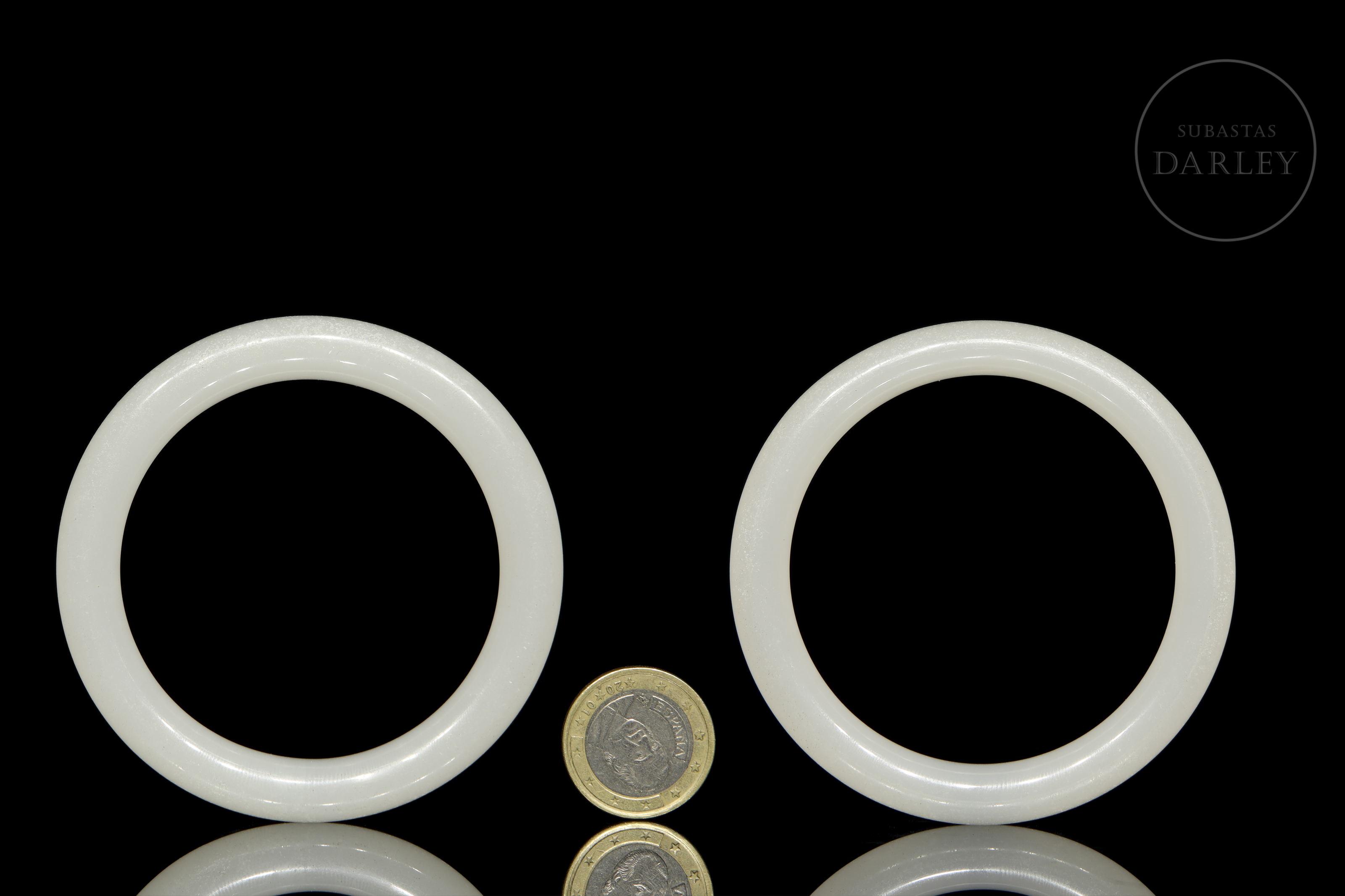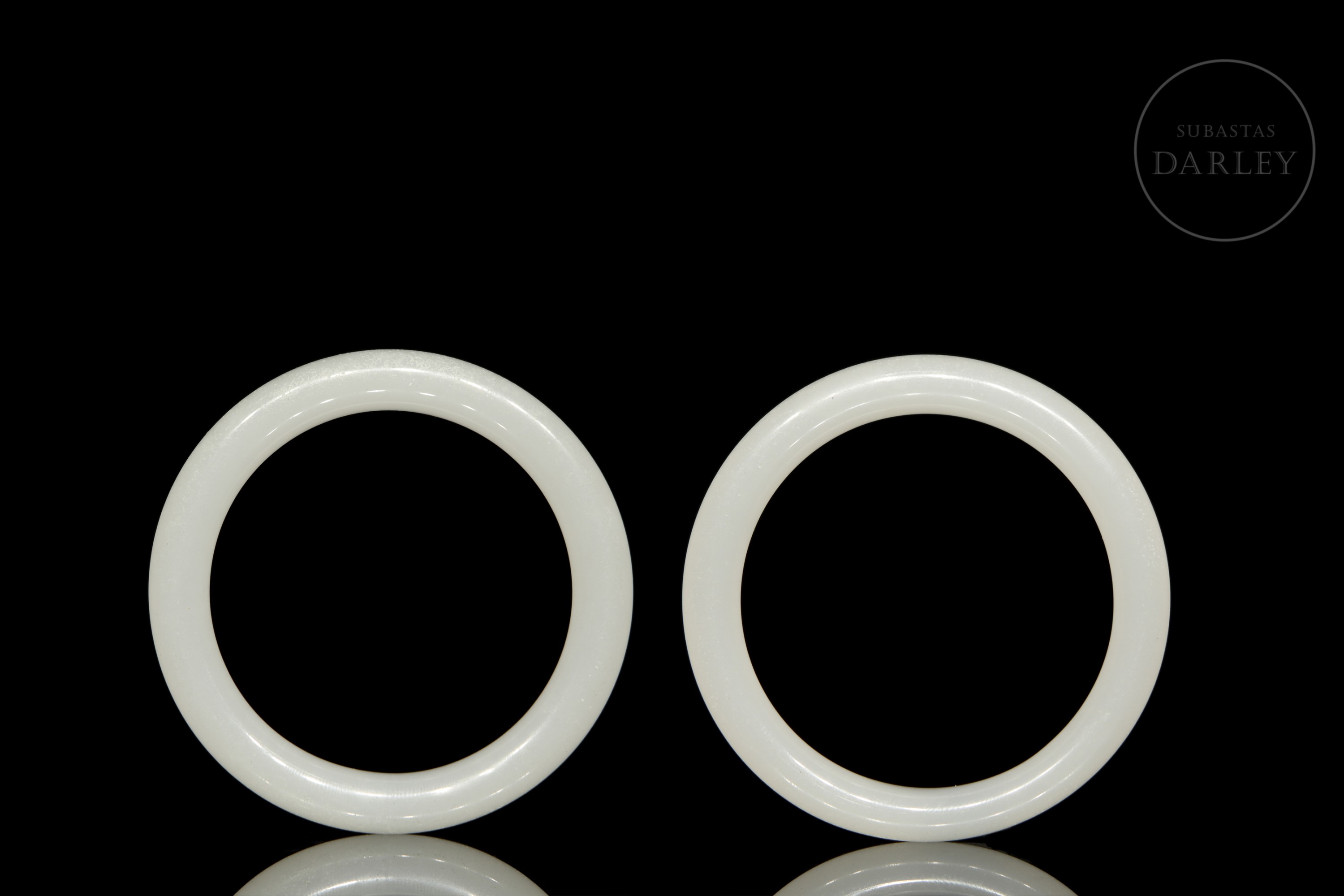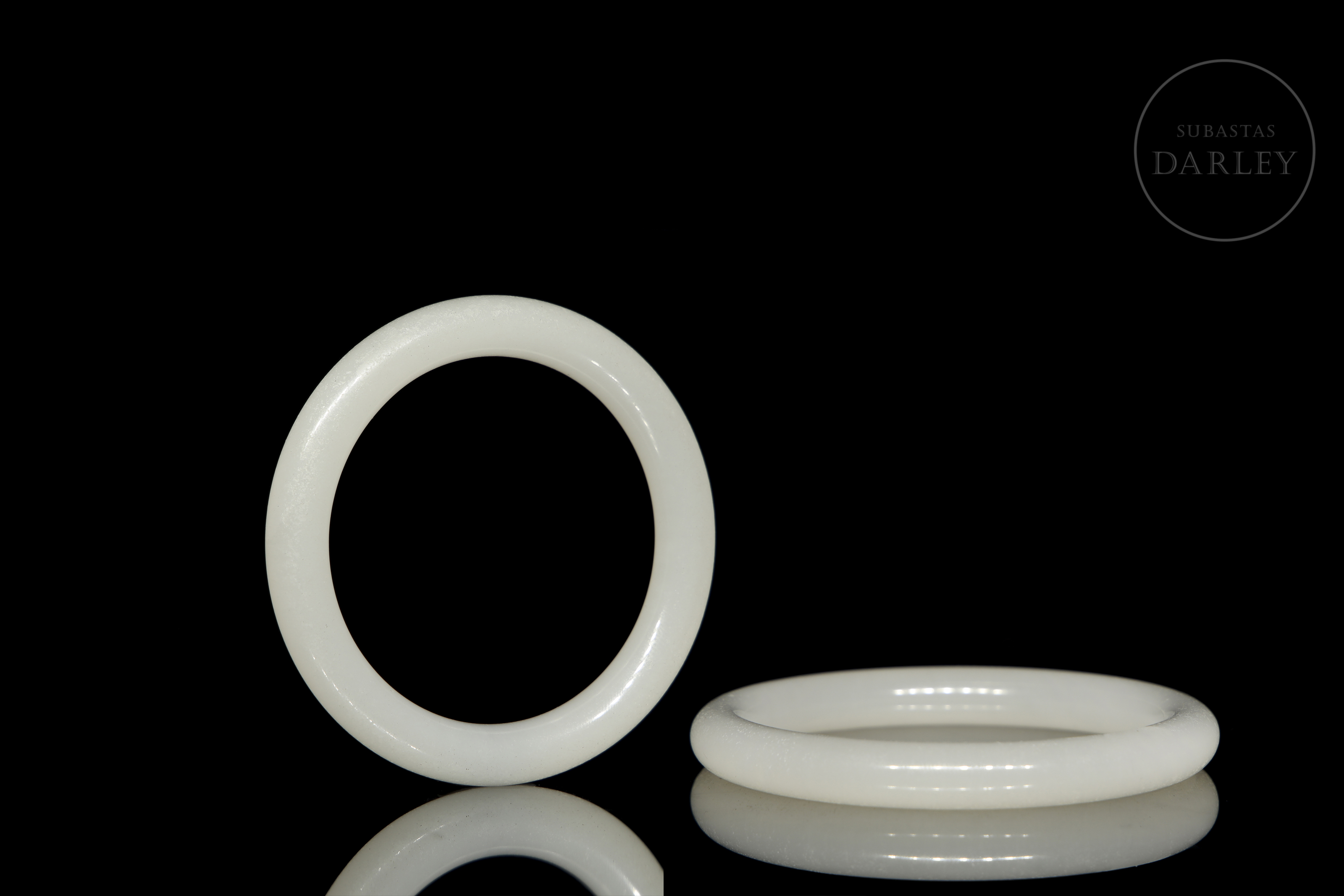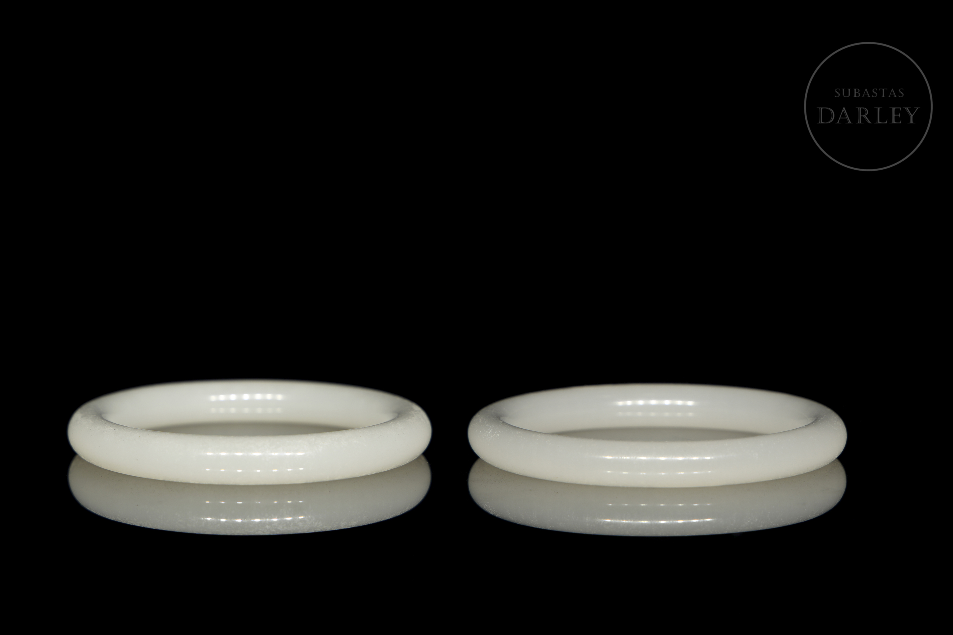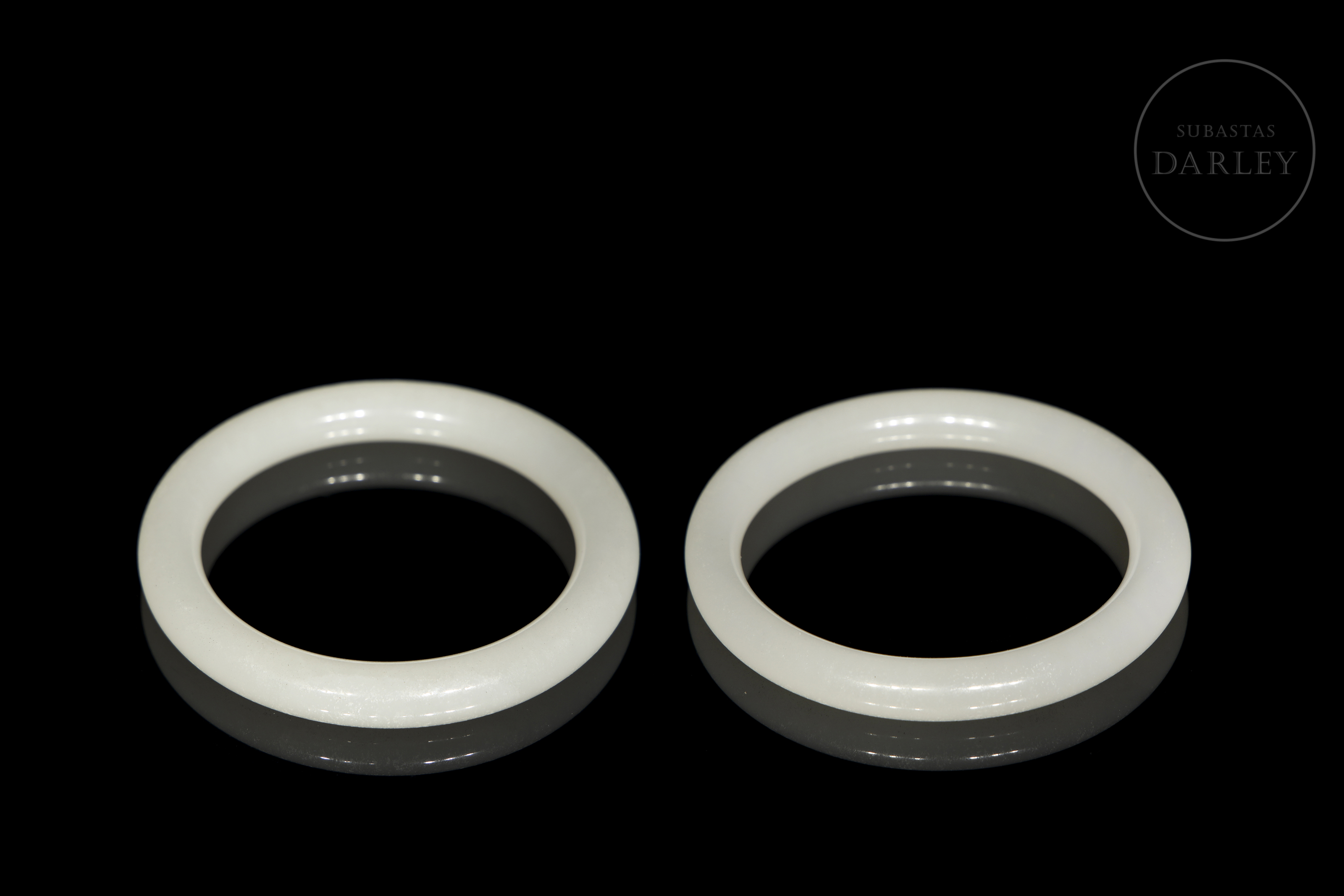 Conjunto formado por dos esclavas circulares talladas en jade de tonalidad blanca homogénea, con superficie lisa y pulida que realza el brillo satinado natural de la piedra. Su diseño sencillo y elegante muestra una circunferencia de bordes redondeados, sin decoraciones externas.