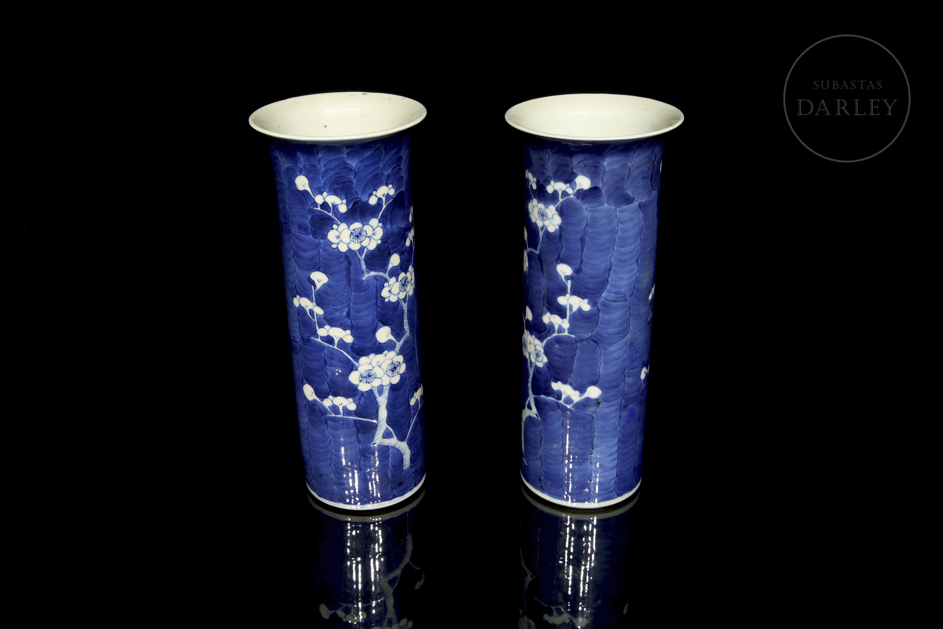 Pareja de jarrones tubulares "Ramas en flor", con sello Kangxi