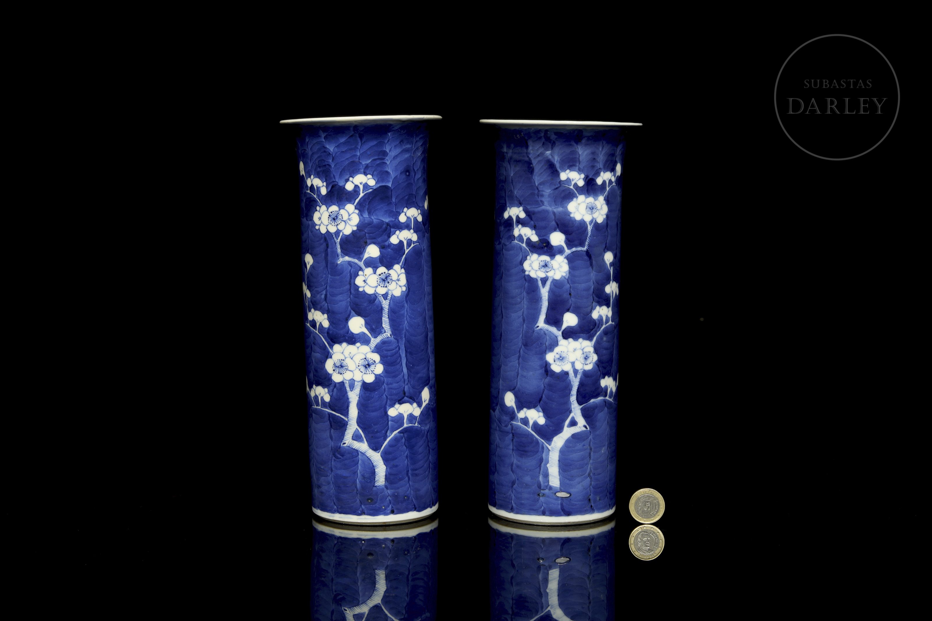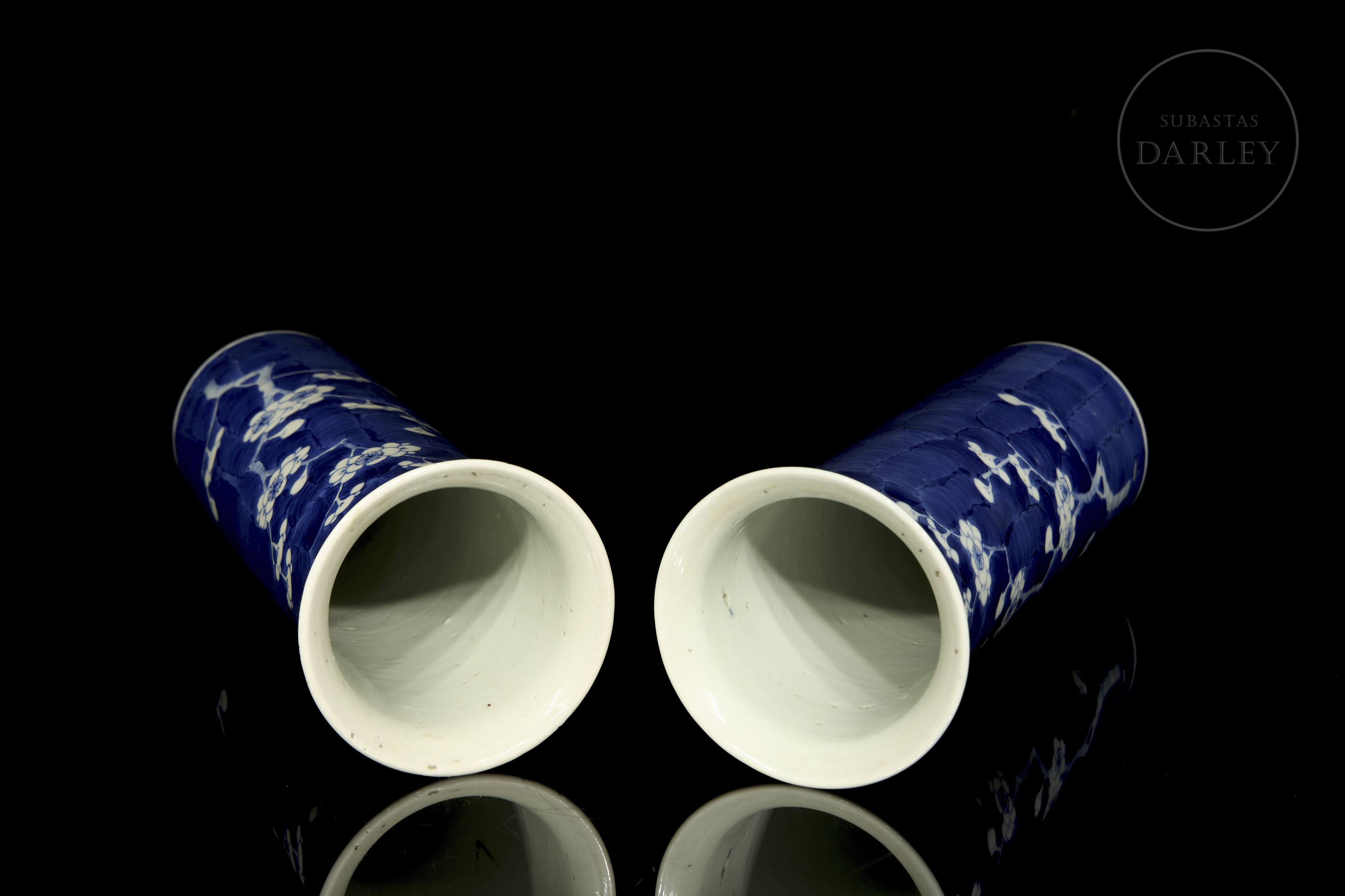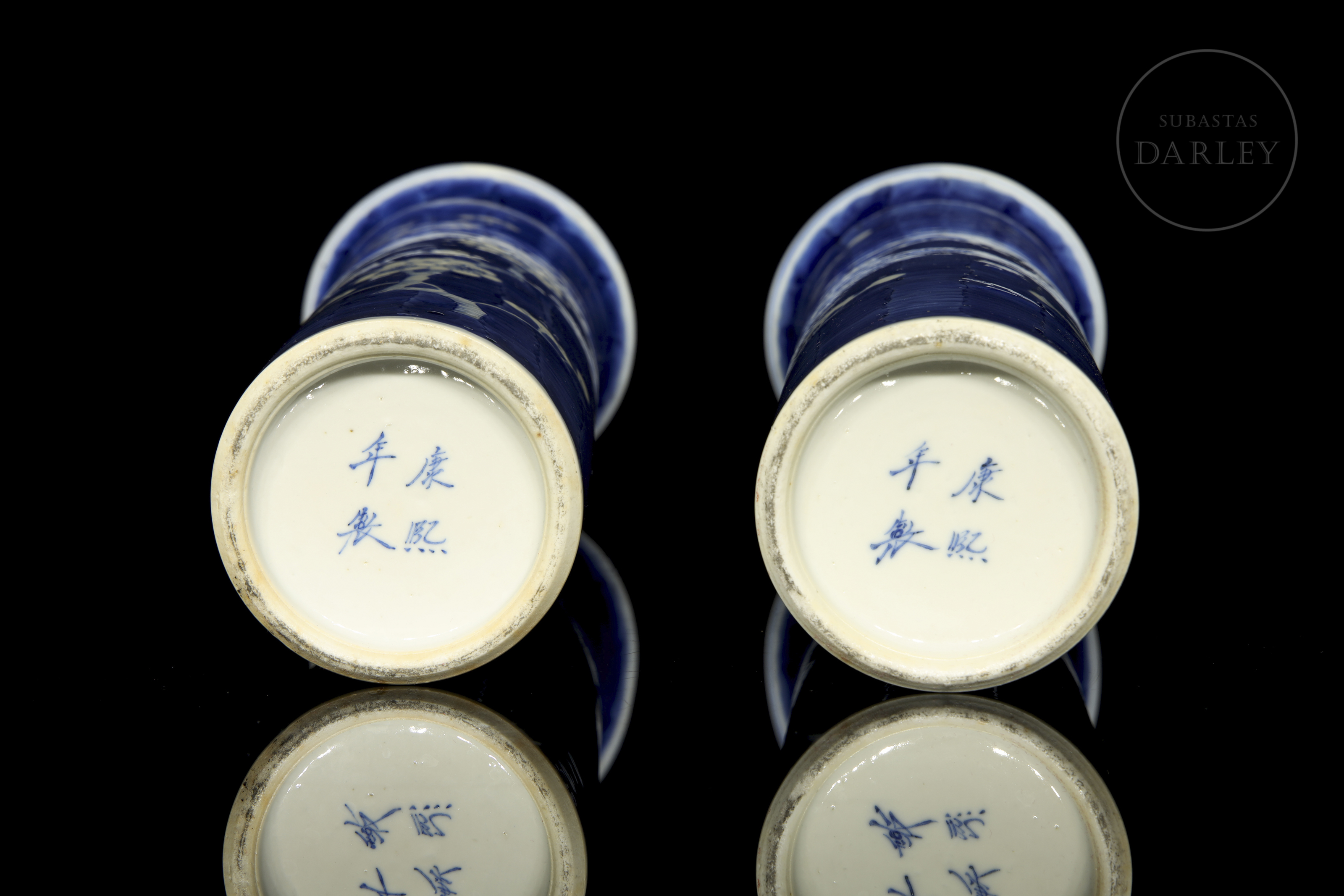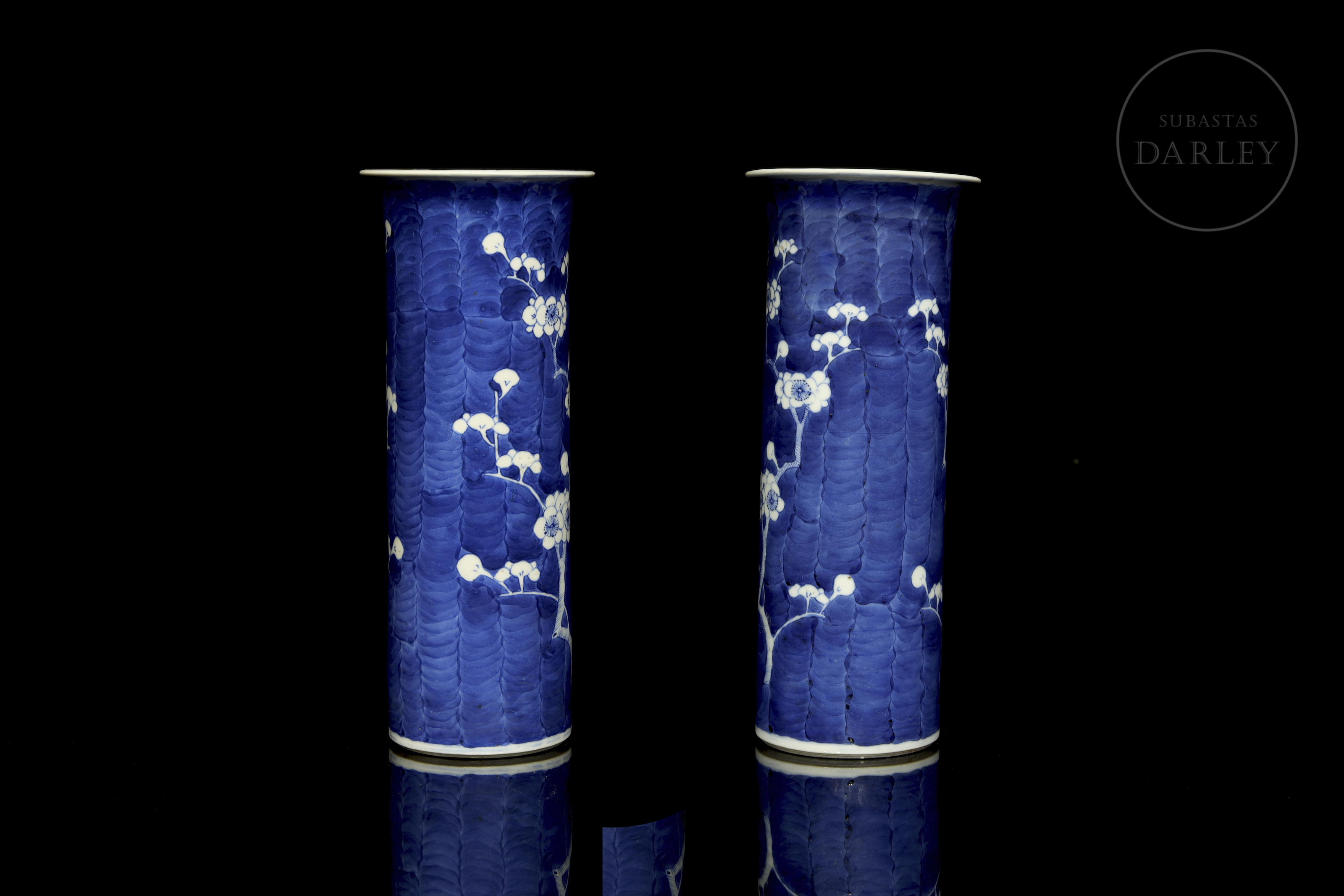 Pareja de jarrones de porcelana esmaltada, de cuerpo cilíndrico y boca ligeramente abocinada. Se encuentran adornados por un intenso esmalte azul, sobre el que destacan elegantes ramas en flor de color blanco, realizadas en reserva, todo ello cubierto por un fino vidriado. En la base se dispone el sello "大清康熙年制".
