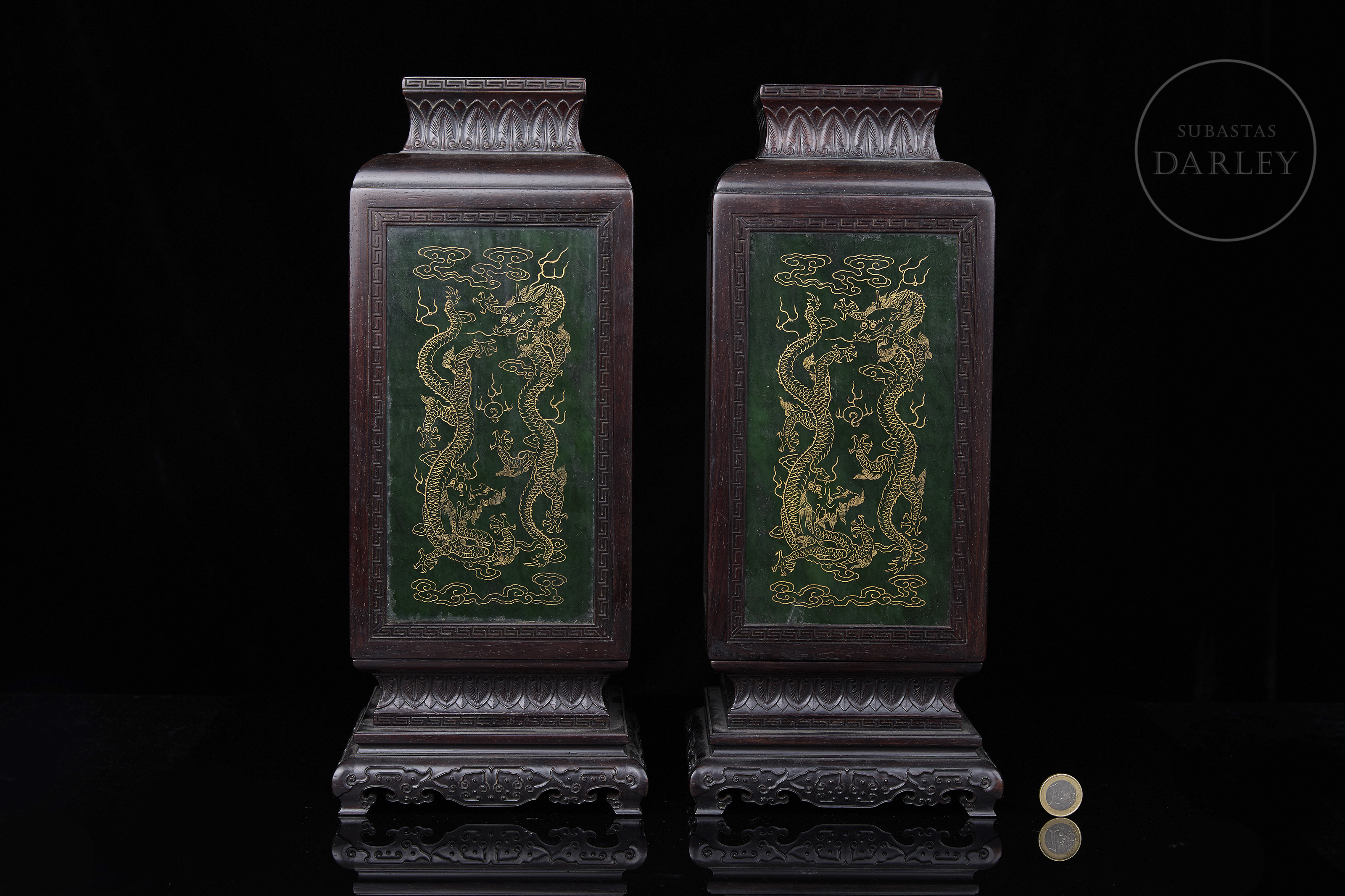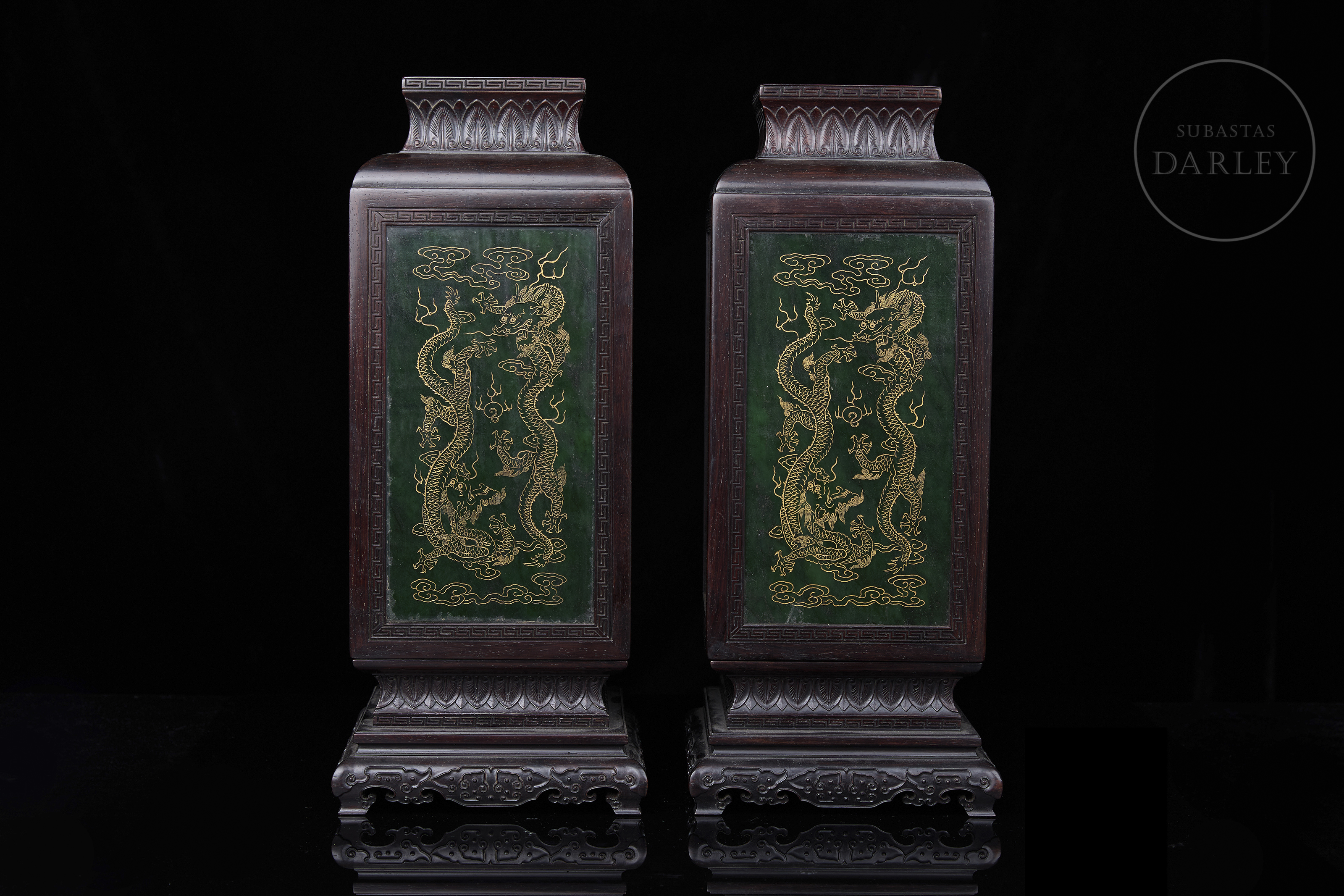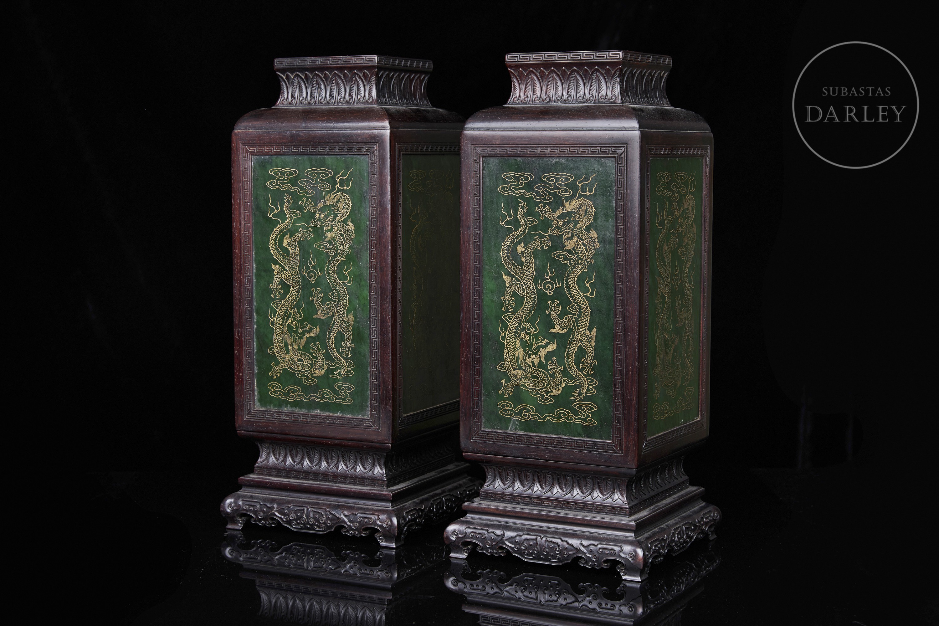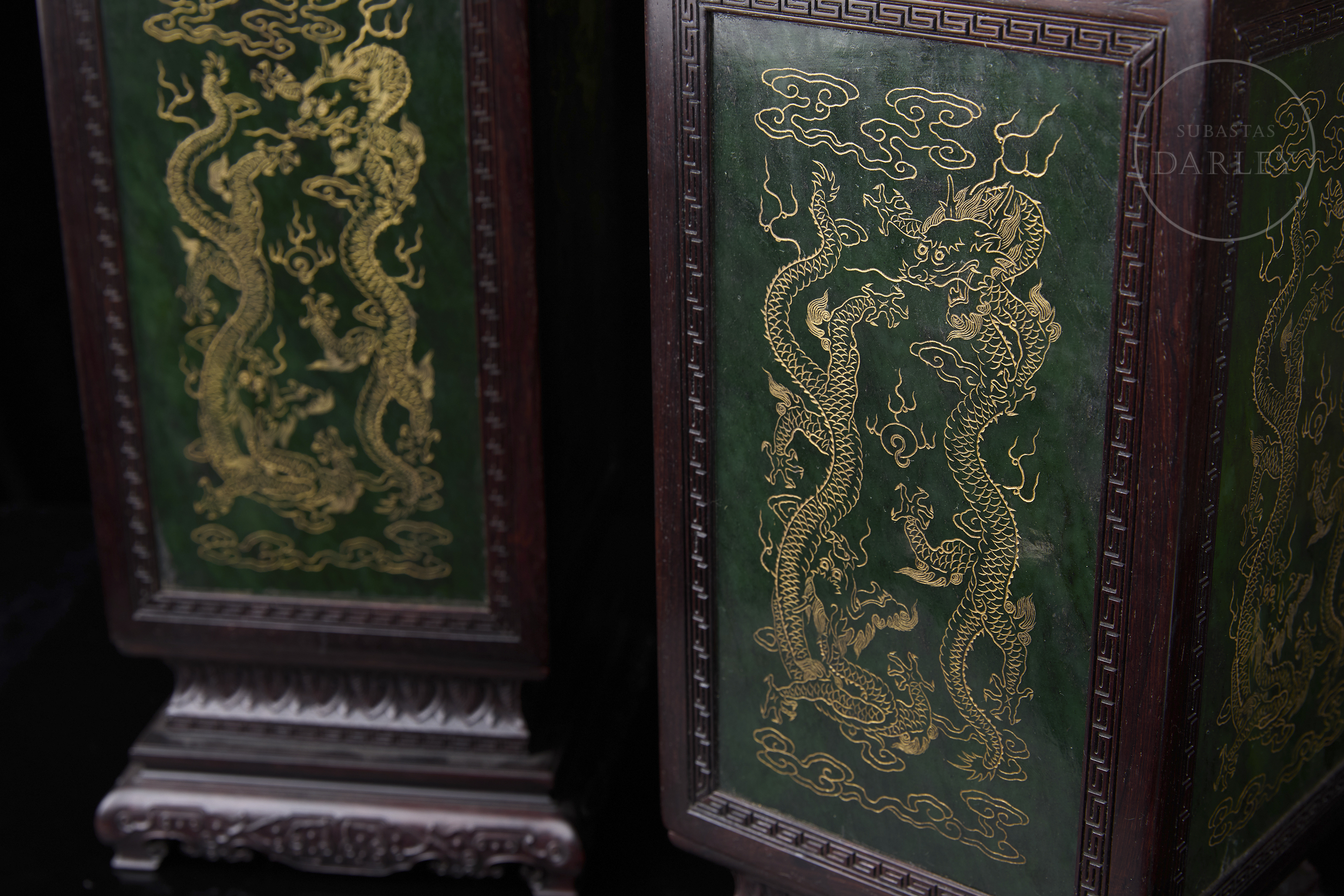 Dos linternas de madera tallada, probablemente zitan o hongmu, adornadas con paneles de jade de un color verde espinaca profundo y opaco, con diseños realzados mediante trazado en oro. Presentan un cuerpo rectangular, flanqueado por marcos de madera, que se asienta sobre bases escalonadas y un cuello acampanado, todo ello adornado con relieves de grecas, hojas y patrones arcaicos. La decoración del jade muestra en cada una de las caras, dibujos incisos y dorados, que resaltan la imagen de dos dragones imperiales de cinco garras danzando verticalmente para alcanzar la perla flamígera entre volutas de nubes estilizadas.