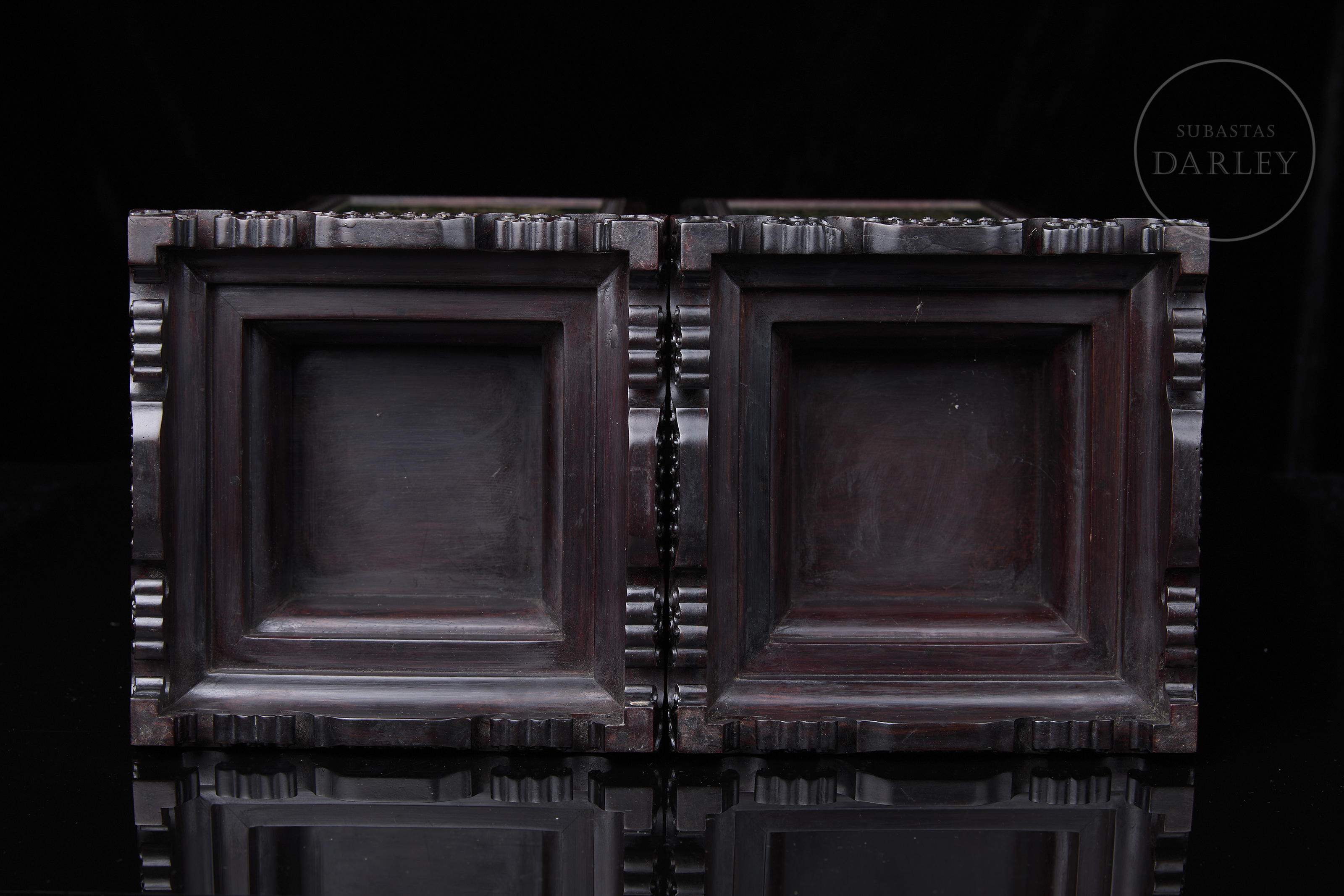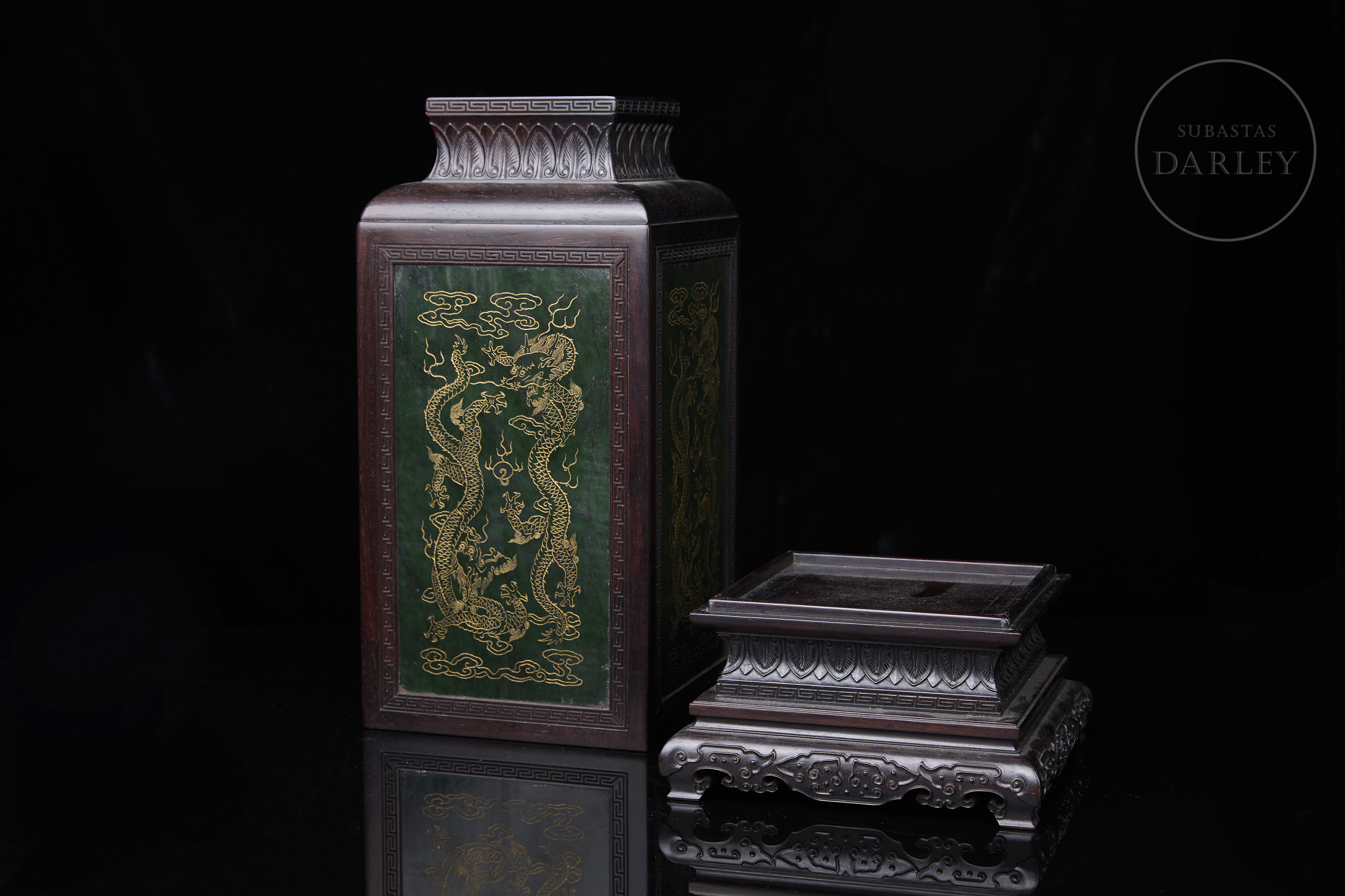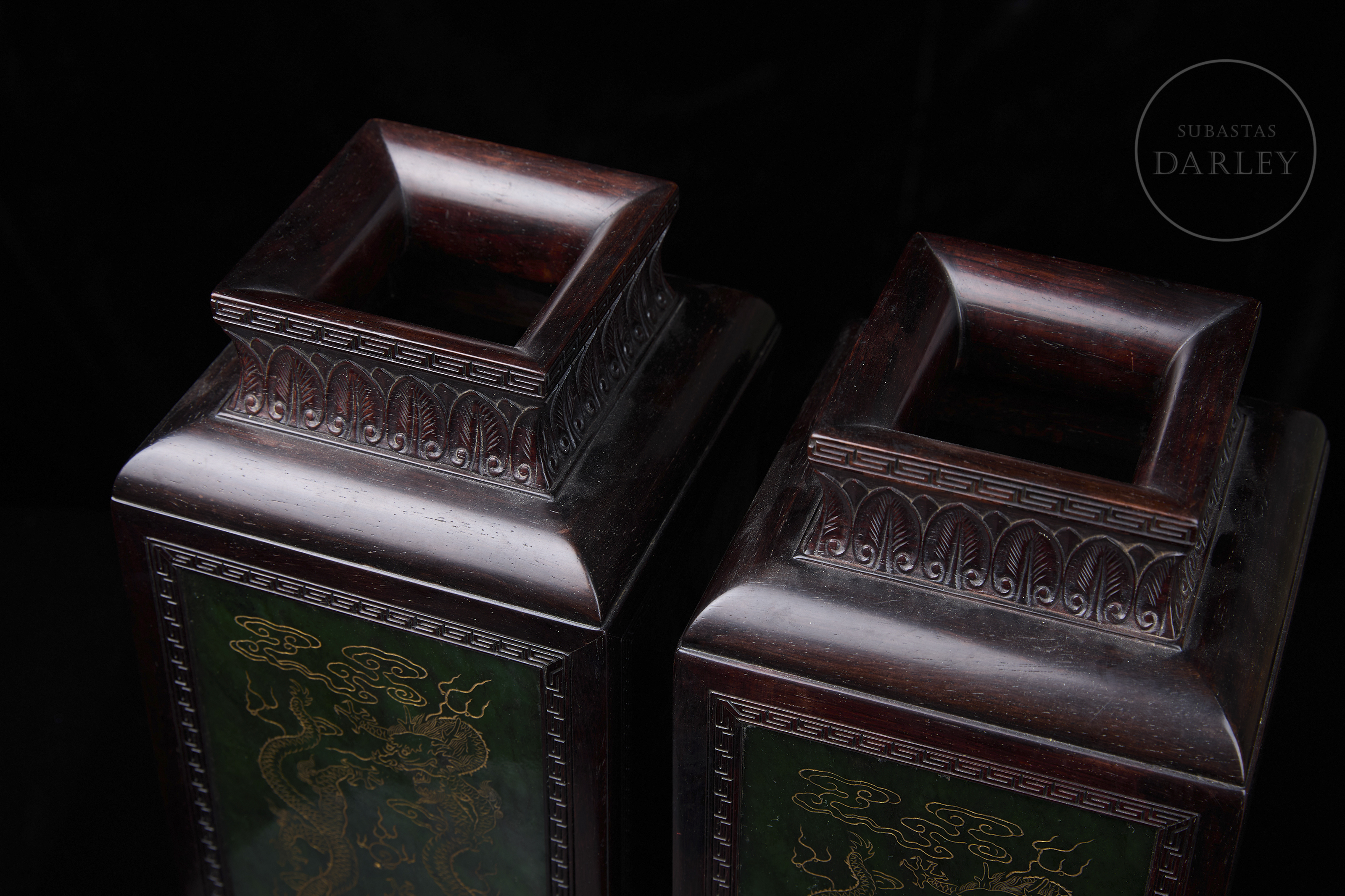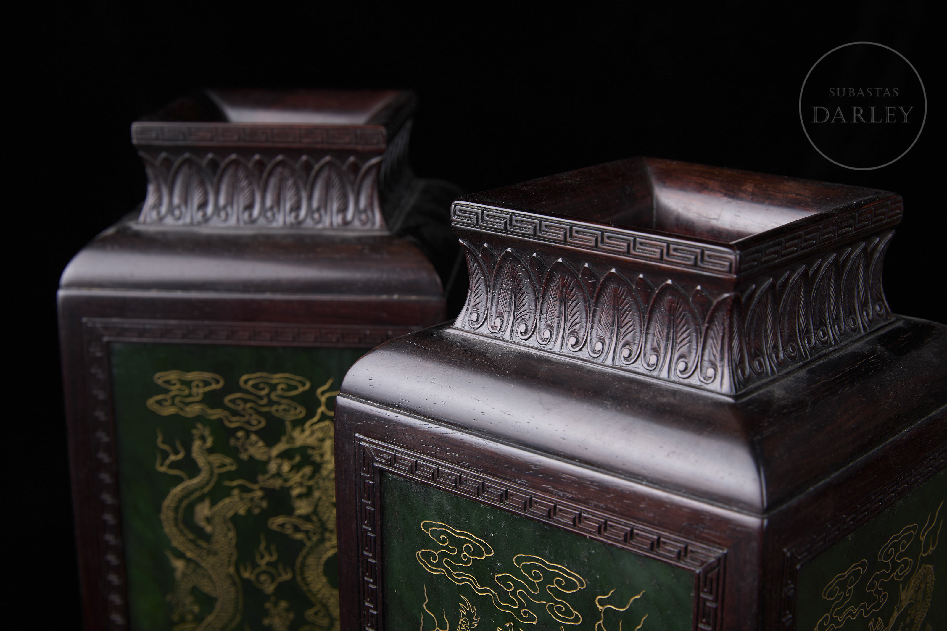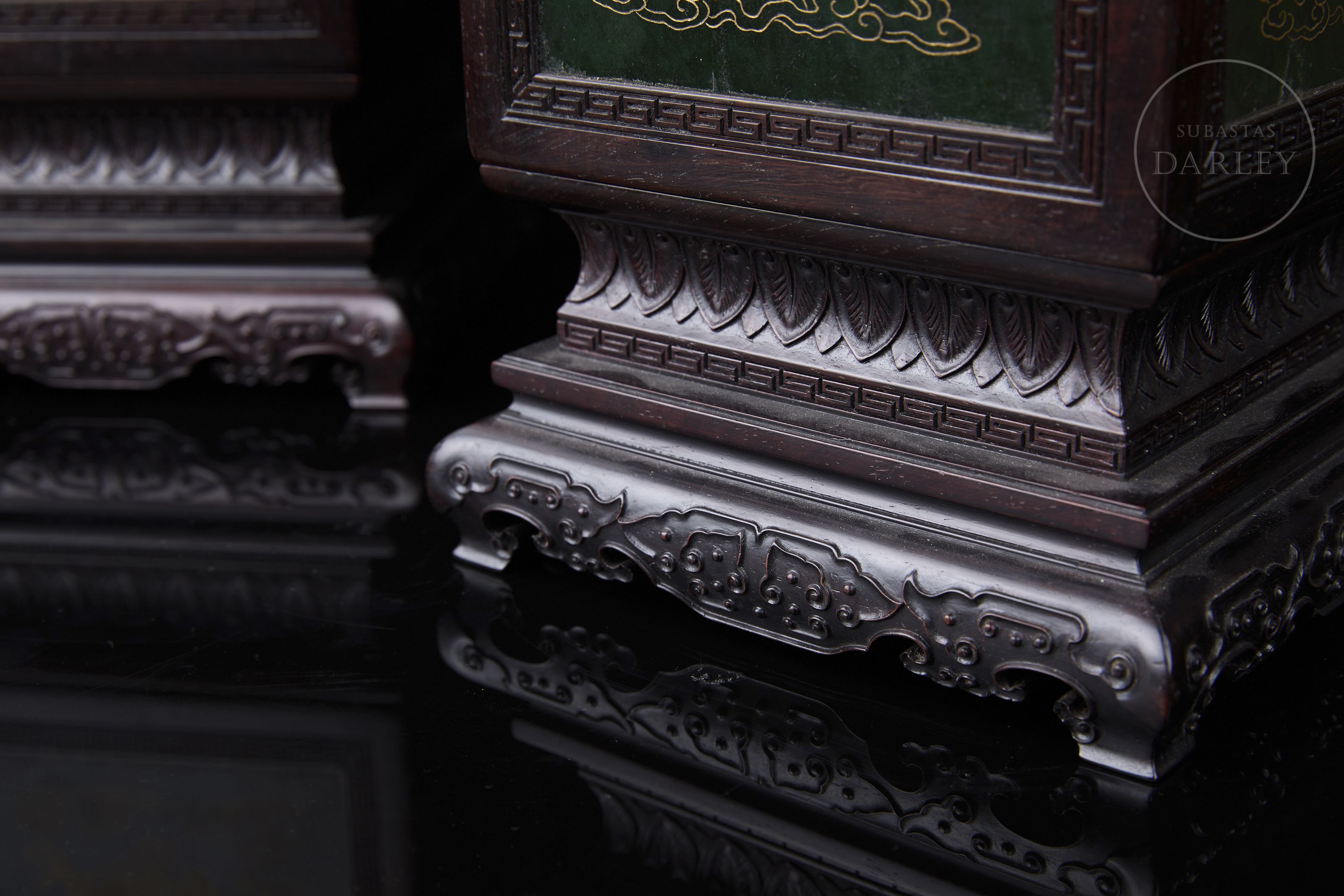 Dos linternas de madera tallada, probablemente zitan o hongmu, adornadas con paneles de jade de un color verde espinaca profundo y opaco, con diseños realzados mediante trazado en oro. Presentan un cuerpo rectangular, flanqueado por marcos de madera, que se asienta sobre bases escalonadas y un cuello acampanado, todo ello adornado con relieves de grecas, hojas y patrones arcaicos. La decoración del jade muestra en cada una de las caras, dibujos incisos y dorados, que resaltan la imagen de dos dragones imperiales de cinco garras danzando verticalmente para alcanzar la perla flamígera entre volutas de nubes estilizadas.
