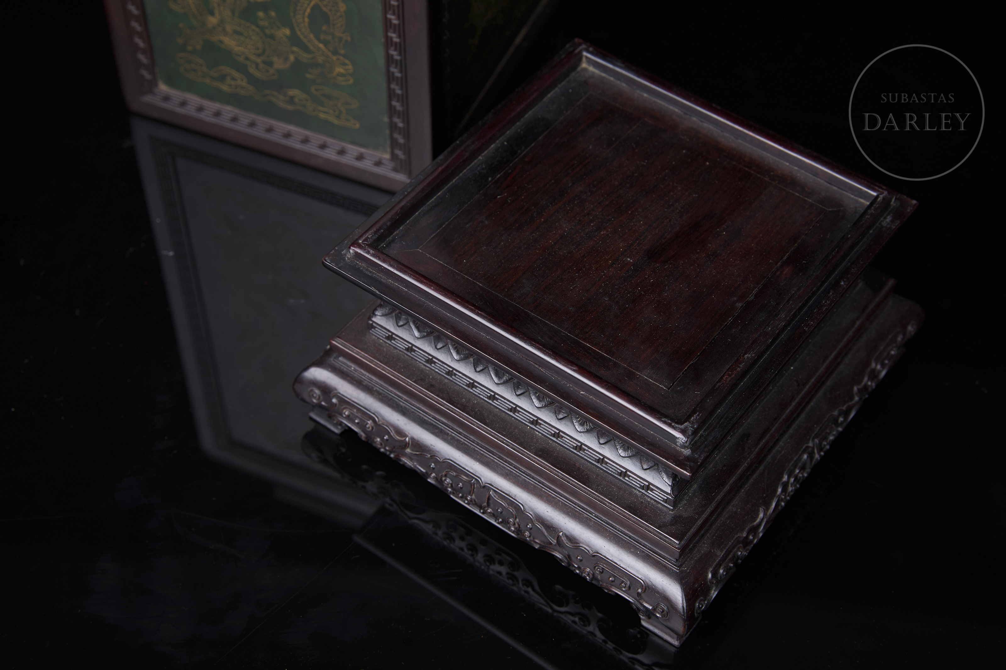 Pareja de lámparas "Dragones y perla" de jade verde espinaca y madera, dinastía Qing