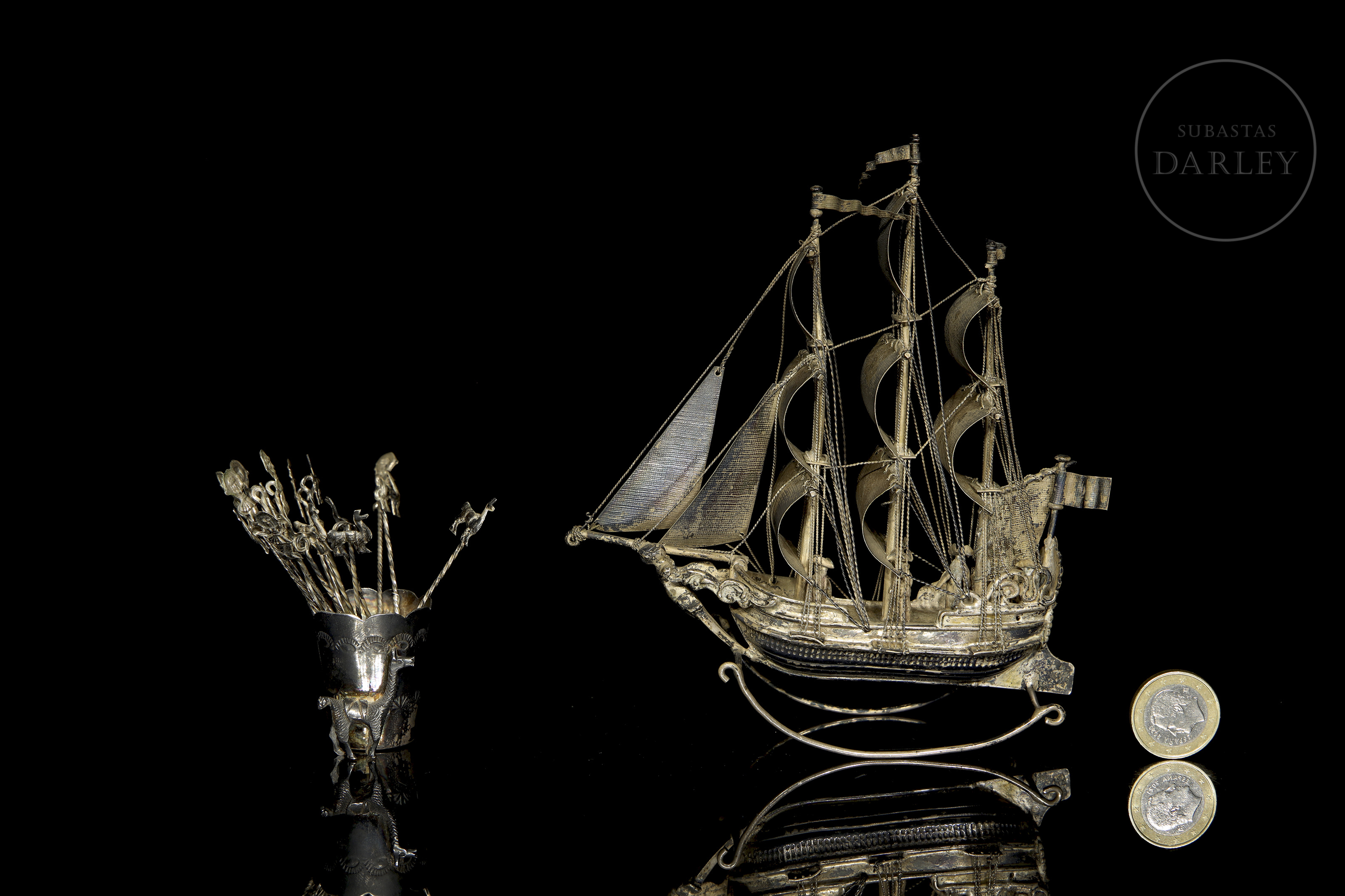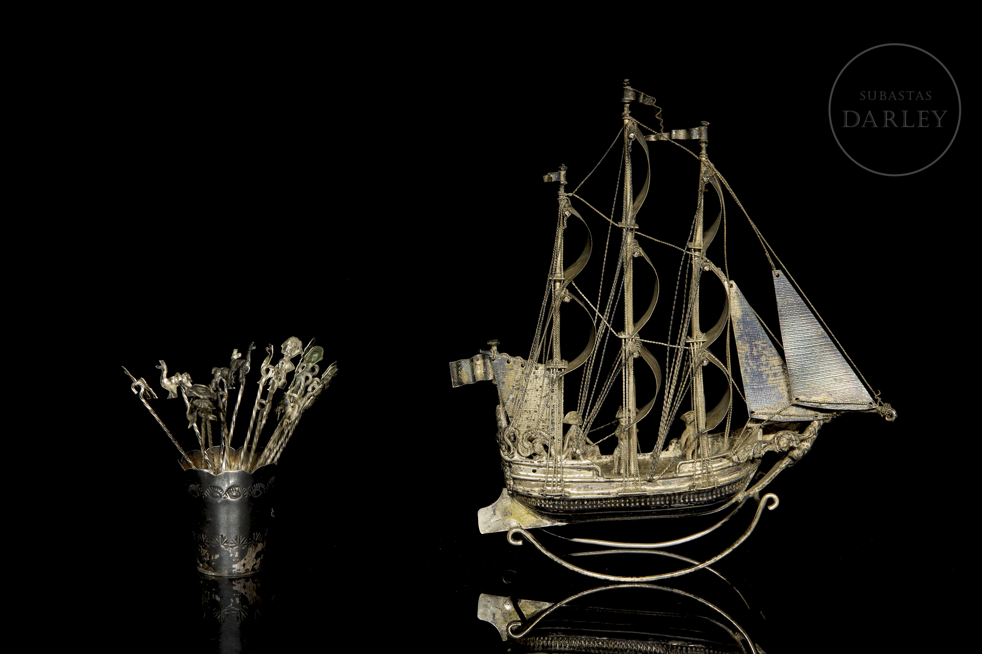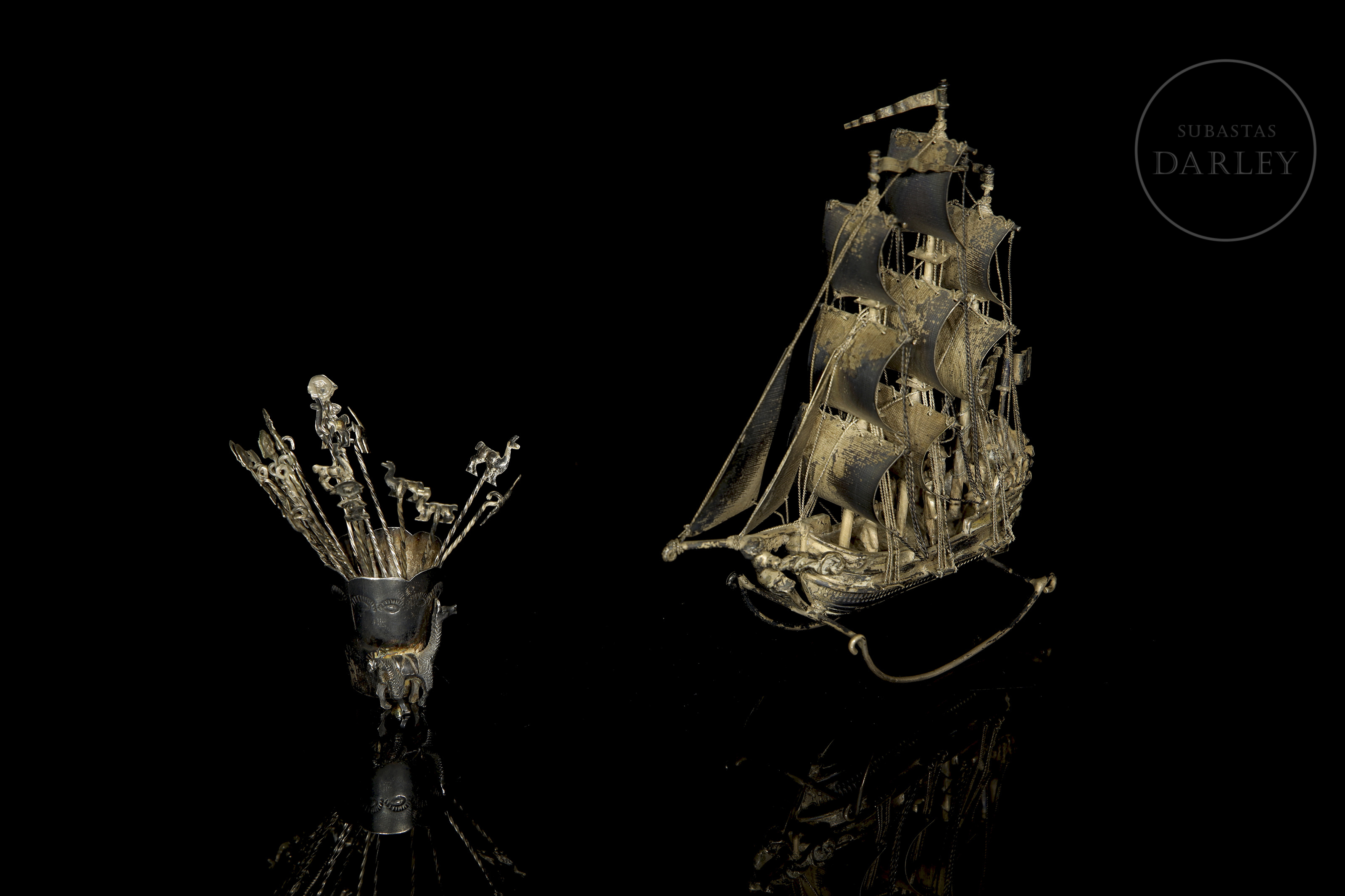 Lote compuesto por dos piezas de orfebrería de distinta procedencia. Incluye un barco de tres mástiles con velas desplegadas, y un pequeño vaso de plata peruana decorado con una llama en relieve, que contiene un juego de palillos rematados con figuras zoomorfas y antropomorfas. Presenta punzones de plata holandesa en la aleta del barco y sello "925 PERU" en la base del vaso.