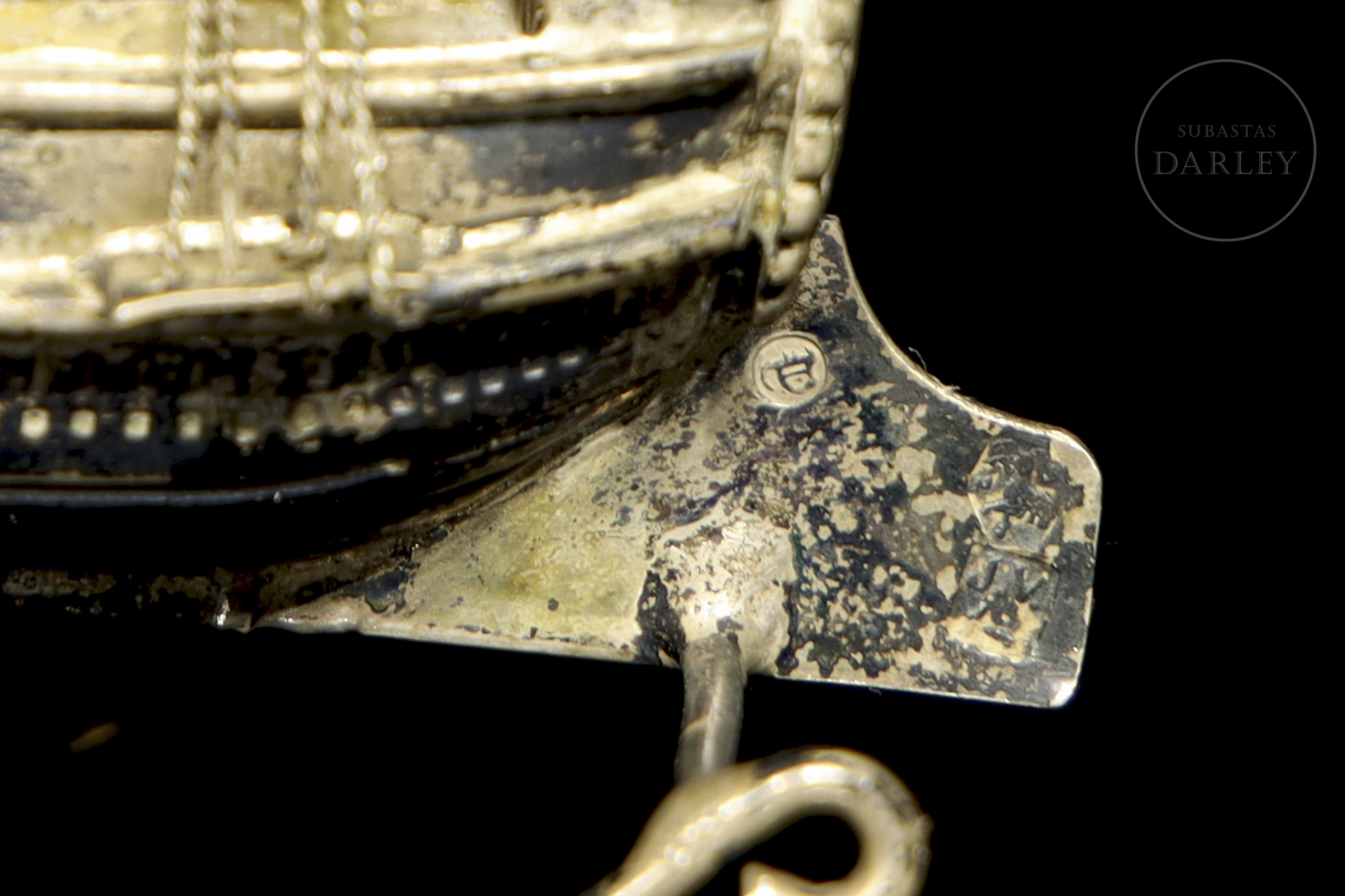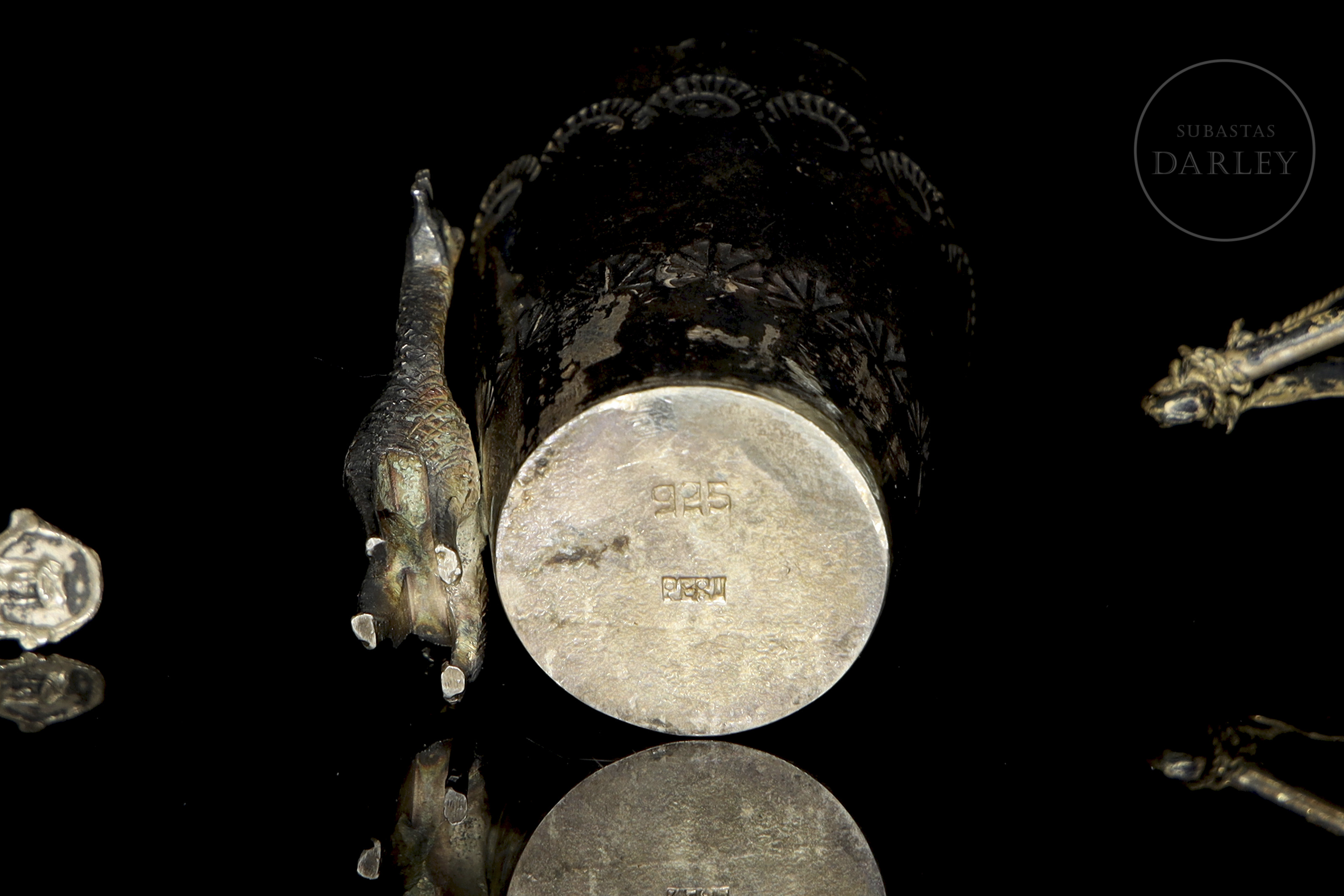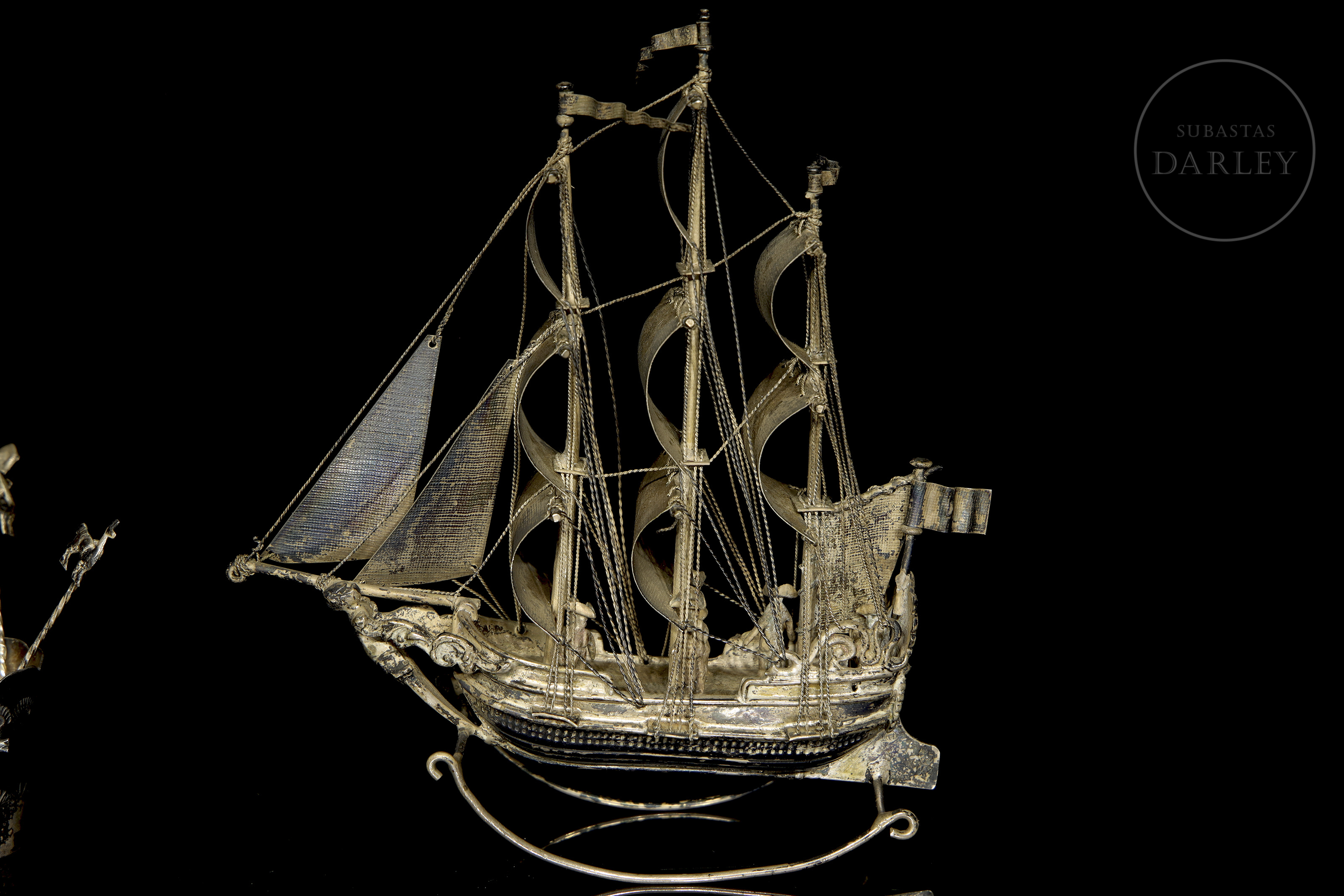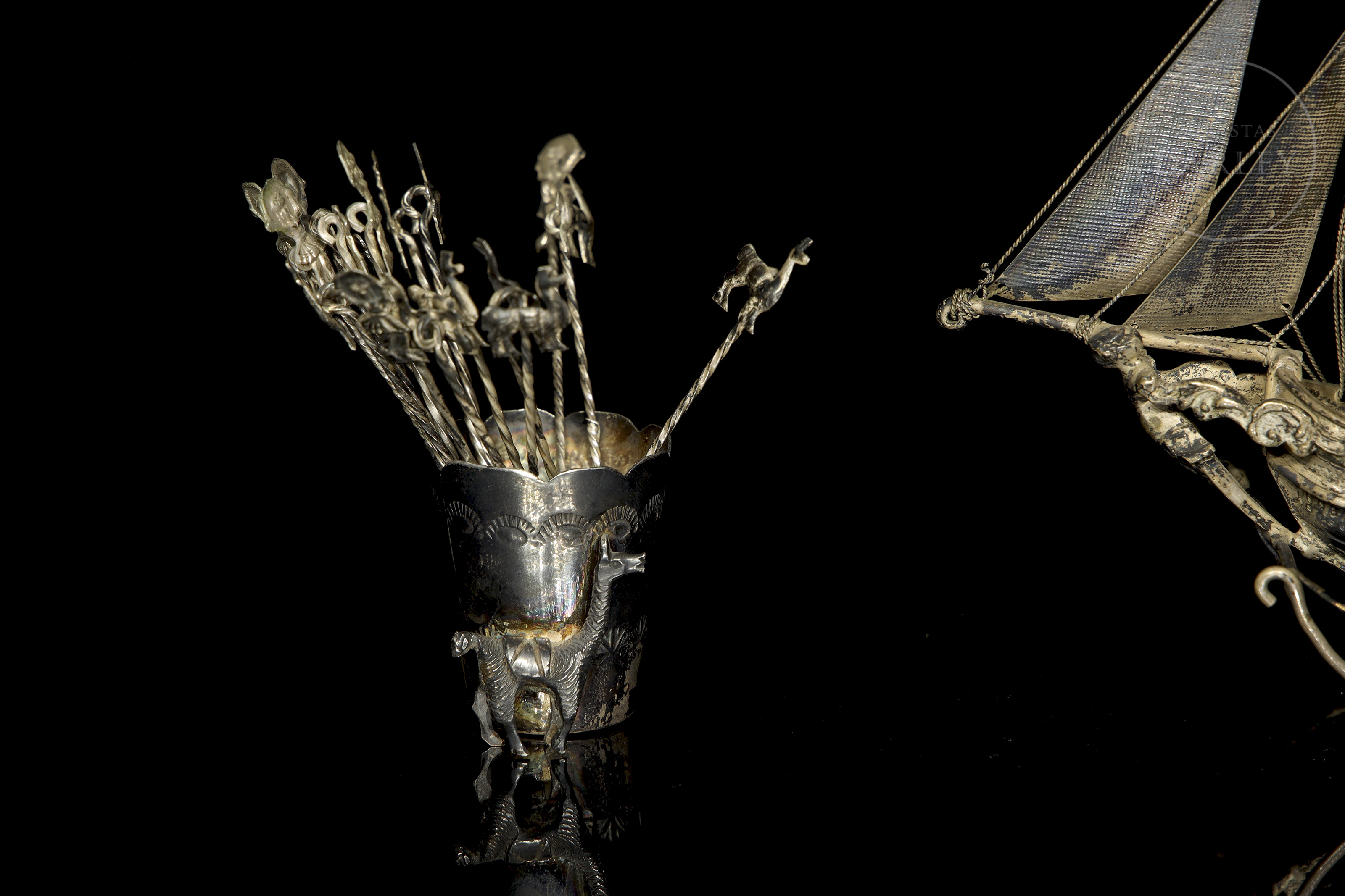 Lote compuesto por dos piezas de orfebrería de distinta procedencia. Incluye un barco de tres mástiles con velas desplegadas, y un pequeño vaso de plata peruana decorado con una llama en relieve, que contiene un juego de palillos rematados con figuras zoomorfas y antropomorfas. Presenta punzones de plata holandesa en la aleta del barco y sello "925 PERU" en la base del vaso.