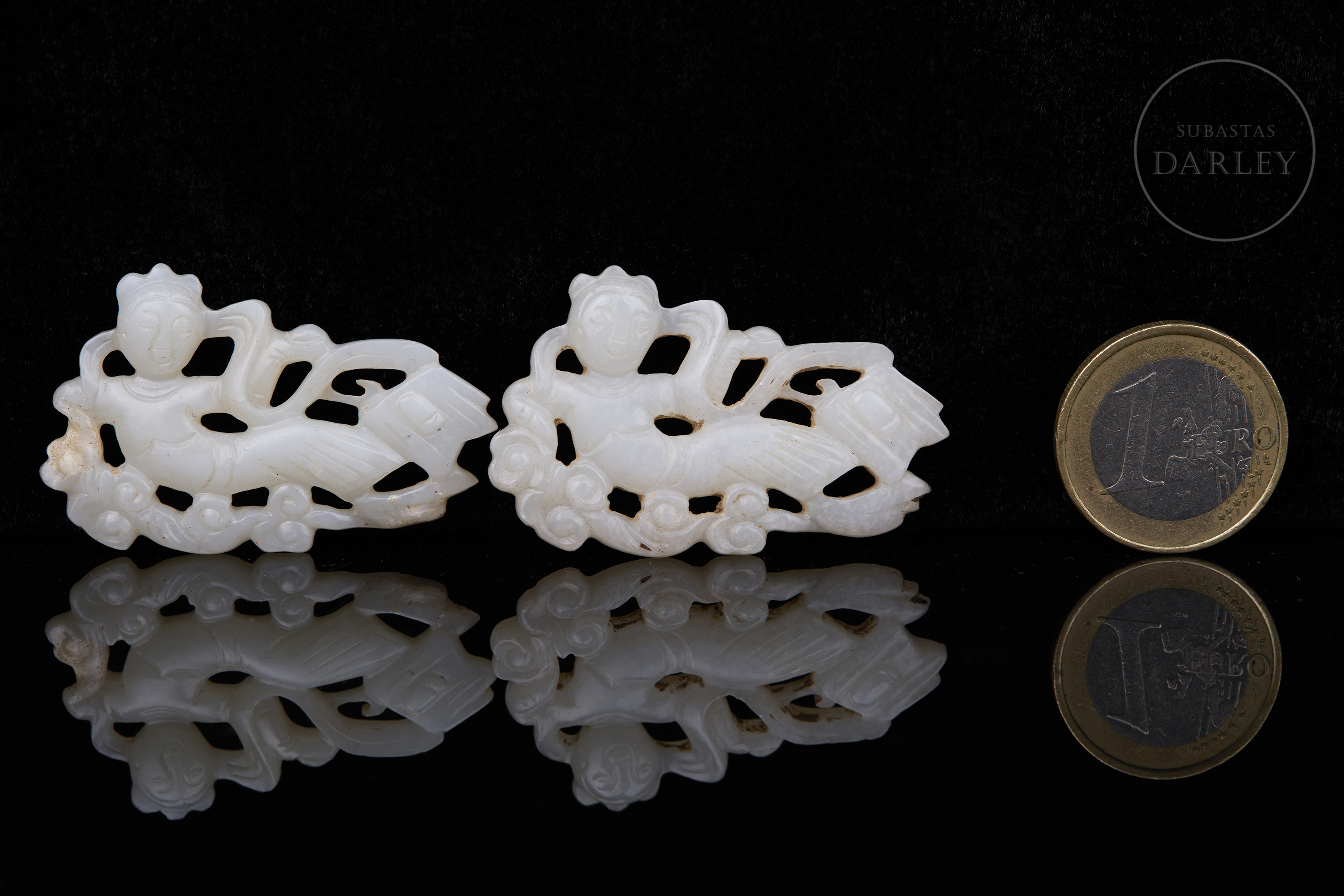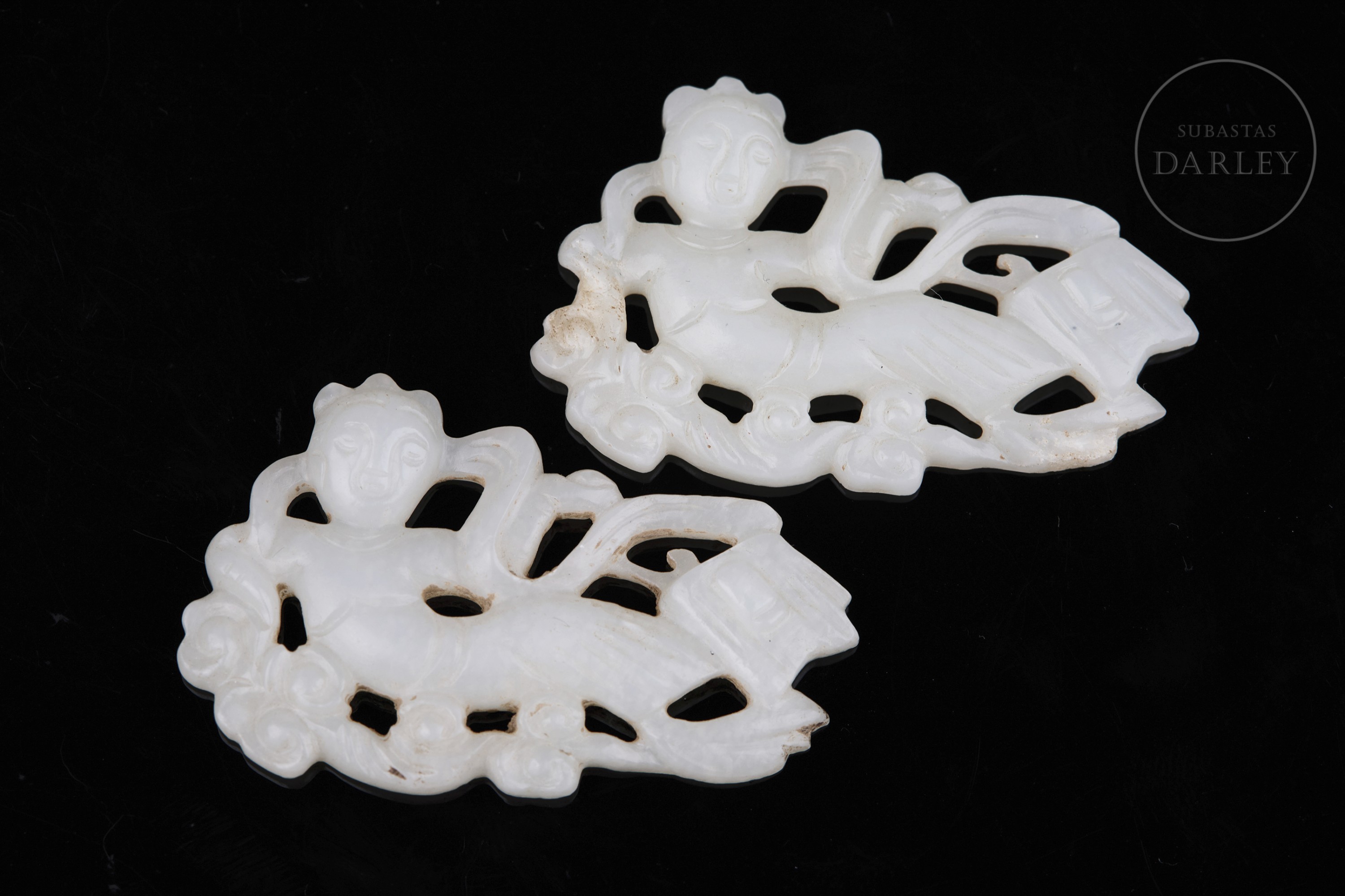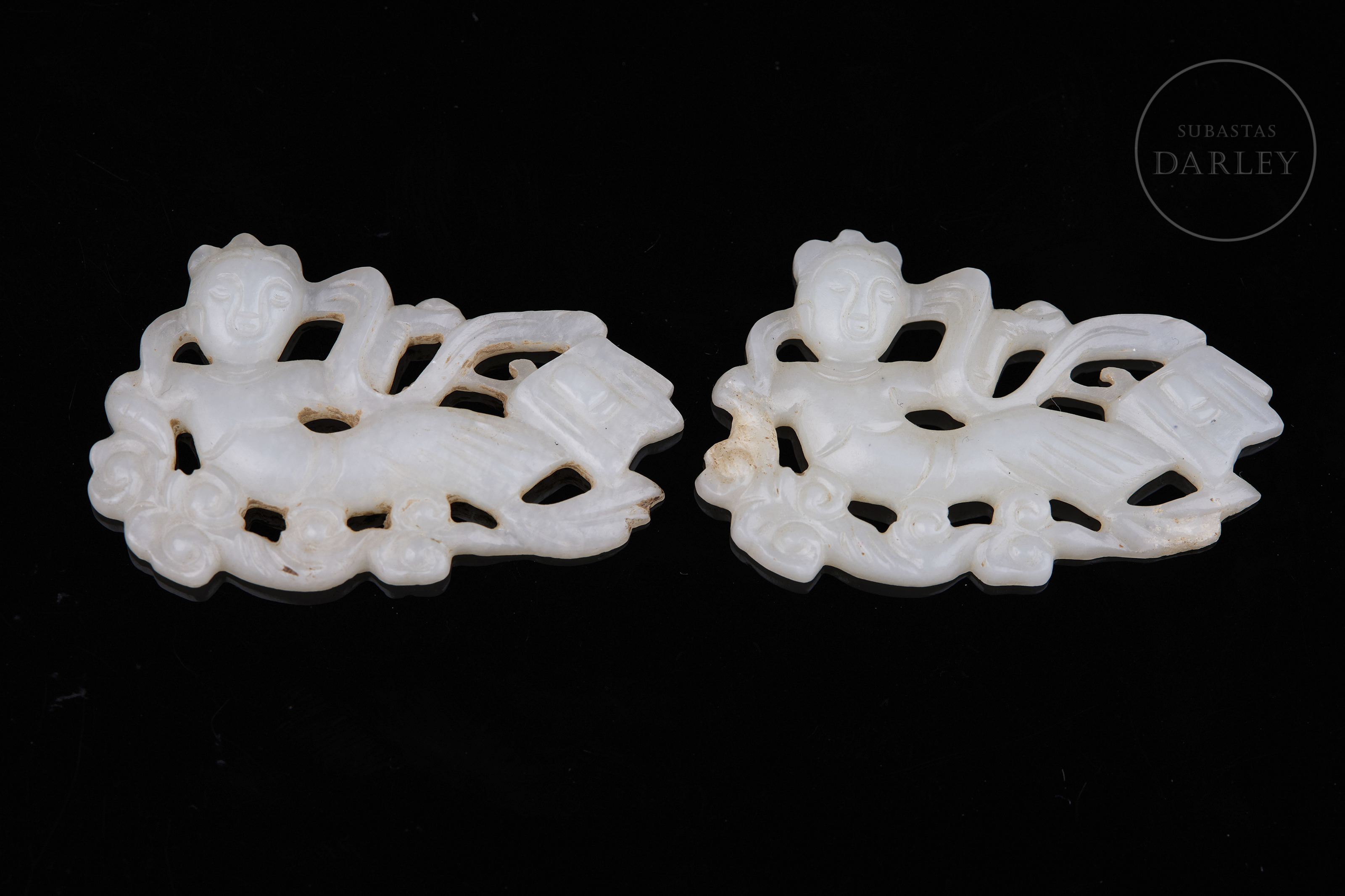 Dos placas de jade blanco tallado. Ambas, planas y delgadas, muestran una elaborada talla calada y de bajo relieve que representan una dama o inmortal femenina recostada entre volutas de nubes, ataviadas con largas túnicas y con el cabello recogido en un alto tocado. Dinastía Ming (1368-1644).
