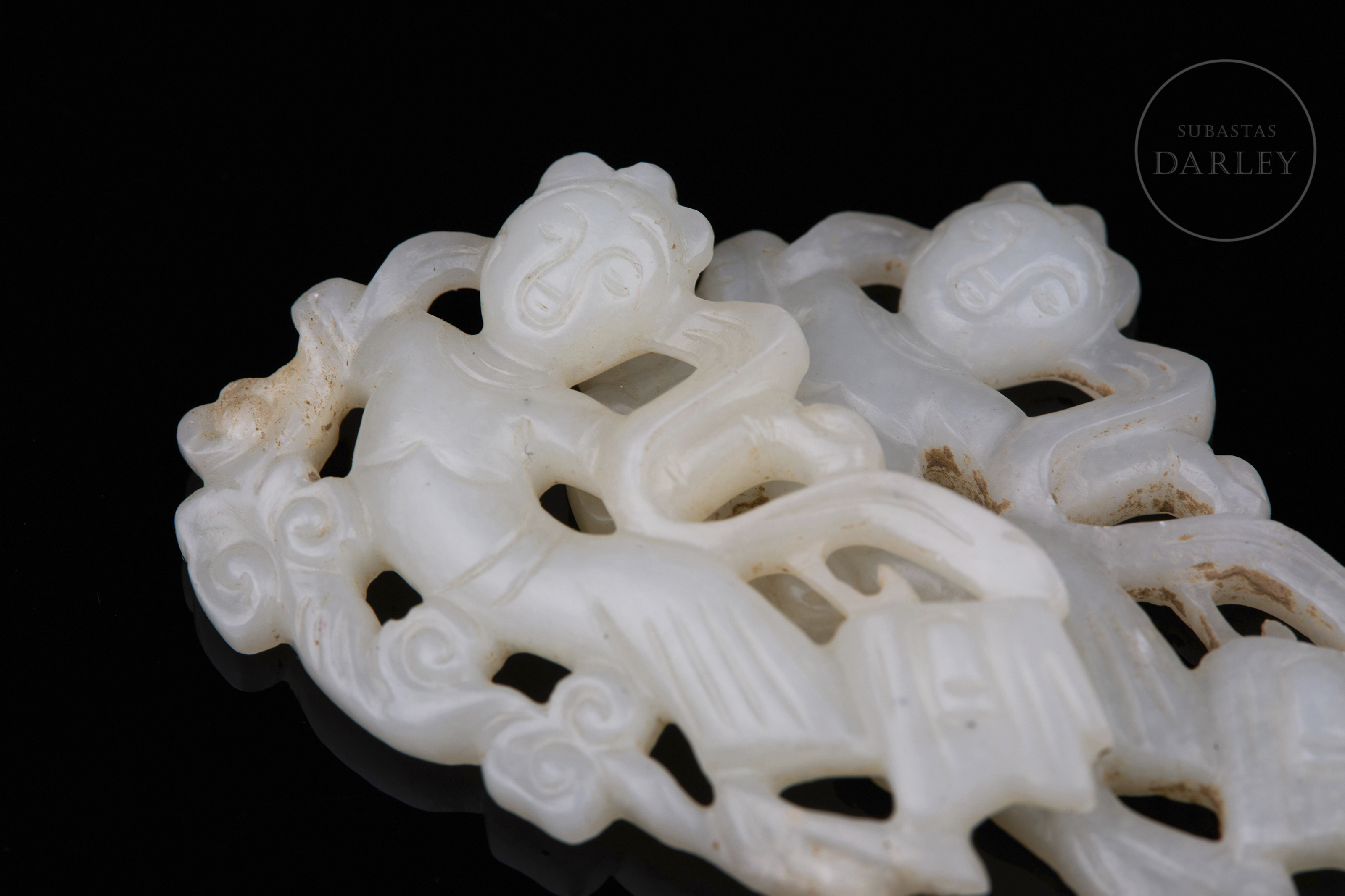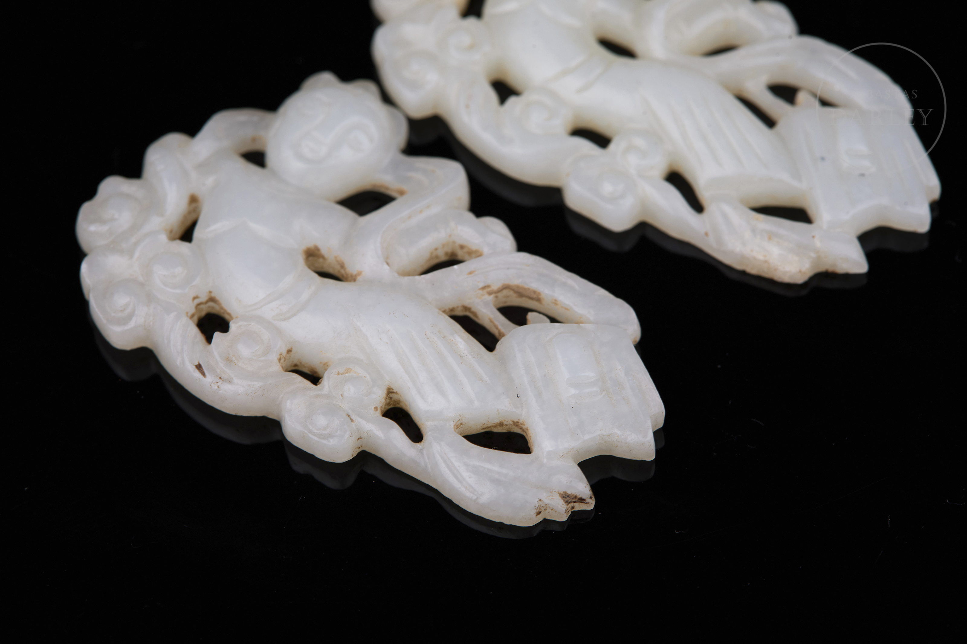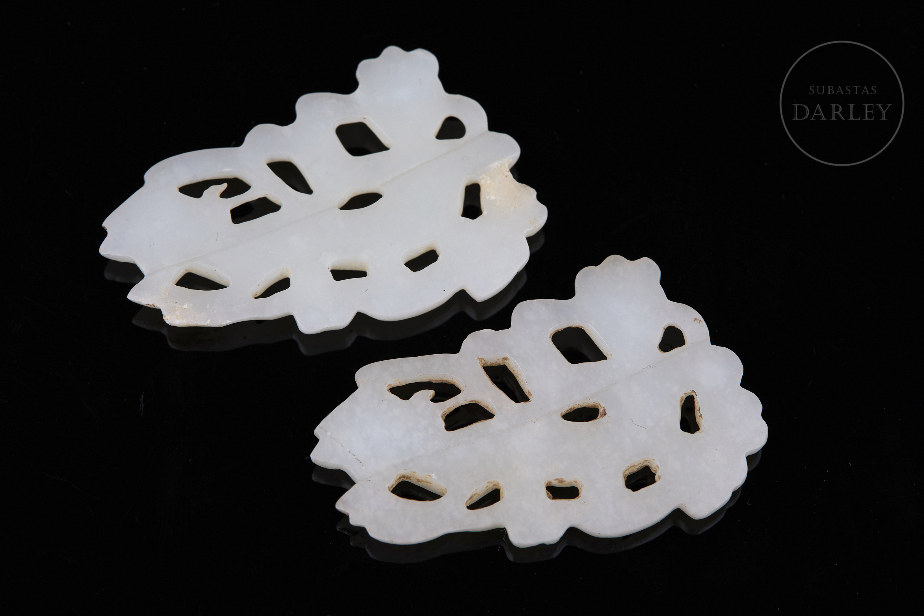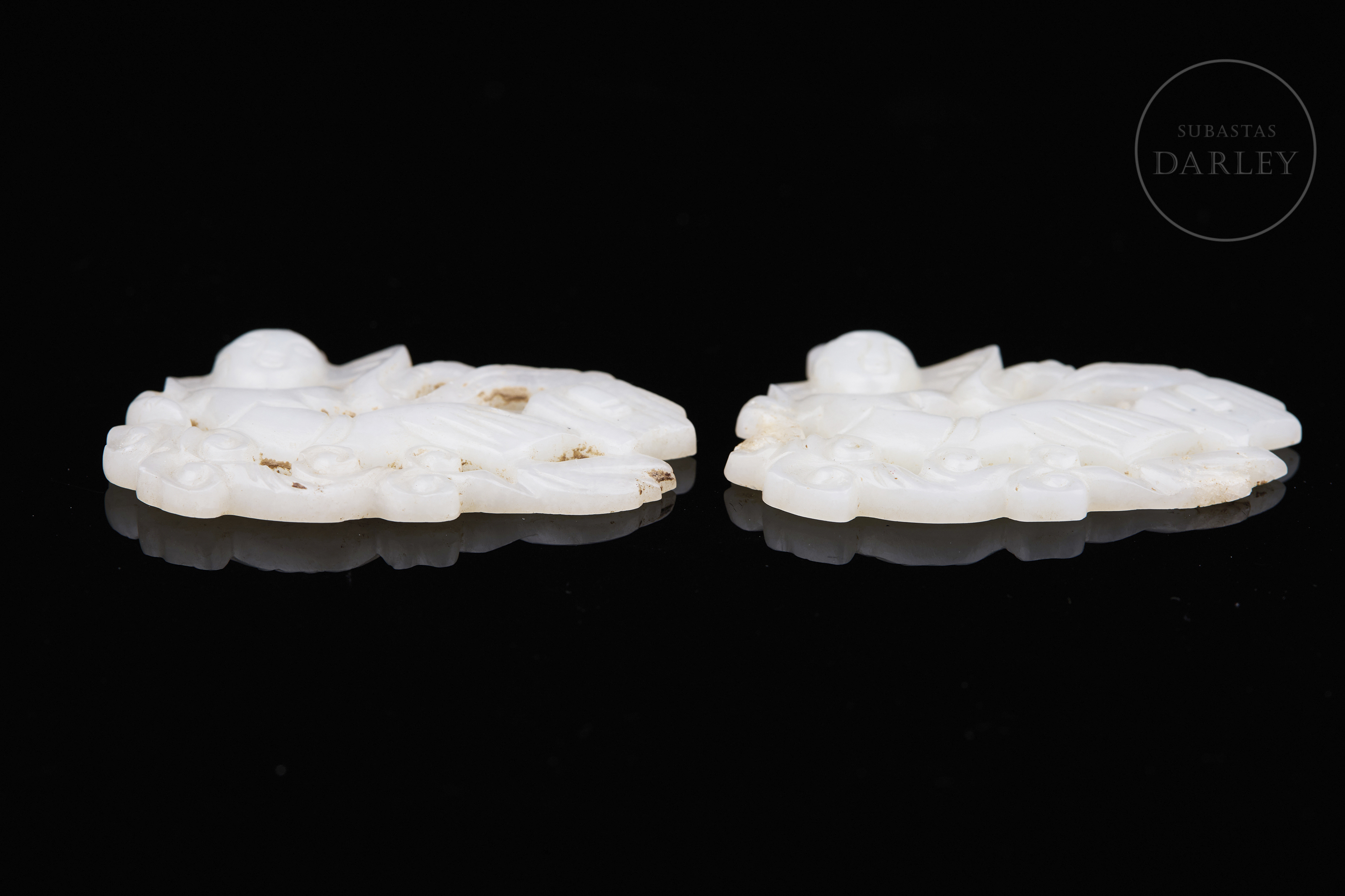 Dos placas de jade blanco tallado. Ambas, planas y delgadas, muestran una elaborada talla calada y de bajo relieve que representan una dama o inmortal femenina recostada entre volutas de nubes, ataviadas con largas túnicas y con el cabello recogido en un alto tocado. Dinastía Ming (1368-1644).