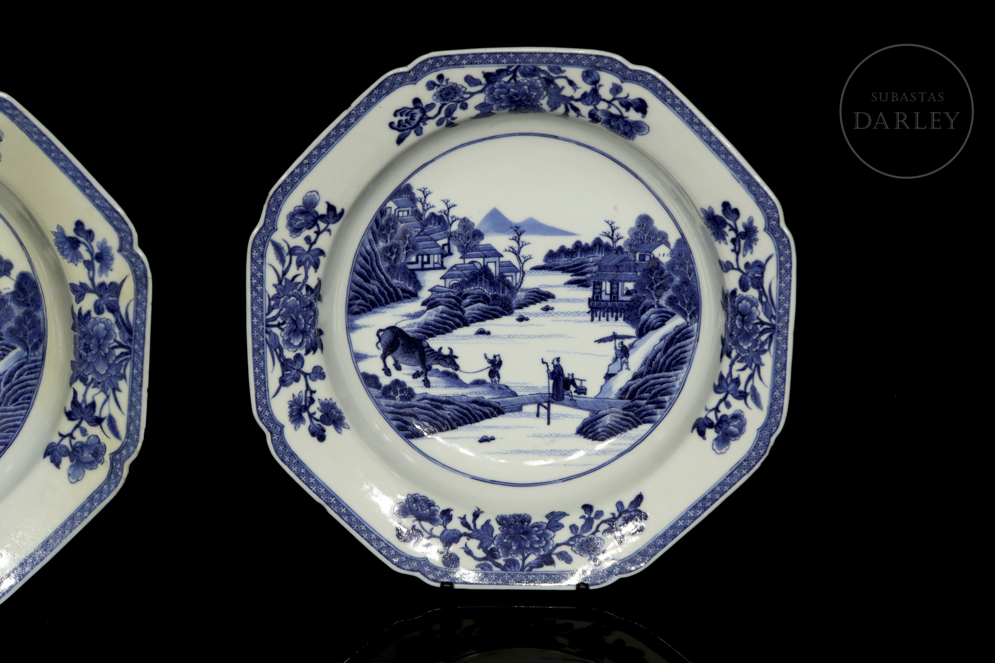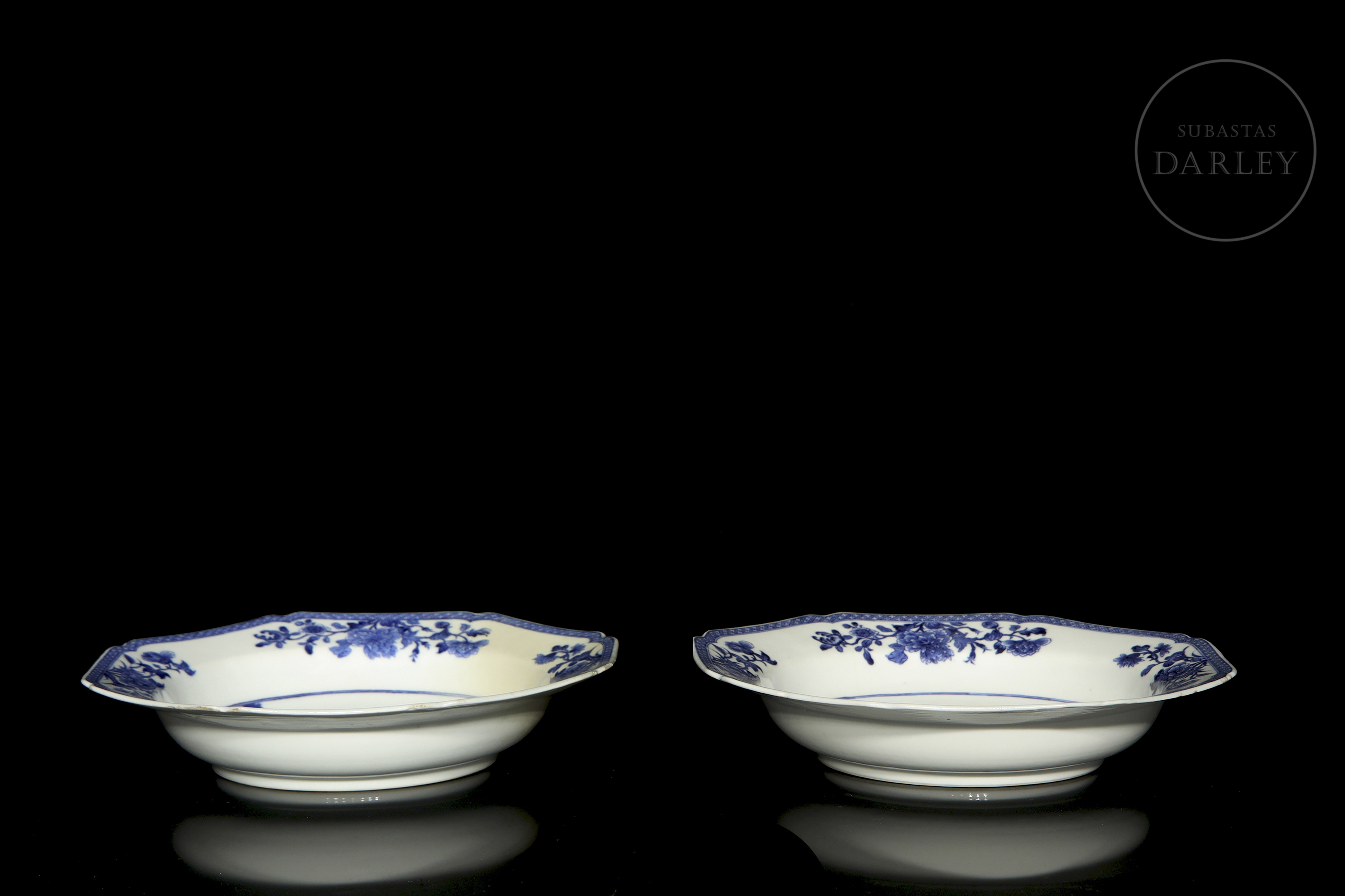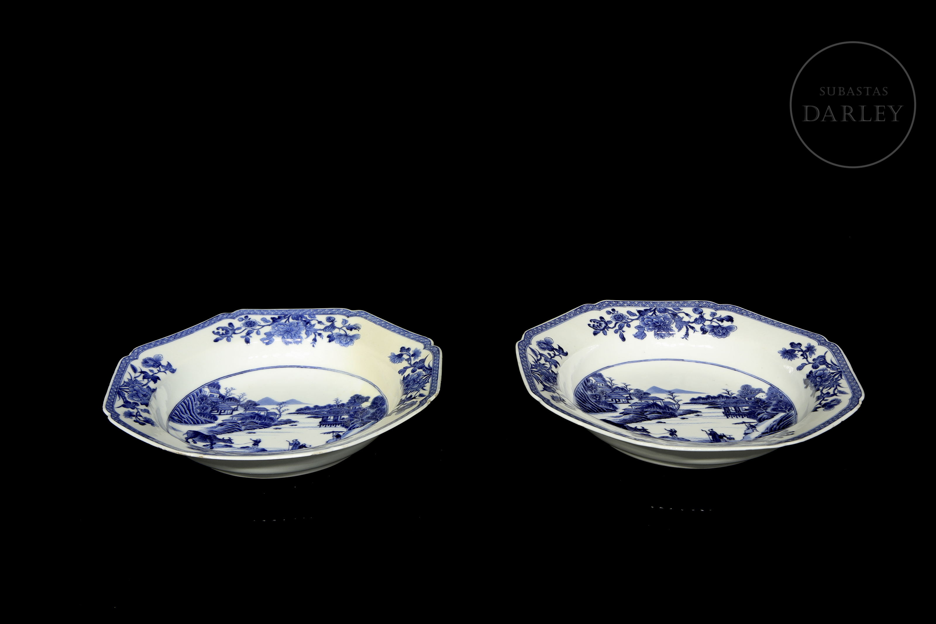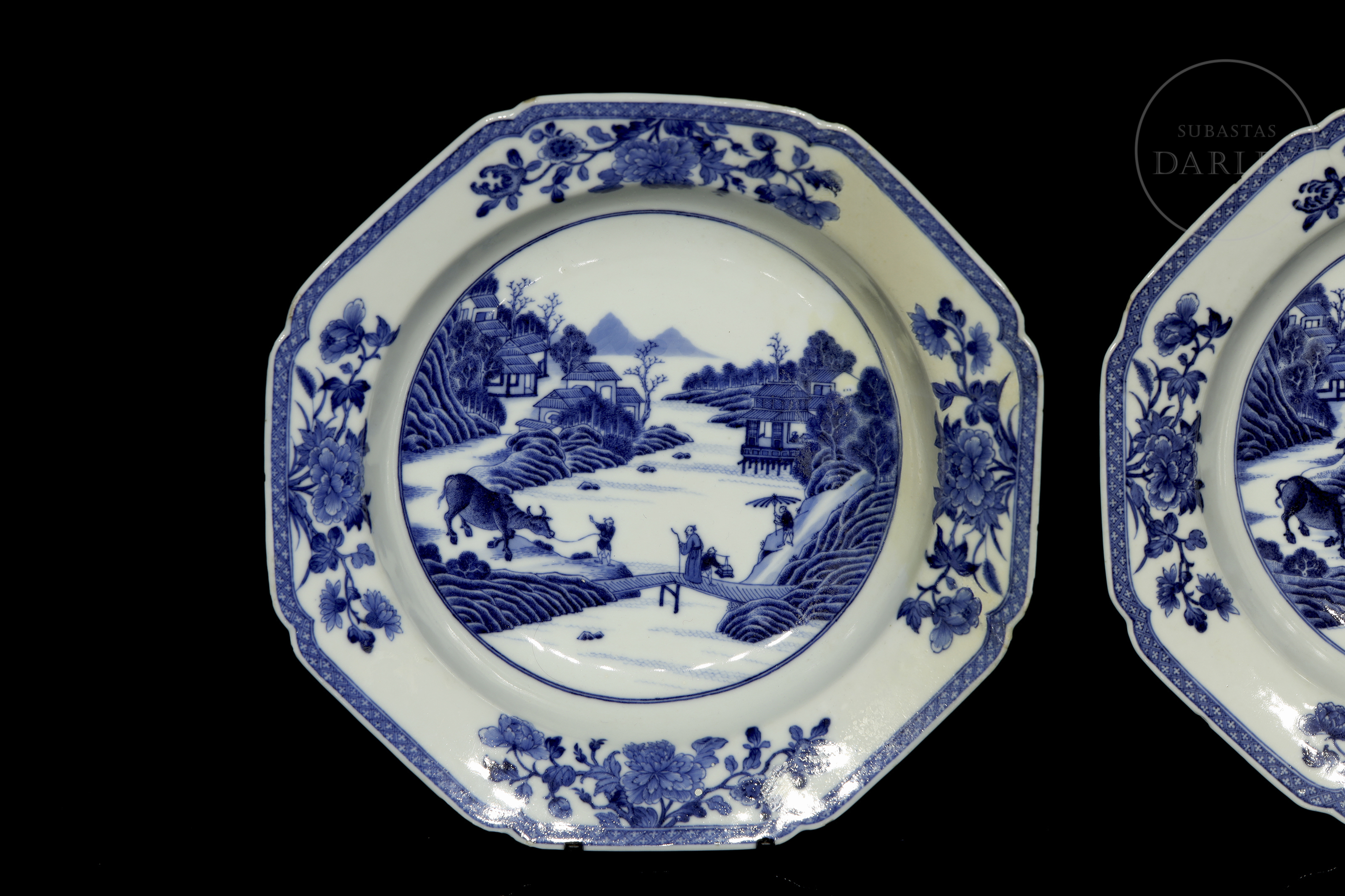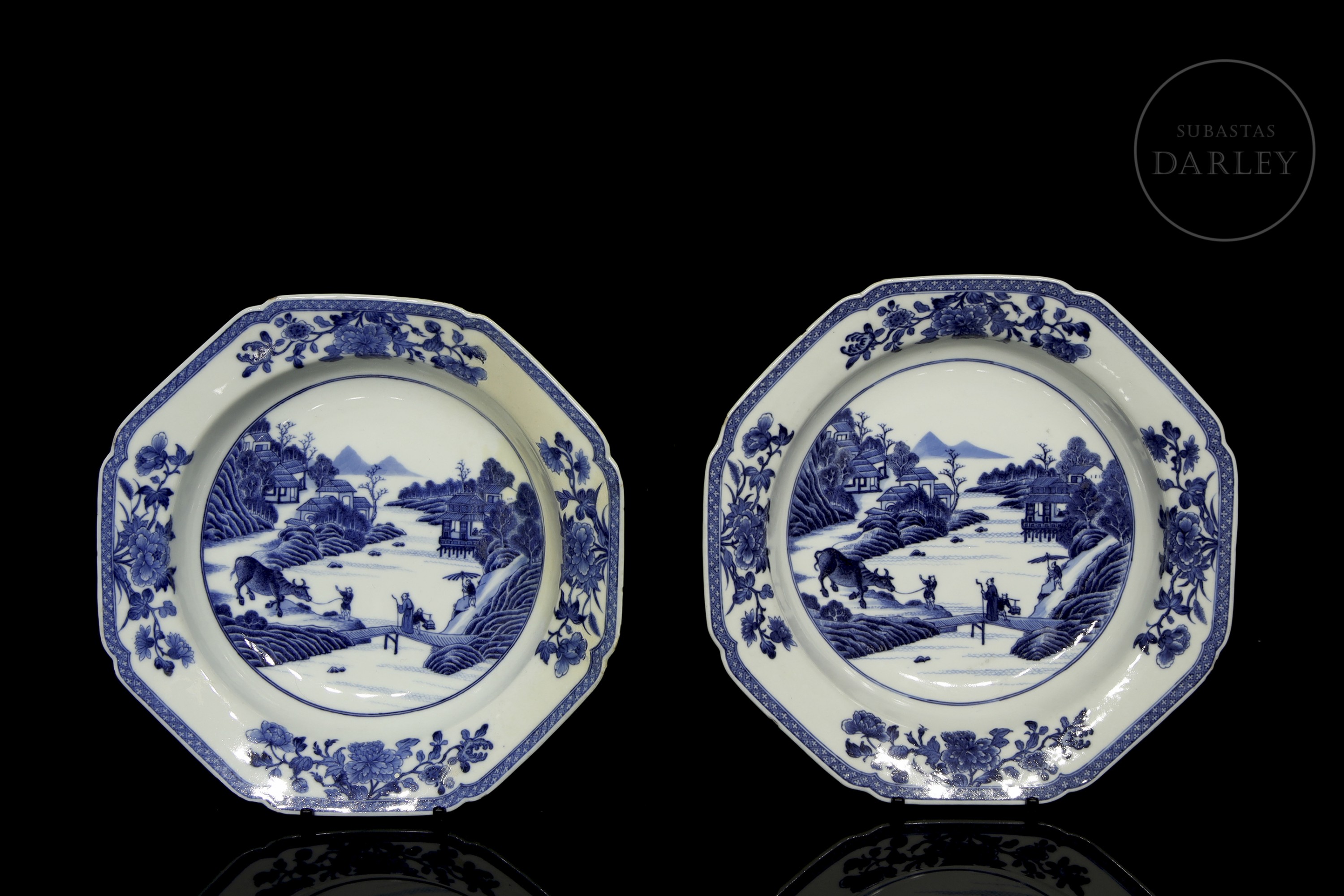 Pareja de platos hondos de porcelana esmaltada con decoración bajo vidriado en blanco y azul cobalto. Poseen un perfil octogonal de ala lobulada y un centro cóncavo. Están decorados con un paisaje rural, el que se observa un poblado atravesado por un río, y un puente concurrido por personas y animales. Dinastía Qing (1644-1912).
