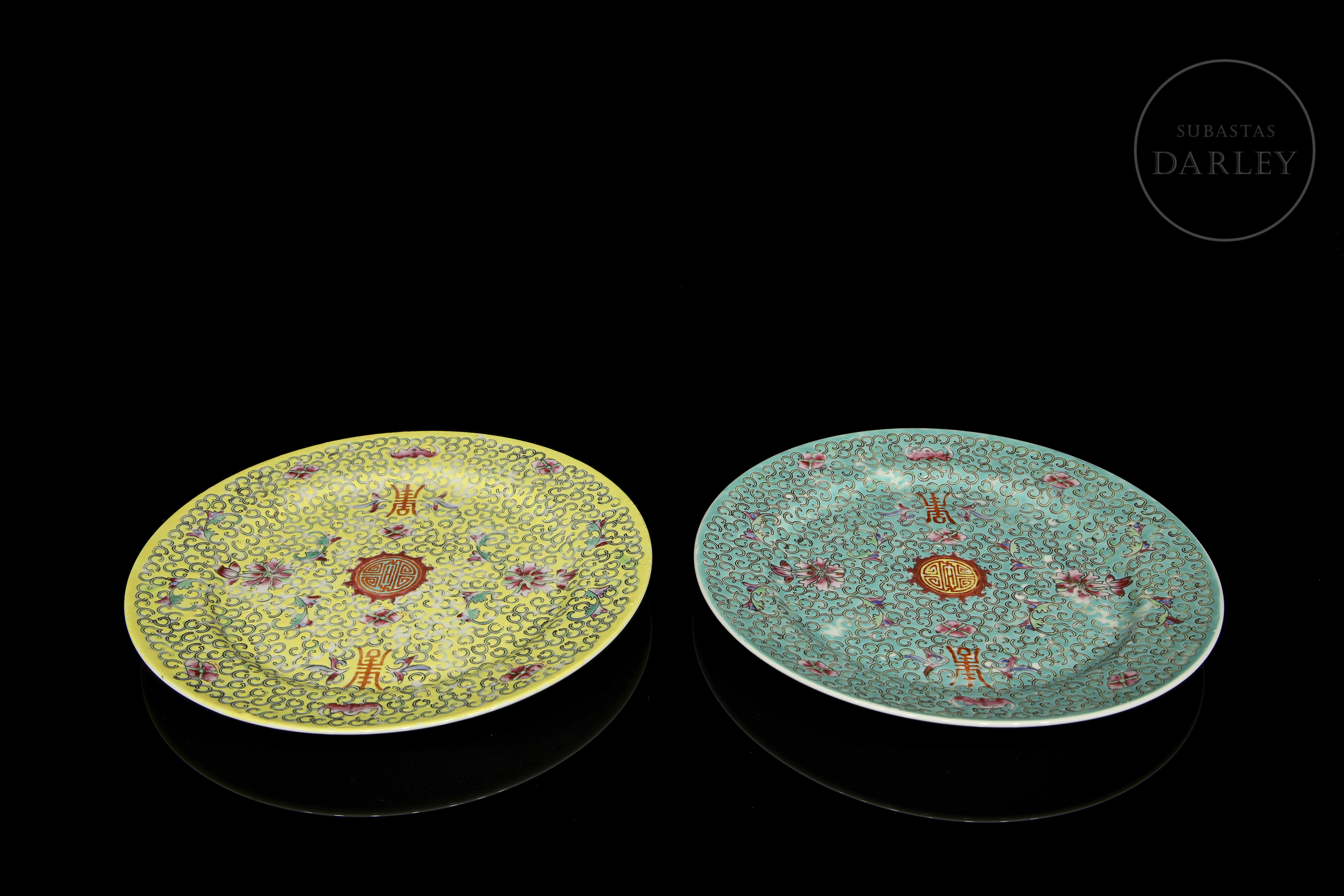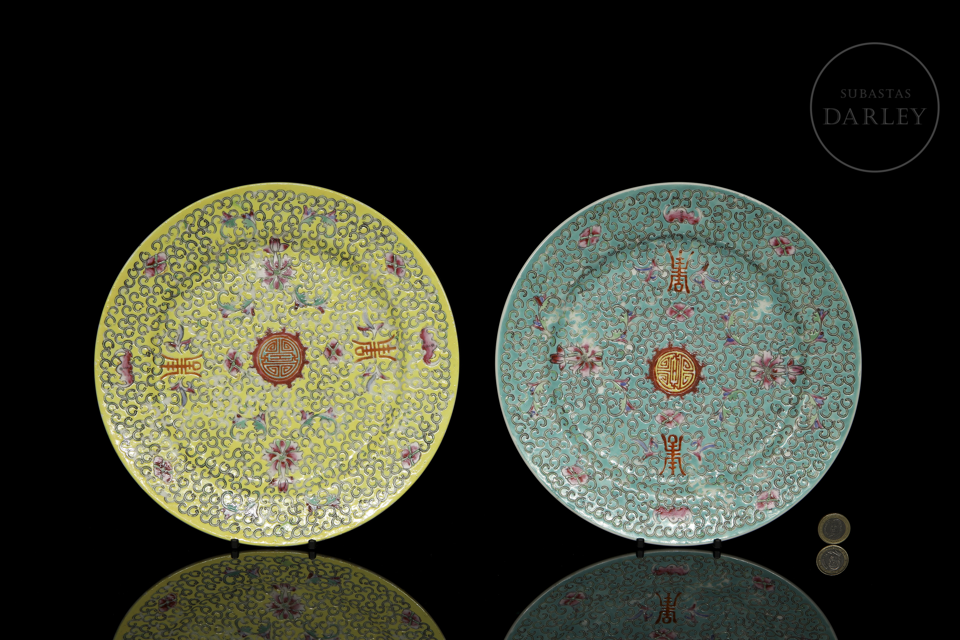Pareja de platos esmaltados "Lotos y murciélagos", s.XX