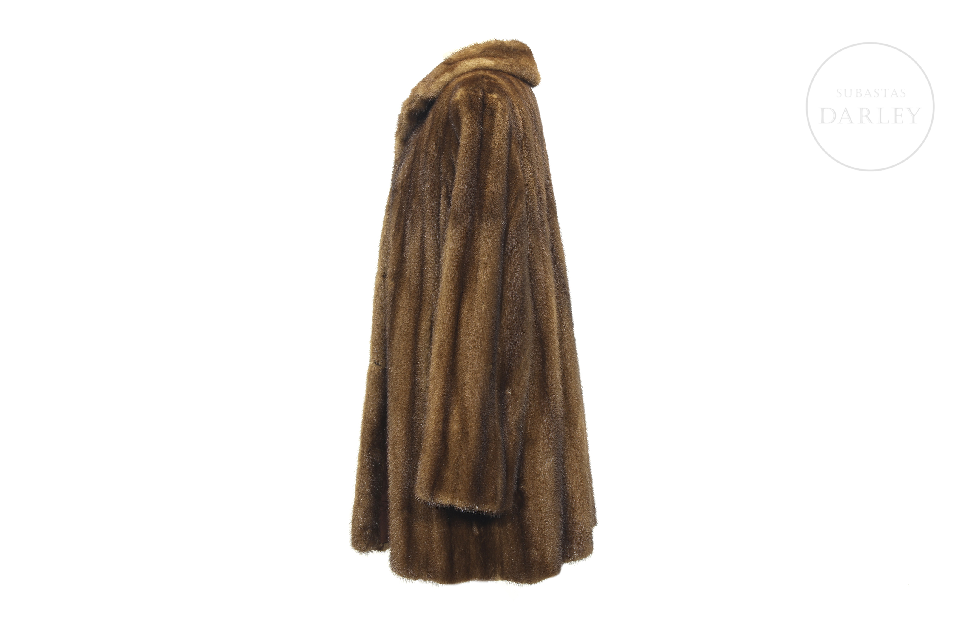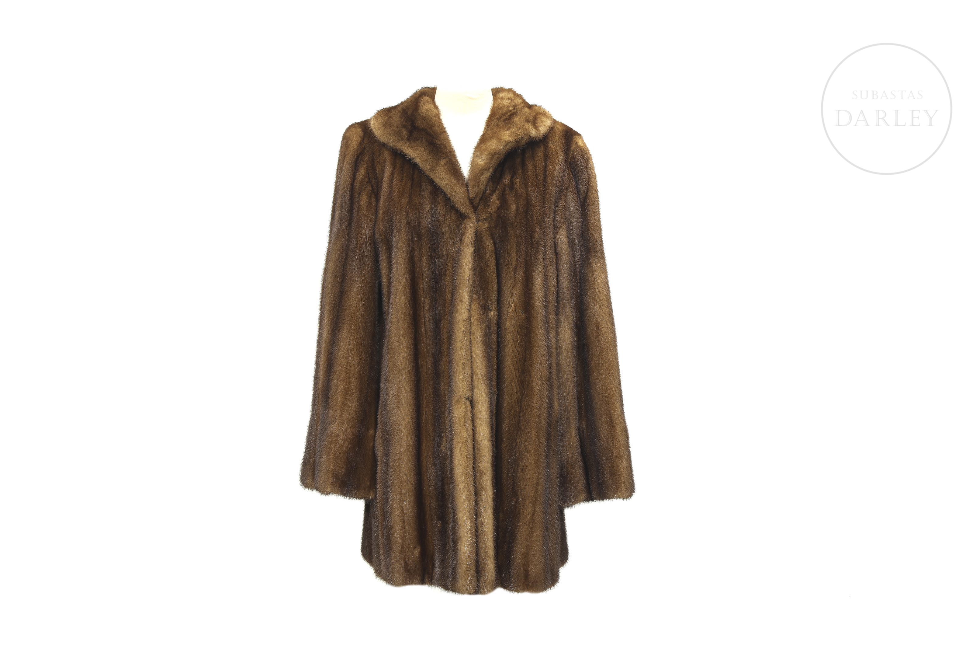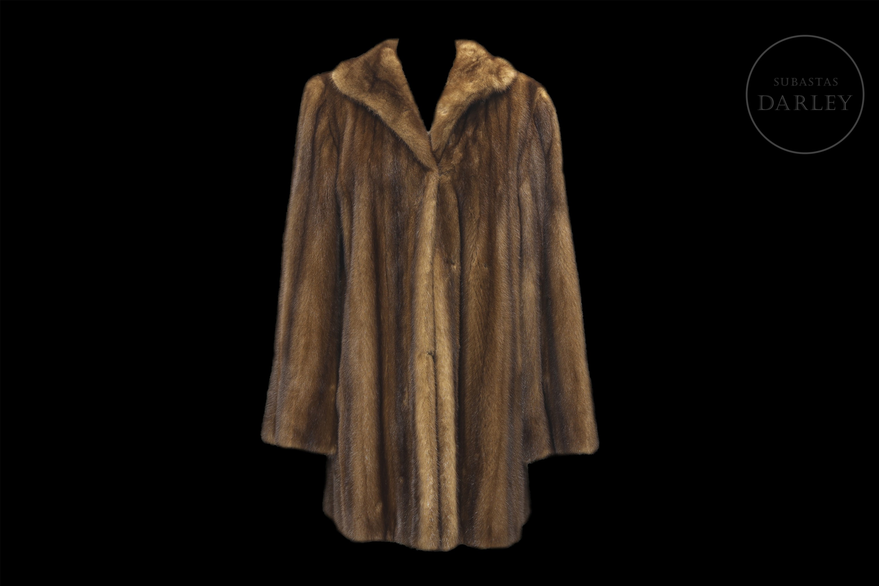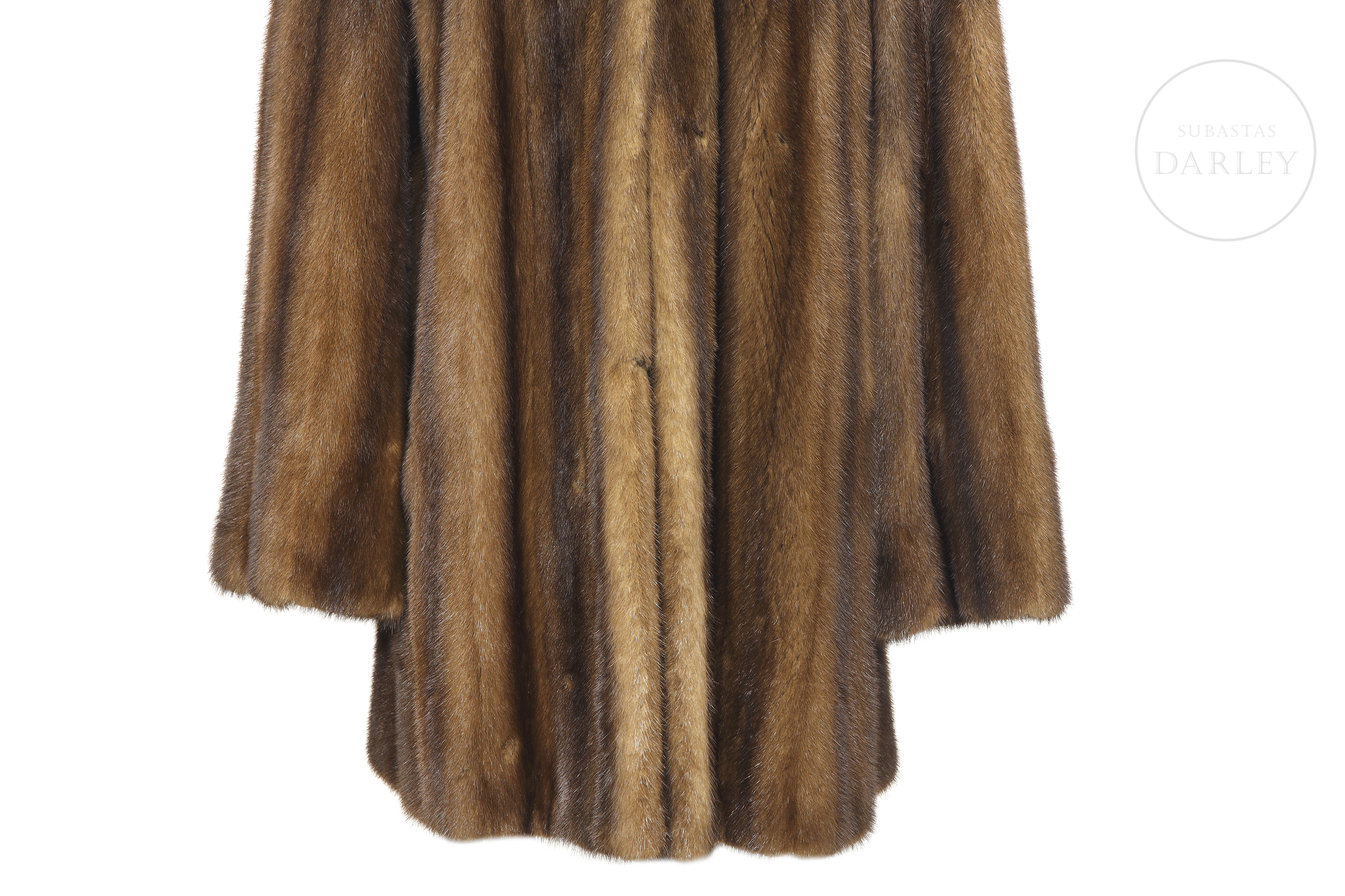 Prenda de alta peletería confeccionada con lomos de visón en tonos castaños y dorados, con un diseño de caída fluida y gran suavidad. Presenta cuello de solapa redondeada y mangas de corte recto.