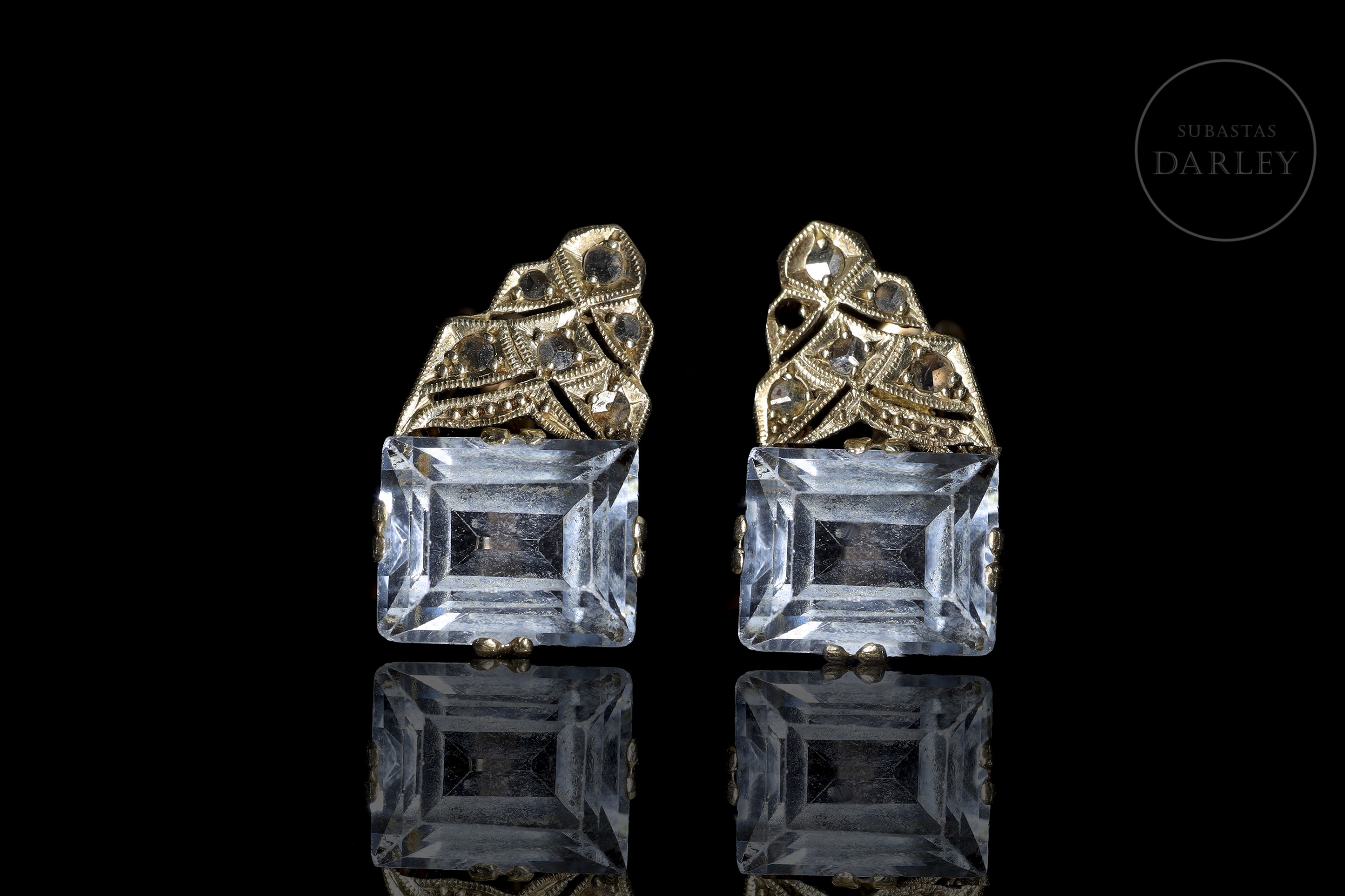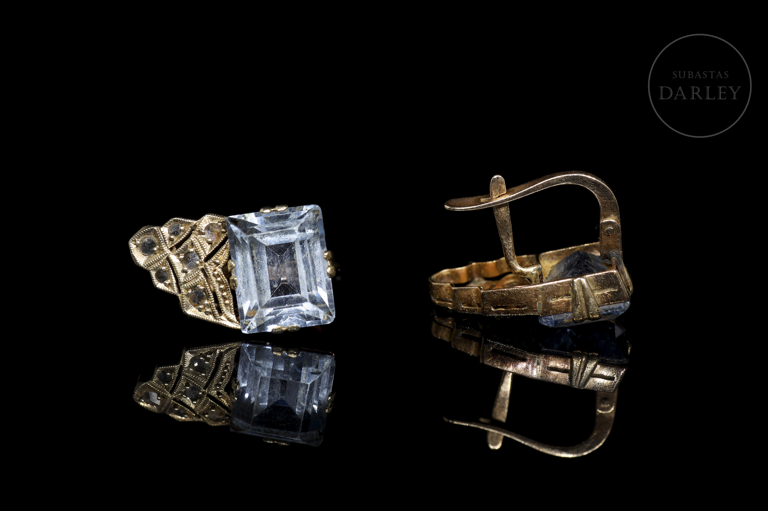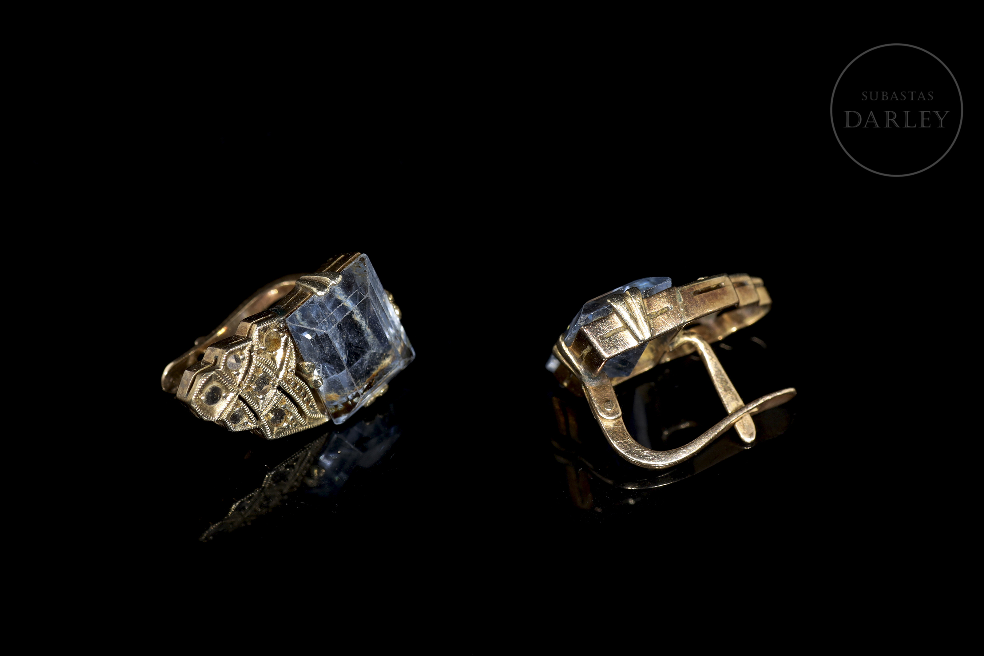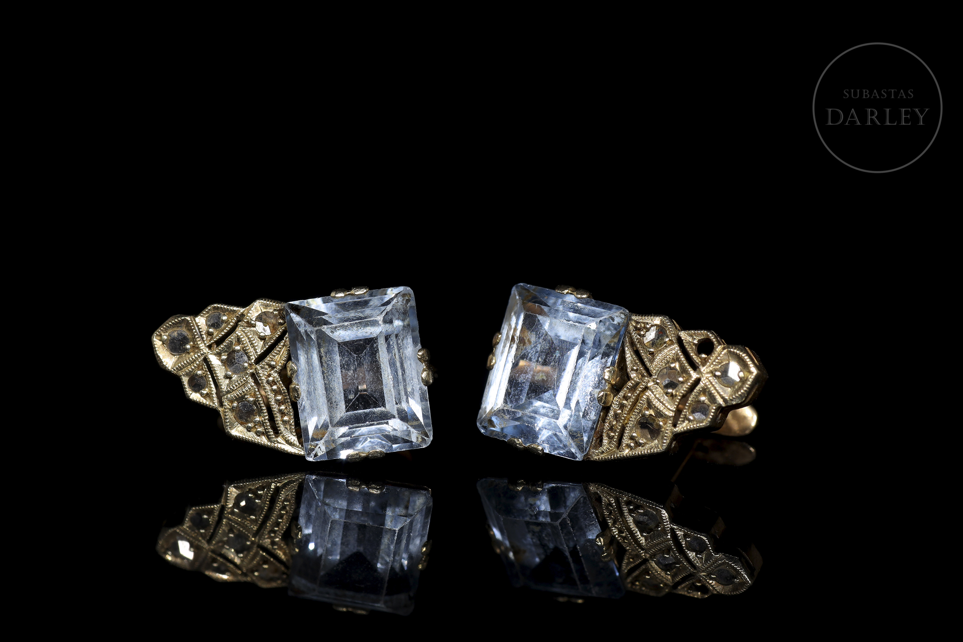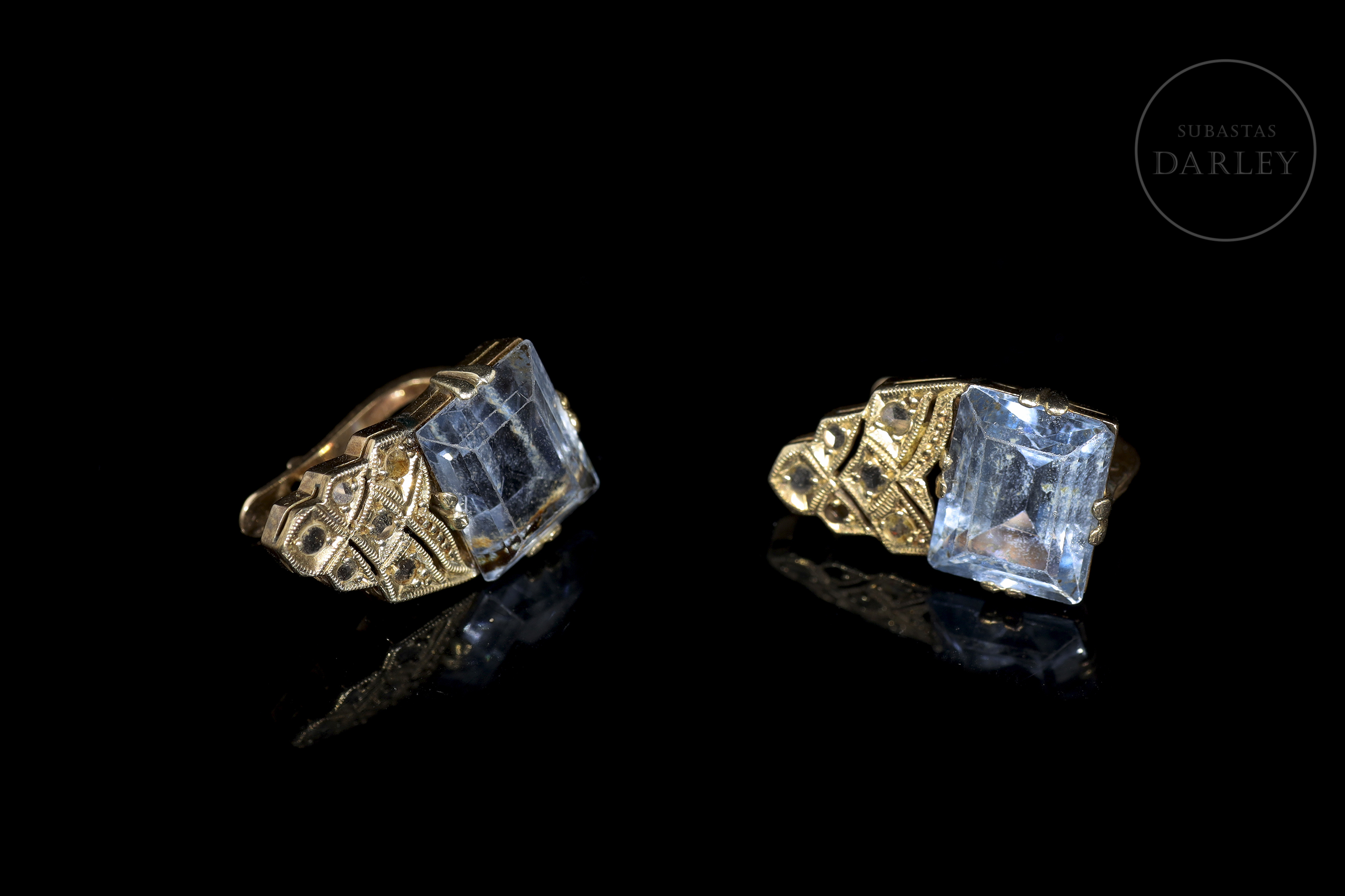 Pendientes de oro amarillo de 14 kt, de estilo Art Déco, cada uno presidido por una aguamarina de talla rectangular, engastada en garras. El diseño, de formas geométricas, presenta un motivo superior calado con pequeñas piedras engastadas. Cierre de tipo pala abatible.
