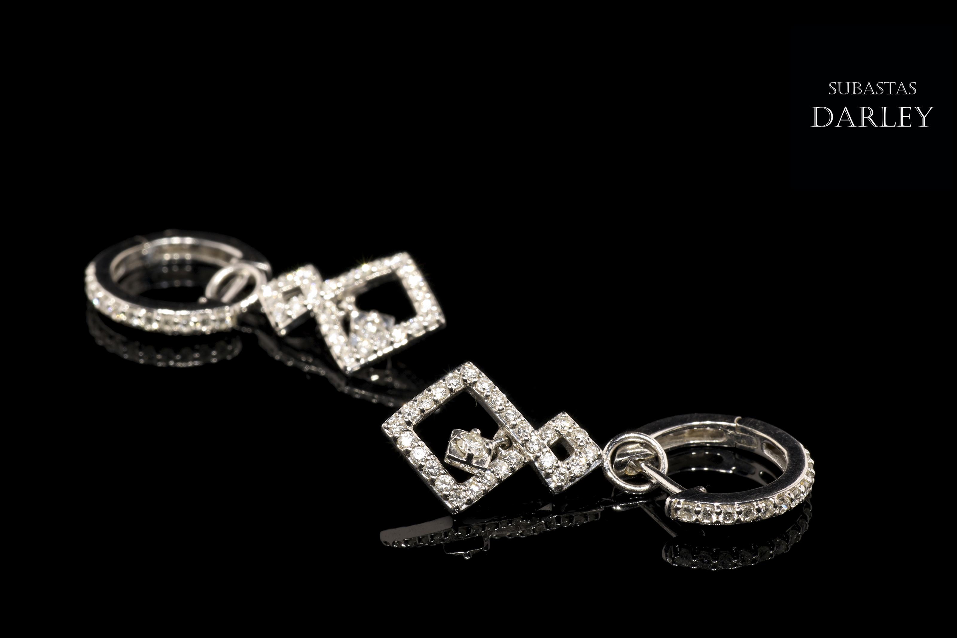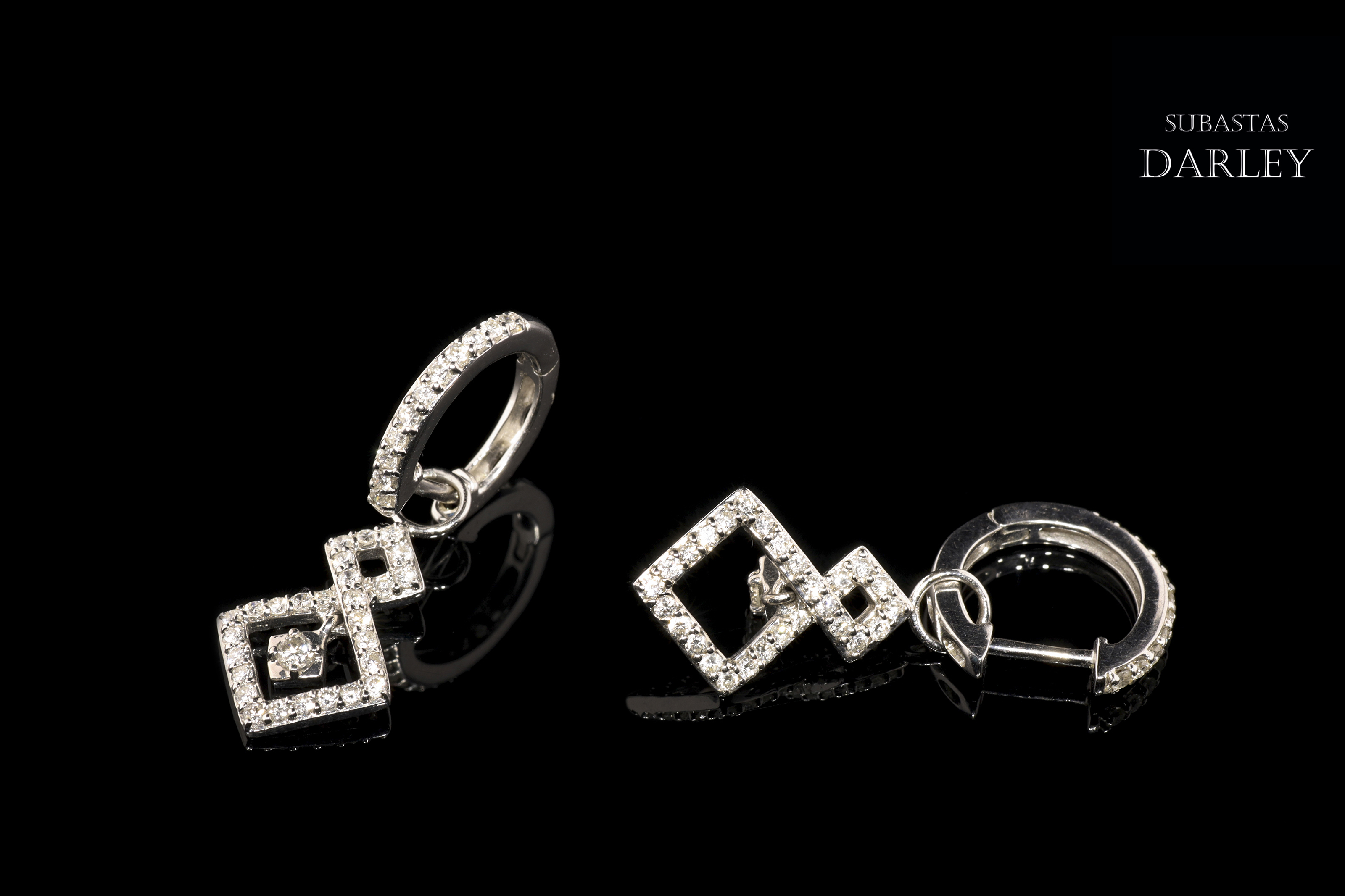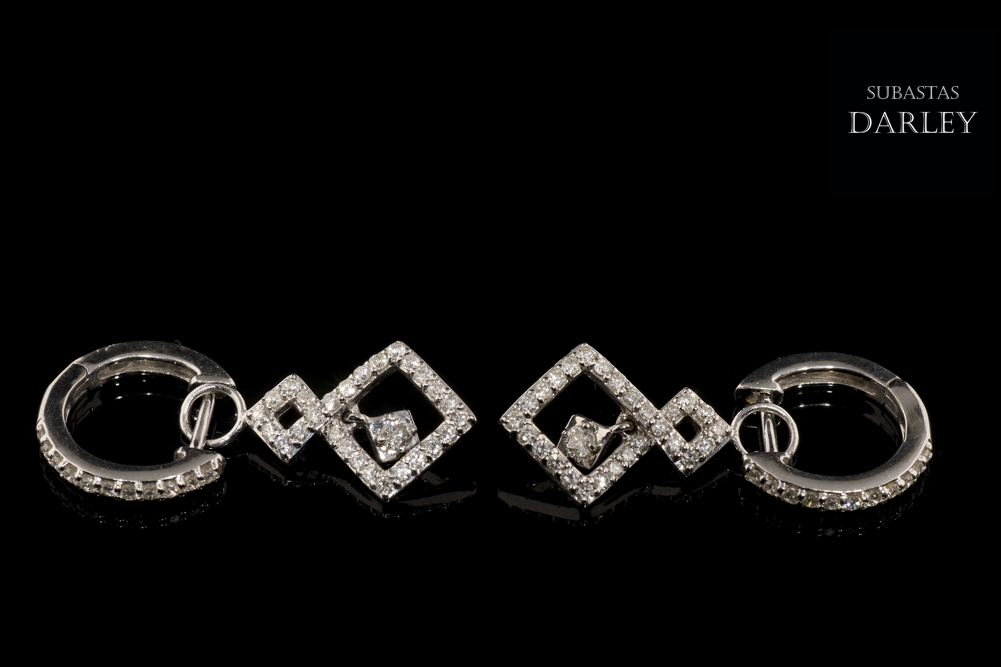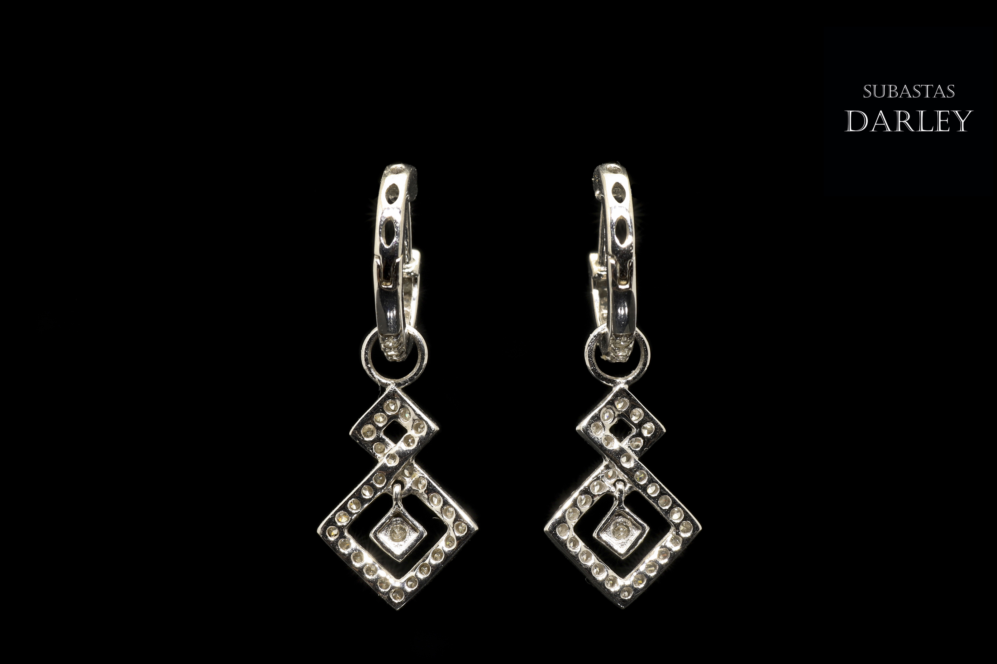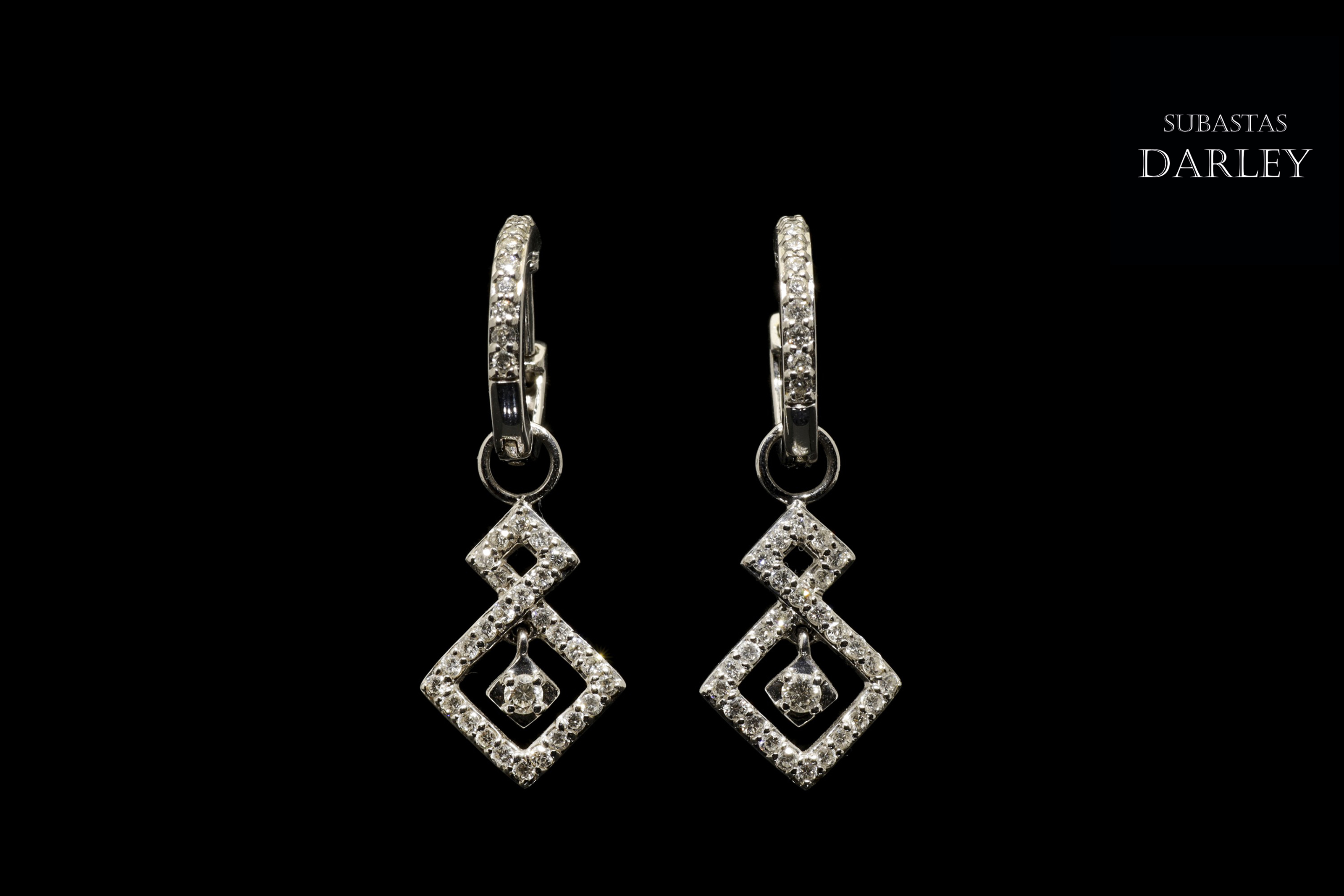 Pendientes en oro blanco de 18k y diamantes. Formado por dos piezas, siendo la de abajo móvil, en forma de doble rombo, todo ello adornado en su parte frontal por diamantes talla brillante, engarzados en garras con un peso total de 0,82 ct.