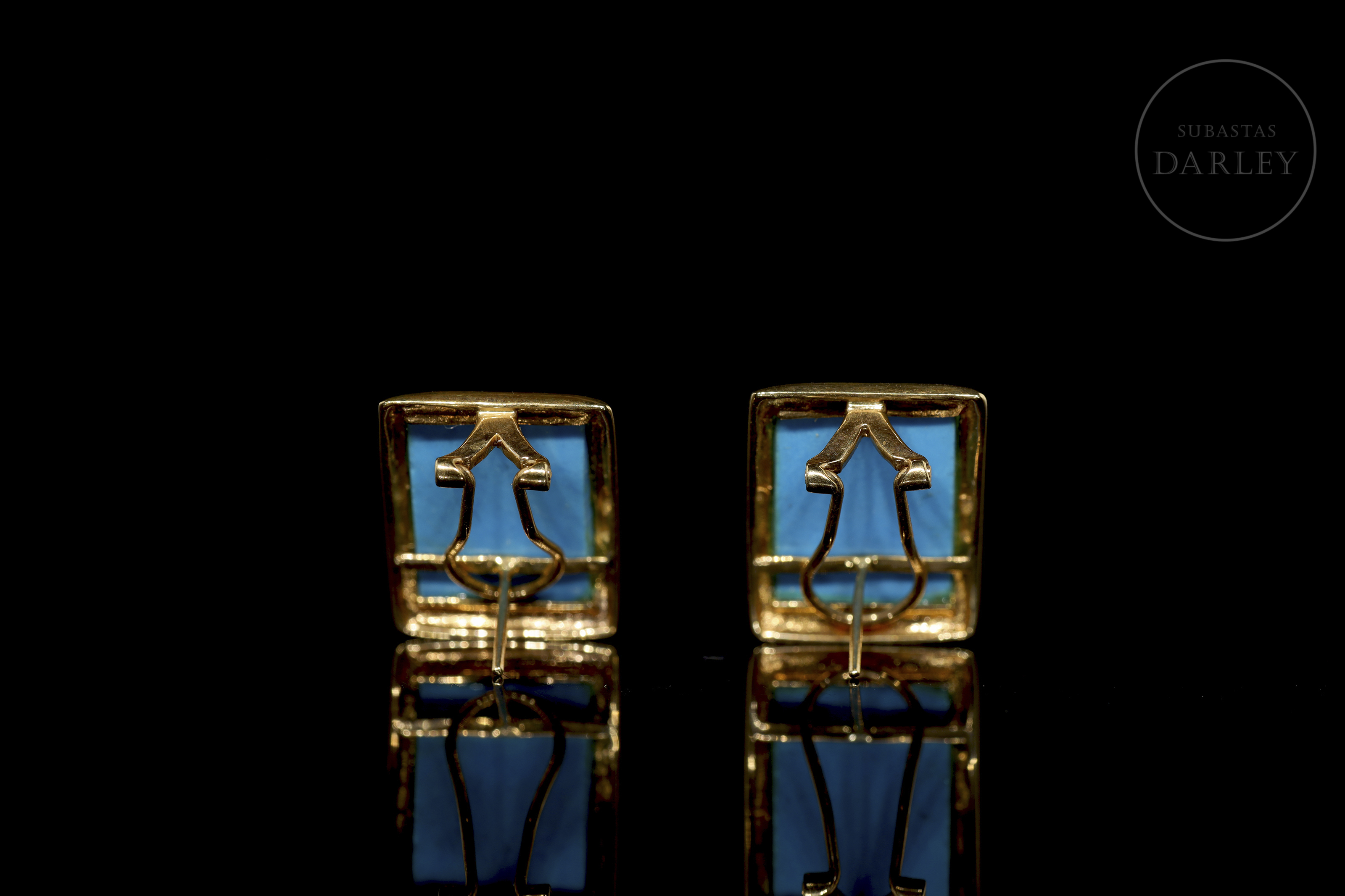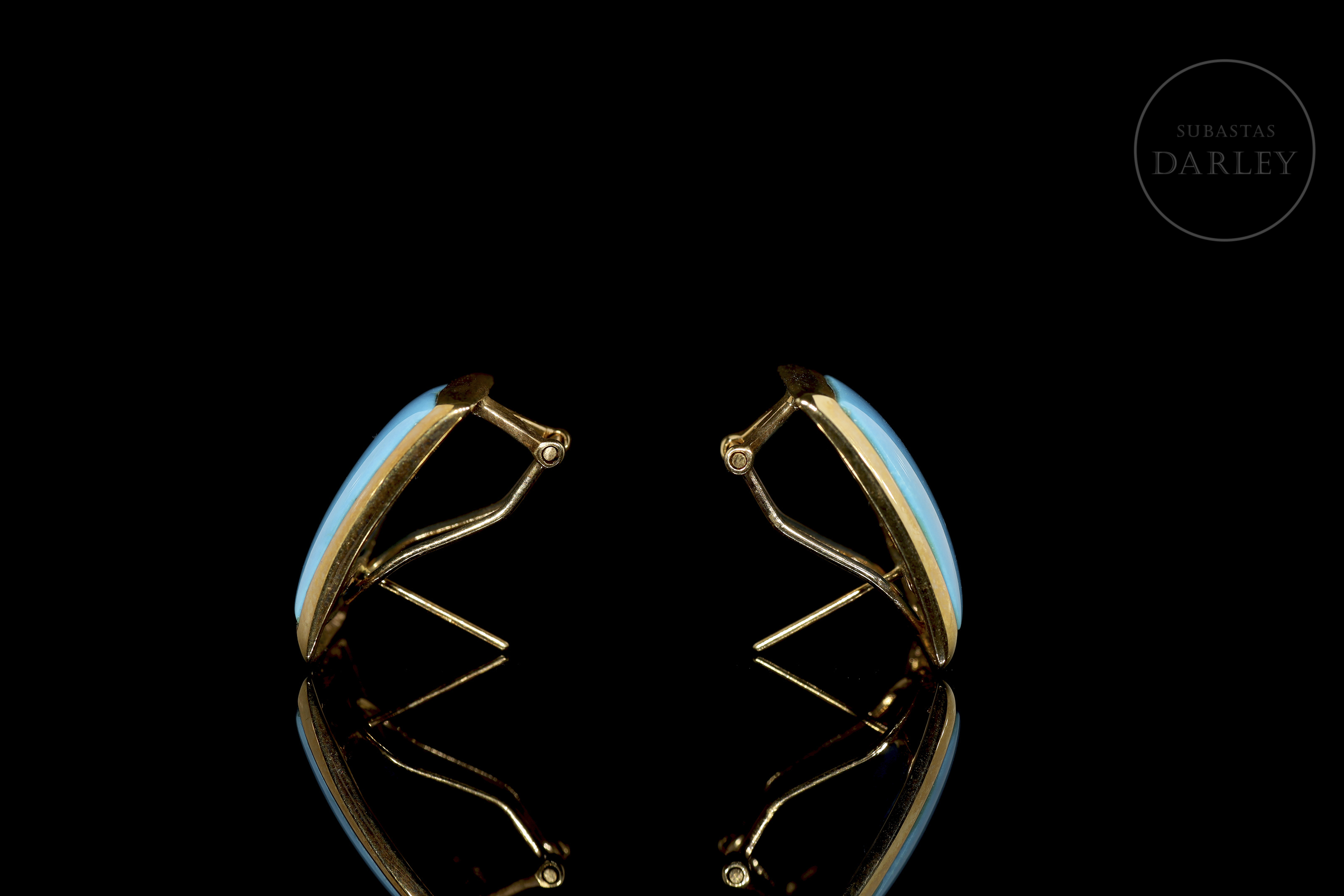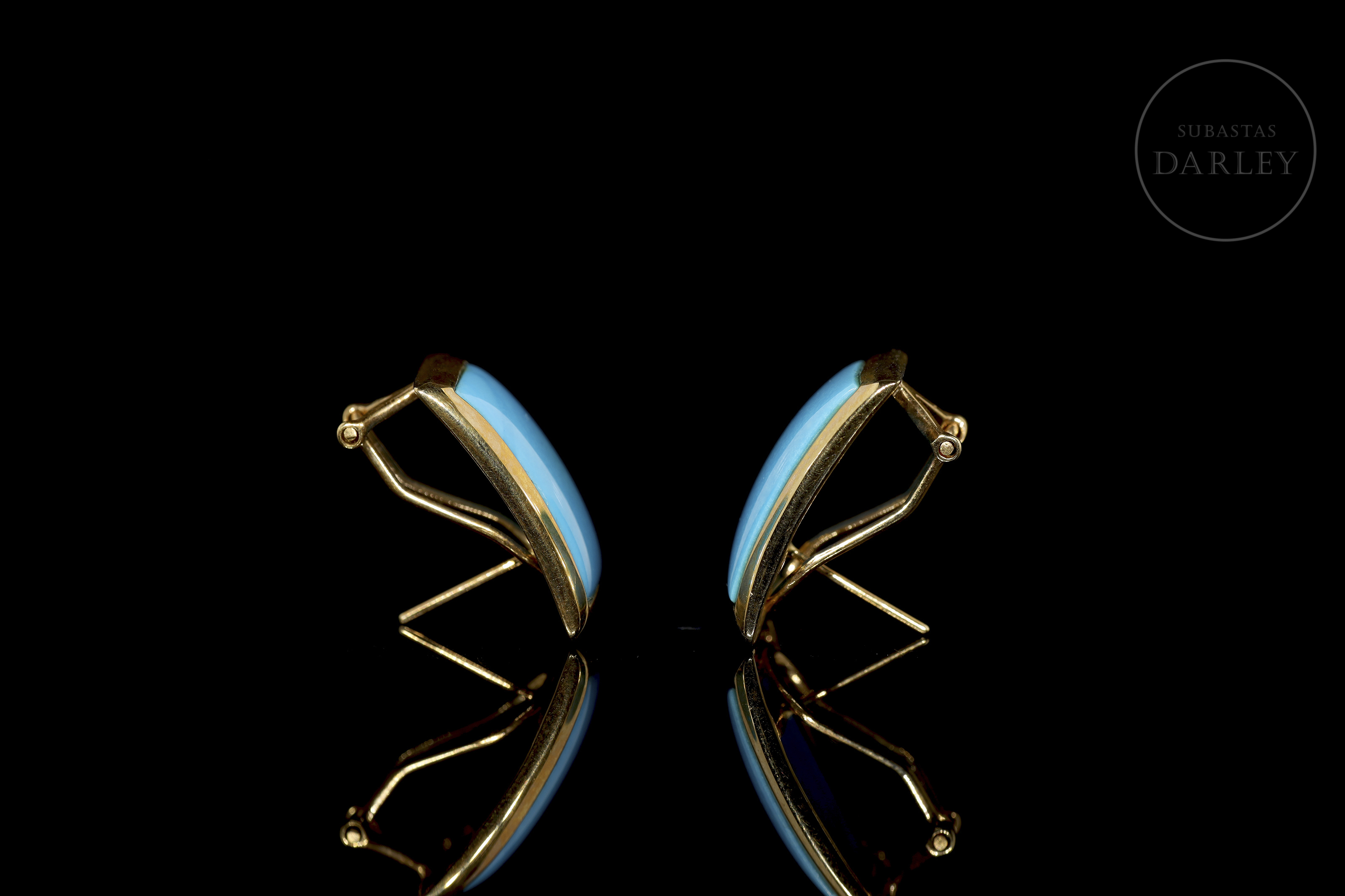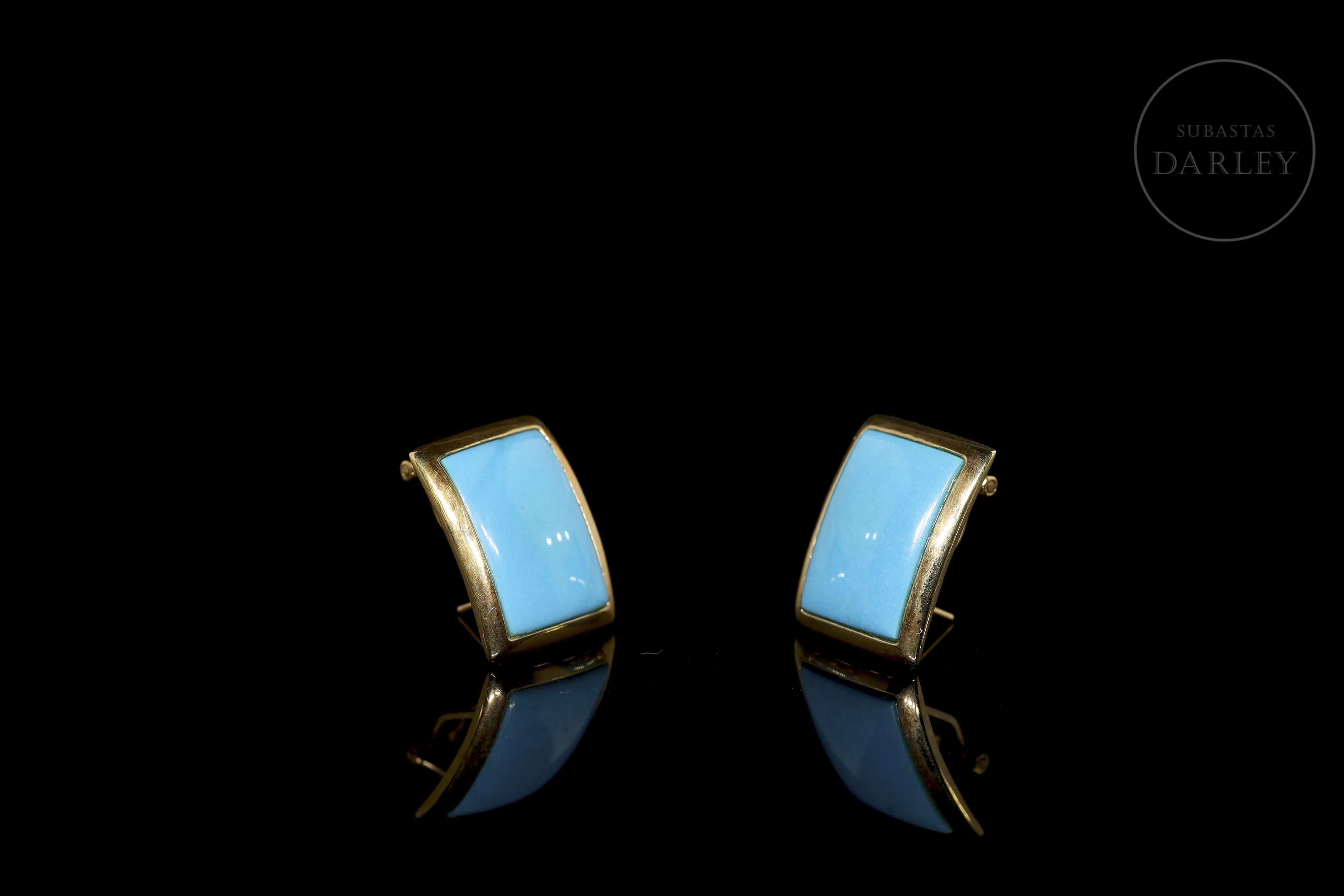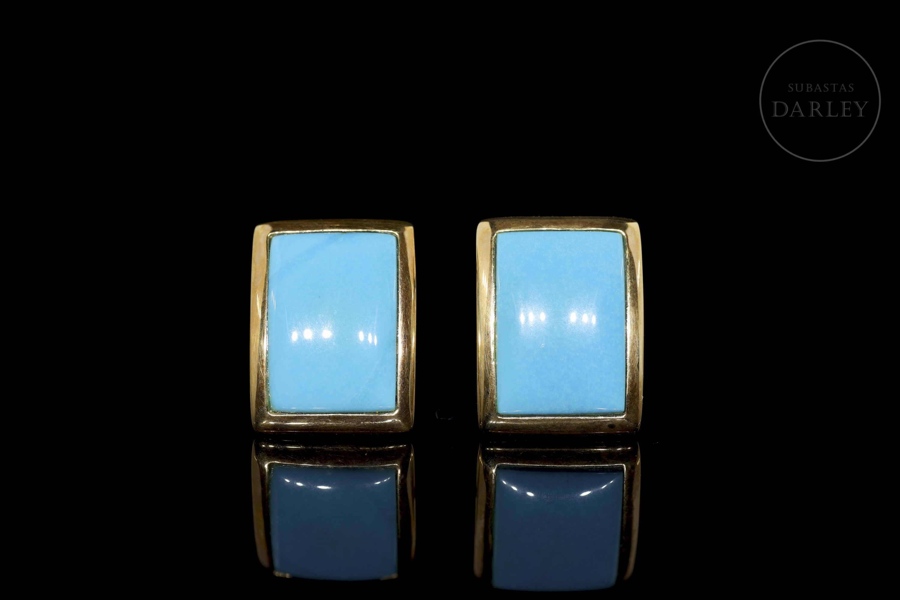 Pareja de pendientes en oro amarillo de 18k, adornados por una turquesa tallada de forma rectangular, engastada en bisel. Cierre tipo pala Omega.
