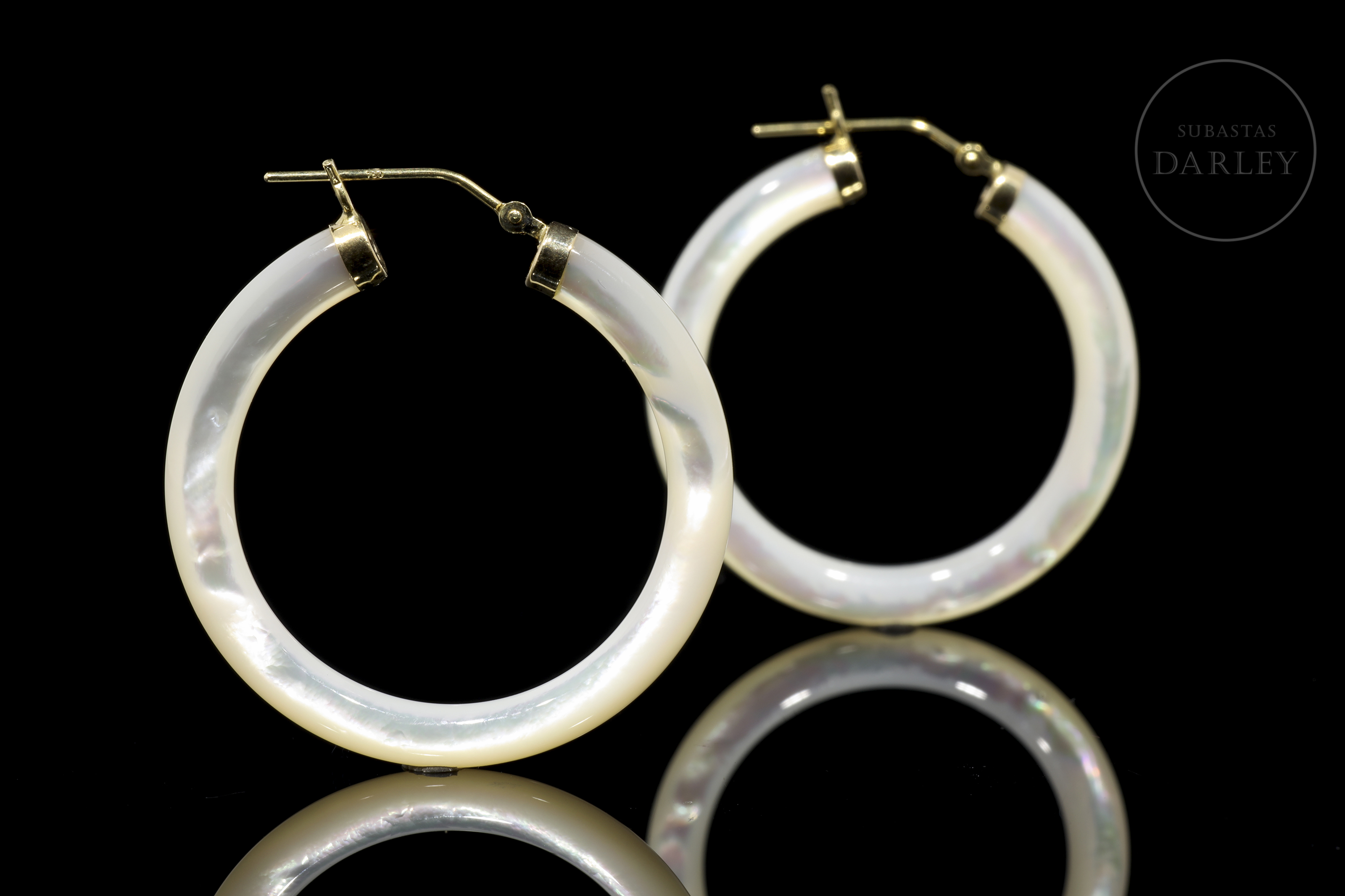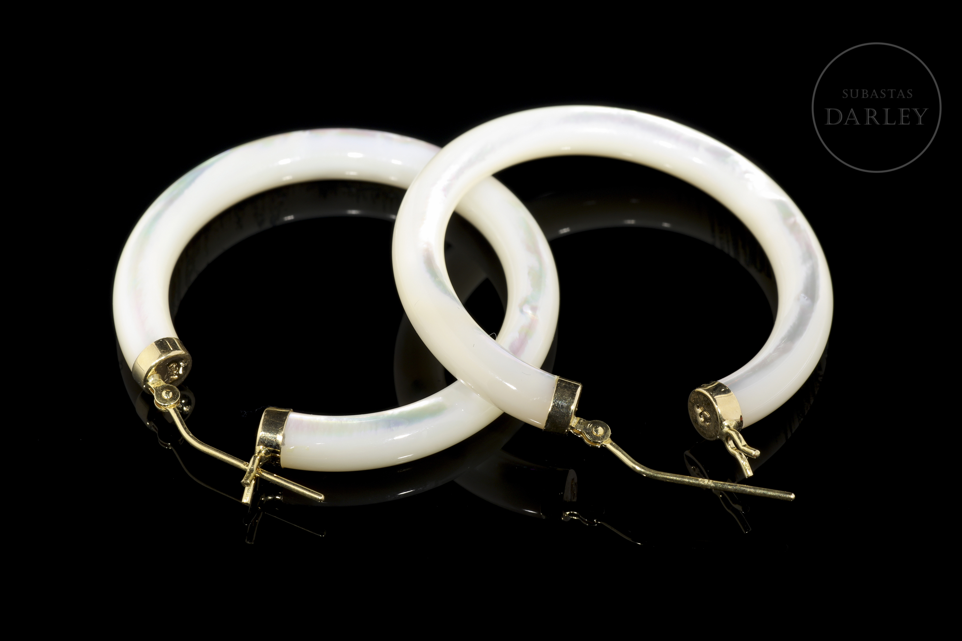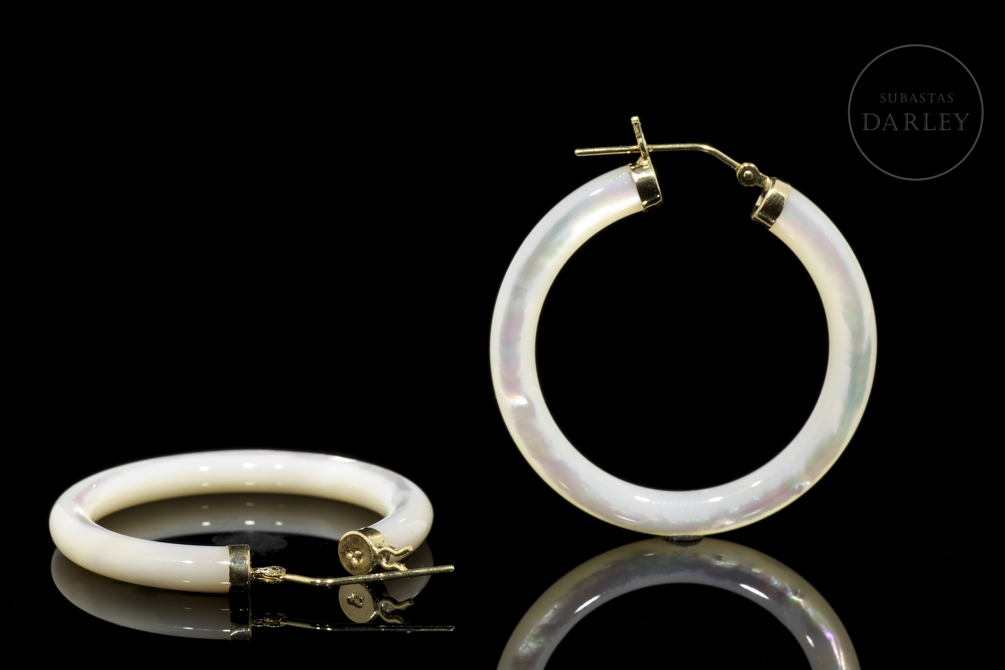 Modelo clásico de aro al que da forma una pieza tubular de nácar natural que cierra sus extremos con capuchones. Cierre tipo martillo.