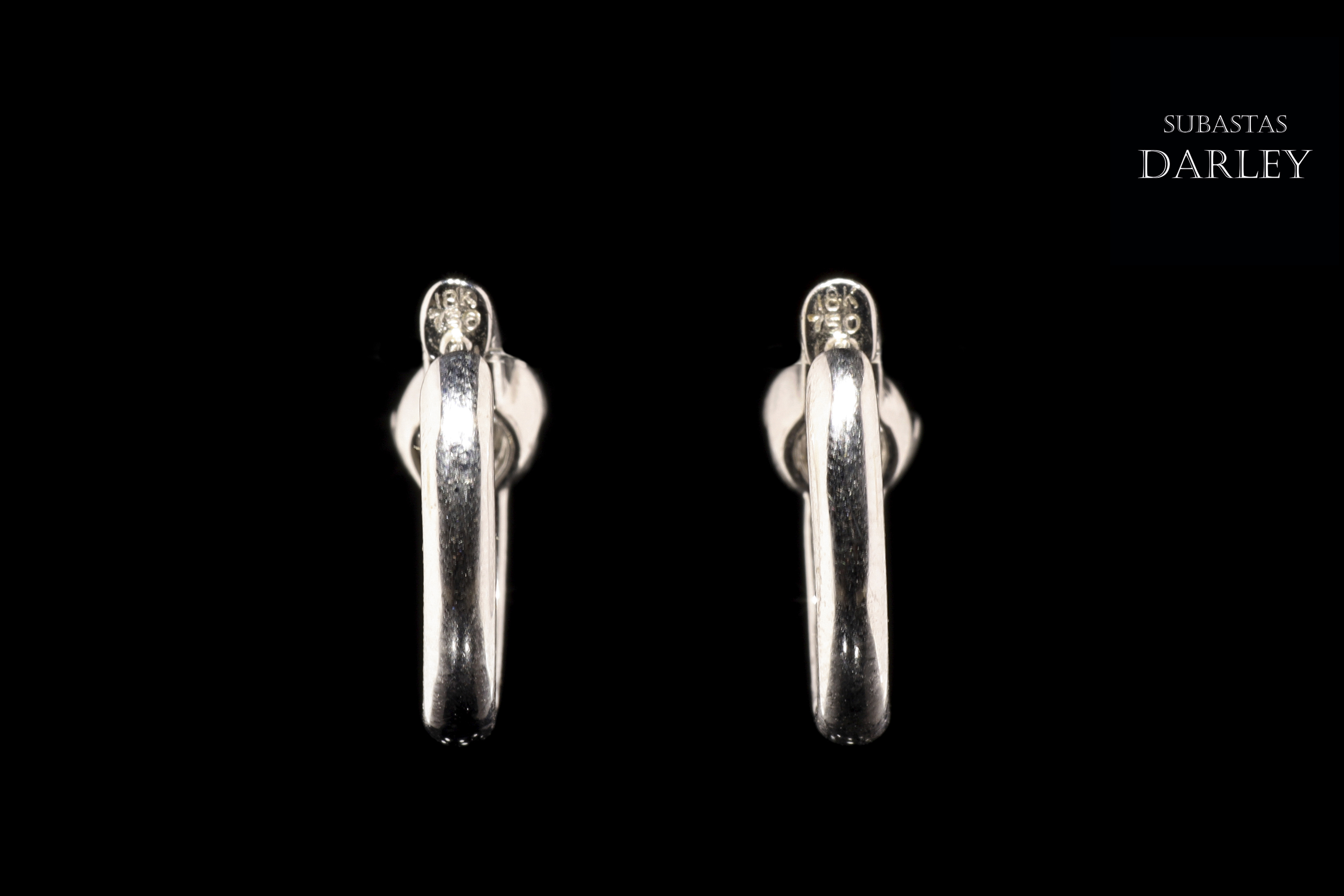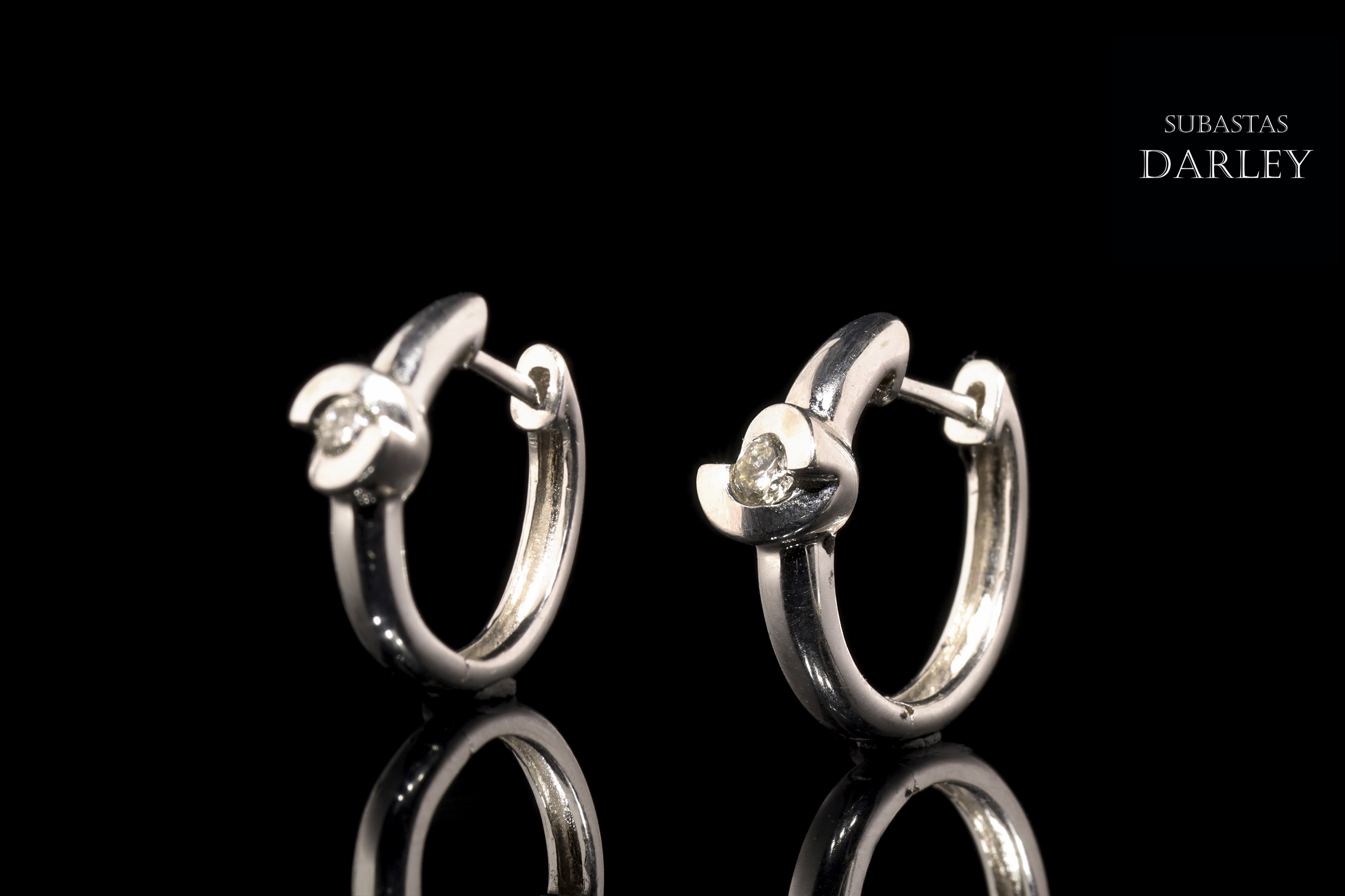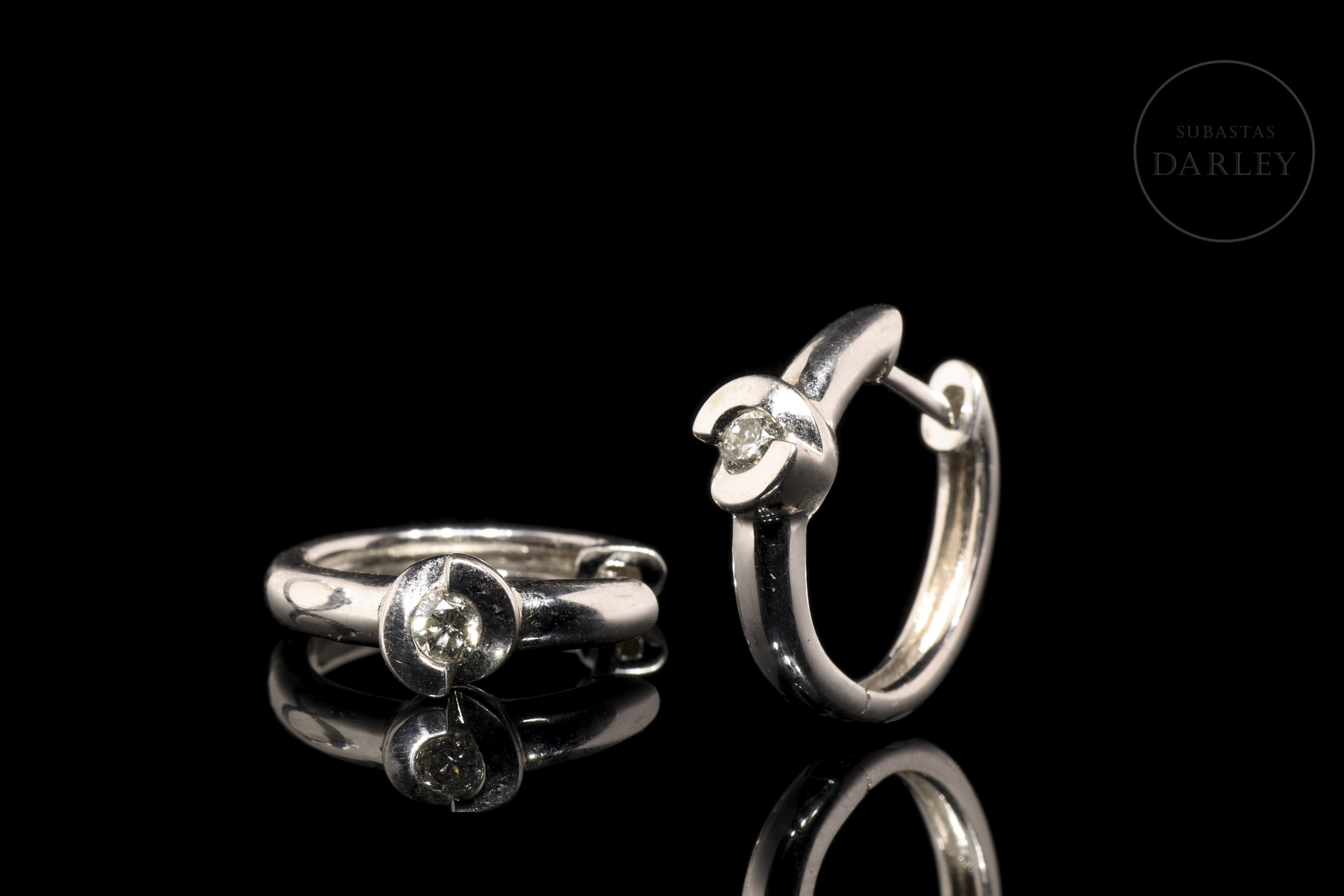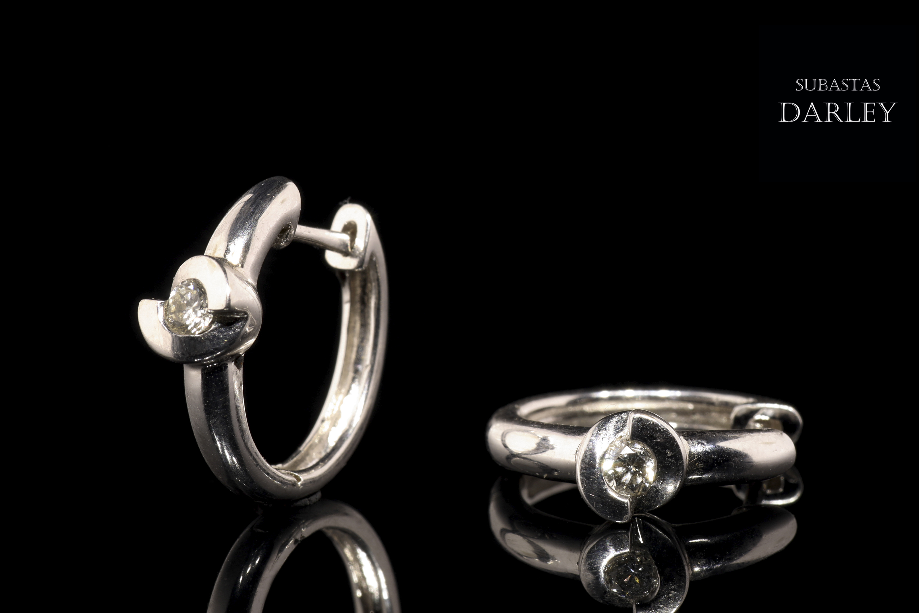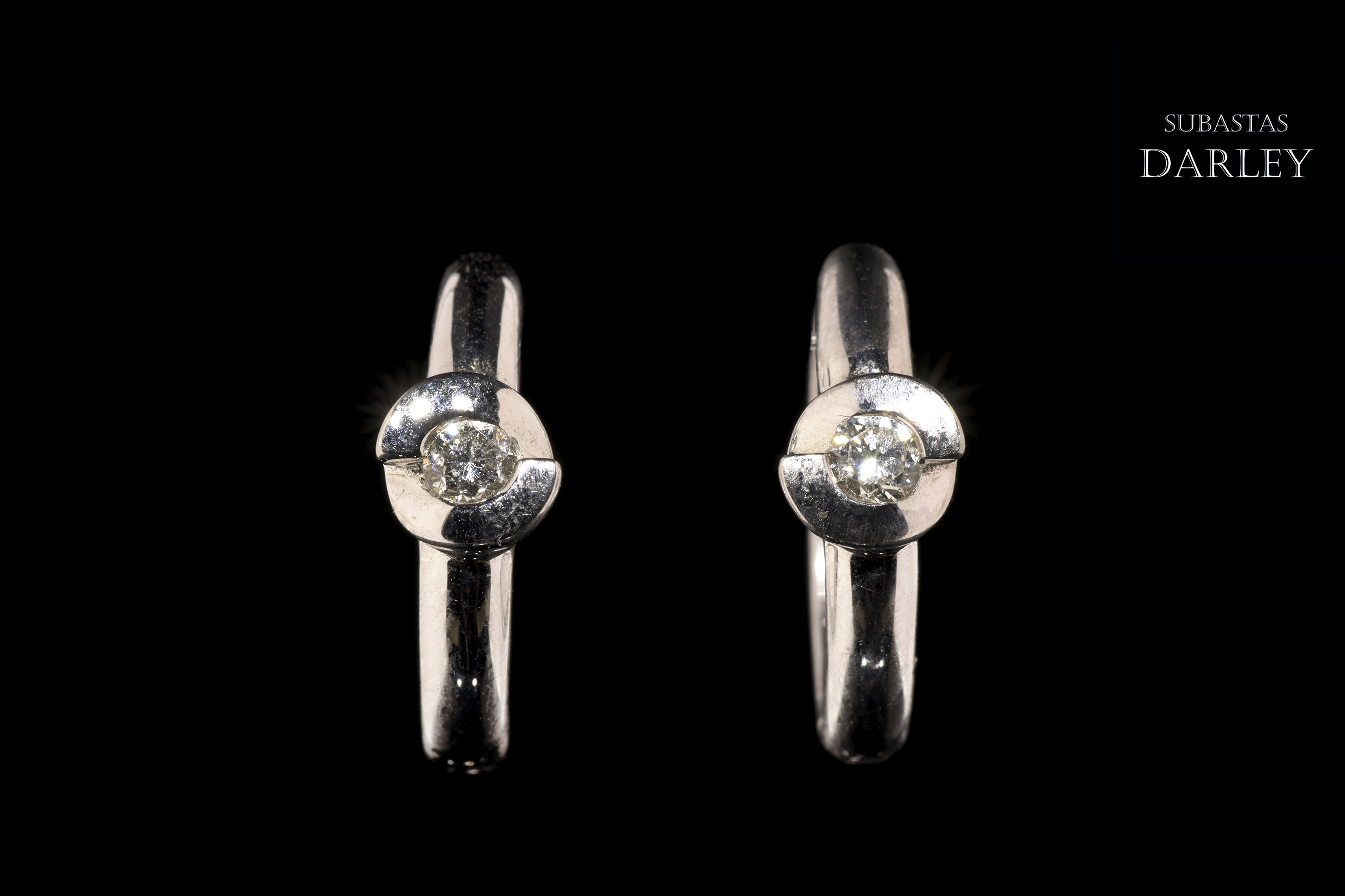 Modelo tipo aro, realizados en oro blanco de 18k, con frontis de media caña de 3 mm que coloca en su centro un diamante, talla brillante, peso total 0,23 ct, engarzado en dos medios biseles a modo de chatón. Color I, Calidad SI.