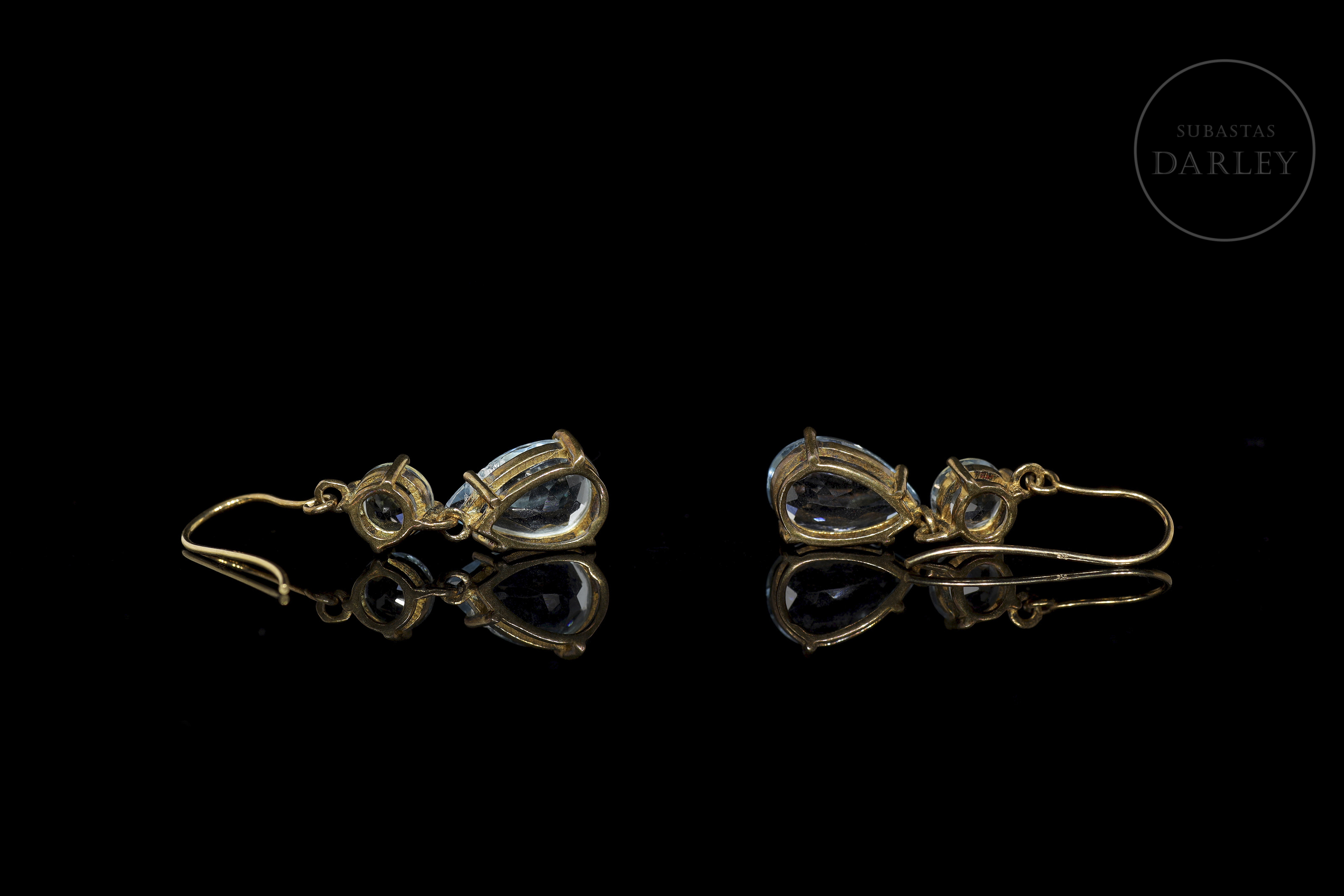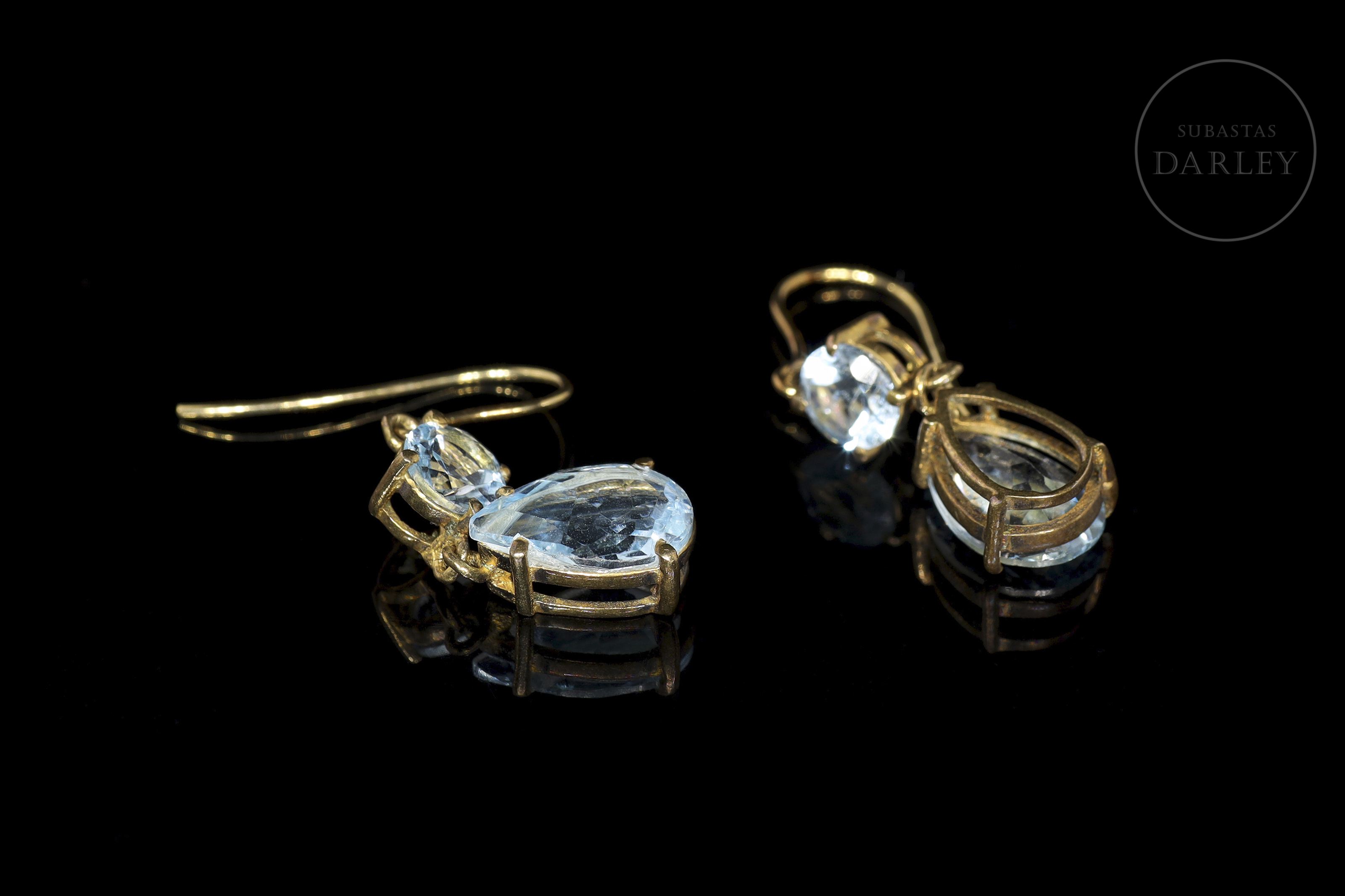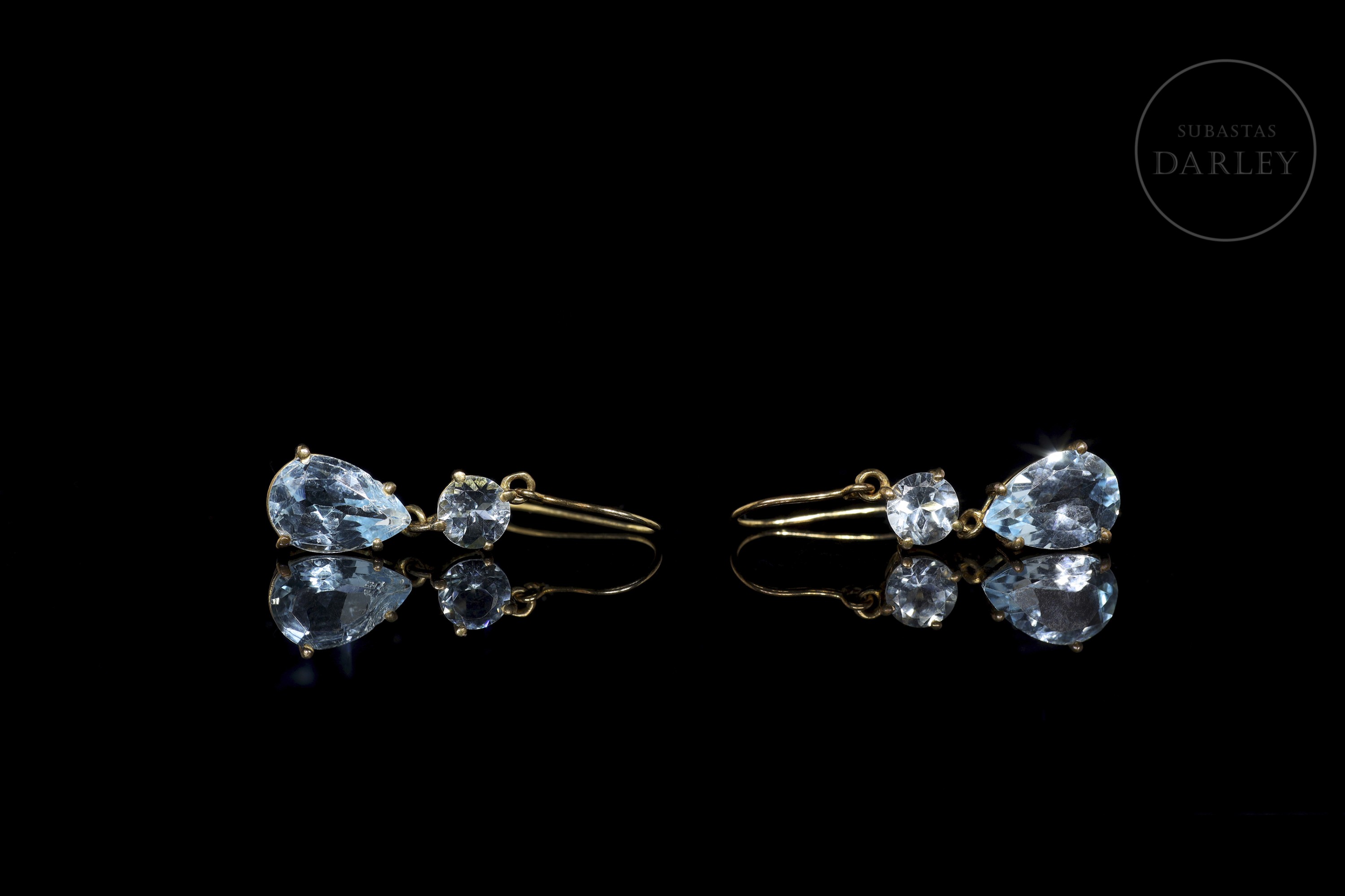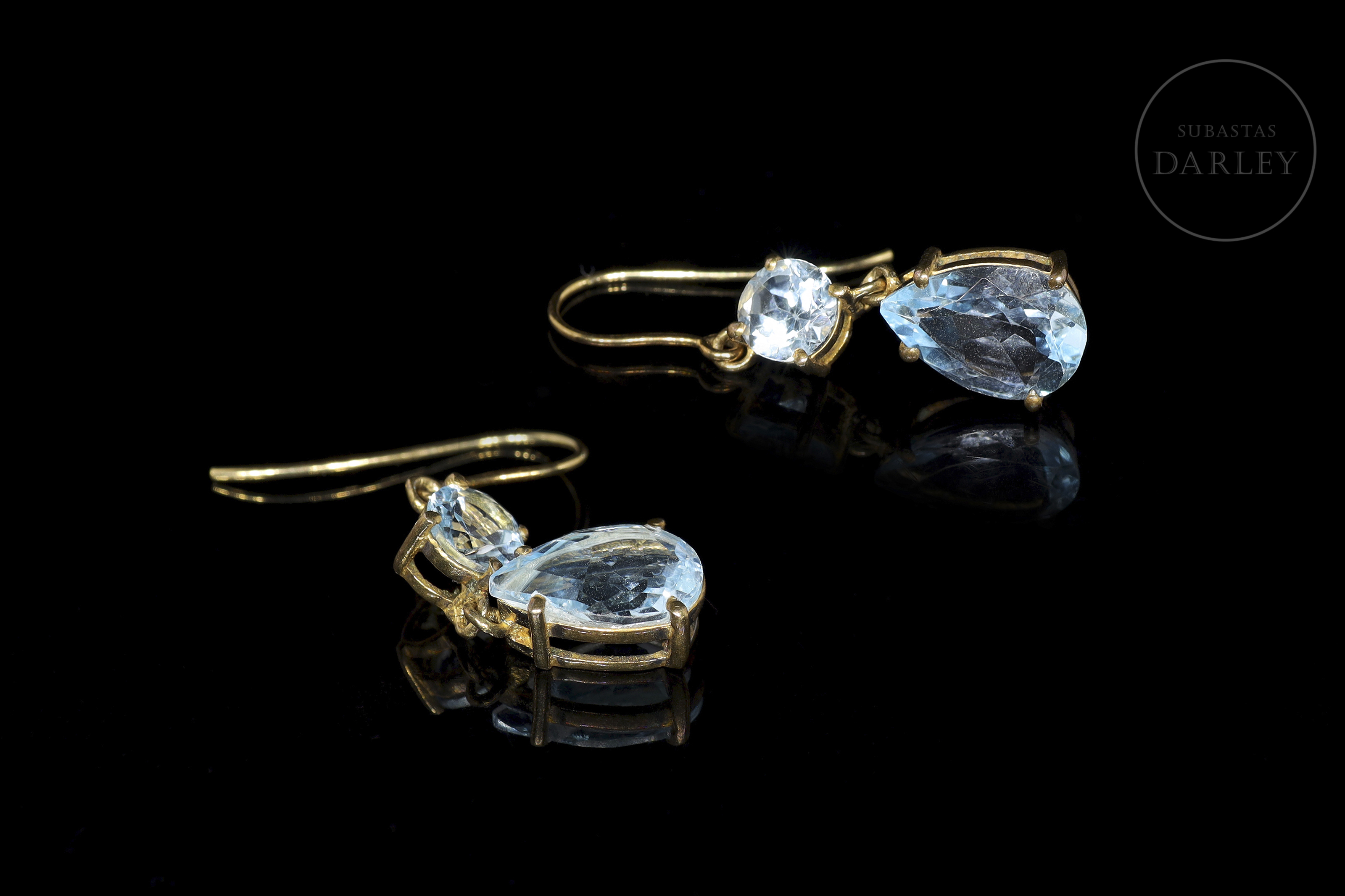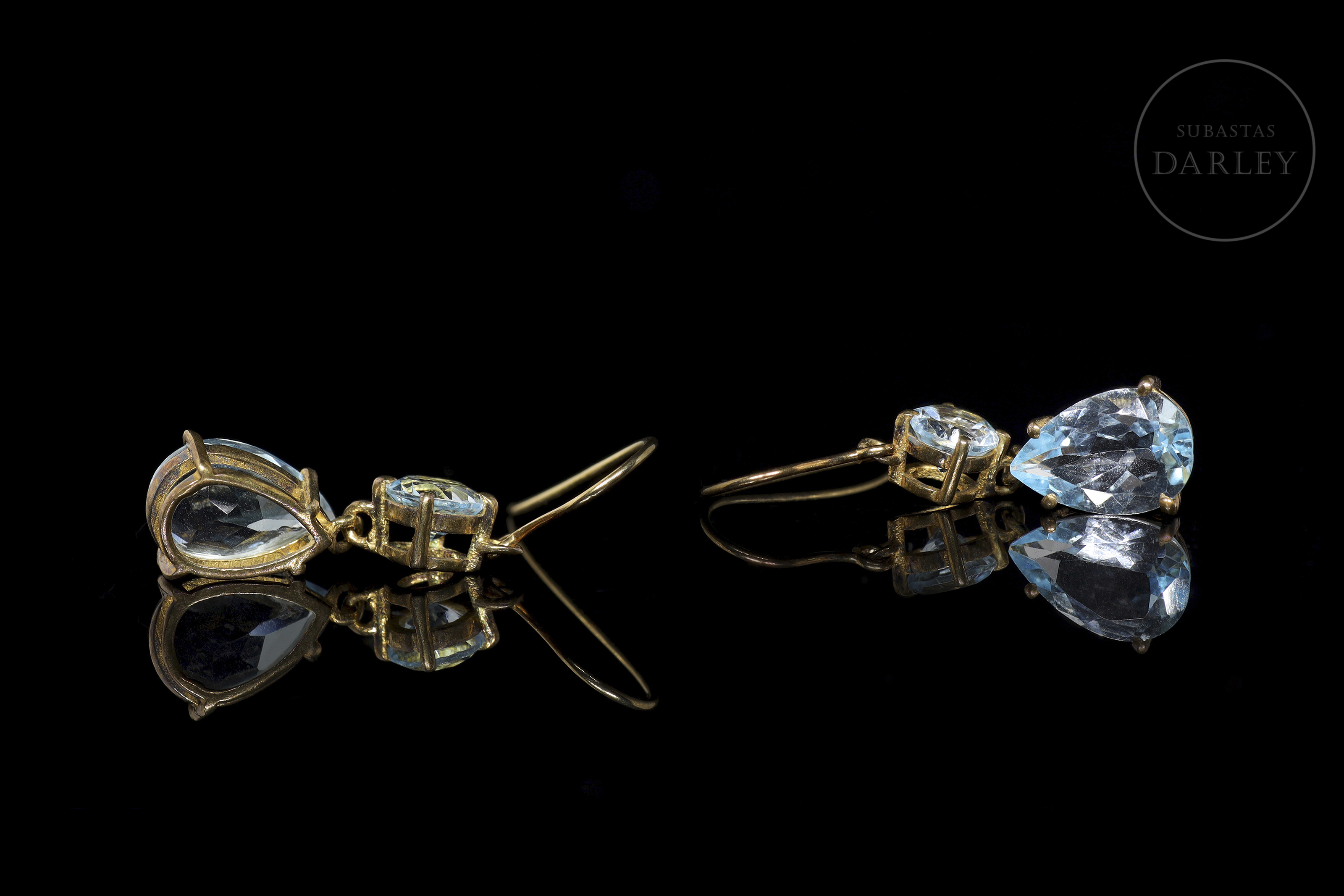Pendientes con montura de oro amarillo, de estructura móvil, adornadas con dos piedras azules; de la superior, talla brillante, pende una segunda, con movimiento y de mayor tamaño, talla pera.