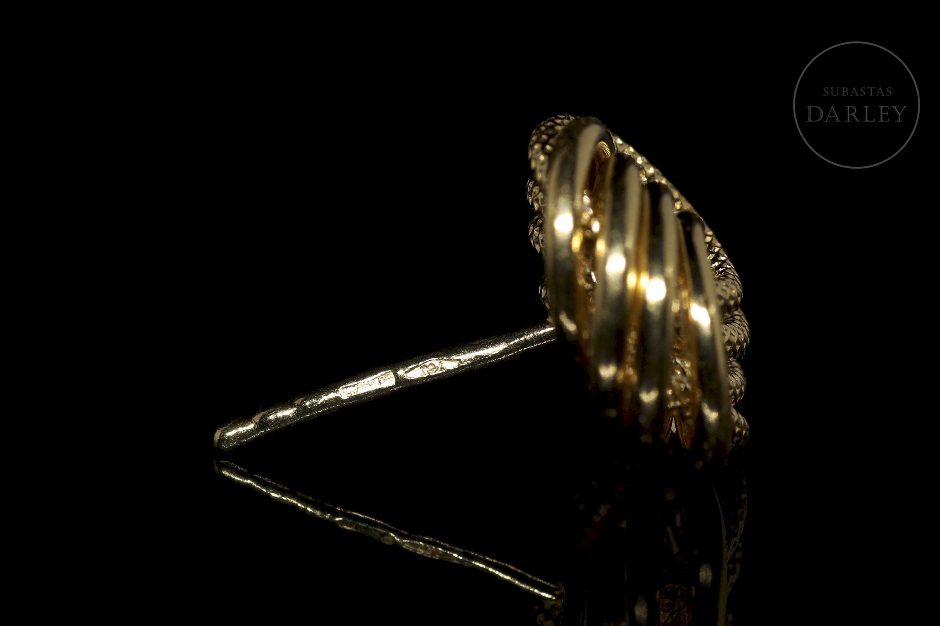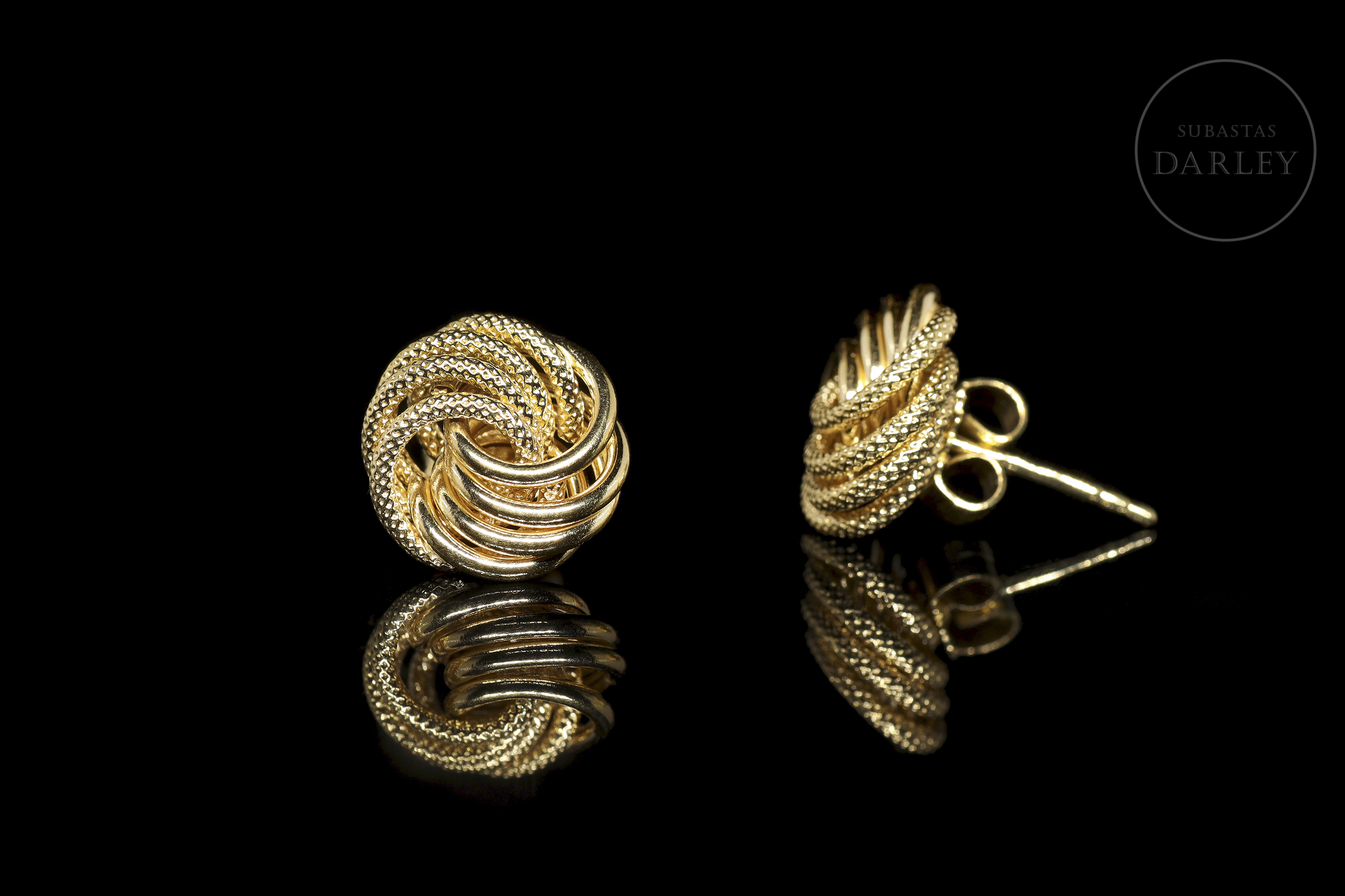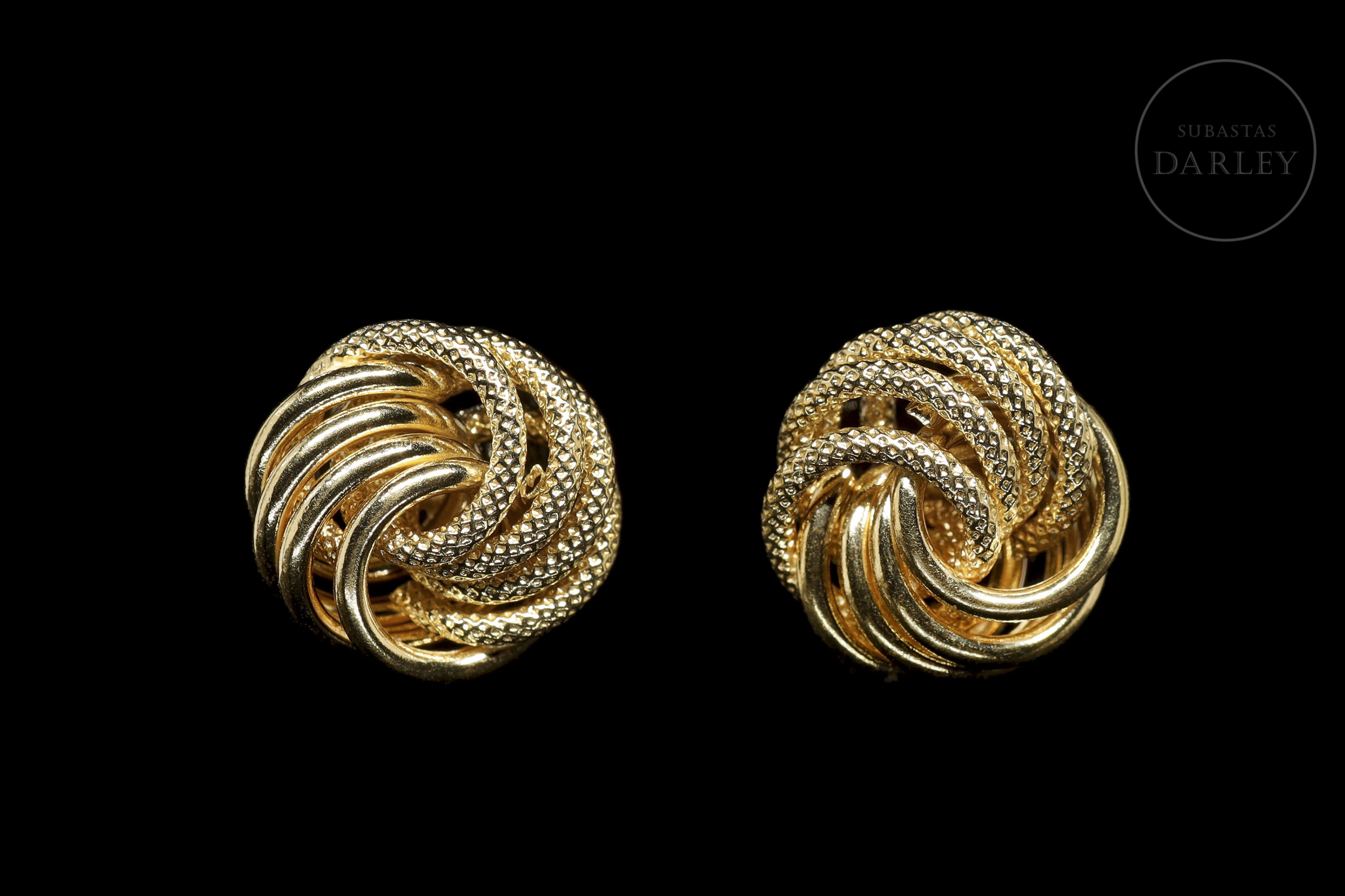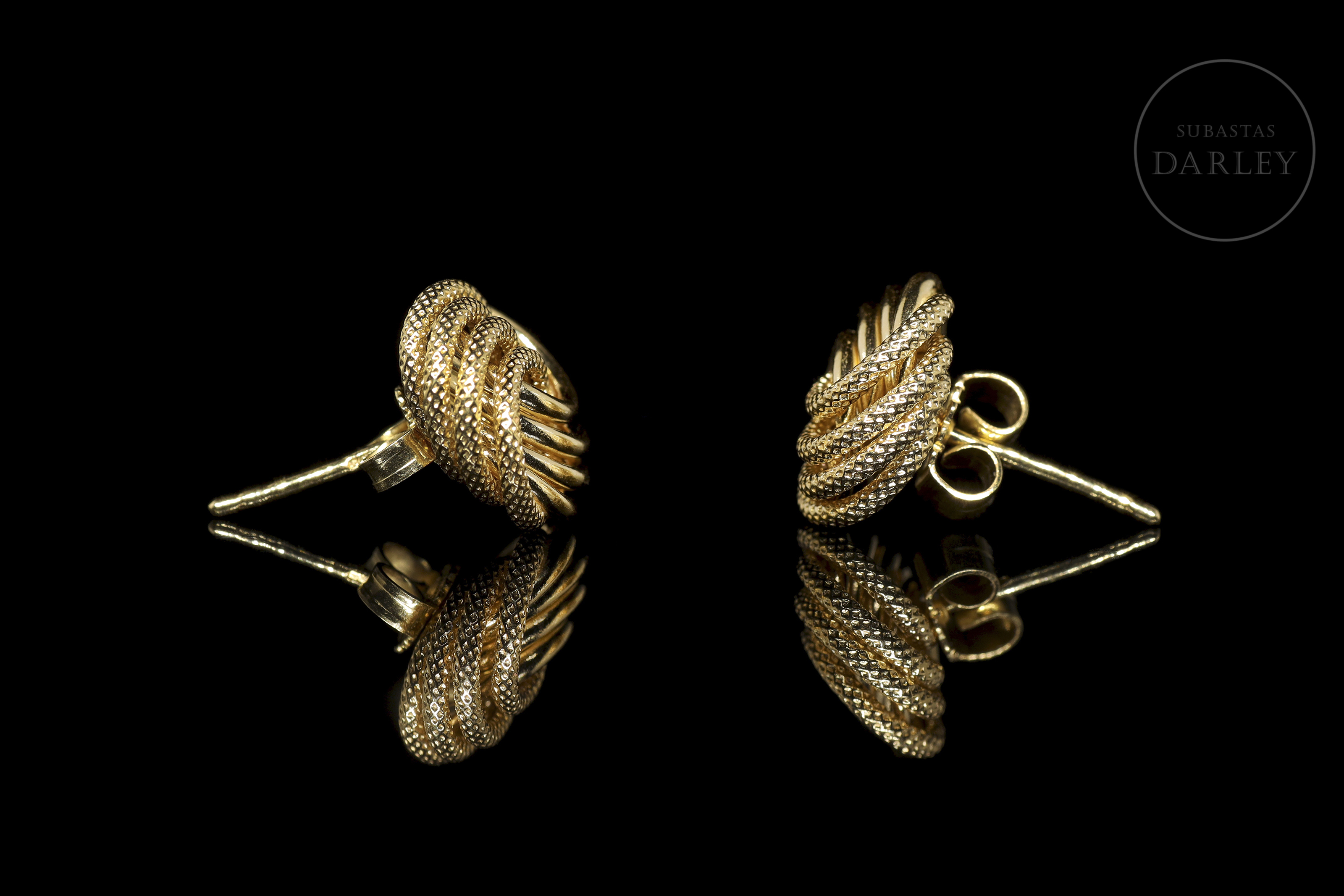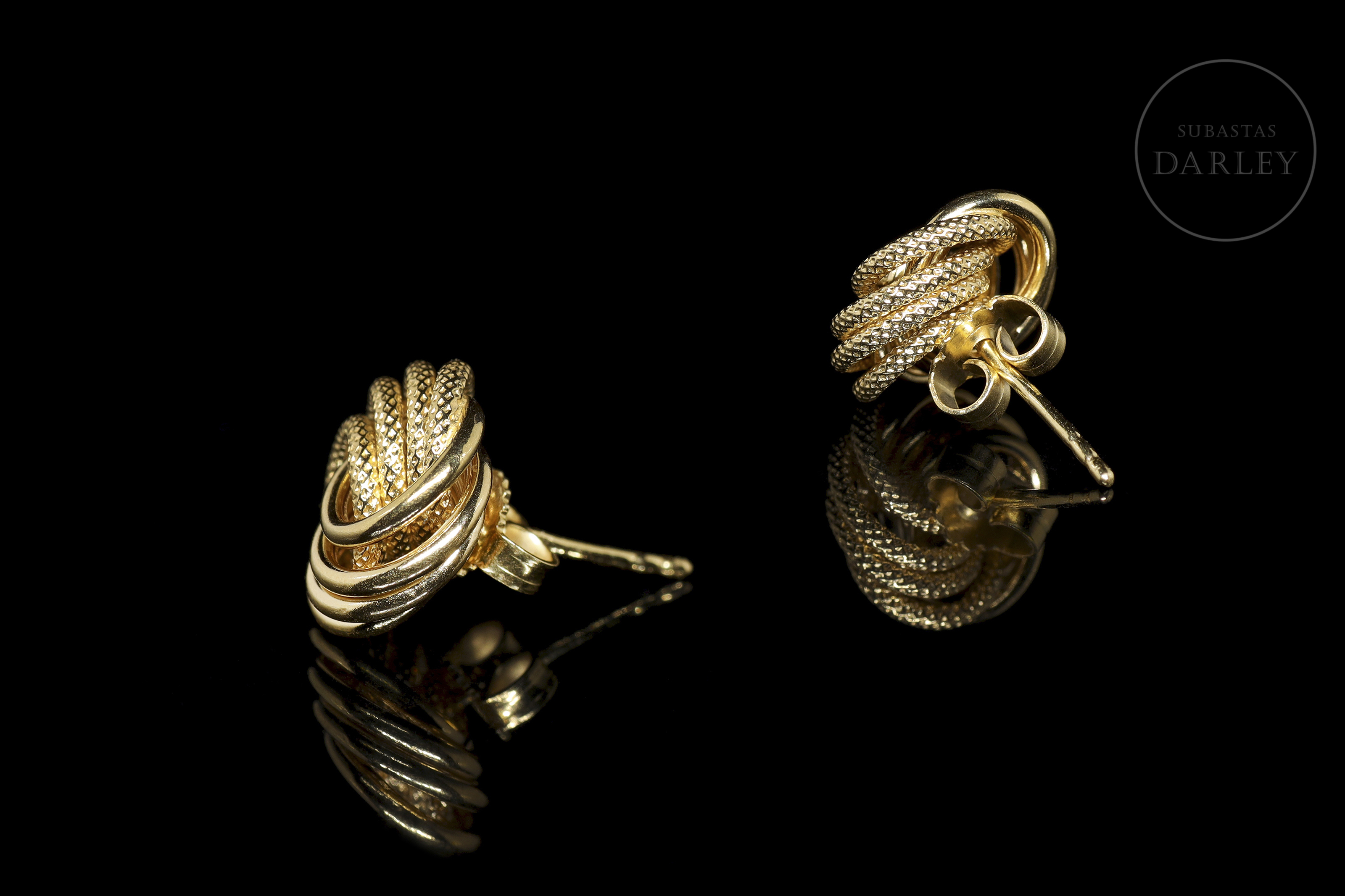 Pareja de pendientes en oro amarillo de 18 quilates con diseño entrelazado en forma de nudo, alternando superficies lisas y texturadas. Cierre de presión.