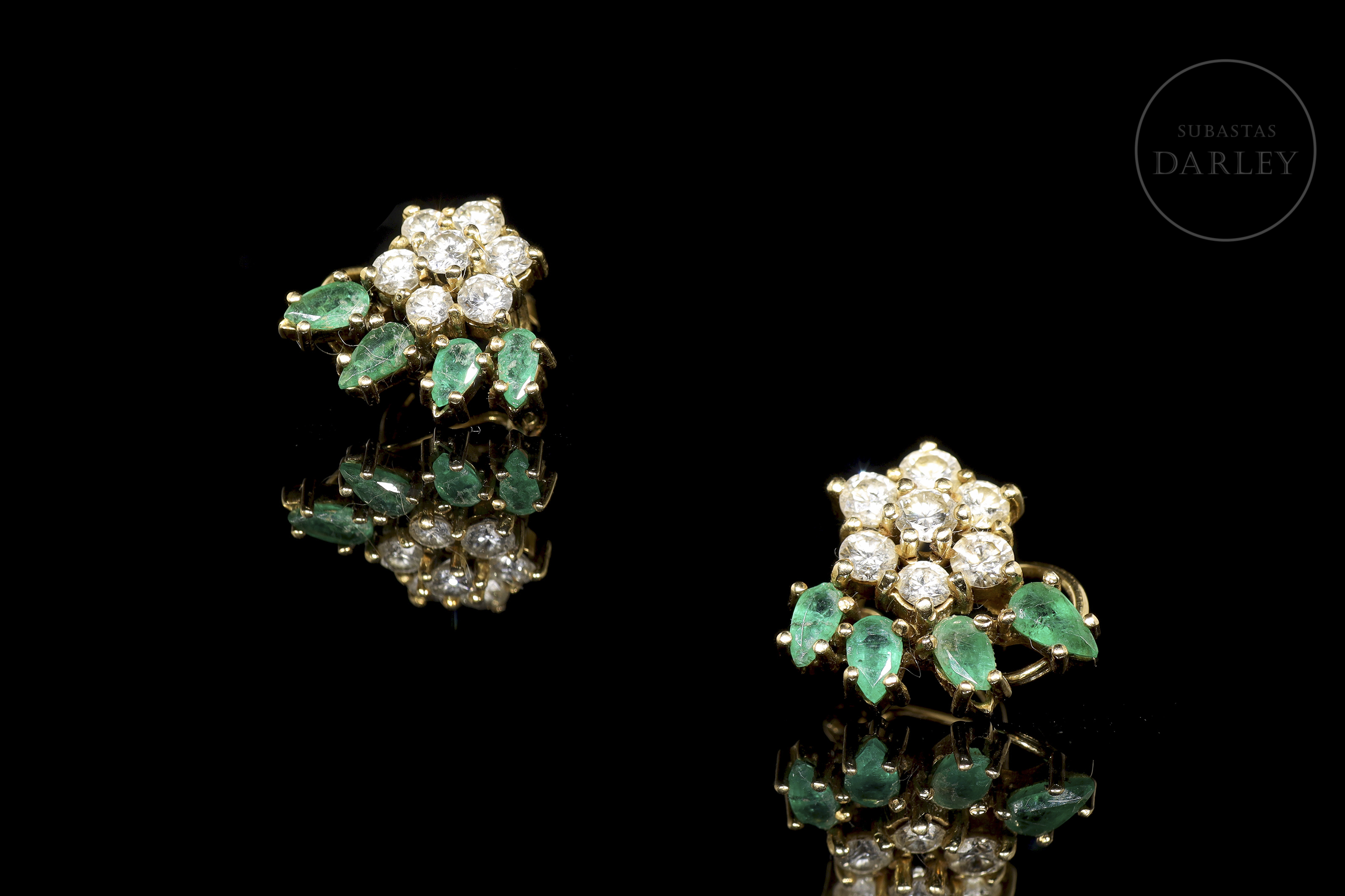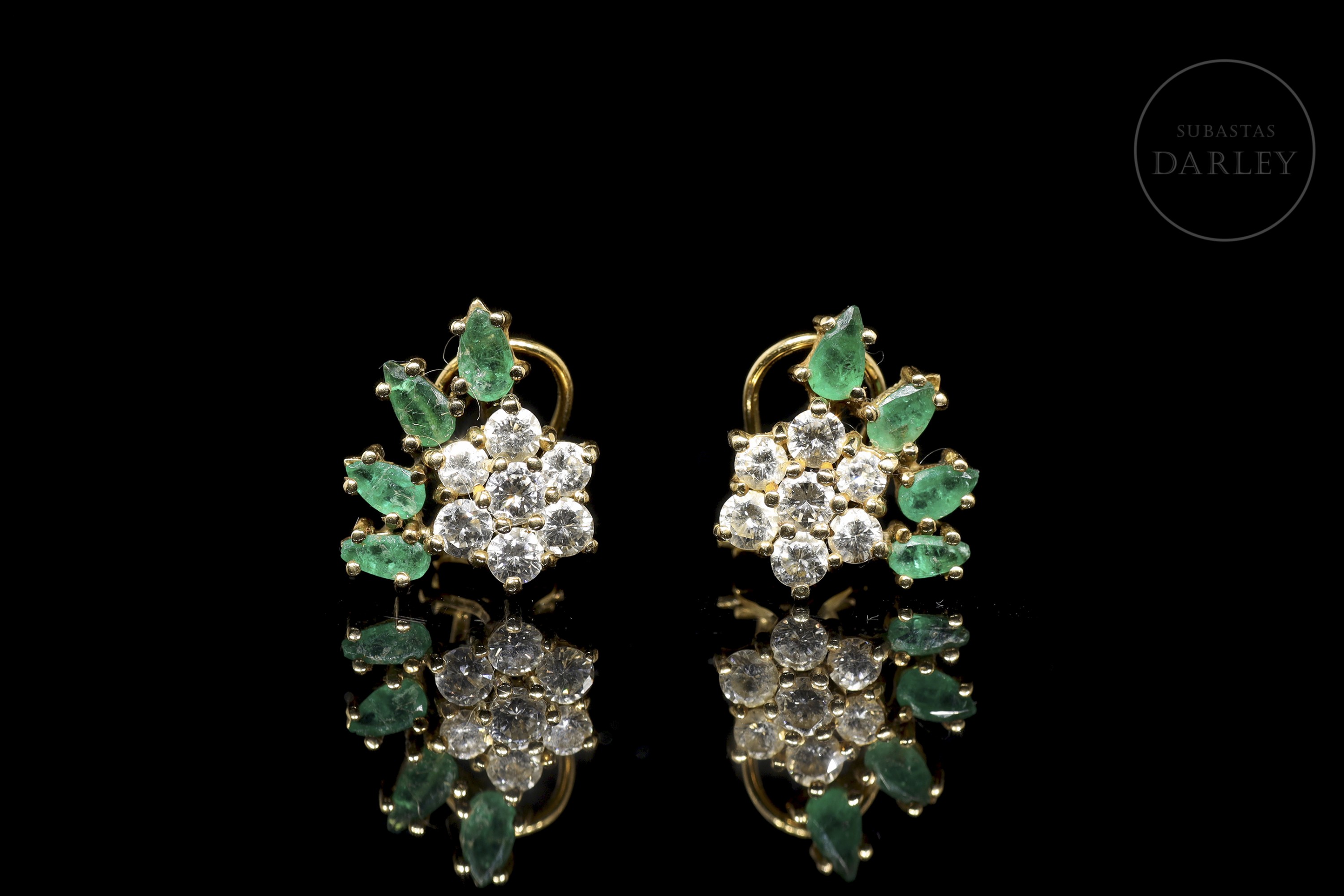 Pendientes en oro amarillo de 18 k, adornados por un rosetón de 7 diamantes talla brillante, con un peso total de 1,20 ct, junto a los que se disponen cuatro esmeraldas talla pera, con un peso total de 0,8 ct (aprox). Cierre tipo pala omega.